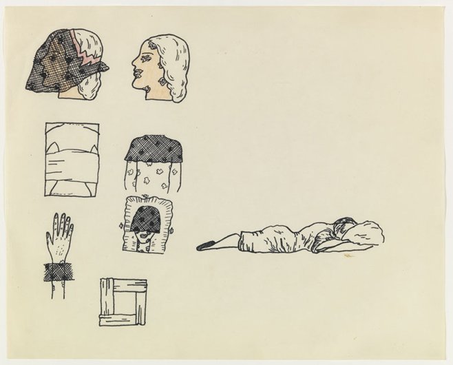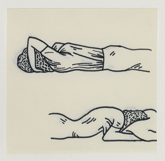 Untitled (women covering head) c. 1968 felt-tip pen on both sides of paper 7 1/4 x 4 1/4 inches