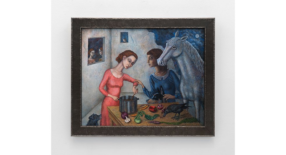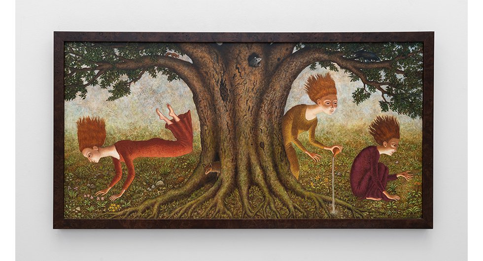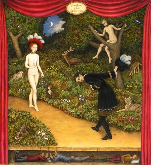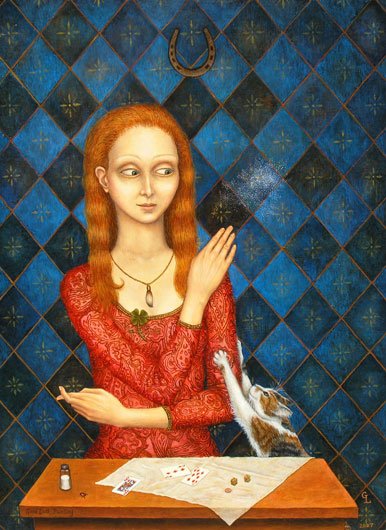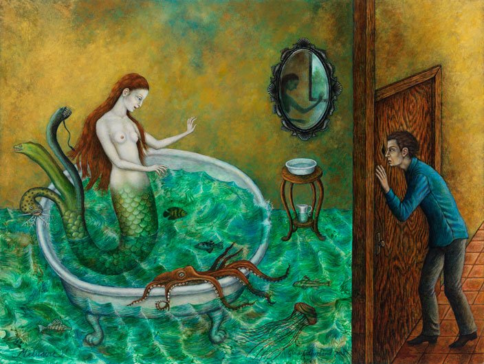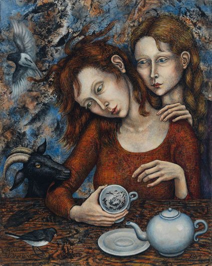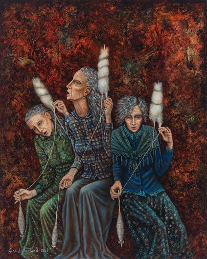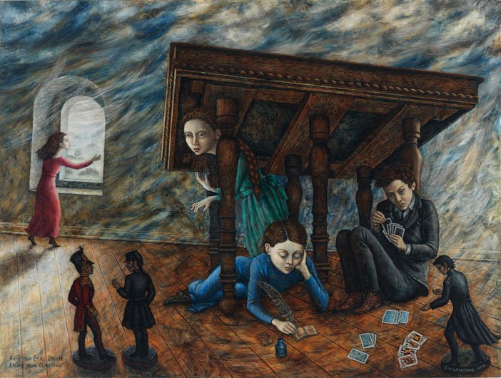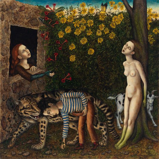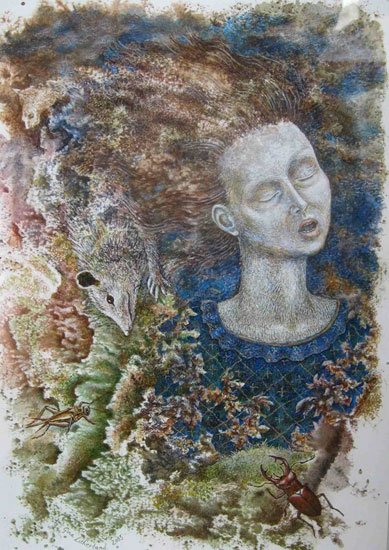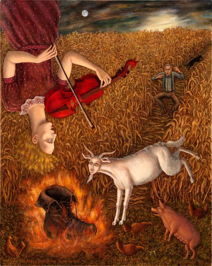 b. 1955 Lives and works in Wisconsin. In her magnificently detailed and inventive paintings, Gina Litherland extends a tradition of Midwest surrealism and magic realism that stretches back to the ’30s and ’40s and the work of Gertrude Abercrombie, Sylvia Fein, Julia Thecla and John Wilde. Born in Gary, Indiana, Litherland has been active in the visual arts since the mid 1970s, exploring photography, performance, and painting. From 1979 to 1982 she participated in weekly experimental multimedia performances at the Emergency Theatre in Chicago. Long a resident of Chicago, she studied painting at the School of the Art Institute, and her paintings, drawings, and articles have been published worldwide in journals and periodicals associated with the international surrealist movement. Her essay on the connections between creative activity and the natural world, “Imagination & Wilderness,” appeared in Surrealist Women: An International Anthology, published by University of Texas Press. Litherland’s recent work was the subject of a museum exhibition at the James Watrous Gallery of the Wisconsin Academy of Sciences, Arts, and Letters in Madison in 2006.