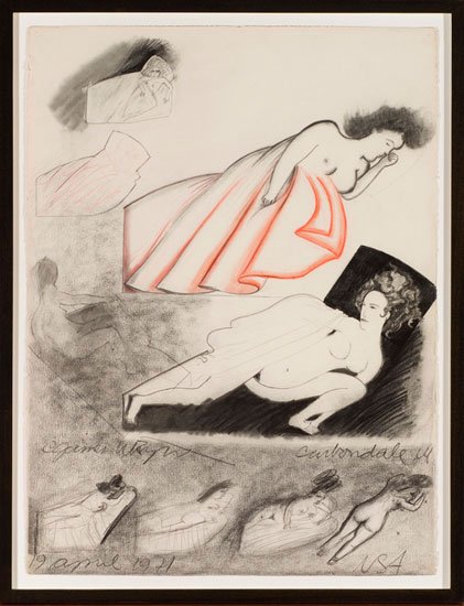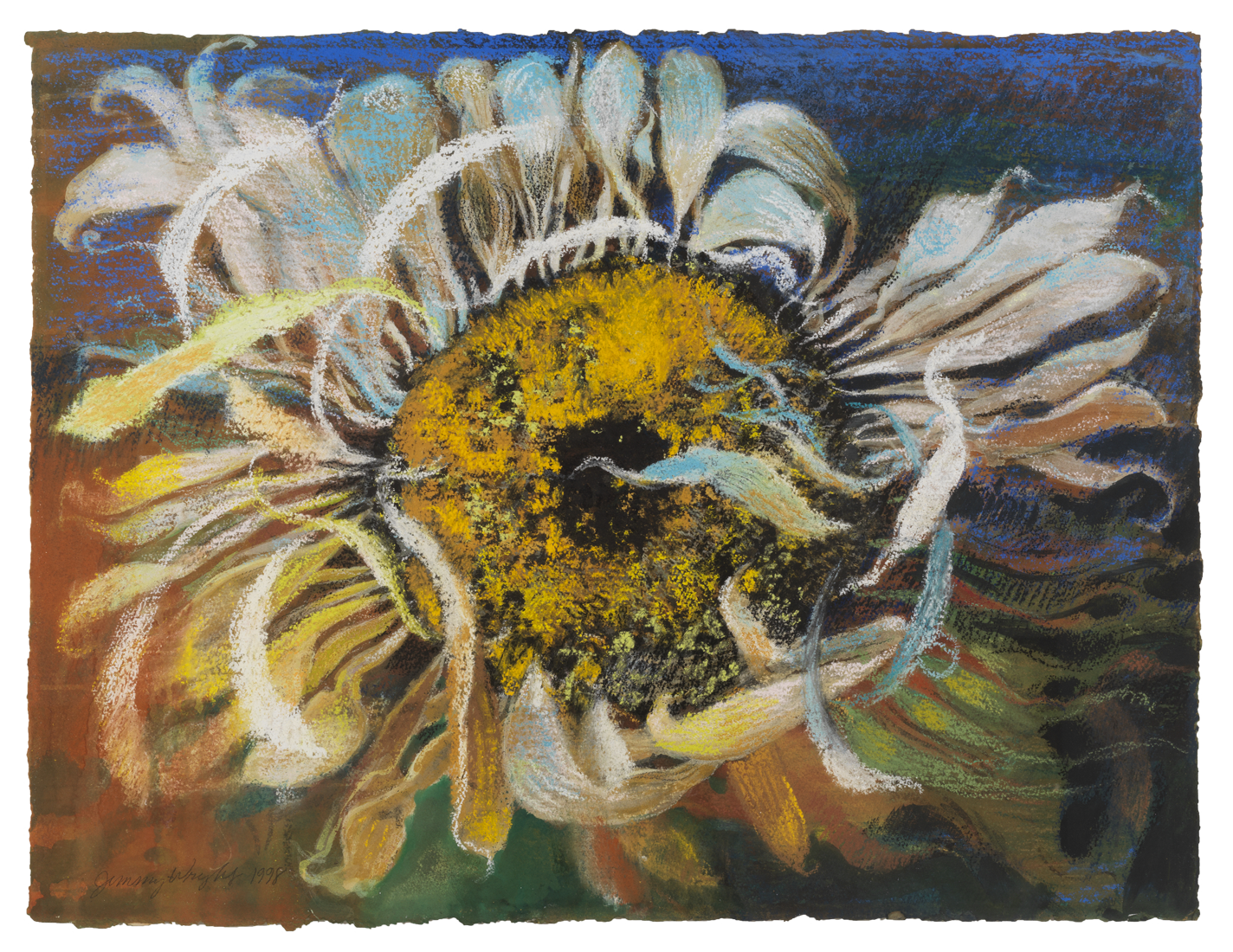 Jimmy Wright has lived and worked in New York since the early 1970s. After growing up in rural Kentucky, Wright moved to Chicago to study at the Art Institute of Chicago where he became close friends with members of The False Image group, including Philip Hanson, Christina Ramberg and Roger Brown. In 1969, he moved to Carbondale to attend graduate school at Southern Illinois University. Examples of his work during this period include the gorgeous graphite drawing, Motel (1972), that has a refined, but sarcastic or ironic gloss, and larger acrylics such as Main Street (1972), a sweet slightly somber landscape of a Midwest Street on a rainy even. In 1974 he moved to New York where he documented the flourishing queer landscape of gay bathhouses and bars throughout Manhattan; this post-Stonewall and pre-AIDS epidemic moment is captured in works like Max’s Kansas City (1974) and drawings of scenes at Club 82 and the Anvil. By the early 1980s, Wright was painting images that directly confronted the complexities of his southern childhood; this can be seen in Baptism at Rives, Baptism at Pilot Oak, and Snake Service (all 1980) which deal slyly with the homoeroticism of certain religious rituals. A special project in the late 1980s - early 1990s led to a group of softer, more emotionally vulnerable monoprints (some compiled into artist-books) that explored his grandmother’s small hometown in Tennessee. With the diagnosis of his partner with AIDS in 1988, Wright began work on his first sunflower, a magnificently huge and heavily impastoed oil, dominated by browns and tans. This became the subject matter for a series of larger oil paintings and pastel drawings, which have earned Wright an international reputation.