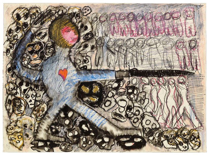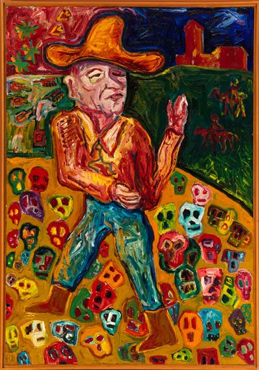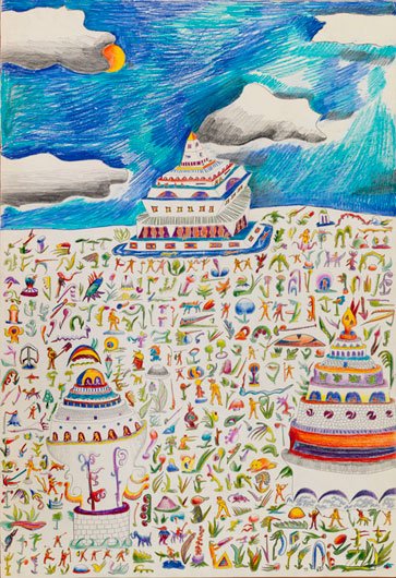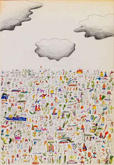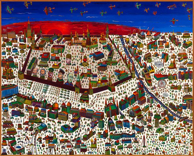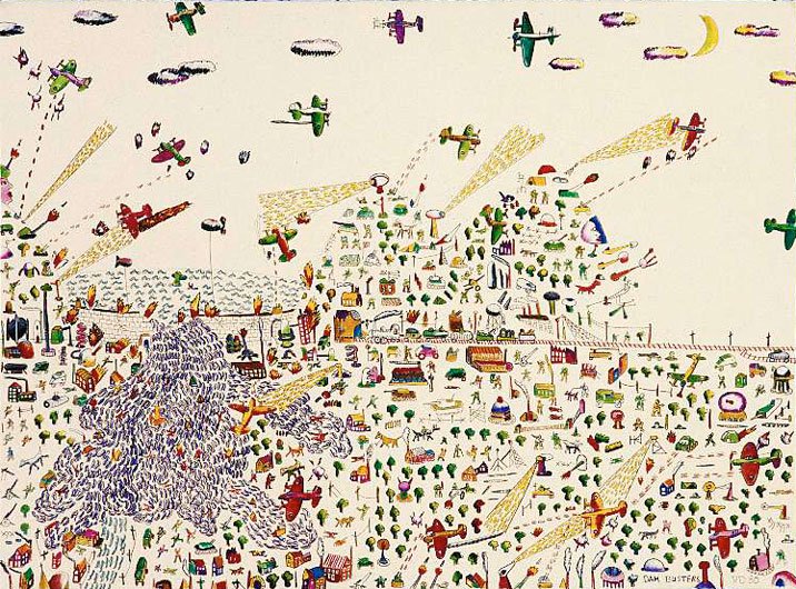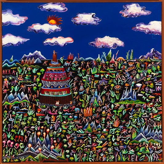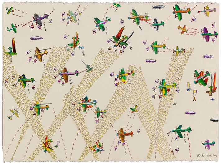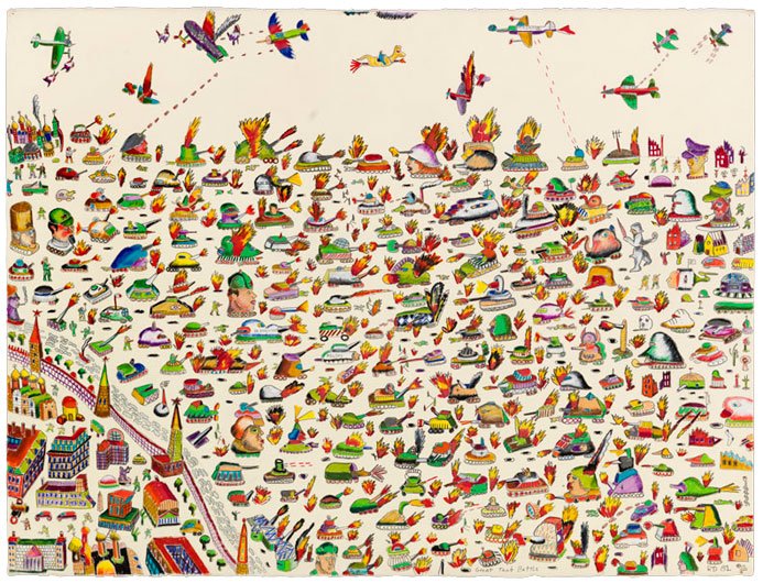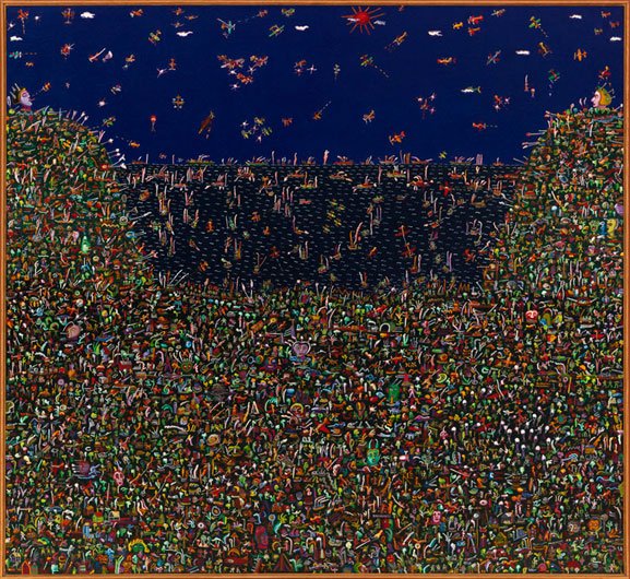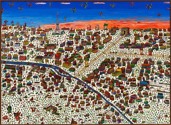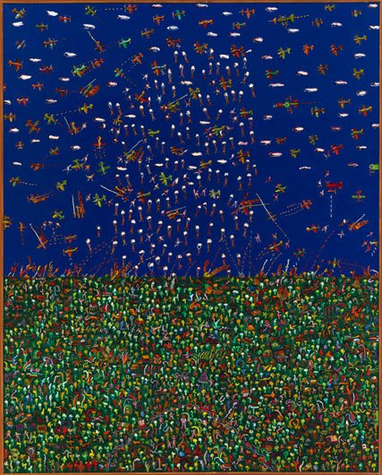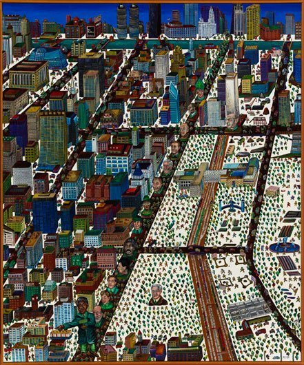 Donley returned to Chicago in 1964 to re-enter the School of the Art Institute, destined to build on a very different set of images, though his preoccupation with searing colors and the landscape format have persisted. By the 1970s Donley began to investigate more historical themes, painting his first landscapes populated by crowds of tiny figures. In 1980, at his first solo exhibition at Monique Knowlton Gallery in New York, he exhibited a series of these paintings depicting major wars of the twentieth century – scenes that are simultaneously apocalyptic and hilarious. Donley’s contemporary work continues his fascination with the city, with their God’s-eye views of all of the buildings, trees, animals, rivers, cars, and people, both anonymous and recognizable, that populate urban life.