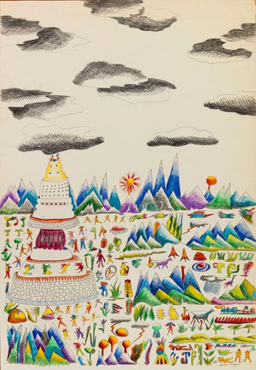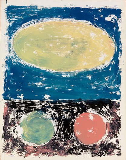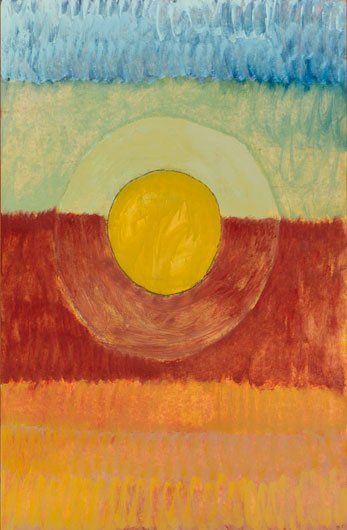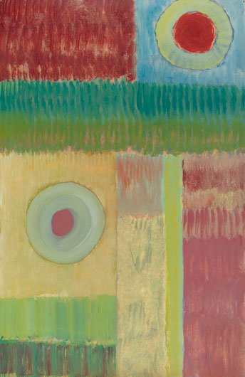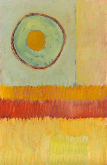 Known for his huge landscape paintings full of hundreds of tiny people, Robert Donley is one of Chicago’s great figurative expressionists, crafting a unique and wholly personal aesthetic since the middle 1960s. However, an entire arena of Donley’s work was never seen in the Windy City: his color-field paintings. Donley left Chicago for half a decade starting in 1959, moving to Los Angeles, where his work shifted from the abstract expressionist orientation that had been cultivated at the Art Institute of Chicago. Working in the same milieu out of which California’s post-ab-ex community arose, including such figures as Robert Irwin, Ed Moses, and Billy Al Bengston, Donley exhibited his large-scale abstractions at Paul Plummer Gallery and in exhibitions at the L.A. County Museum. Elegant and often highly geometrical, they absorb influences from Josef Albers to John McLaughlin, tempering a hard-edged tendency with brilliant painterly touches, all quite thinly painted in vivid colors. A series of exuberant works on paper from his first year in L.A. show the influence of the California light on the Midwesterner – like the paintings Miyoko Ito executed on the West Coast, Donley’s palette shifted to a soft, saturated, more organic, deeply warm set of dominant colors.