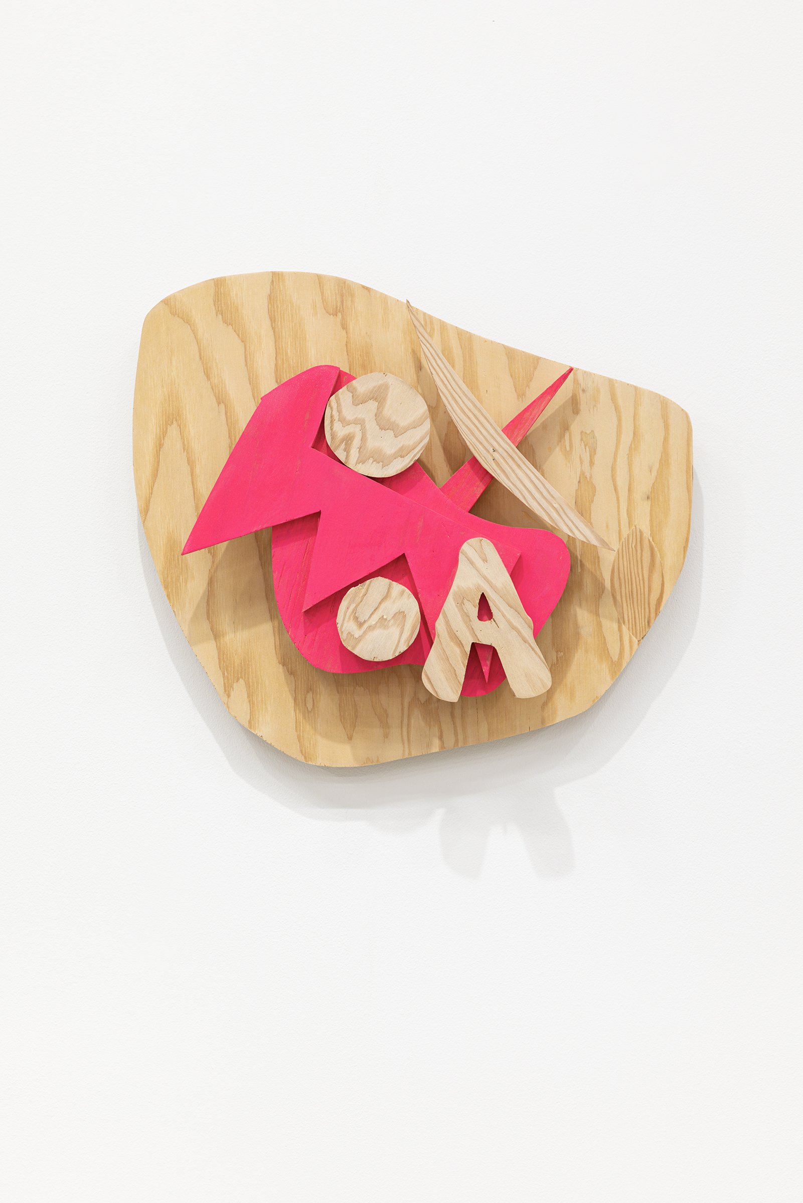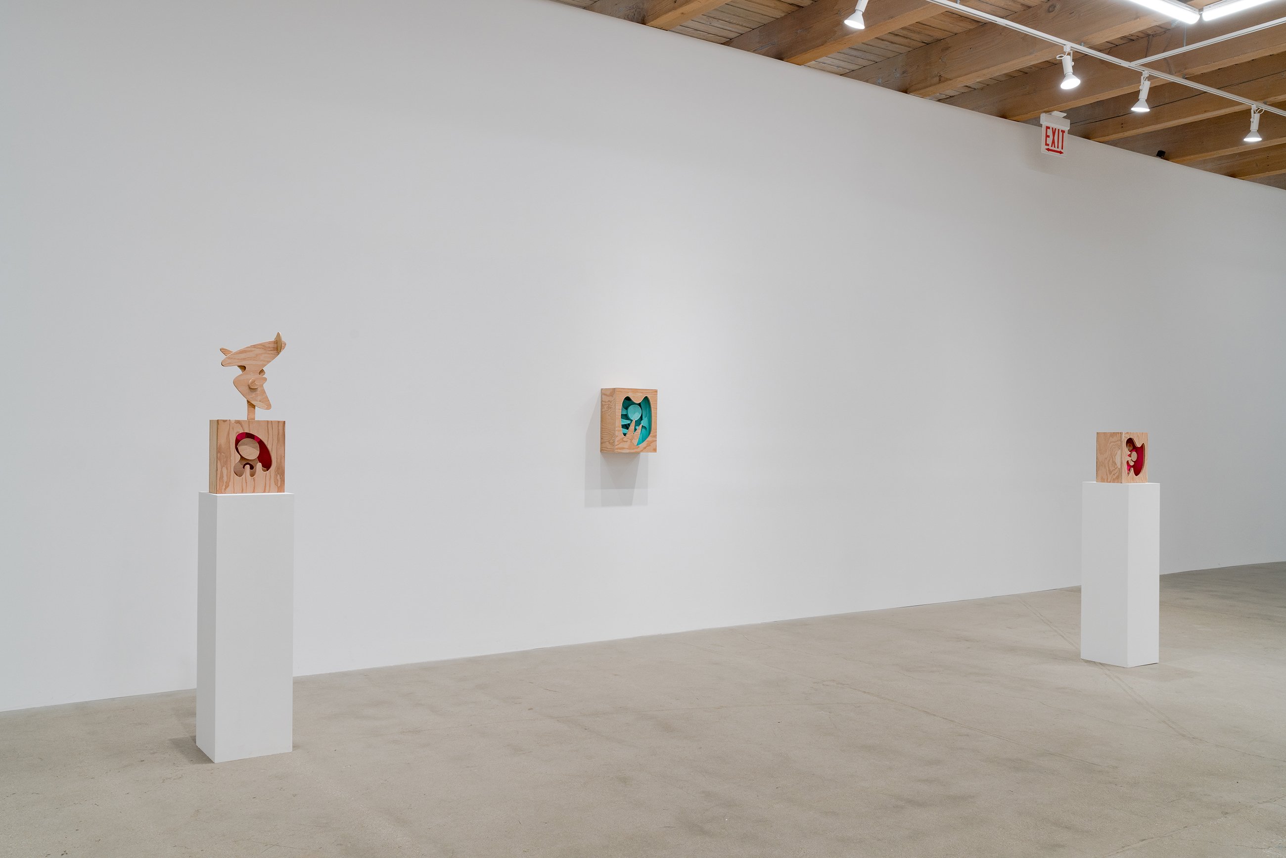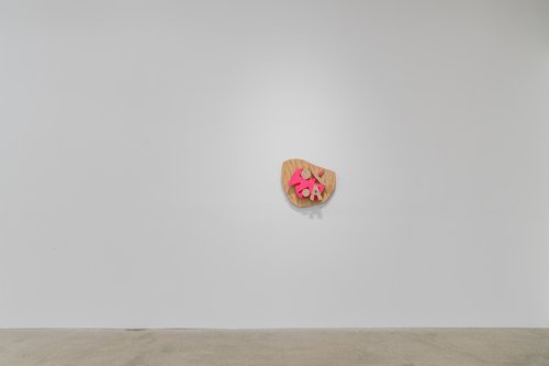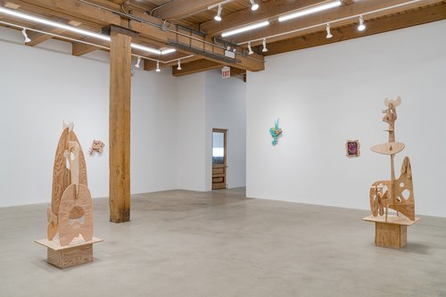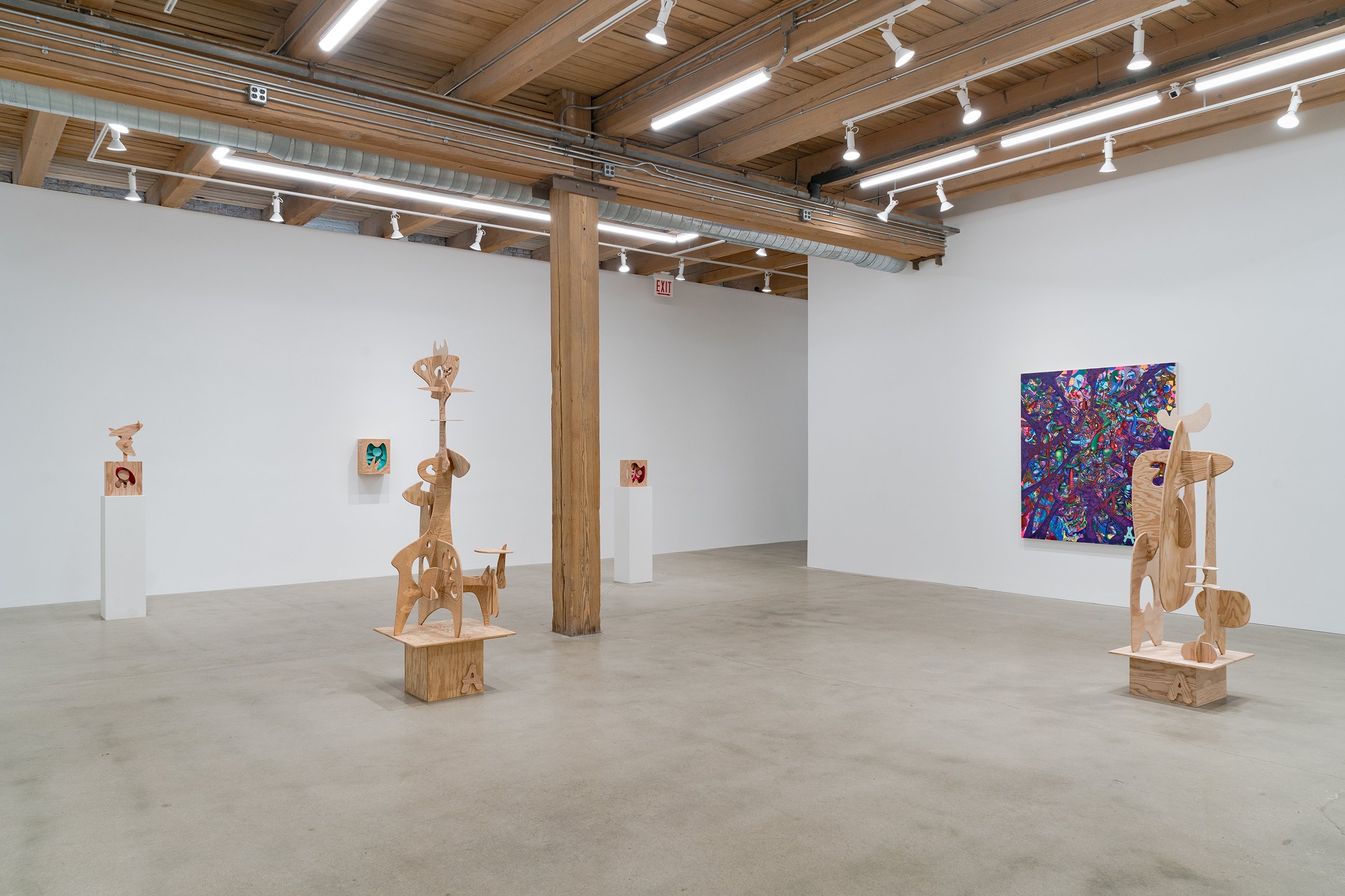 Aaron Curry (b. 1972) has charted a unique space for his work between the most sub-underground mania of the American pulp grotesque (think comix culture and the surreal side of sleazy commercialism) and the most refined formal elements of European high modernism (think Arp, Miro, Picasso). Based primarily in floor sculpture, his practice moves wildly between mediums, attaching to the walls (paintings, 3-D hanging boxes, collages), spreading into print (books, magazines, newsprint), as well as music and video. An avid historian of offbeat cultural materials, he synthesizes these points of reference in works that are often awash in dizzyingly clashing colors, hyperactive Matta-esque motion, and an ingenuity of construction that is as beautiful as it can be baffling. In Raw Dog, Curry introduces a new component to his wood sculptures, which is to leave them largely unpainted, allowing the natural grain of the material, its whorls and knots and eyes, to carry that sense of flow. Occasional flashes of hot pink, turquoise, and grape purple complement the tanscapes on several boxes and flatworks, while two human-scale sculptures are resolutely wooden, with cut away holes and curvilinear forms dancing with the wood's own patterns, the whole work suggesting a figure, cock's comb perched atop. One large painting compresses all the color that might have been in the other works into a single, atomically-charged abstract canvas.