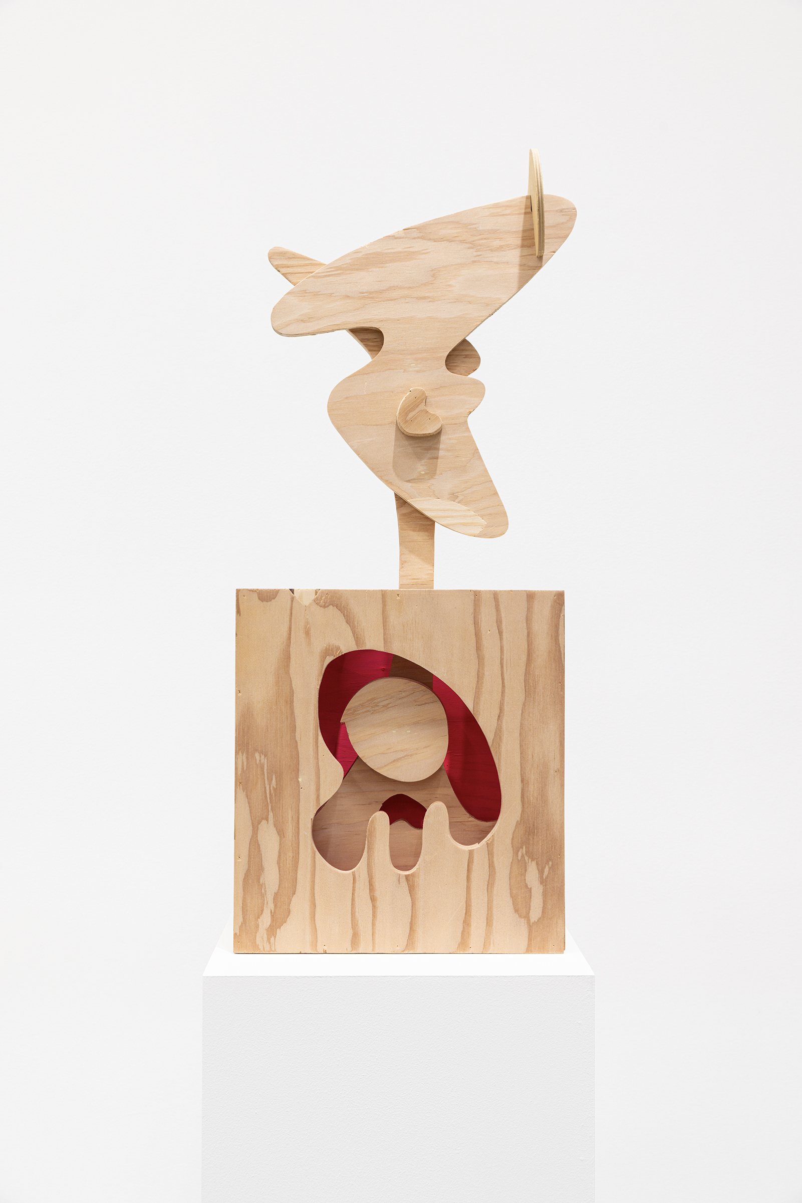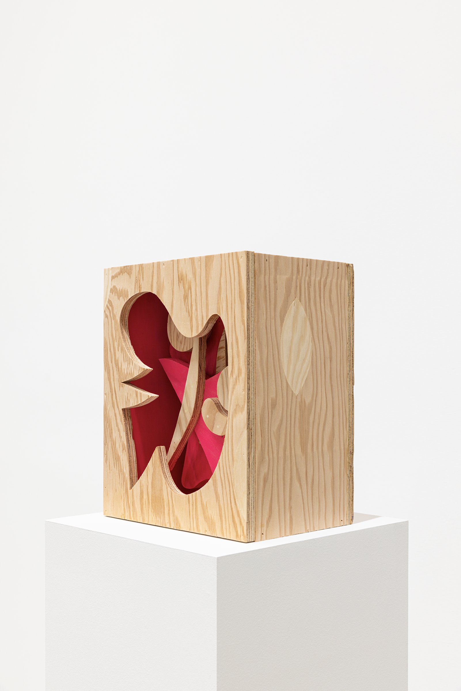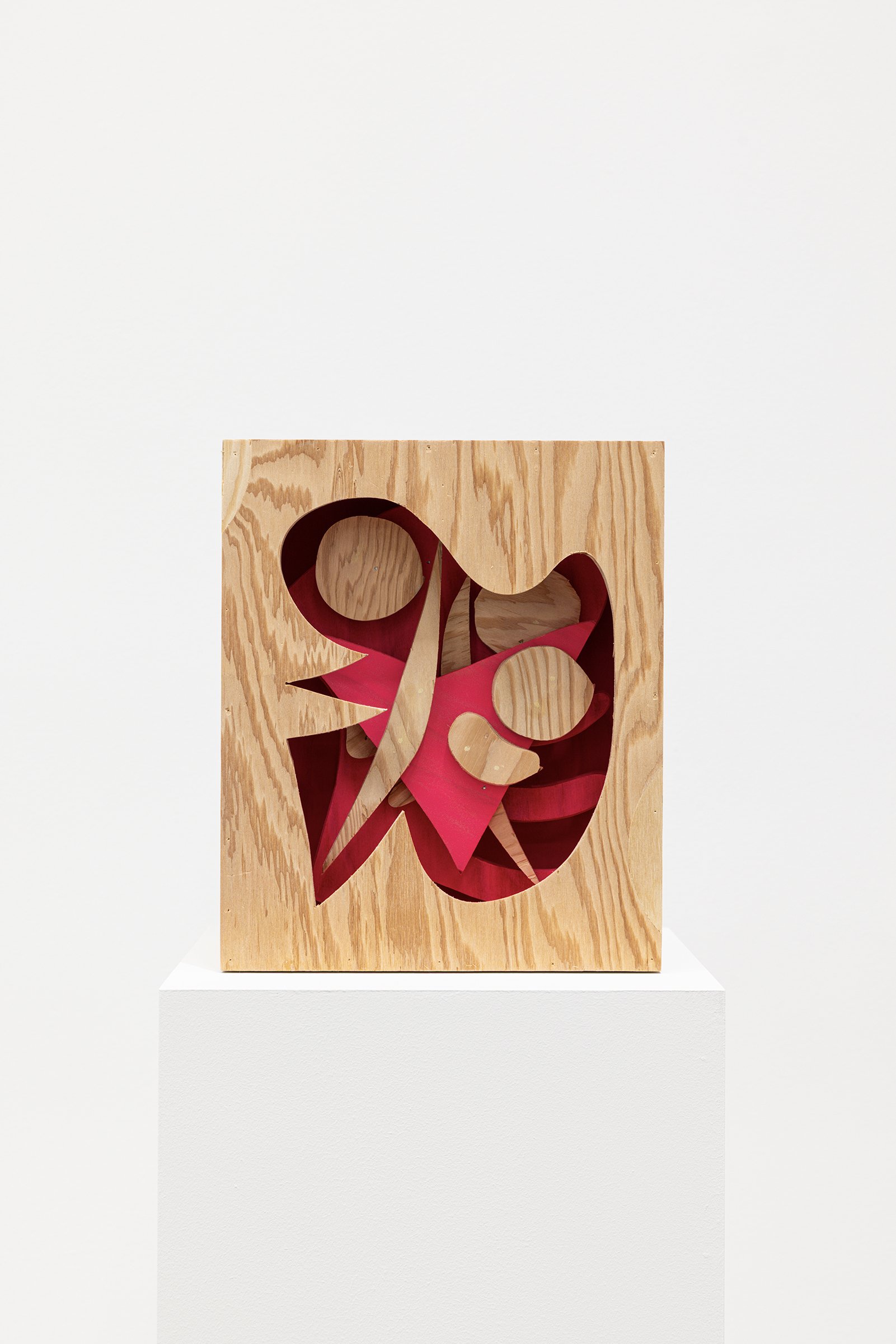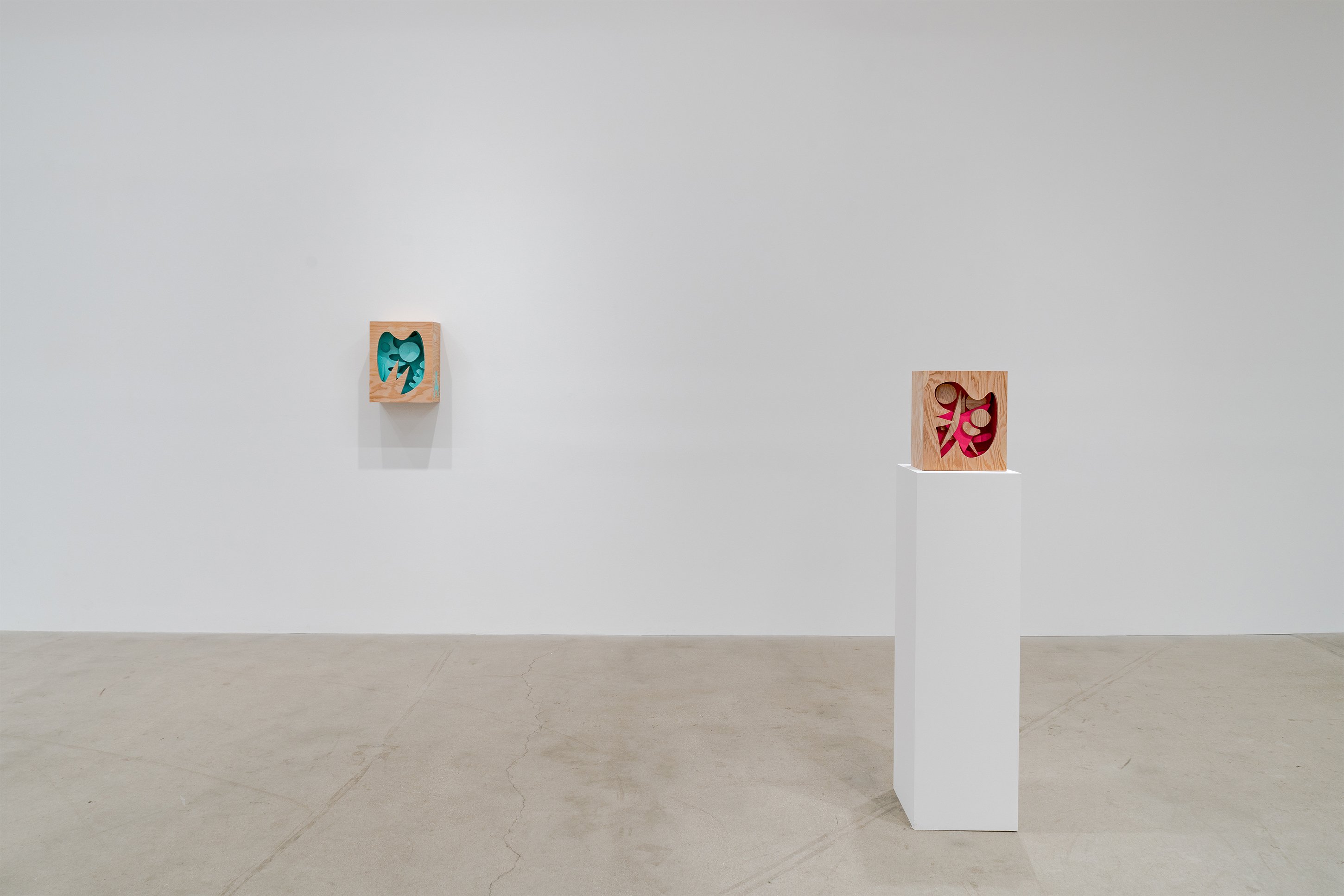 Aaron Curry (b. 1972) has charted a unique space for his work between the most sub-underground mania of the American pulp grotesque (think comix culture and the surreal side of sleazy commercialism) and the most refined formal elements of European high modernism (think Arp, Miro, Picasso). Based primarily in floor sculpture, his practice moves wildly between mediums, attaching to the walls (paintings, 3-D hanging boxes, collages), spreading into print (books, magazines, newsprint), as well as music and video. An avid historian of offbeat cultural materials, he synthesizes these points of reference in works that are often awash in dizzyingly clashing colors, hyperactive Matta-esque motion, and an ingenuity of construction that is as beautiful as it can be baffling. In Raw Dog, Curry introduces a new component to his wood sculptures, which is to leave them largely unpainted, allowing the natural grain of the material, its whorls and knots and eyes, to carry that sense of flow. Occasional flashes of hot pink, turquoise, and grape purple complement the tanscapes on several boxes and flatworks, while two human-scale sculptures are resolutely wooden, with cut away holes and curvilinear forms dancing with the wood's own patterns, the whole work suggesting a figure, cock's comb perched atop. One large painting compresses all the color that might have been in the other works into a single, atomically-charged abstract canvas.