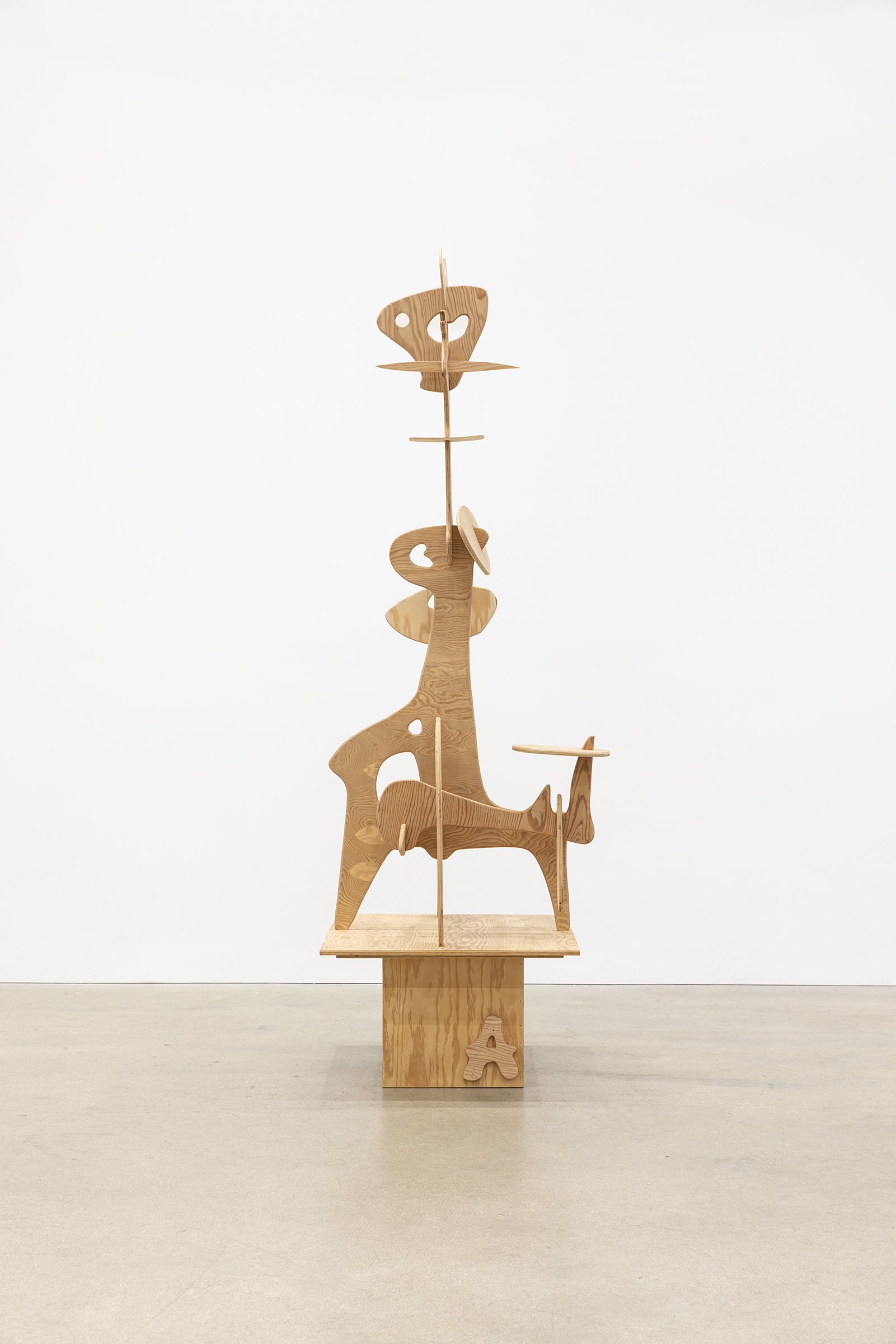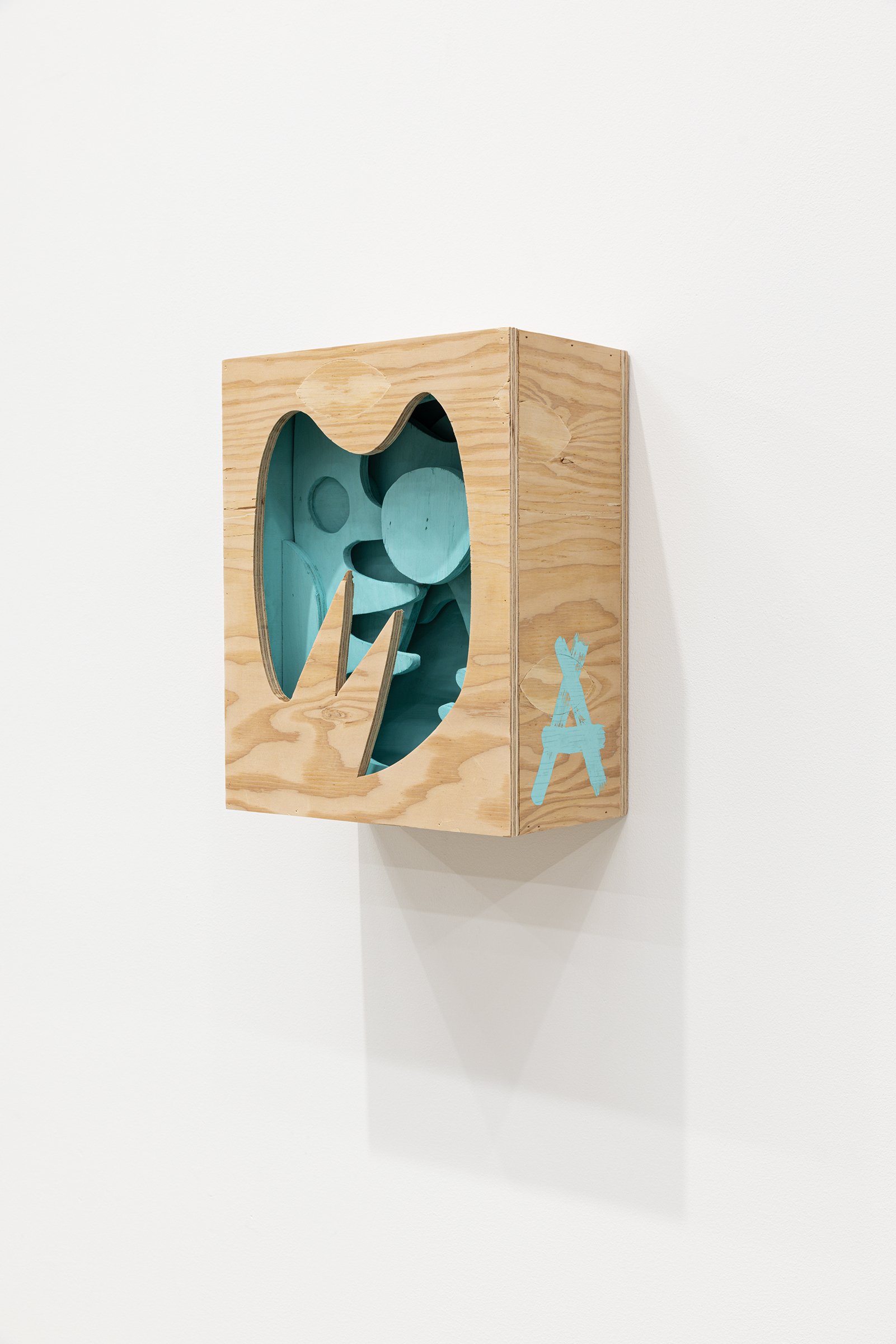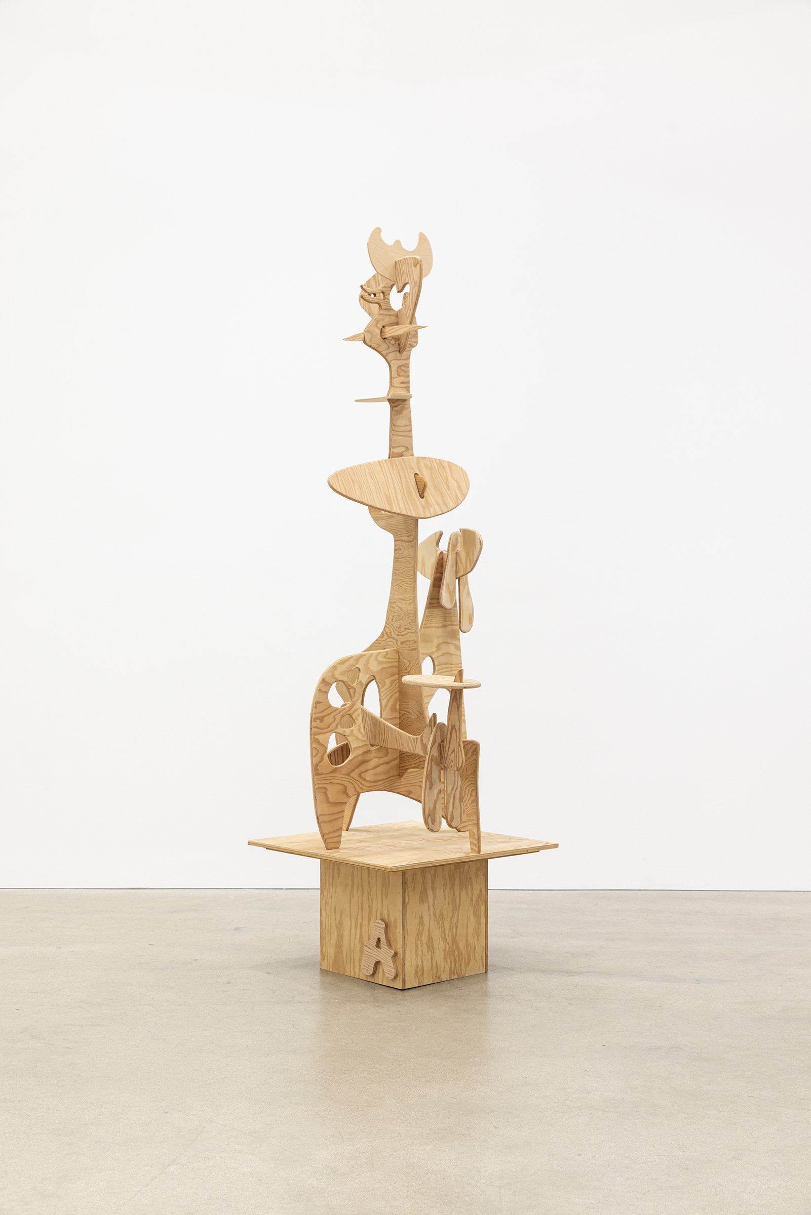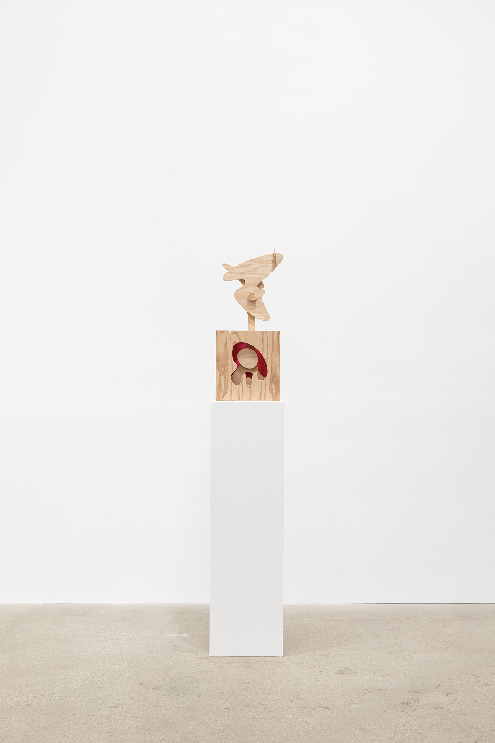 Aaron Curry (b. 1972) has charted a unique space for his work between the most sub-underground mania of the American pulp grotesque (think comix culture and the surreal side of sleazy commercialism) and the most refined formal elements of European high modernism (think Arp, Miro, Picasso). Based primarily in floor sculpture, his practice moves wildly between mediums, attaching to the walls (paintings, 3-D hanging boxes, collages), spreading into print (books, magazines, newsprint), as well as music and video. An avid historian of offbeat cultural materials, he synthesizes these points of reference in works that are often awash in dizzyingly clashing colors, hyperactive Matta-esque motion, and an ingenuity of construction that is as beautiful as it can be baffling. In Raw Dog, Curry introduces a new component to his wood sculptures, which is to leave them largely unpainted, allowing the natural grain of the material, its whorls and knots and eyes, to carry that sense of flow. Occasional flashes of hot pink, turquoise, and grape purple complement the tanscapes on several boxes and flatworks, while two human-scale sculptures are resolutely wooden, with cut away holes and curvilinear forms dancing with the wood's own patterns, the whole work suggesting a figure, cock's comb perched atop. One large painting compresses all the color that might have been in the other works into a single, atomically-charged abstract canvas.
