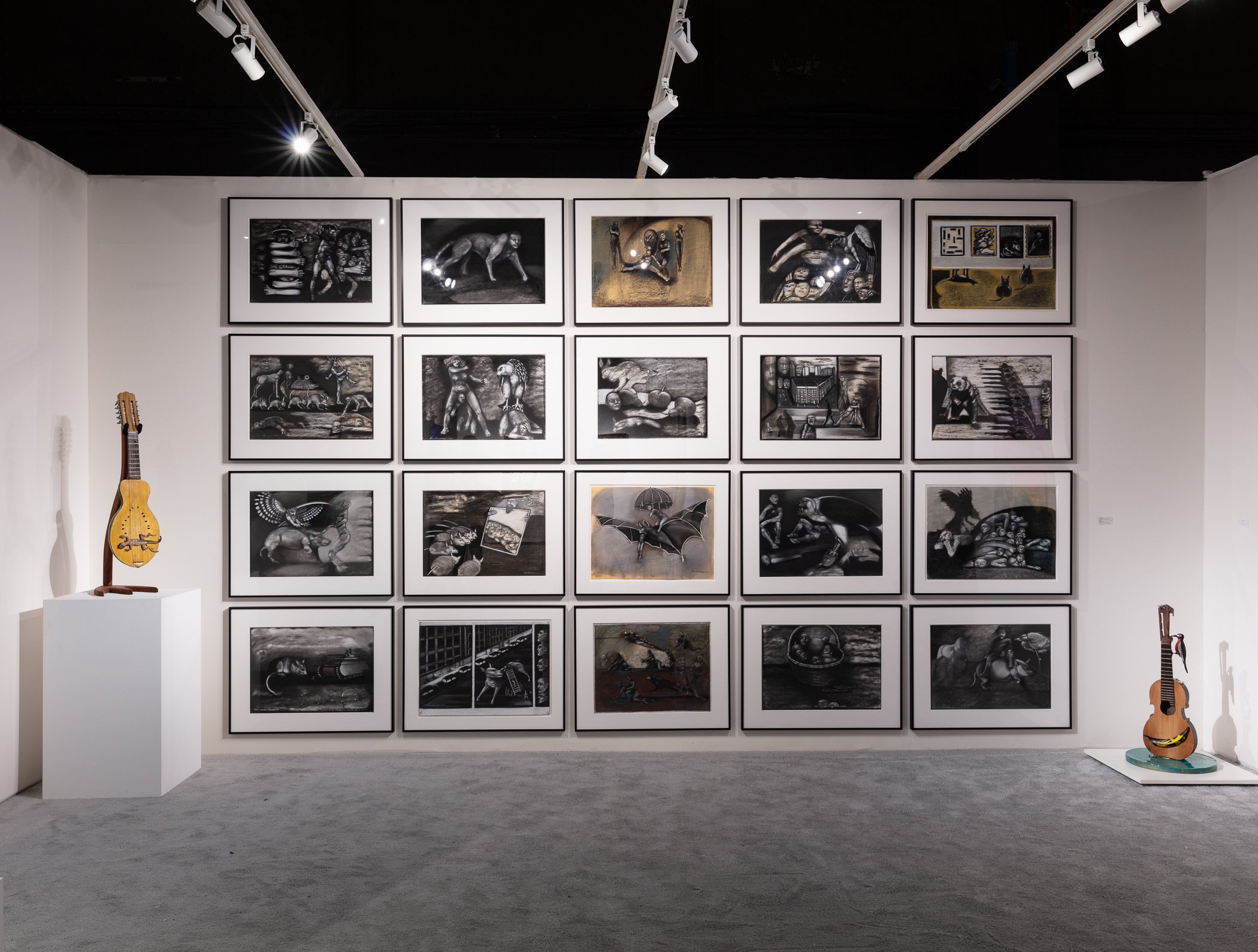 Corbett vs. Dempsey presents two artists of different generations from the broader Caribbean diaspora. Emilio Cruz (1938-2004), a major figure in New York's 1960s figurative expressionist movement, who showed at Martha Jackson and Zabriskie Galleries, was born in Brooklyn of Cuban heritage. We will be exhibiting an important late work by Cruz, the 20-panel set of drawings from 2004 titled "I Am Food, I Eat the Eater of Food." Omar Velázquez (b. 1984) lives between Puerto Rico and Chicago; his vibrant canvases feature deep perspective backgrounds with tableaux of objects in the fore. Corbett vs. Dempsey will be showing new canvases and hand-crafted instruments by Velázquez. These artists – both committed in their personal way to representation, both engaged with allegory and allusion – are acute social critics and defiant humanists whose national and ethnic identity is at once central to their work and at the service of an expansive universalist vision.