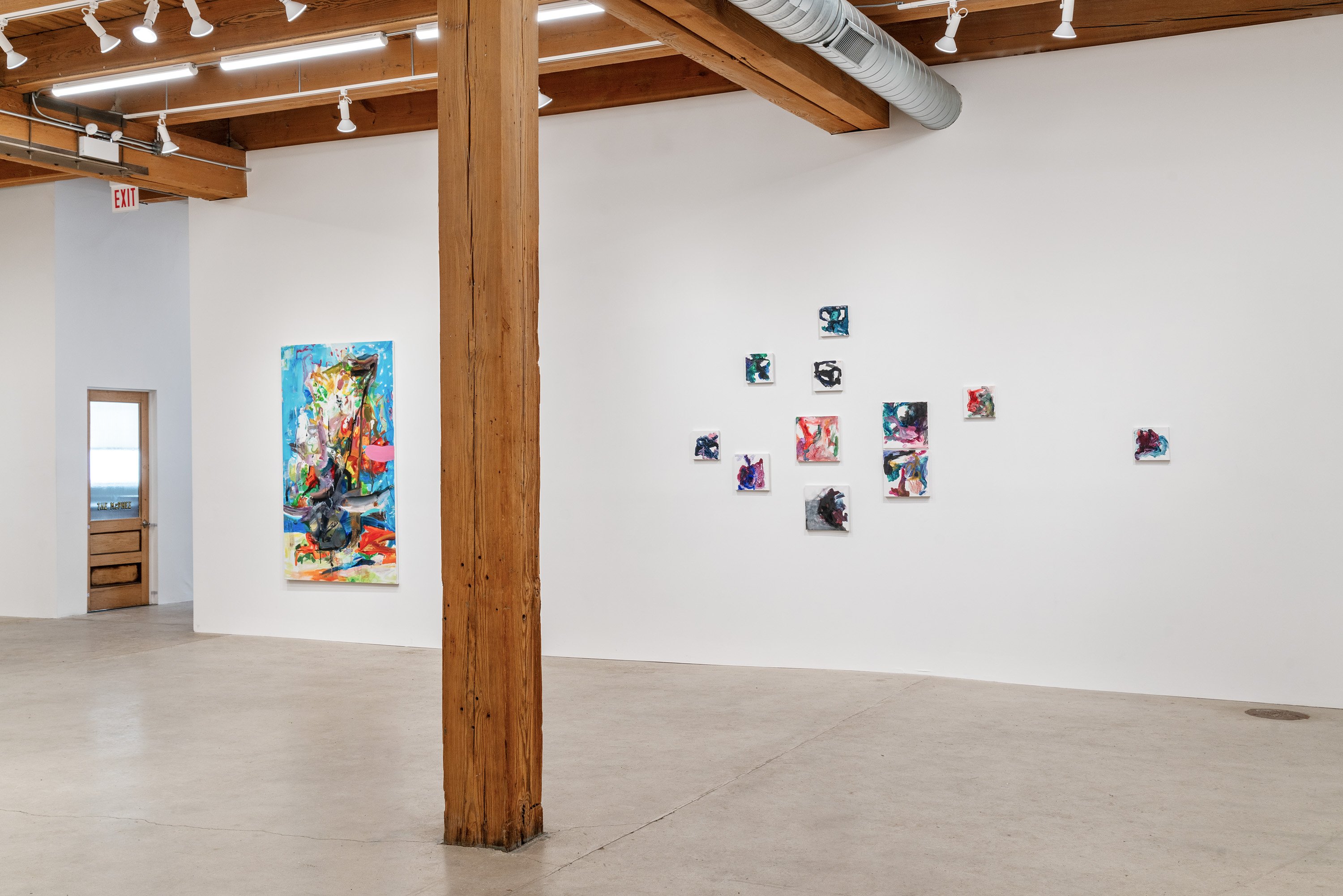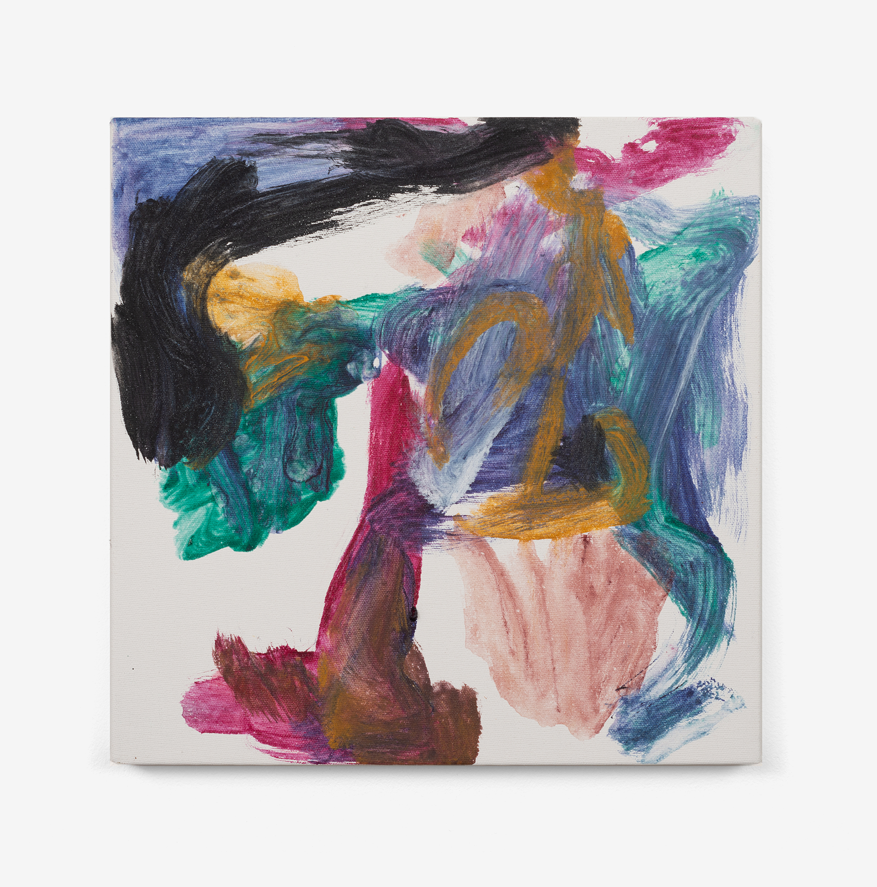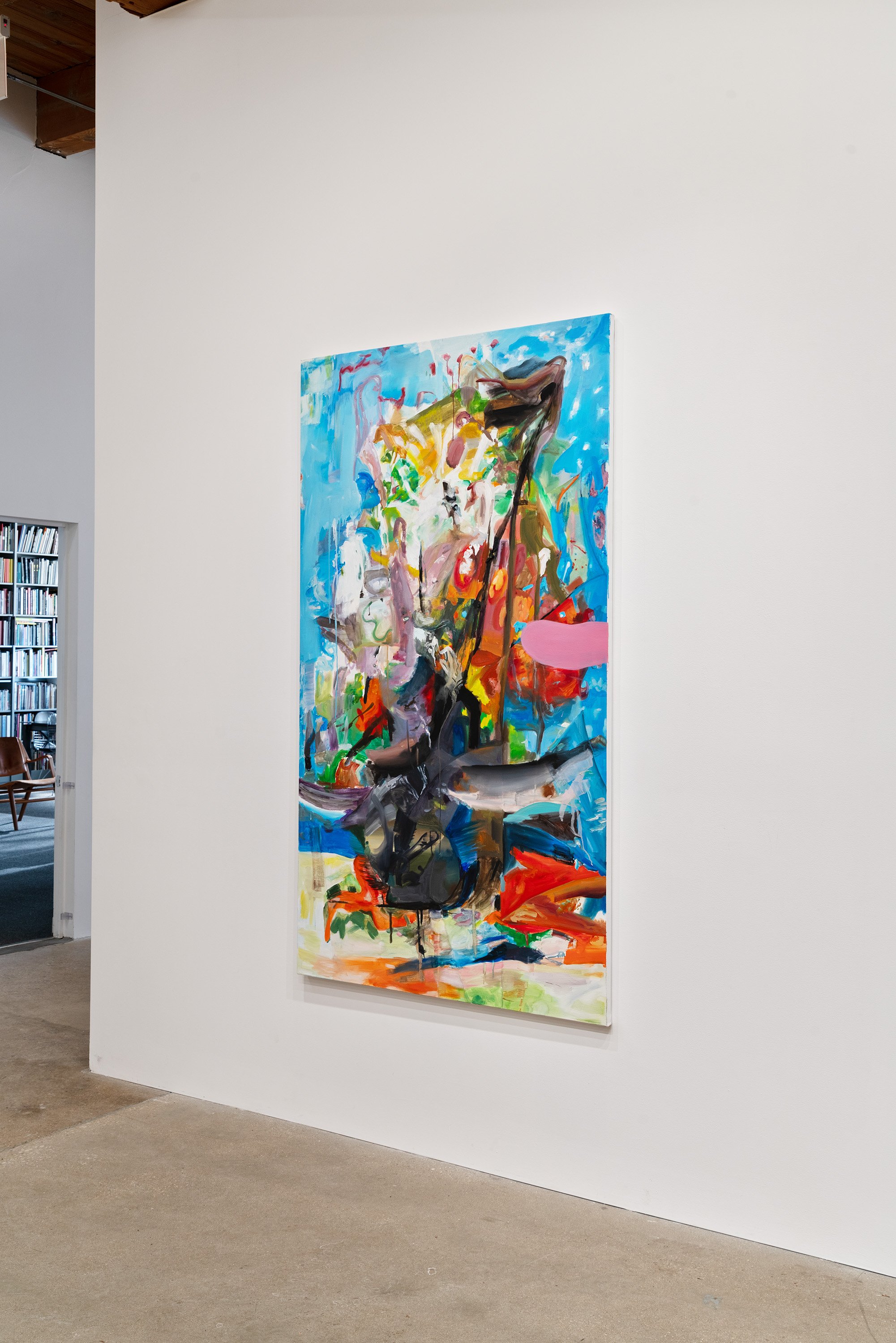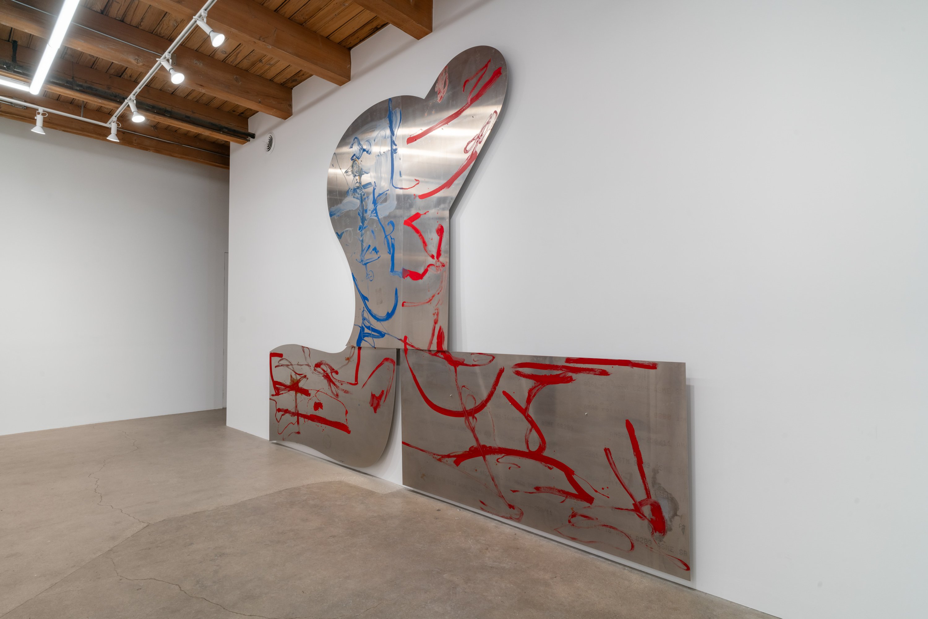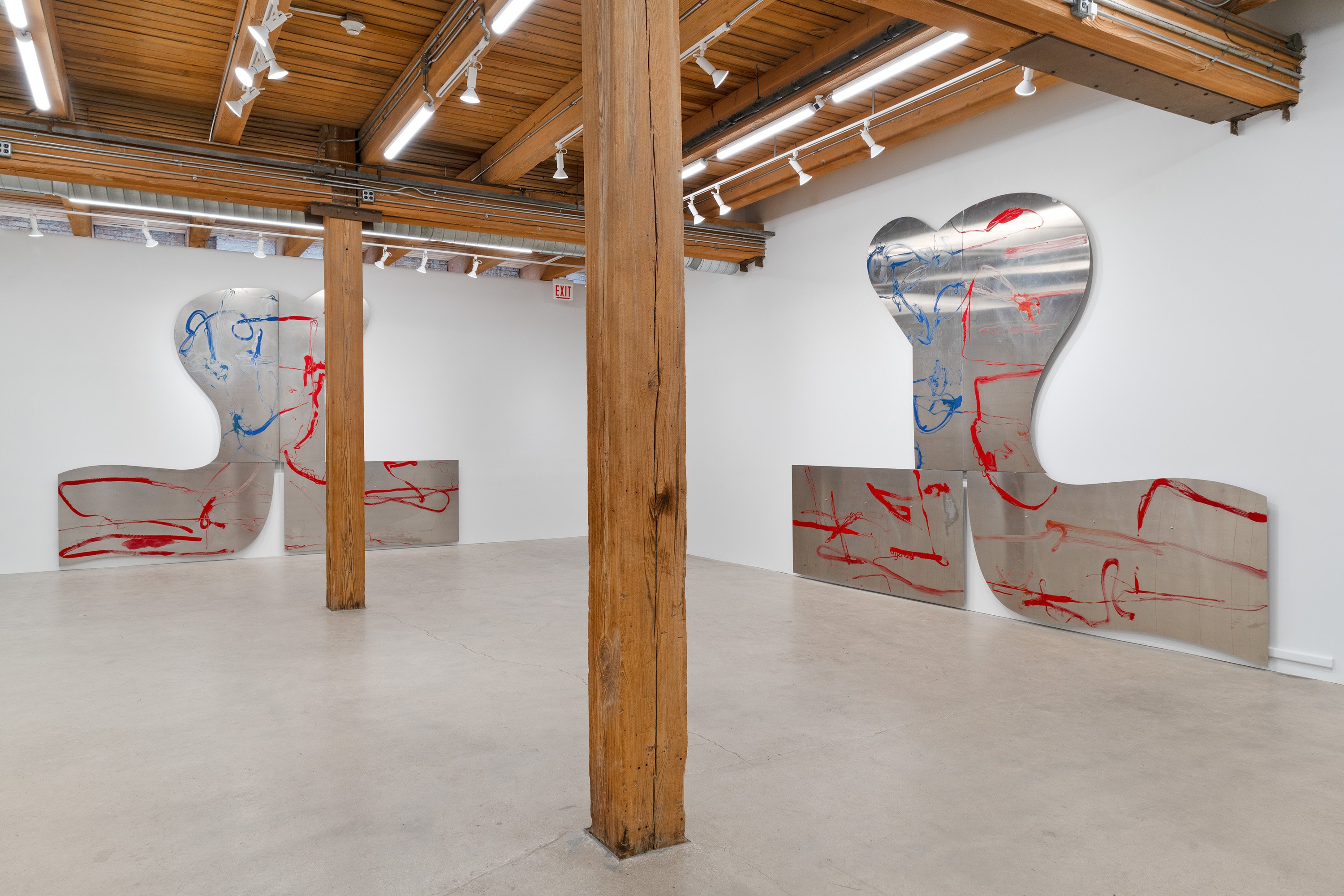 In this exhibition, German-born artist Albert Oehlen presents three monumental pieces on shaped aluminum. With enamel paint marks applied directly to the raw substates, which are cut into “omega” shapes similar to those of some newer Oehlen works, these 12-foot-tall, 15-foot-wide metal paintings come equipped with sonic transducers on each of their four adjacent panels. When amplified, the paintings act as de facto speakers and project sound vibrations into the room. Oehlen invited Kim Gordon to make soundtracks for the works. She developed these sound recordings in direct material relationship with the paintings, using the transduced metal plates as amplifiers for her electric guitar. Rather than simply making these sounds for the paintings, she made the sounds on them. Gordon’s bracing improvisations, lasting around 8-minutes each, explore a wide range of colors, from chords, drone, and feedback to electrical noises made with the unplugged guitar cord. The works play intermittently, erupting energetically, then relaxing into silence, their metal forms and the gestural lines inscribed on them supercharged by Gordon’s music. In addition to these three works made collaboratively by the two artists, the exhibition presents a new canvas by Oehlen and a group of small, vibrant paintings by Gordon.