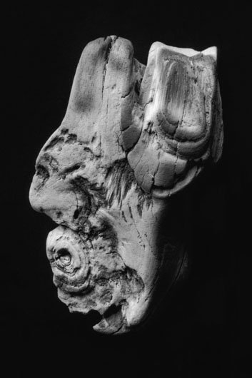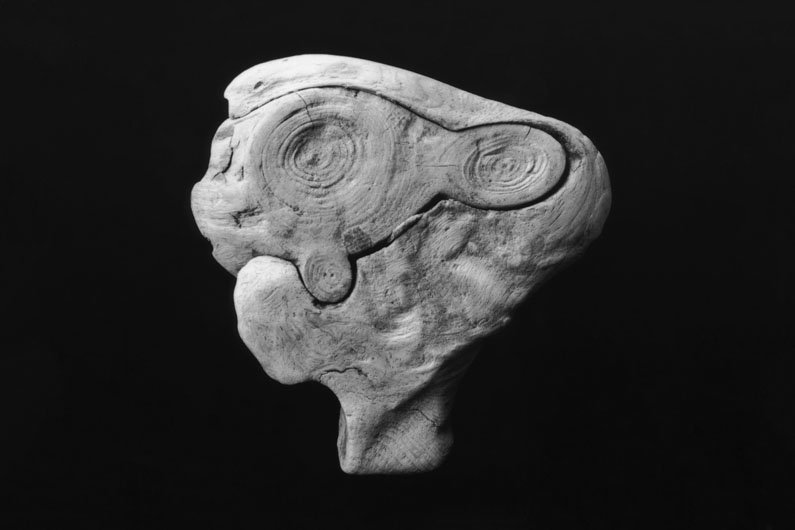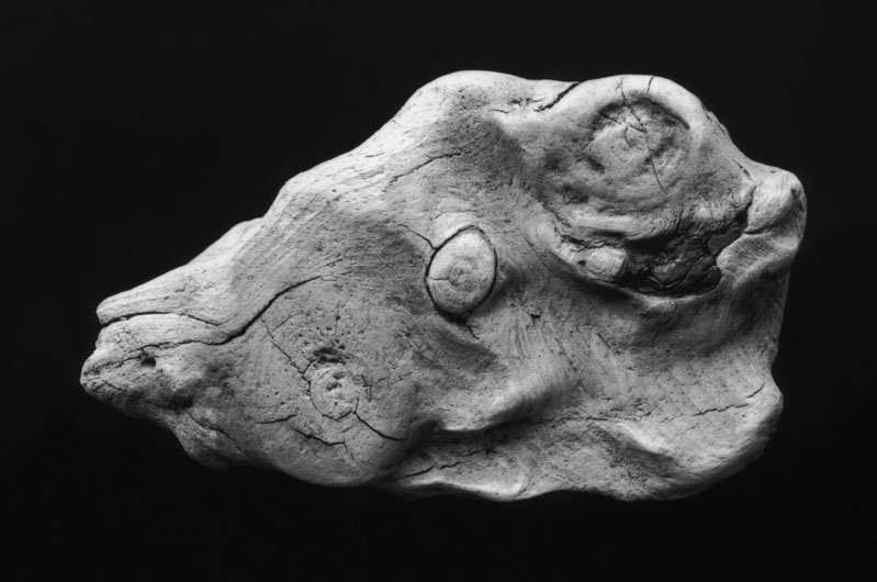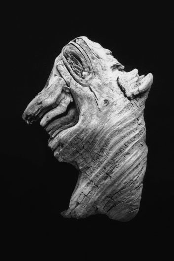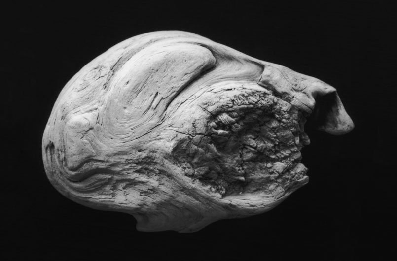 In the East Wing, CvsD is proud to present black- and-white photographs by Barbara Rossi in the exhibition Slippers. Never before publicly exhibited, these photographs open a new view to the artist’s enigmatic practice. Charged with the same mystery and paradoxical qualities as her paintings and drawings, Rossi’s photography flips the everyday on its ear, evincing the marvelous from the mundane. In these small, exquisite compositions, driftwood shifts and slides into anthropomorphic portraits that feel more like topography or celestial swirls than cast-off wood left along beaches and shorelines. Like Giusseppi Arcimboldo’s amalgams of vegetables or fish, Rossi’s wooden figures snap from complete abstraction into resolute figuration, and once the face appears it is impossible not to see. Harmony of shadow and light couples with a sophisticatedly simple, but dramatic, staging to leave one in the gaze of each single driftwood personnage. As photographs, Rossi’s Slippers are basically unique in the canon of works by Chicago Imagist artists, who did not as a rule turn to photography as a medium.