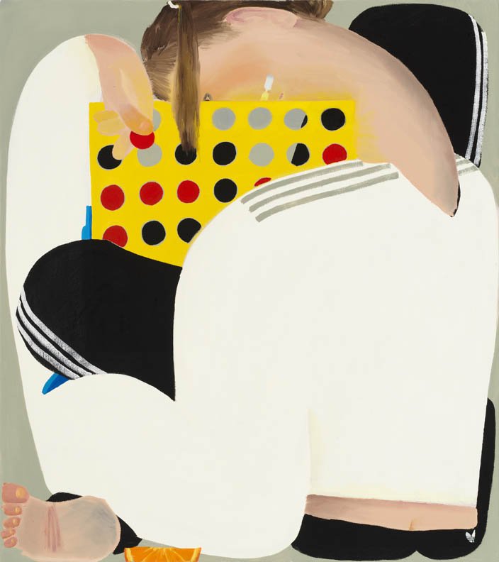 Celeste Rapone’s paintings share Odom’s commitment to the everyday, but where Odom’s work always insinuates an absent human, Rapone hides her figures in complex, often labyrinthine compositions. Narrative, situational paintings, they are portraits of singular women (and a few men), or pairs of figures, in some thematically specific context drawn from a job or activity, unfamiliar to Rapone, that she might do if she fails as a painter. Arms and legs are convoluted into impossible shapes, hints of flesh showing where the body is but clothes and objects obscuring the integrity of the being. In “Everlast,” a boxer’s gloves arch up from the bottom of the canvas, a checkered ring swallowing the torso; “Girl Friday” features an office worker depicted from a low perspective made more claustrophobic by a drop ceiling. In “Working,” a red-faced woman in work boots strains over her Thighmaster, a ruler slyly assessing progress at painting’s bottom. These elements are all executed with sensitivity to facture, surfaces exuding painterly life, patterns pushing hard against organic forms. The large “Big Reach” finds two rock climbers working a wall; their physiques are shaped by their task to the point that they are turned in on themselves, even as one of them holds aloft a cell phone for a selfie. Playful and at times darkly sociological, these paintings are spectacular concatenations of light and limb, bittersweet caricatures of ambition and defeat, and most of all intricate constructions of pigment and form.