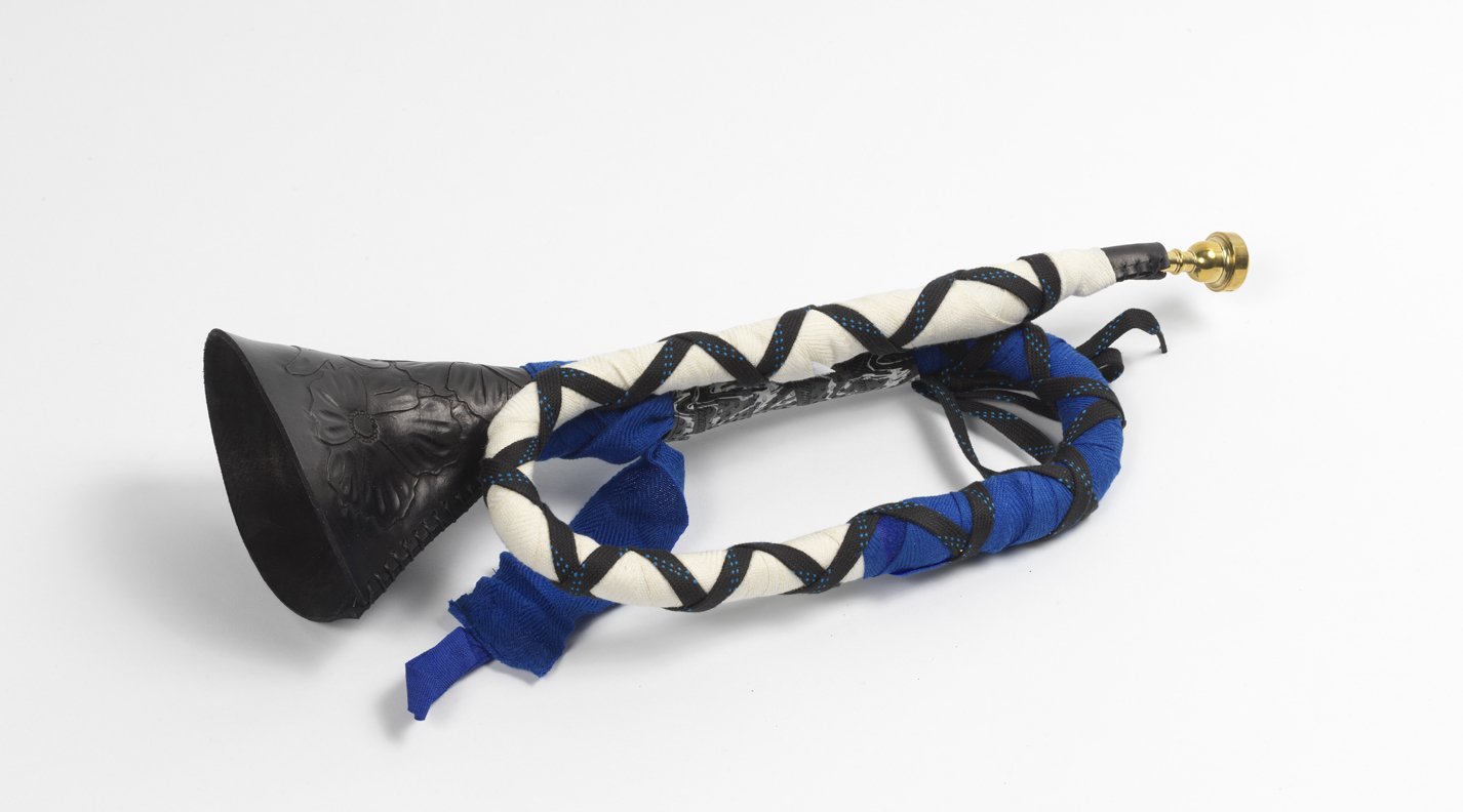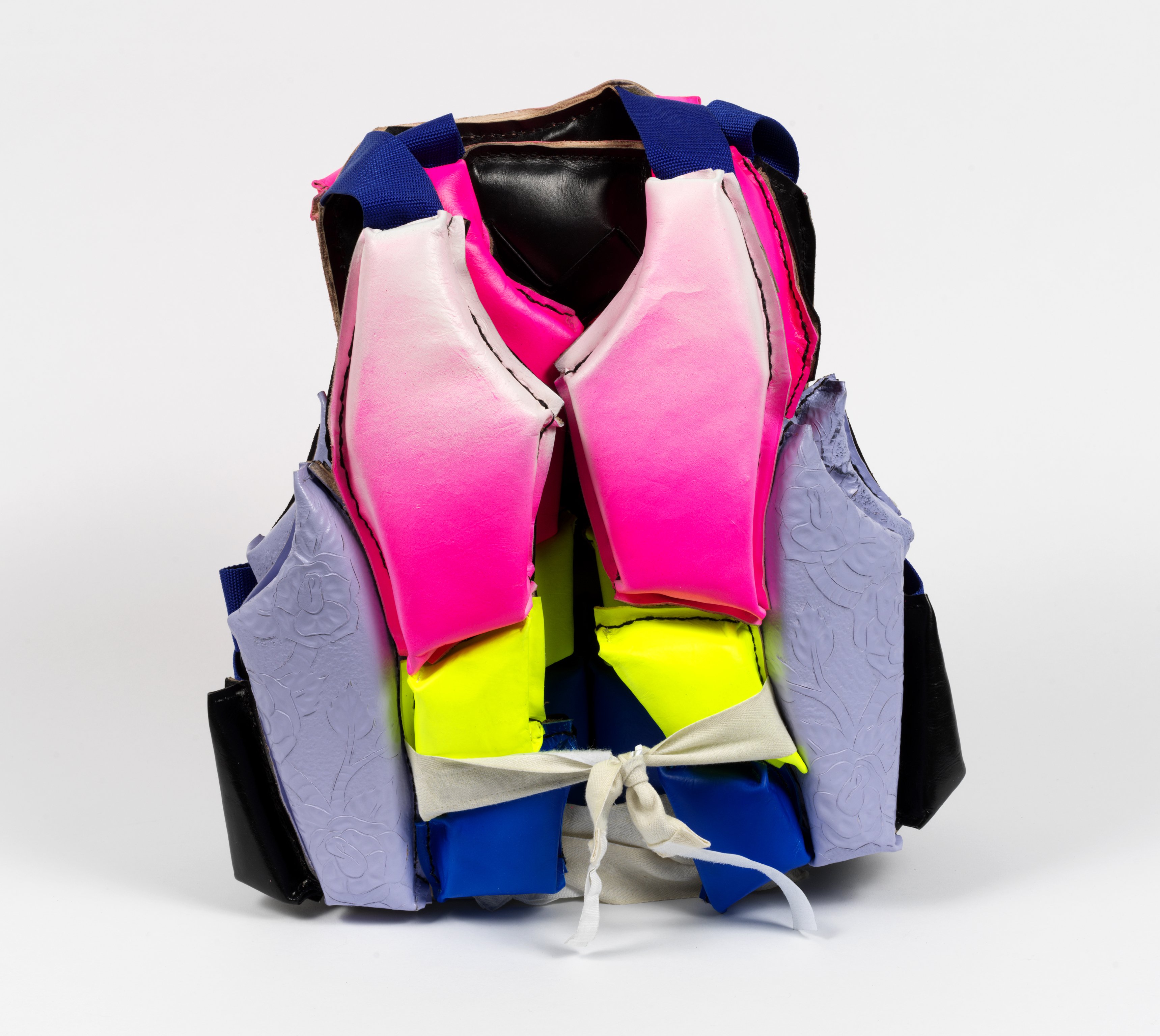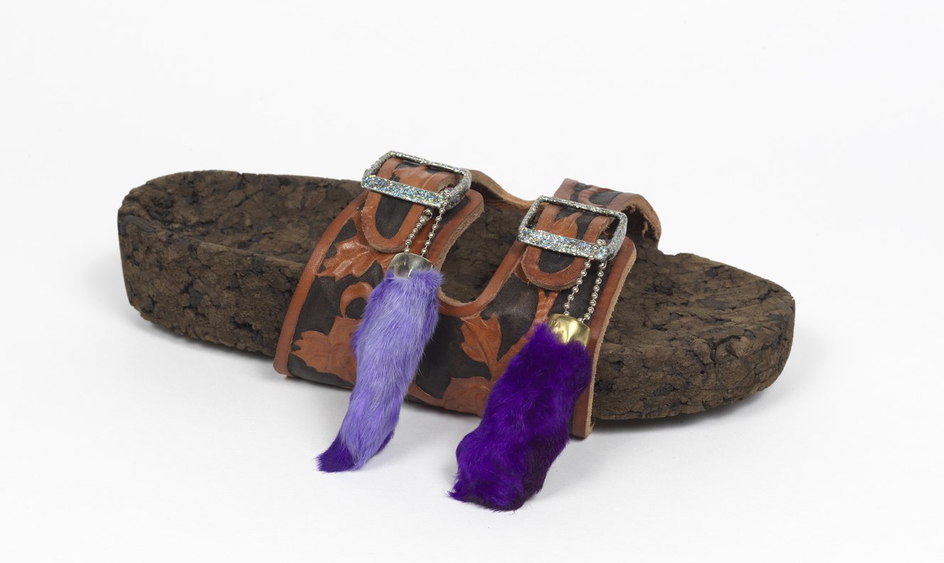 culptor Betsy Odom works in common materials – leather, in particular, but also fabric, cork, plywood, strapping, grommets, foam, and underwear elastic. A magician of the quotid- ian, she fabricates articles of clothing, often sports-related gear, gently but persuasively undoing their overdetermined cultural associations and rebuilding them from square one. A pair of gym shorts, “Gym Shorts,” for instance, stands on its own, rigid, caught in motion, perhaps conjuring athletic clothing that’s been left in the locker too long, but also offering a host of beautiful mahogany bumps and curves, its perfectly tooled surface as sensuous as it is uncanny. The catcher’s mitt of “Bulldog 10” carries a lesbian-centric visual pun, while the exquisite detailing on a black dog glove, lined with shearling wool, on “Schutzhund Glove,” has a latent intimation of BDSM. Odom’s objects are humorous, but rigorous. Like H.C. Westermann, her meticulousness of craftsmanship is always at the service of the artistic idea, be it conceptual or aesthetic. Two immaculate, eye-fooling articles of footwear, “Birken- stock” and “Doc” (a bedazzling Doc Marten) show the range, from patchouli to punk
