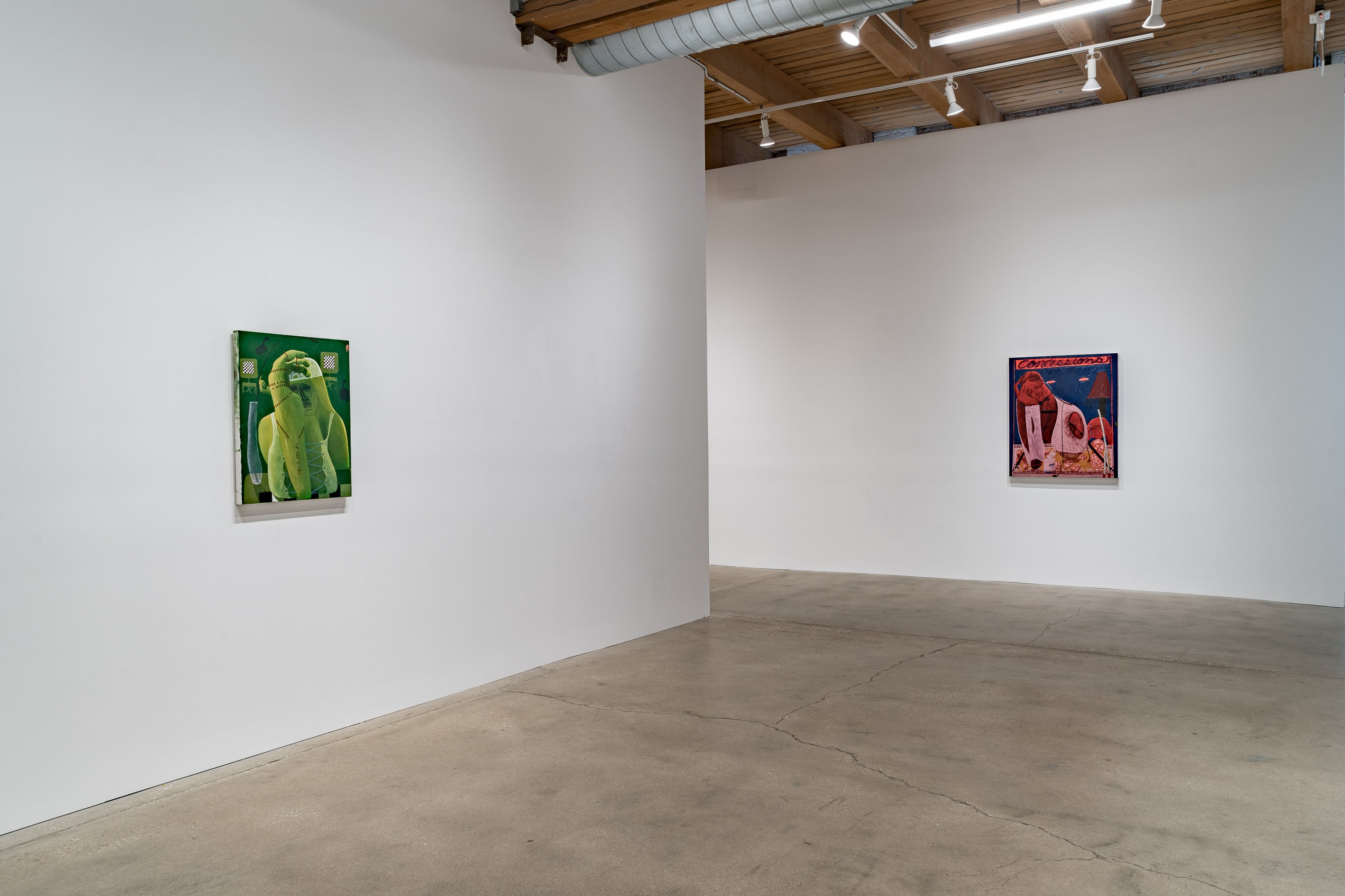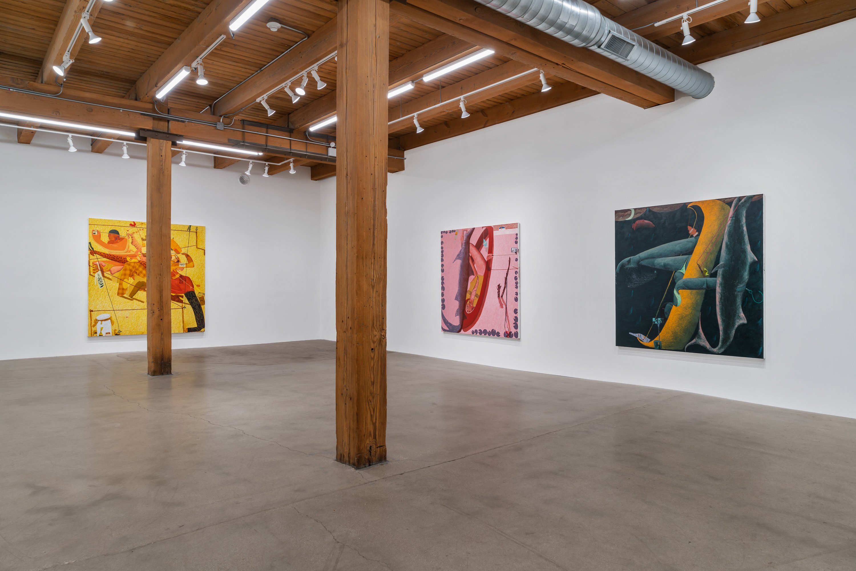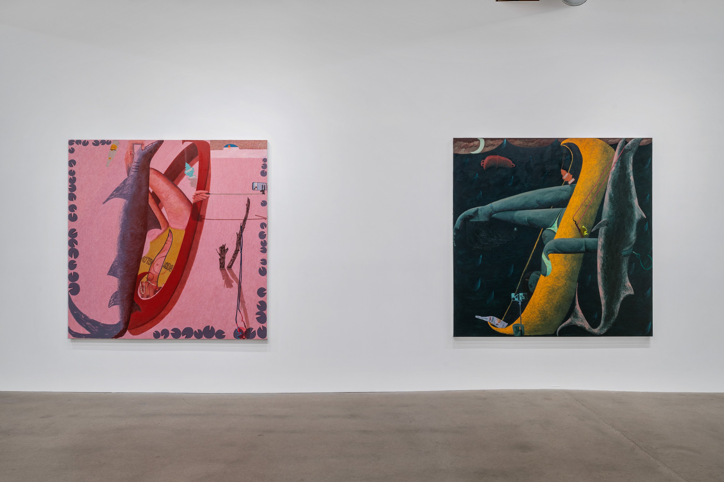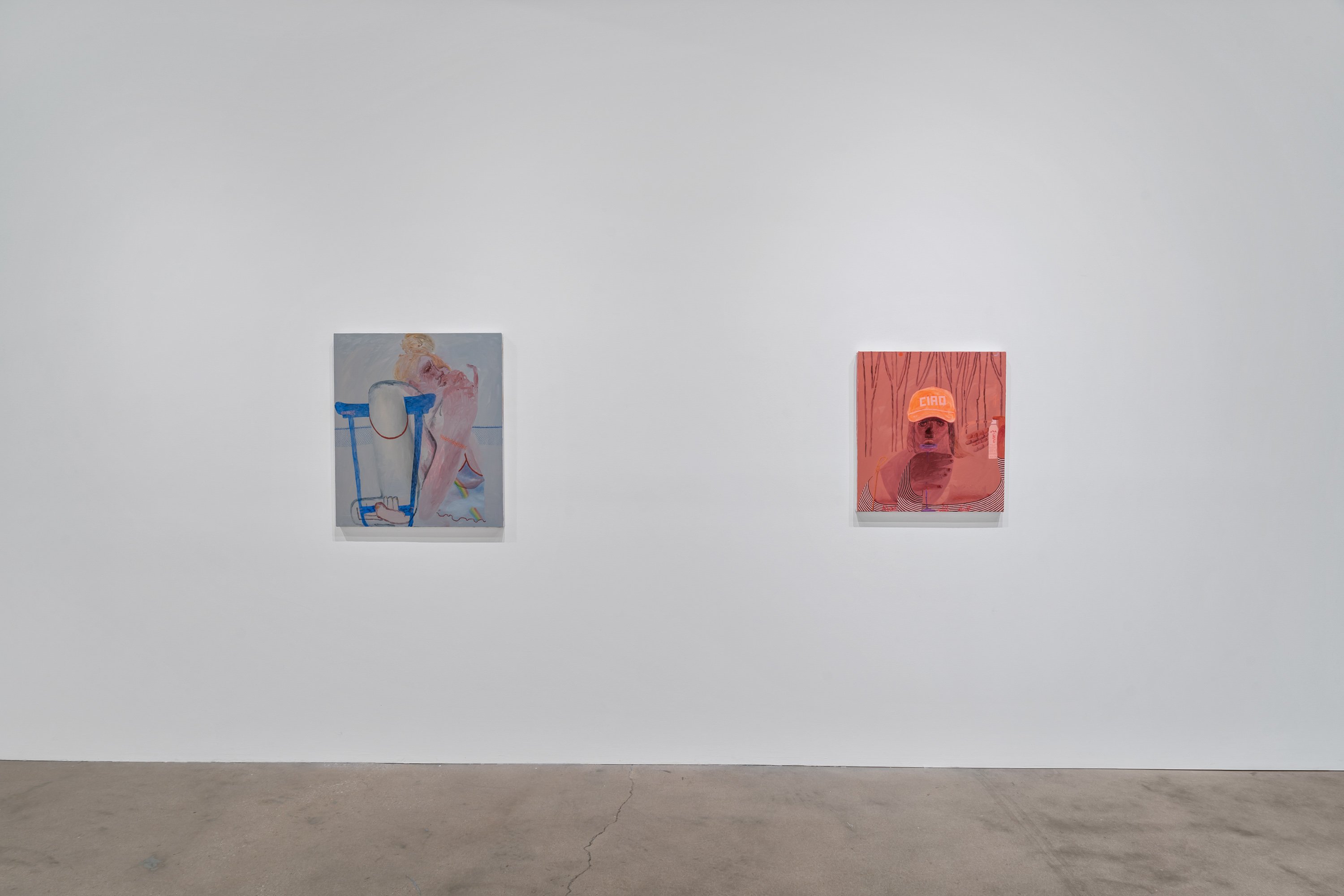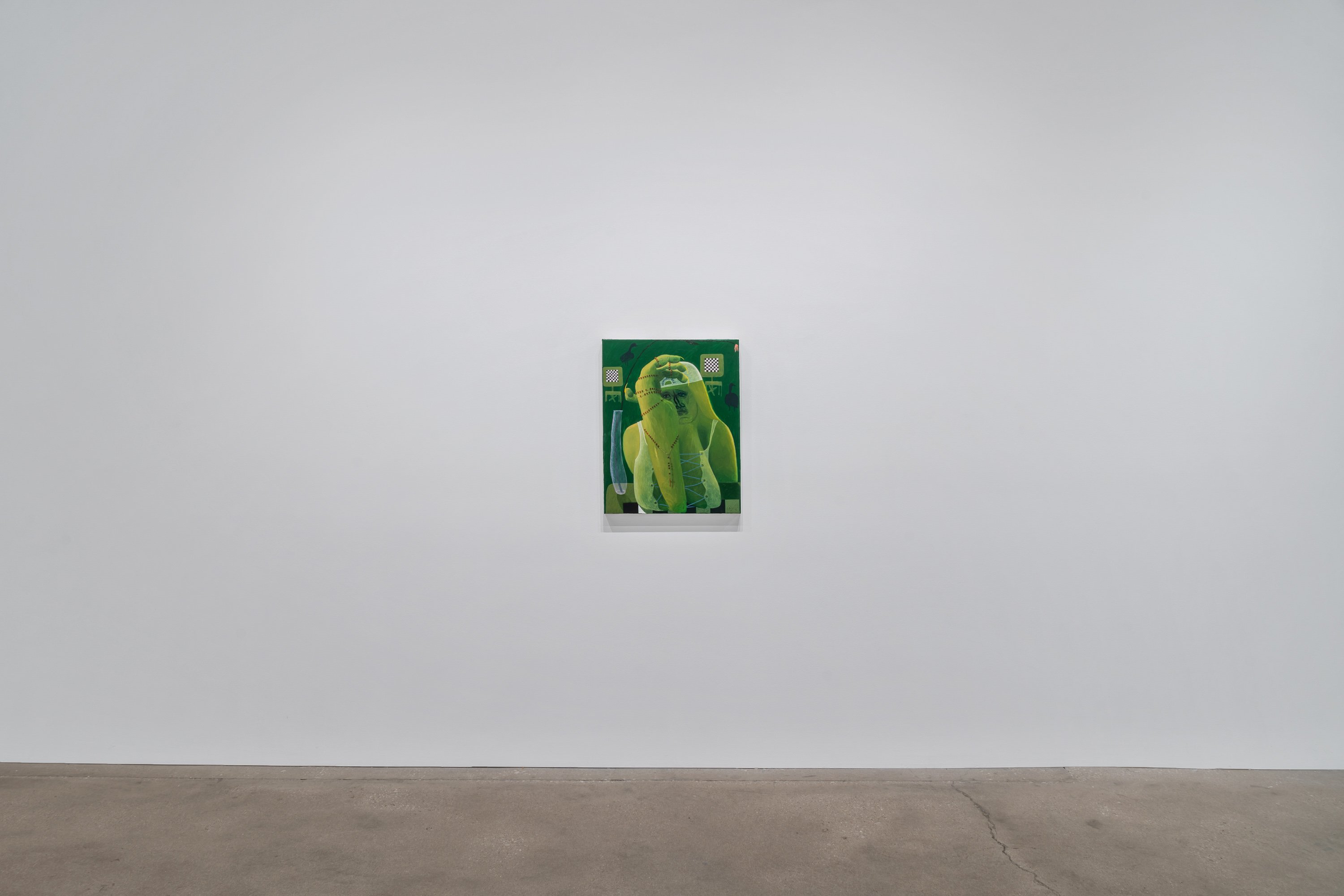 In her most recent group of paintings, Celeste Rapone addresses a certain feeling of embarrassment around the public expression of ambition, especially for women. Something like the hollow conceit of public competitiveness. Rapone divides these eleven canvases into "spectacles" – her large-scale works, which are among the biggest she has yet made (a kind of artistic ambition, certainly an intentional self-reference) – and "spectators" – her small-scale portraits, all of which are dealing with an expression of resignation or regret. In the spectacles, she creates images of women over-performing, reaching extravagantly for the golden ring, with ambivalent or awkward results. Rather than lampoon these figures, they are approached with a kind of oblique empathy, hoisted by their own petards. These works are composed as stage-like tableaus, with women playing oversized chess in the park, hiking up a public trail, spotlit on a proscenium, or shark fishing from a canoe. Their smaller counterparts might be their viewers, women with heads hanging, one selling concessions but also having conceded.