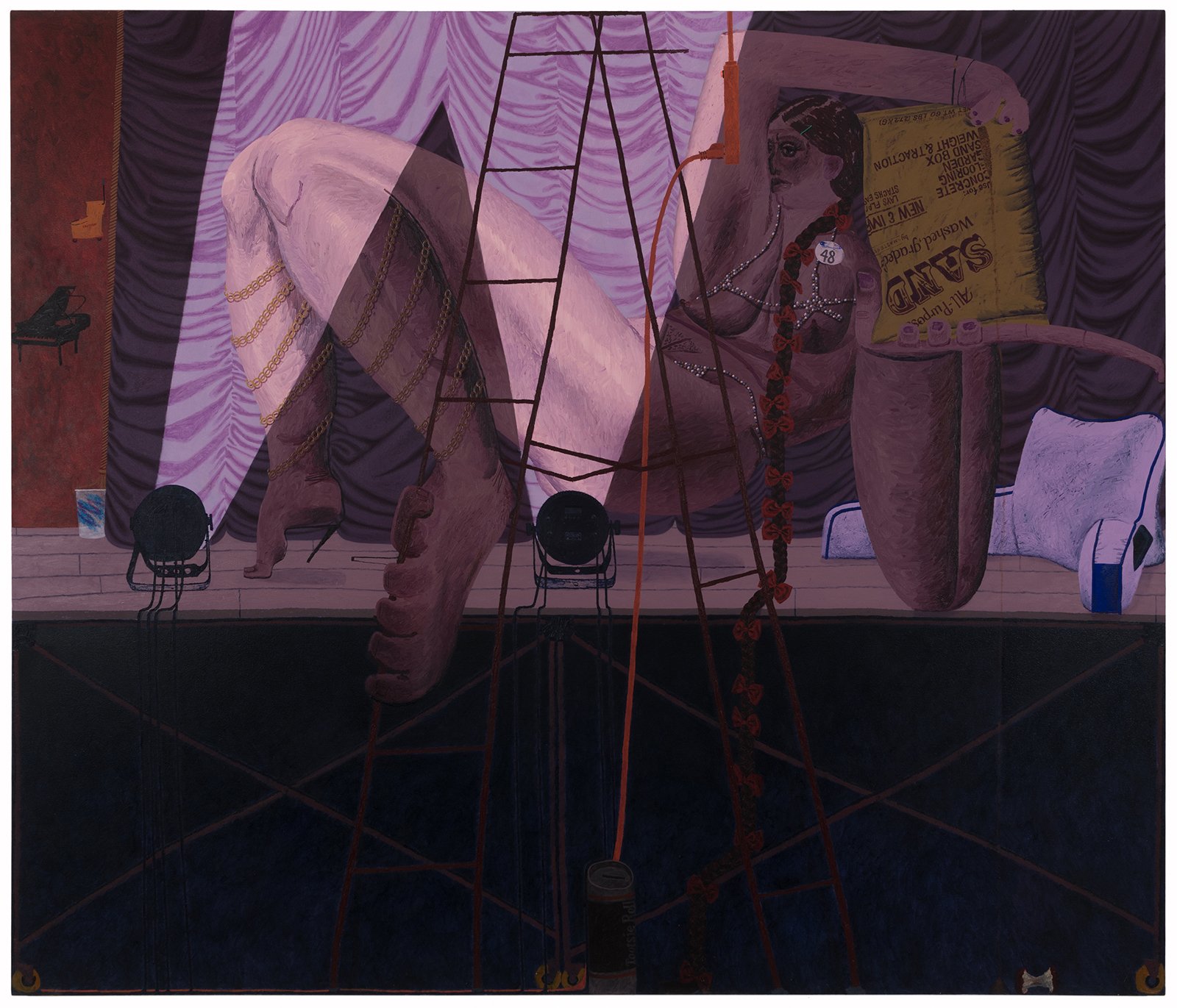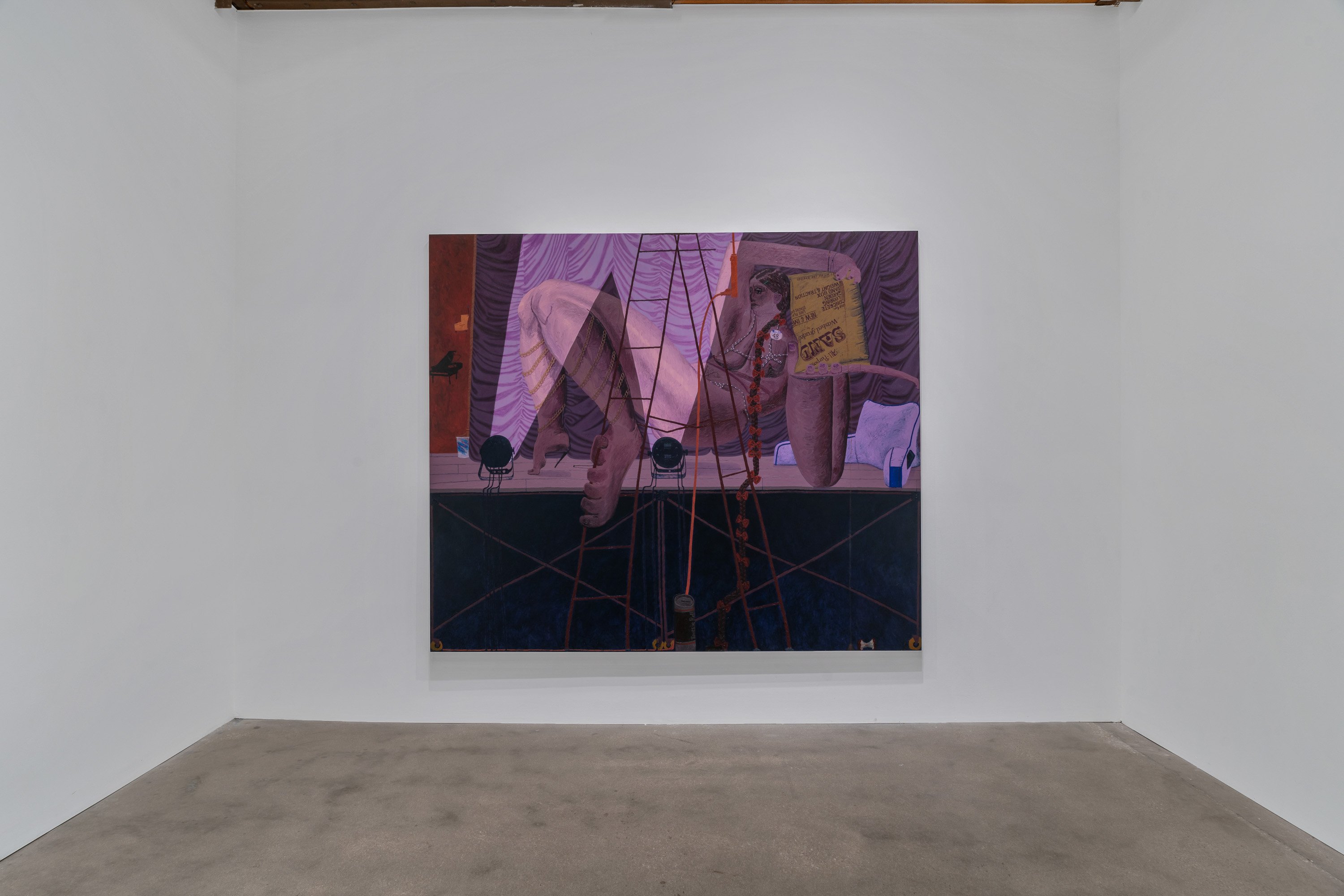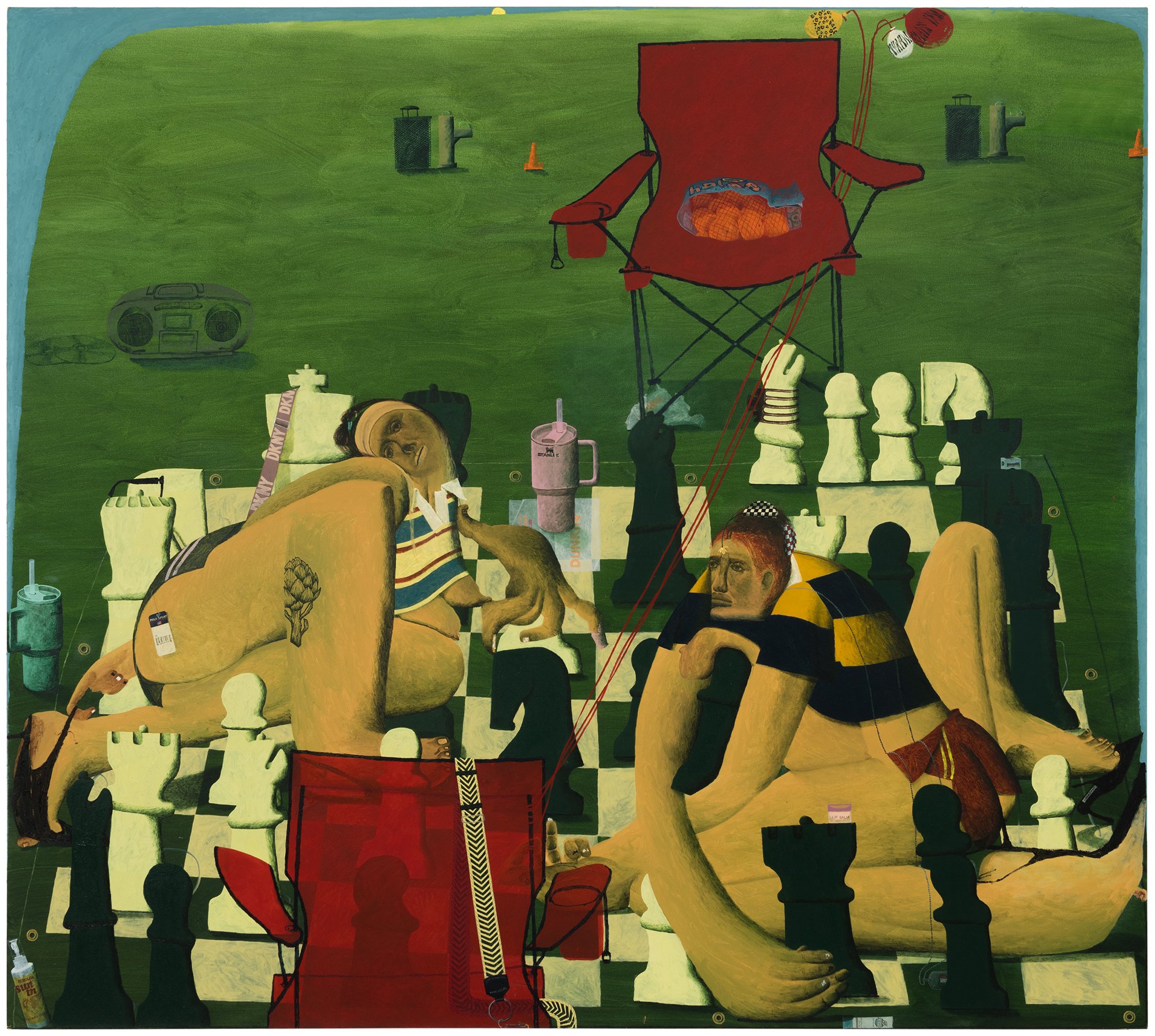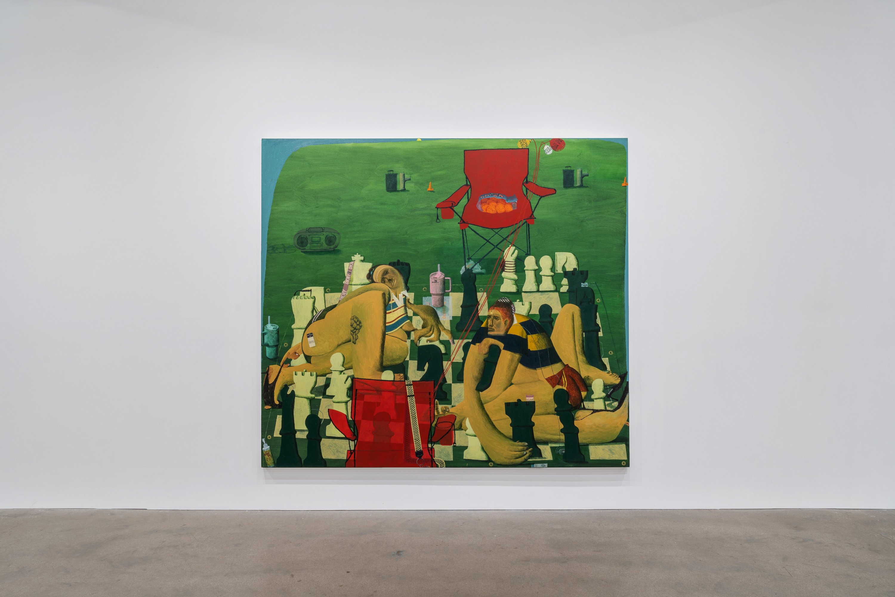 As always, Rapone's compositions are spatially complex and require time to unpack – details (often hilarious references to popular or mass cultural objects and their attendant packaging) jostle with general forms (bodies, landscape, architecture) in ways that surprise and delight the careful viewer. Rapone paints alla prima, applying her materials directly, with no preparatory sketches, so the metaphor of over-preparedness that permeates these scenes is, for her, in an inverse relationship to her method of image-making, which is highly improvisatory and intuitive, starting with very basic color or shape ideas and building from that. She's thinking about painting strategies, history painting, the big picture in all senses. "What I was interested in with a comparison to chess is how in painting you make a series of choices and can't be sure how they'll unfold or respond to one another," says Rapone. "You keep going and try to enter from different angles until something opens up. And many times you lose. But then you get to try over and over and over again." Virtuosically painted, deploying a dizzying array of techniques in each composition, the scenarios of Big Chess chart a line between pathos and the pathetic, between aspiration and cringiness, all by means of a perspicacious visual imagination and uproarious sense of humor.