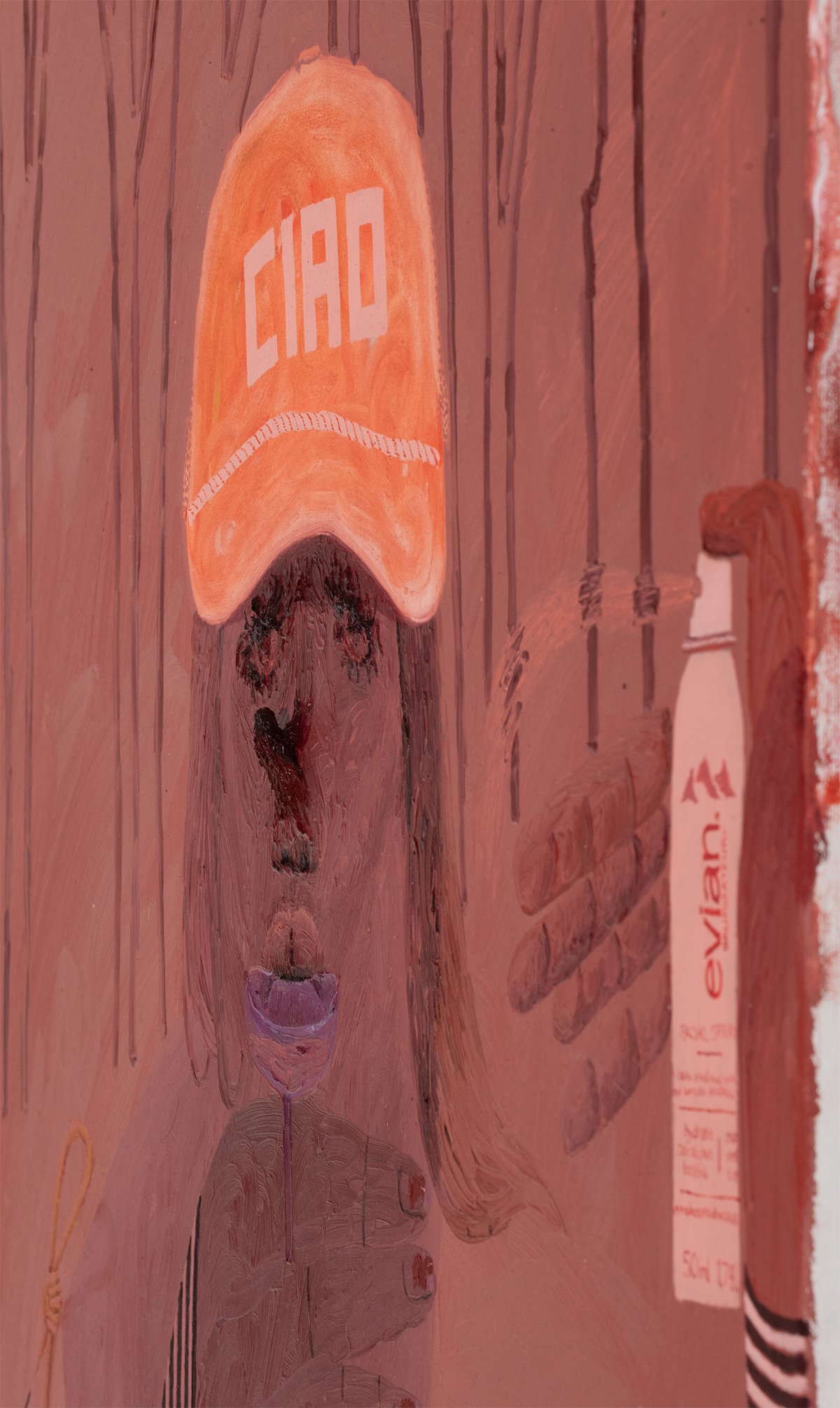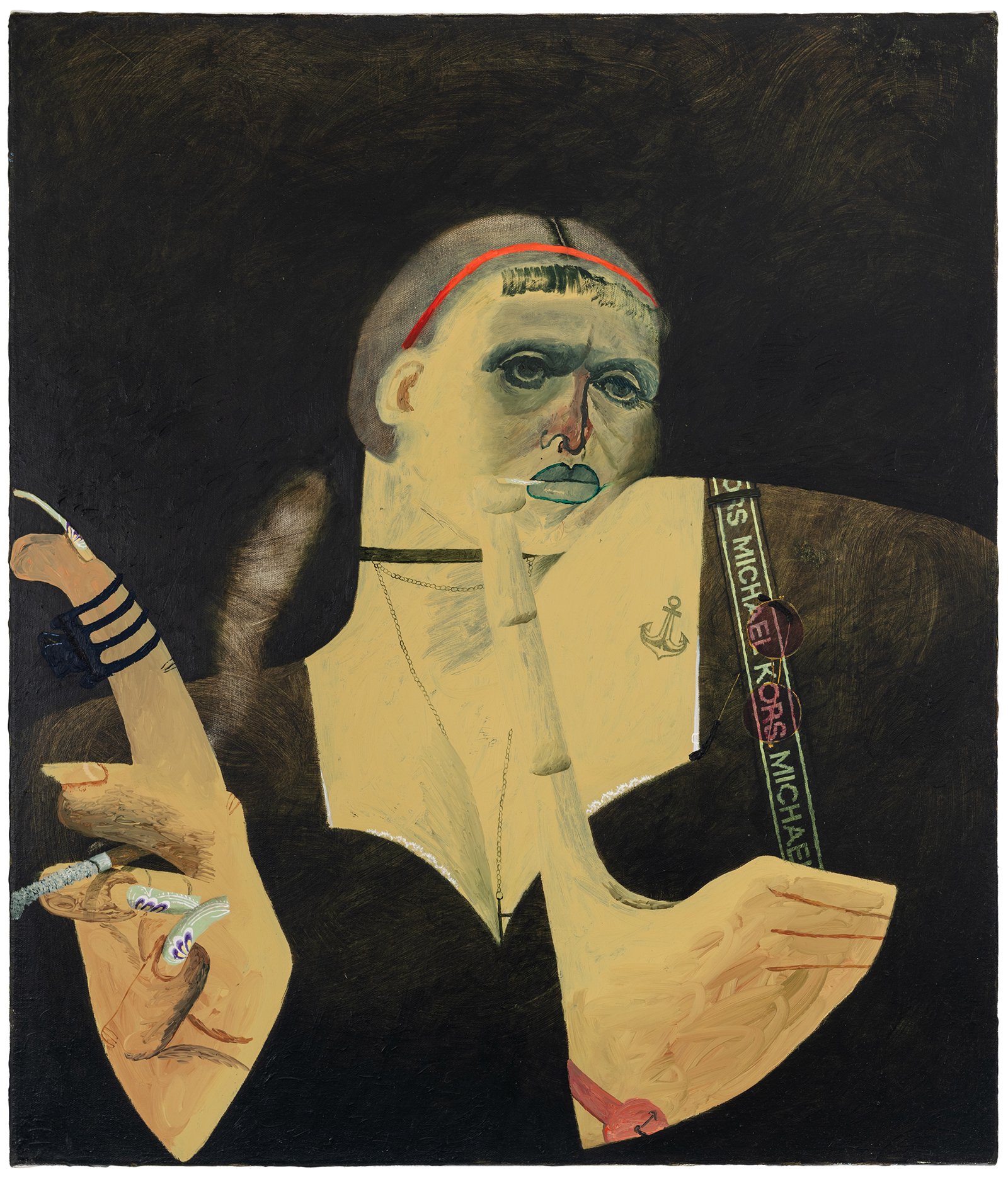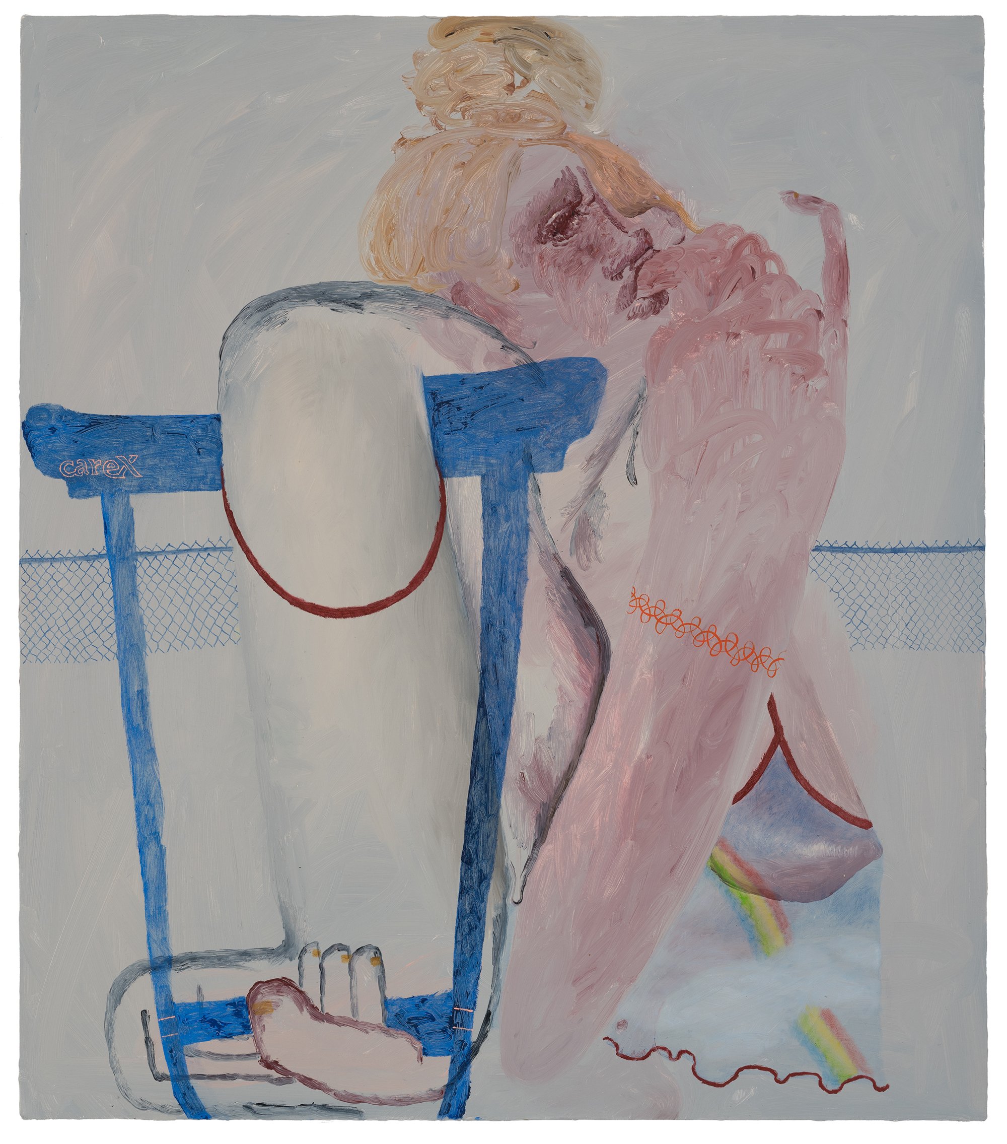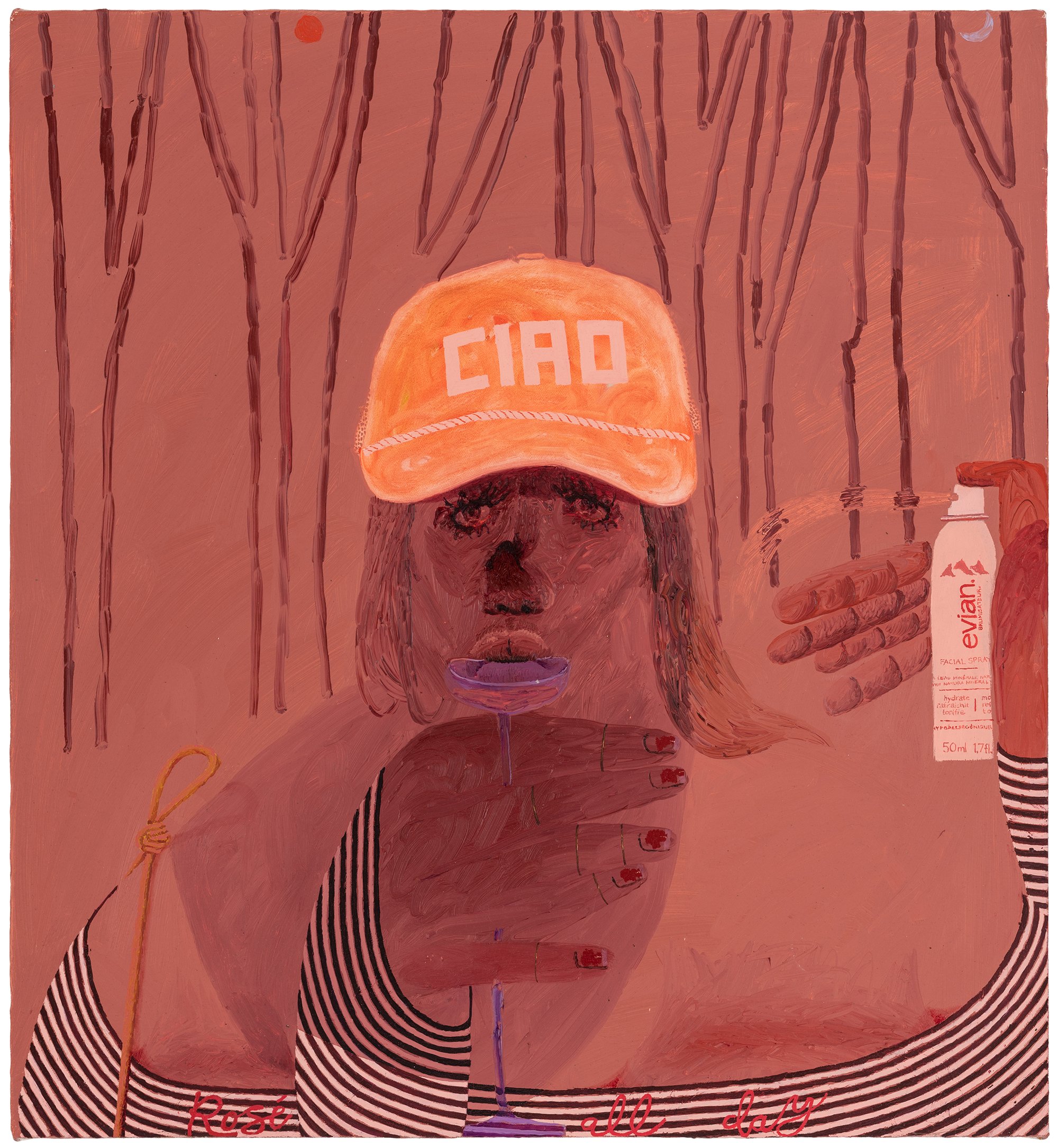 As always, Rapone's compositions are spatially complex and require time to unpack – details (often hilarious references to popular or mass cultural objects and their attendant packaging) jostle with general forms (bodies, landscape, architecture) in ways that surprise and delight the careful viewer. Rapone paints alla prima, applying her materials directly, with no preparatory sketches, so the metaphor of over-preparedness that permeates these scenes is, for her, in an inverse relationship to her method of image-making, which is highly improvisatory and intuitive, starting with very basic color or shape ideas and building from that. She's thinking about painting strategies, history painting, the big picture in all senses. "What I was interested in with a comparison to chess is how in painting you make a series of choices and can't be sure how they'll unfold or respond to one another," says Rapone. "You keep going and try to enter from different angles until something opens up. And many times you lose. But then you get to try over and over and over again." Virtuosically painted, deploying a dizzying array of techniques in each composition, the scenarios of Big Chess chart a line between pathos and the pathetic, between aspiration and cringiness, all by means of a perspicacious visual imagination and uproarious sense of humor.