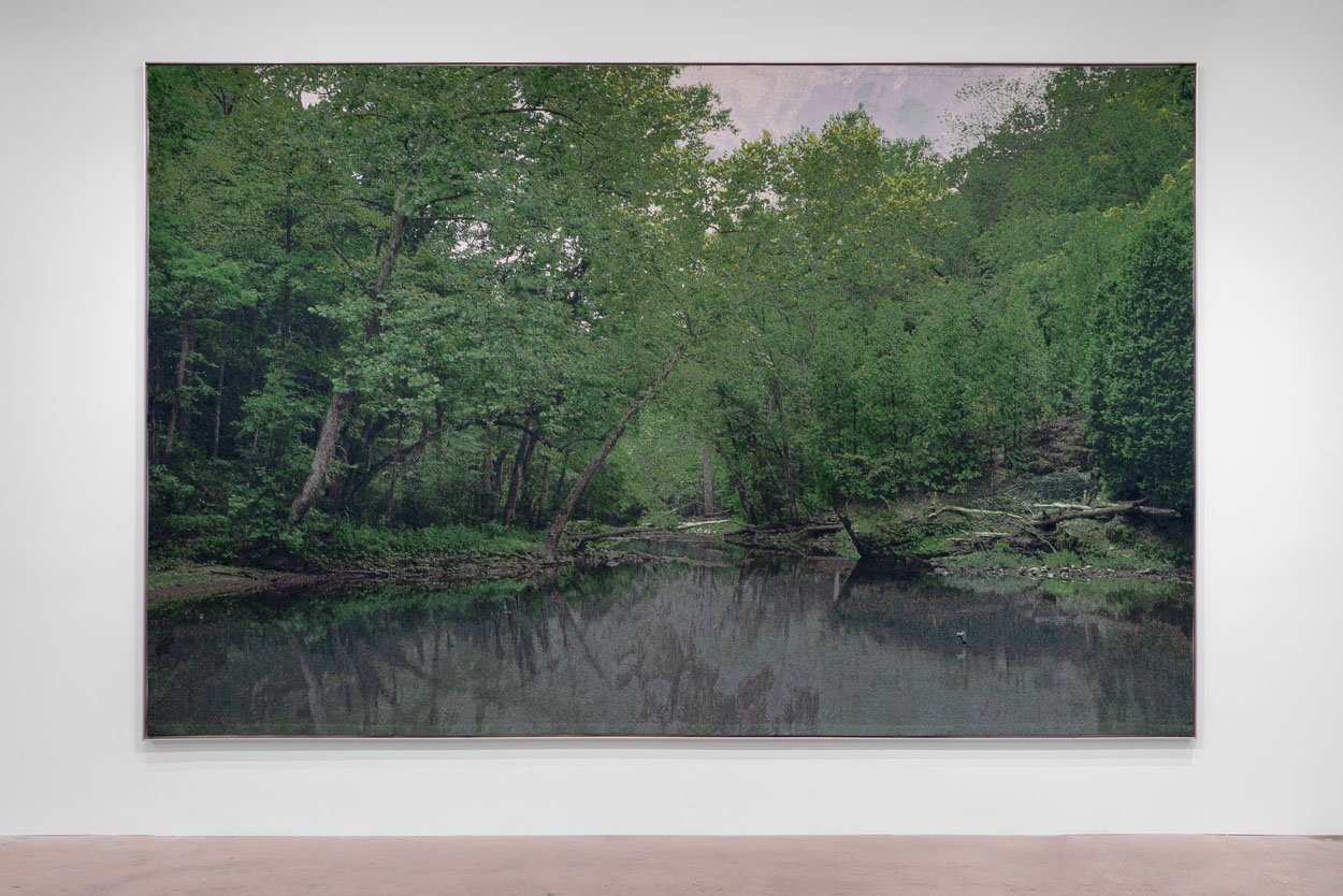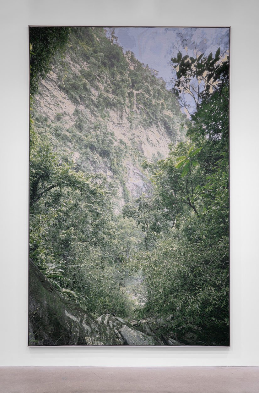 Two 19th century landscape painters serve as further points of reference – Trinidad’s first internationally known artist, Michel-Jean Cazabon (1813-1888), who trained in Paris and was a member of the Barbizon School, and Robert Duncanson (1821-1872), the first internationally known African American artist, the only Black Hudson School painter. “In order to understand post-colonial identity, you have to go to a colonial moment. If you’re looking at the movement of people, a diaspora, you must go back to when they were being mobilized, either of their own volition or by force.” Hartt took photographs of the exact location where Duncanson’s famed “Blue Hole on the Little Miami River” was painted in Ohio and the Maracas Waterfall in Trinidad, a site where Cazabon made several paintings. Hartt’s images were then woven into tapestries, which allows them to function at monumental scale, and, because at close distance the images break up and texture is enhanced, they also are rendered more abstract, further diffusing the direct references to Cazabon and Duncanson.