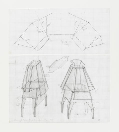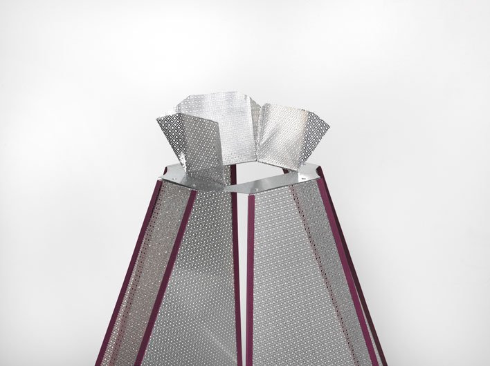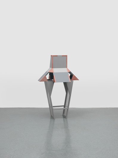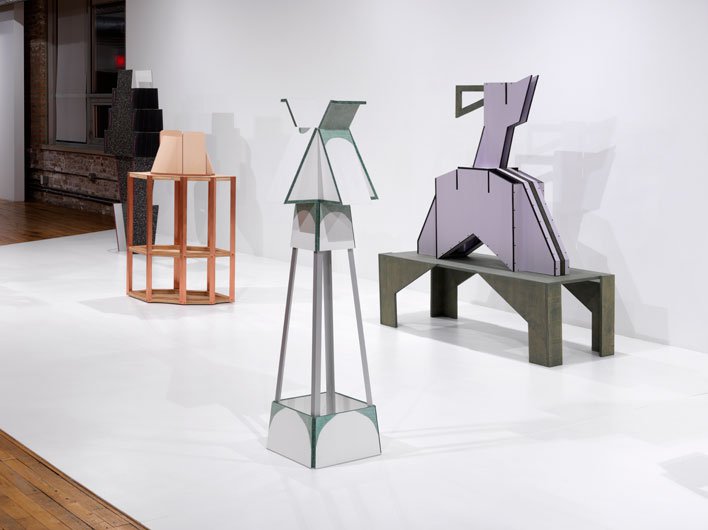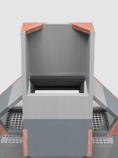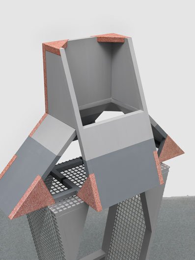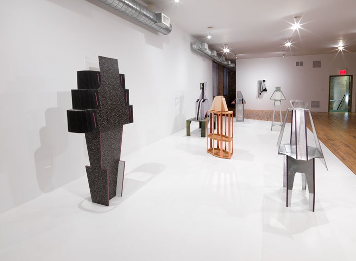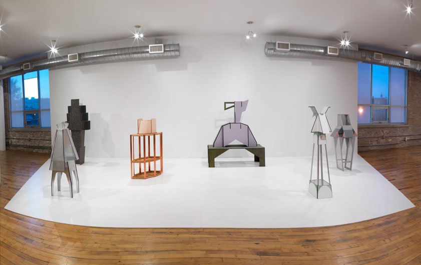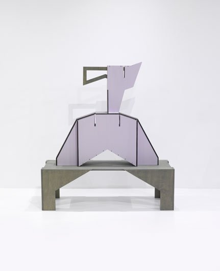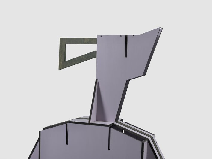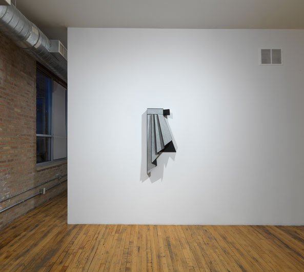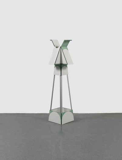 Continuing a line of inquiry that she’s been diligently and exhaustively following since the 1970s, Simpson constructs artworks that examine relationships between clothing and architecture, between design and affect, and between drawing and sculpture. In seven newly unveiled works – six floor-standing and one wall-hanging – she delves primarily into one form: the peplum. As Benjamin Chaffee explains in his catalog essay: “The etymology of the word relates to the Greek word, ‘peplos,’ a long tunic-like garment worn by women in ancient Greece…Today a peplum is a short overskirt designed to be worn over another garment adding a decorative element, a literal flair.” These are human-scale vertical constructions, most of them featuring disparate materials, many industrial in nature, including aluminum, galvanized steel, LDF and MDF (light and medium density fiberboard), linoleum, spunbond polyester, and foamboard, sometimes accenting or patinating them with crayon, enamel, acrylic, or marker. Simpson is always acutely aware of angles, plying complexes of nested shapes as she superimposes one upon another, forcing geometry to yield a sort of grace. The resulting works call into play the constructed quality of human presentation, recalling Hugo Ball’s dada costumes, constructivist painting, and modernist design, but looking like nothing but Diane Simpson. In the last five years, Simpson has been steadily rising in international visibility, with a stunning survey at the ICA, Boston (2015-16) and a beautiful exhibition at the MCA, Chicago (2016), as well as solo shows in London (Herald St.) and New York (JTT), and group shows in Berlin, New York, Los Angeles, Glasgow, Portland (OR), and Washington DC. In addition to her new sculptures, Simpson will show several related drawings. The exhibition is accompanied by a full-color 56-page catalog with essays by Chaffee and Tessa Paneth-Pollak.