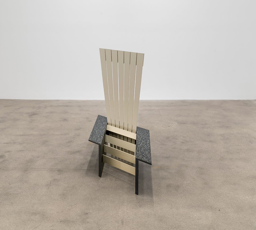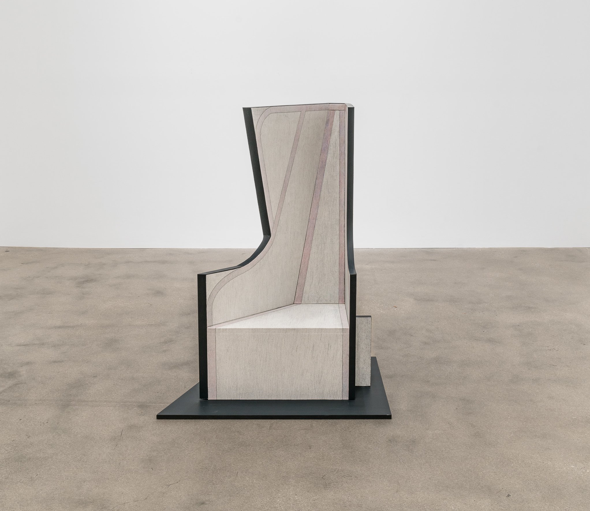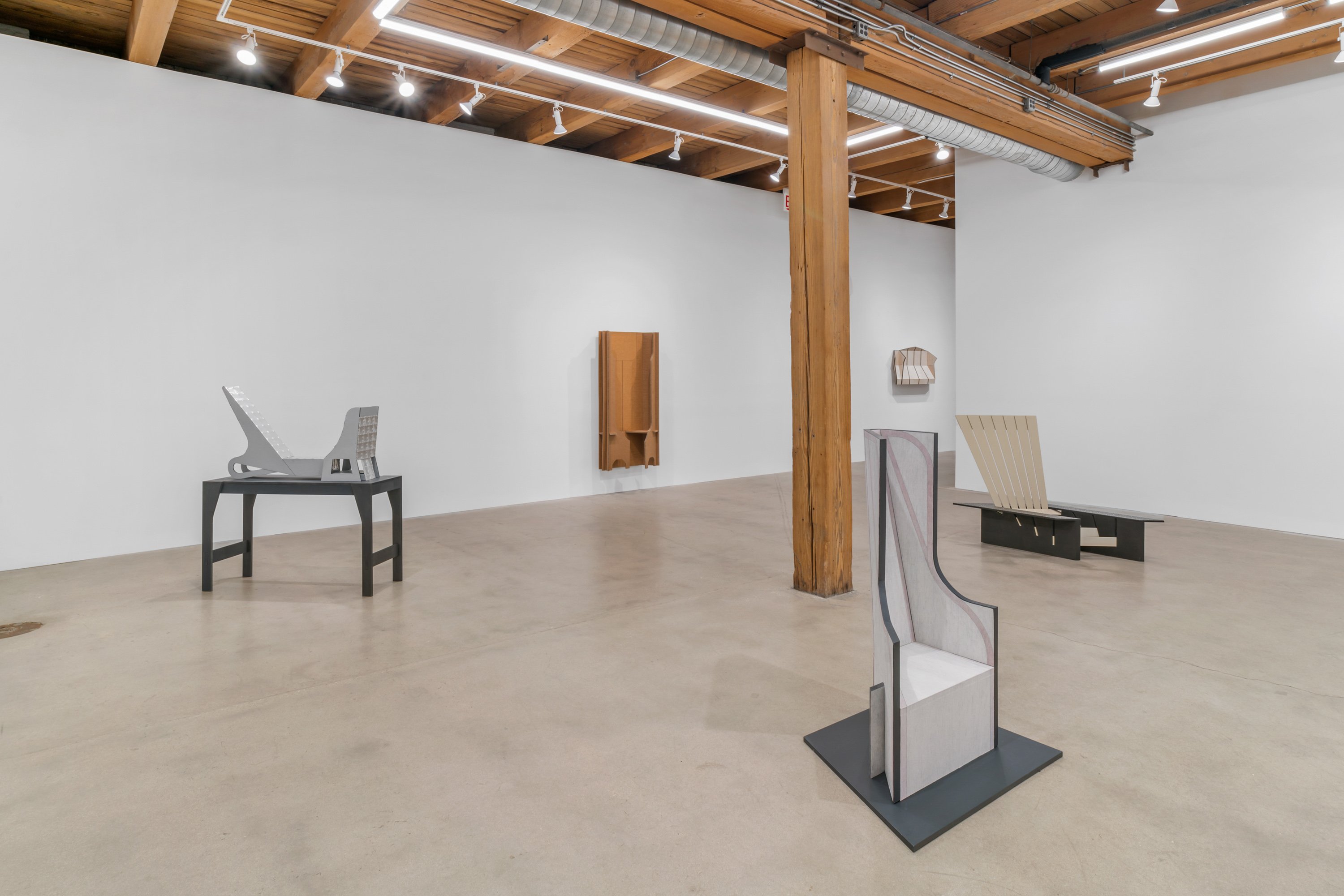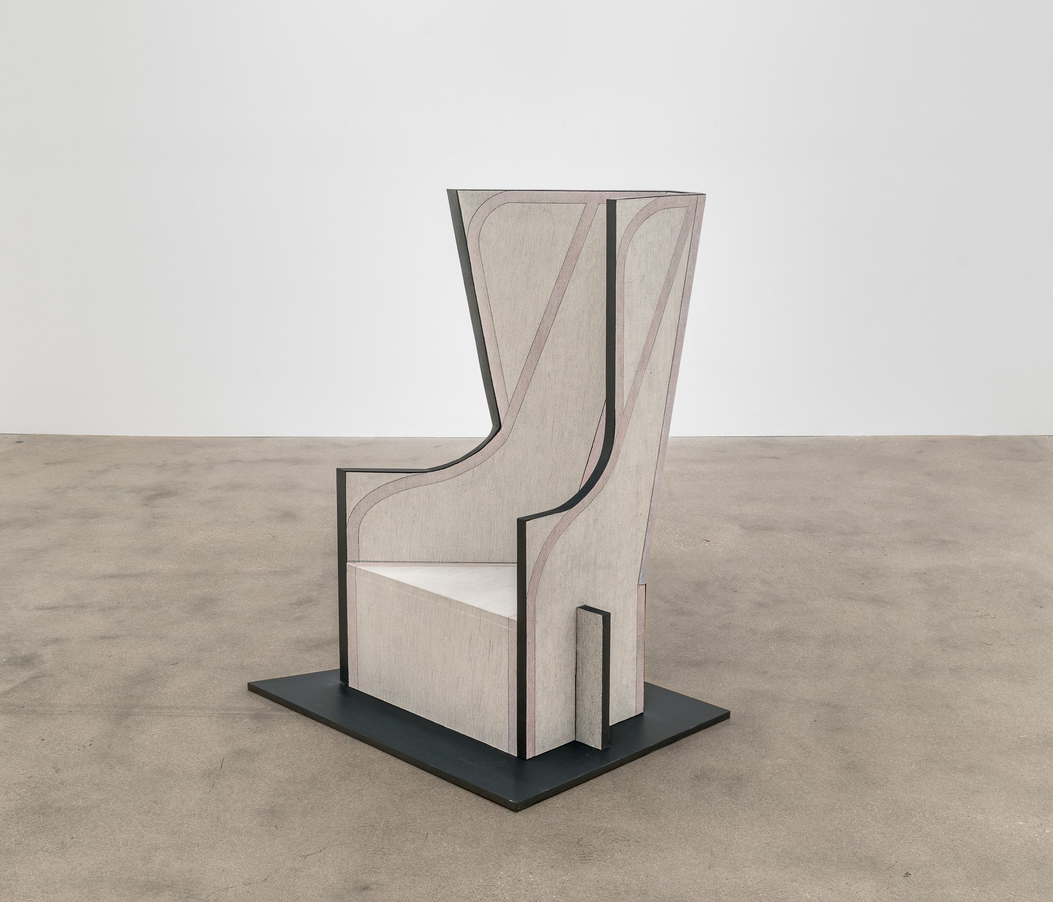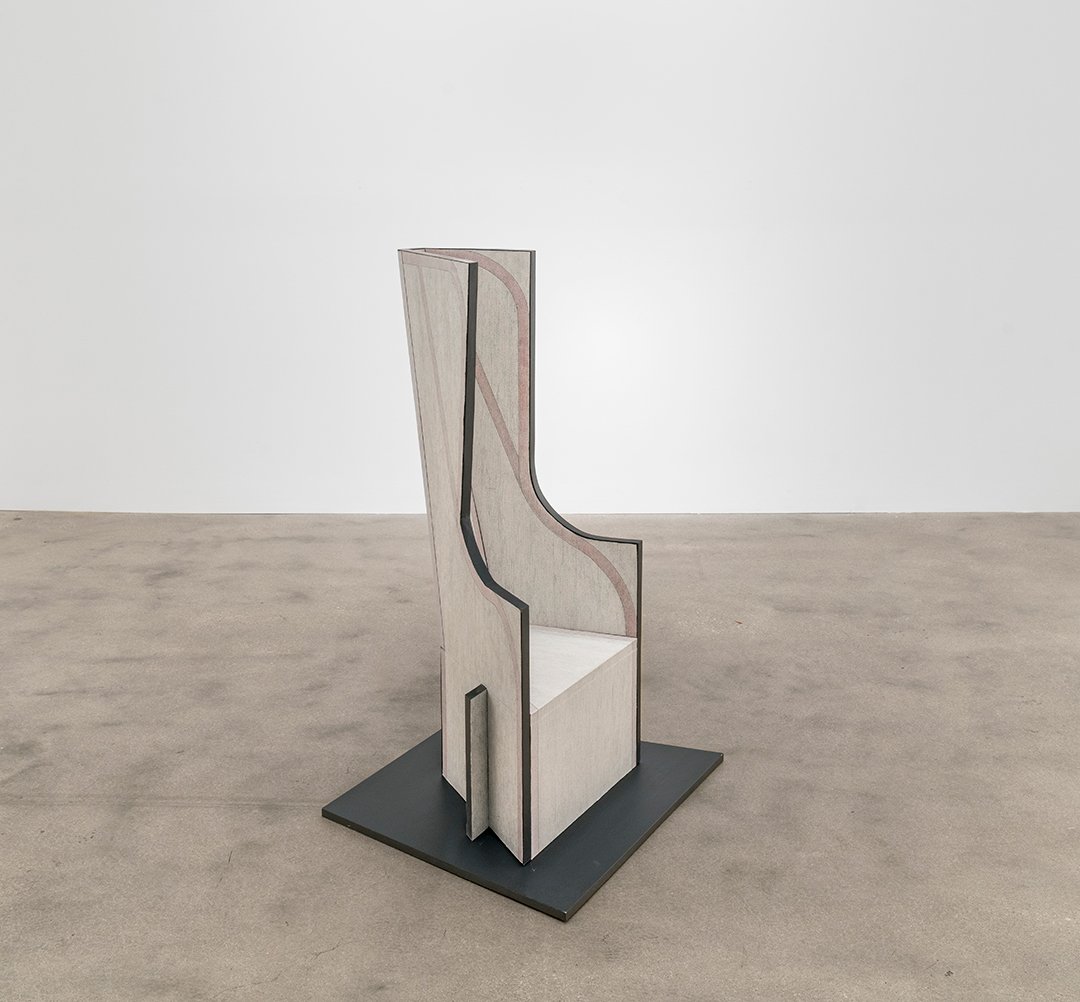 The work’s magic occurs in precisely aligned angles and calculated moments of disorientation, transforming quotidian forms, like that of an Adirondack chair – a common sight on lawns in the northern Chicago suburbs, near where Simpson lives – or embracing the odd, floating quality of a sled-like palanquin, which you’d never find in those environs. Like many of her Chicago compatriots, Simpson is an intrepid image-hound. Source material for this work comes from a vast repository of photographs taken by the artist as well as images she’s foraged from elsewhere, some of which she's held in her mind’s eye for many decades. All of the work is, in a sense, derived from her interest in architecture and human bodies – the architecture of clothing on the body, the architecture of bodies in spaces, and now the architecture of objects of repose. “It seemed natural to move from clothing to architecture to chairs,” she says. “I work from an image and develop the form from there.”