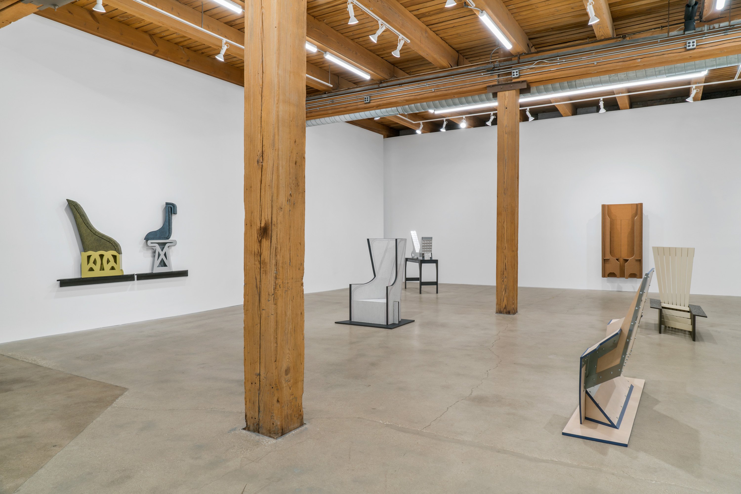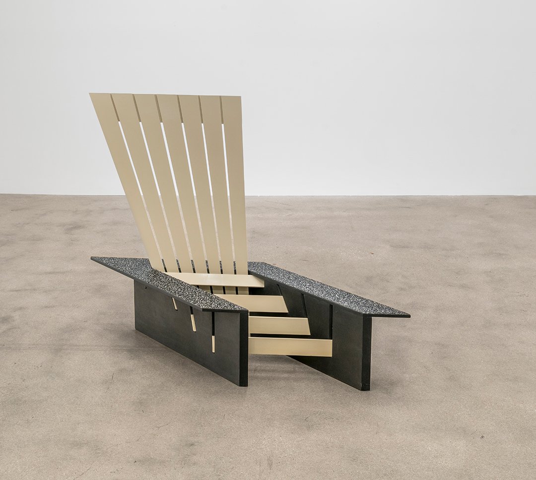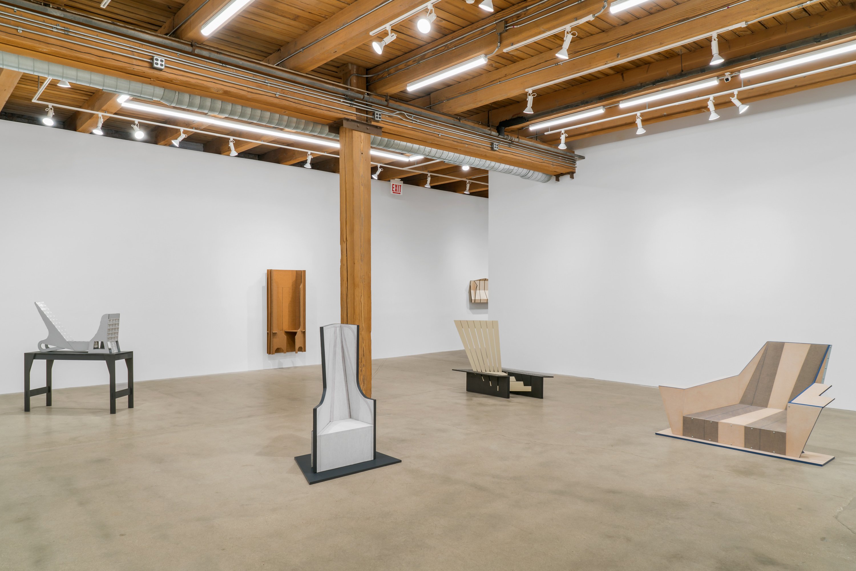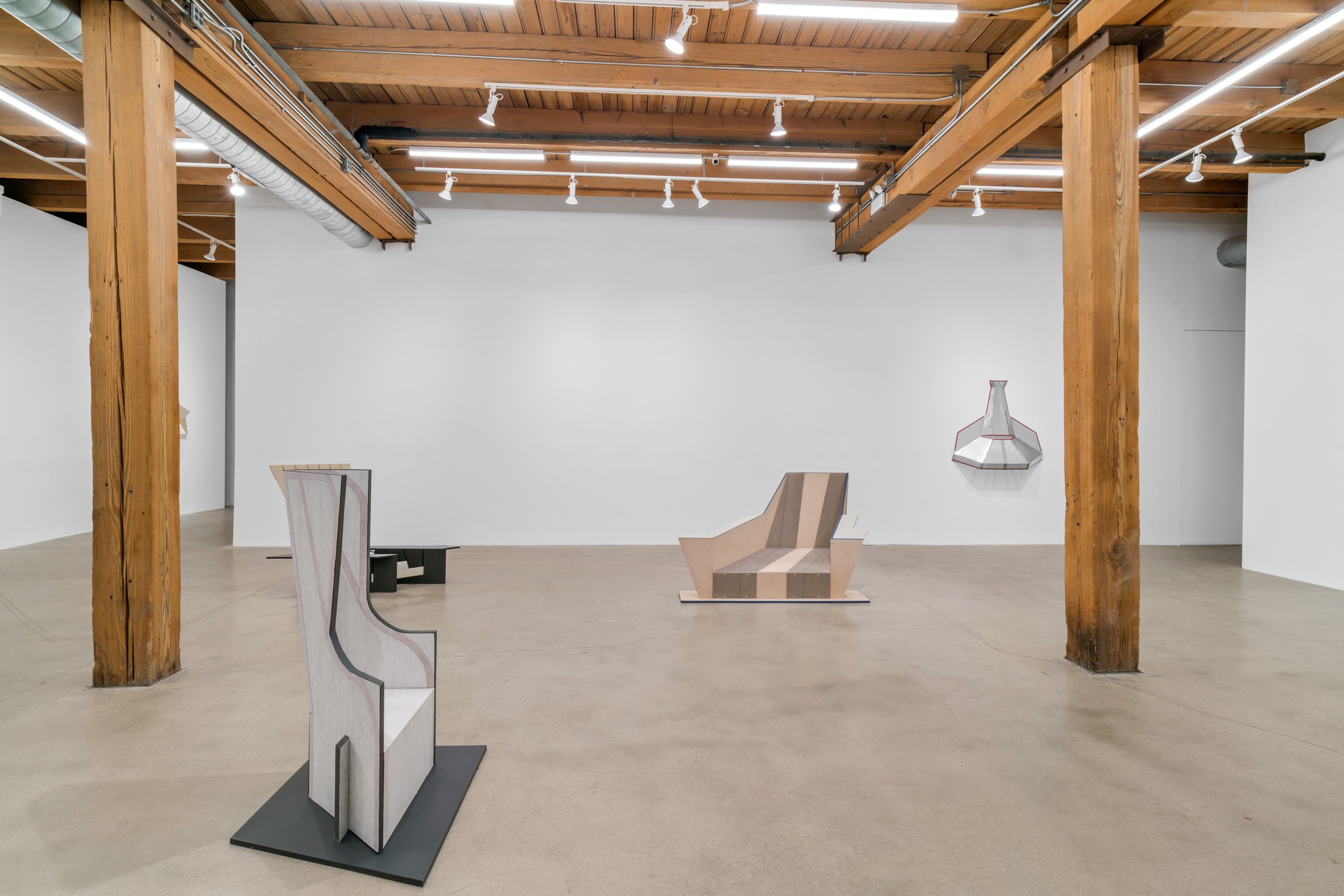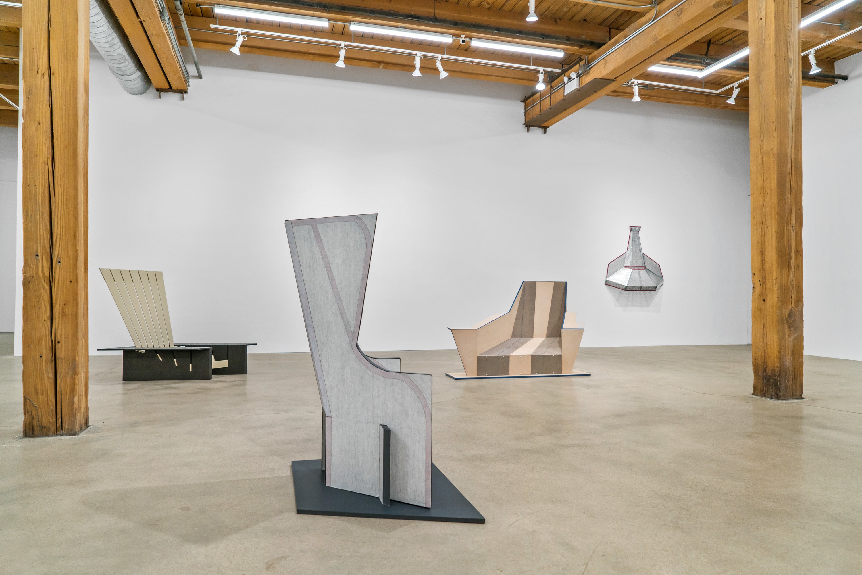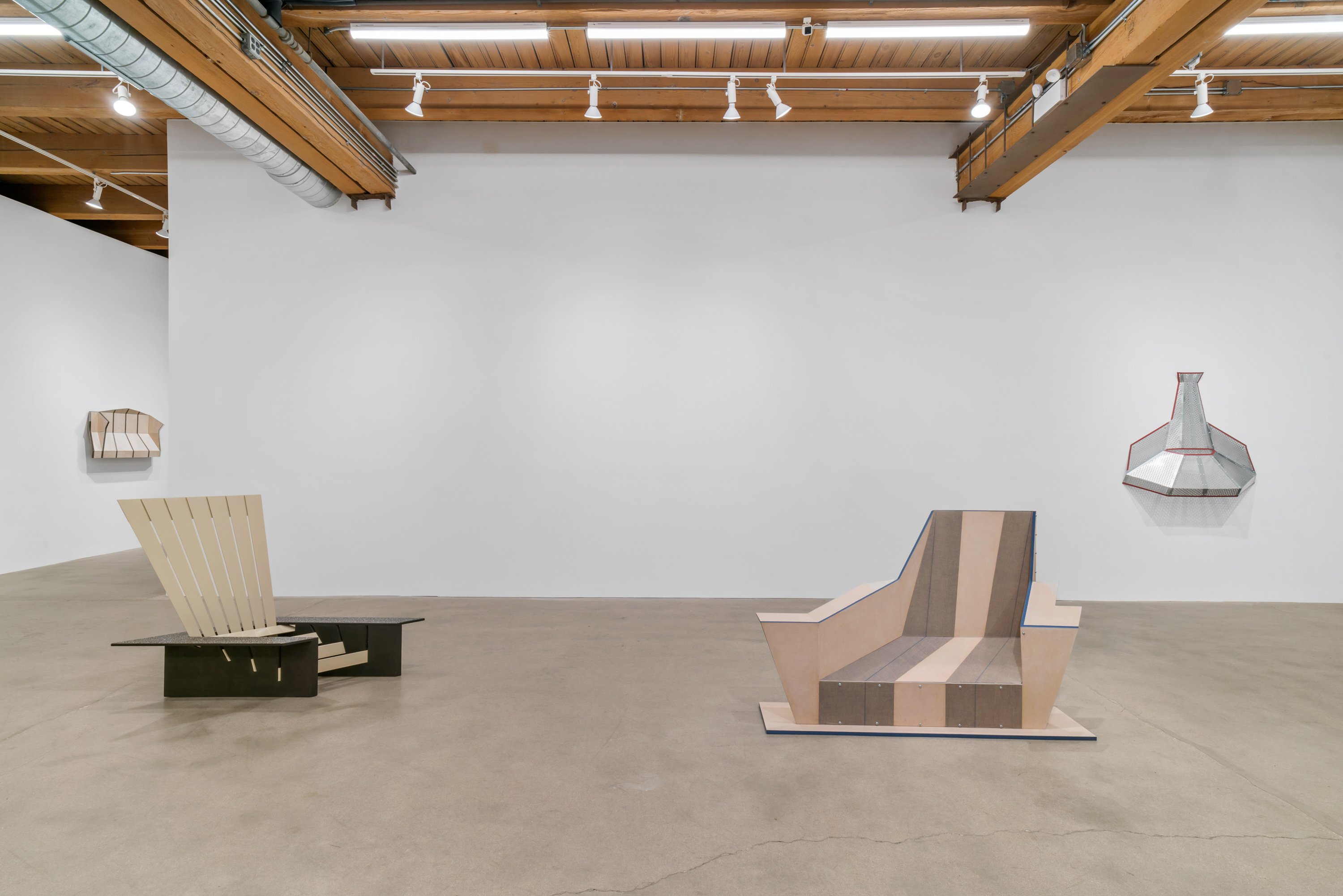 The work’s magic occurs in precisely aligned angles and calculated moments of disorientation, transforming quotidian forms, like that of an Adirondack chair – a common sight on lawns in the northern Chicago suburbs, near where Simpson lives – or embracing the odd, floating quality of a sled-like palanquin, which you’d never find in those environs. Like many of her Chicago compatriots, Simpson is an intrepid image-hound. Source material for this work comes from a vast repository of photographs taken by the artist as well as images she’s foraged from elsewhere, some of which she's held in her mind’s eye for many decades. All of the work is, in a sense, derived from her interest in architecture and human bodies – the architecture of clothing on the body, the architecture of bodies in spaces, and now the architecture of objects of repose. “It seemed natural to move from clothing to architecture to chairs,” she says. “I work from an image and develop the form from there.”