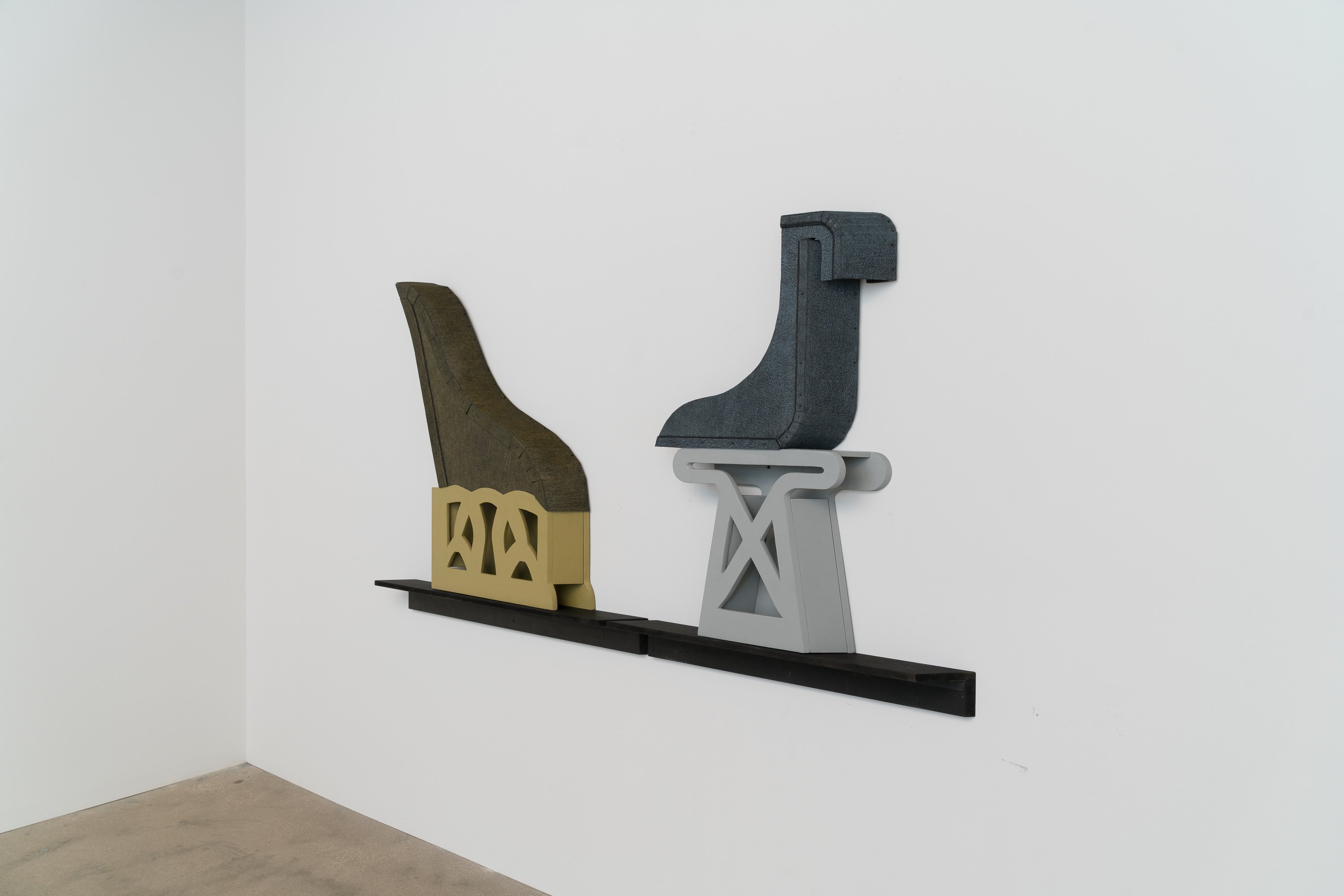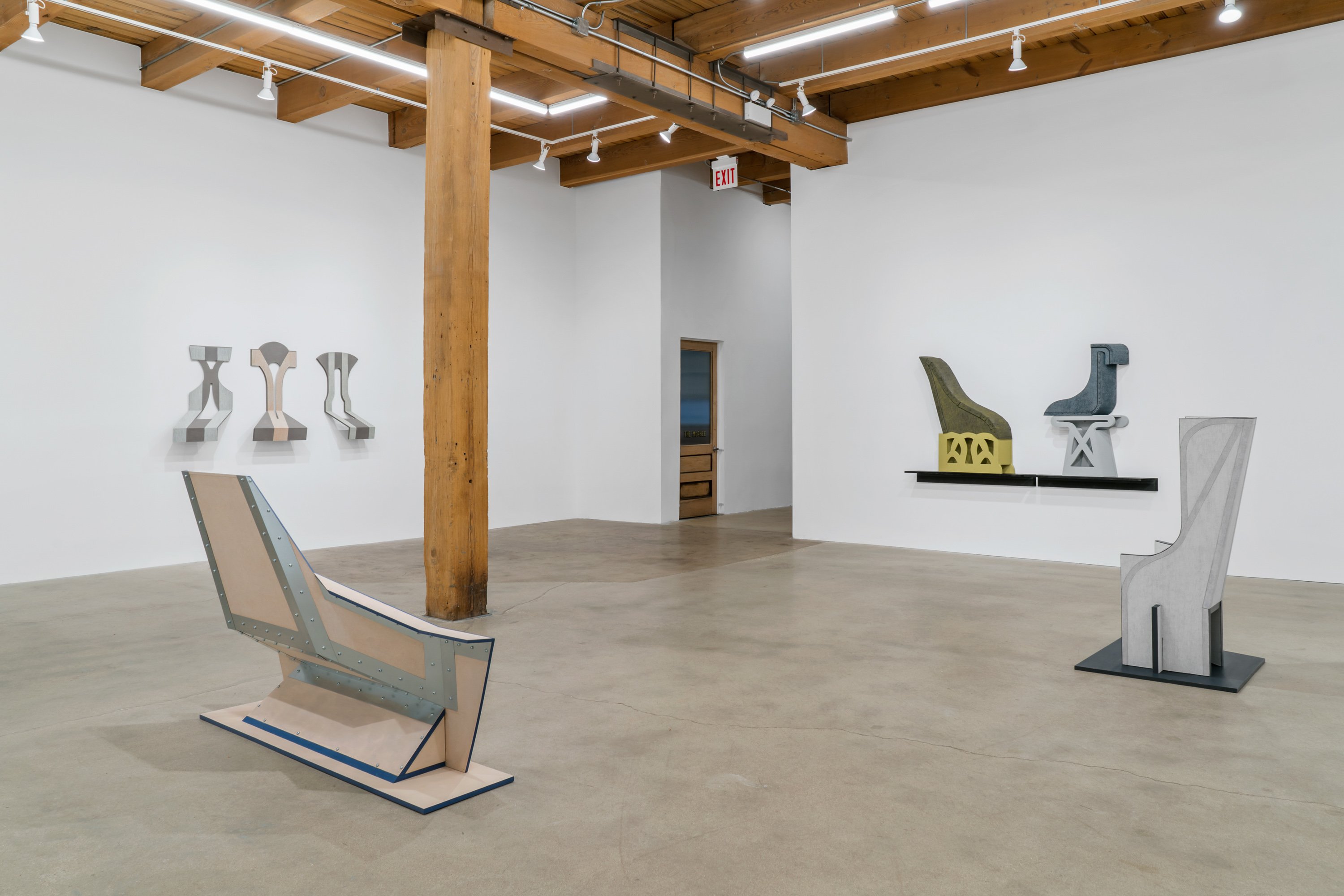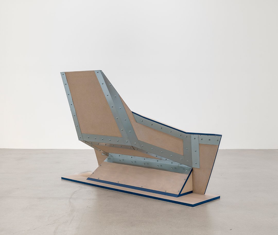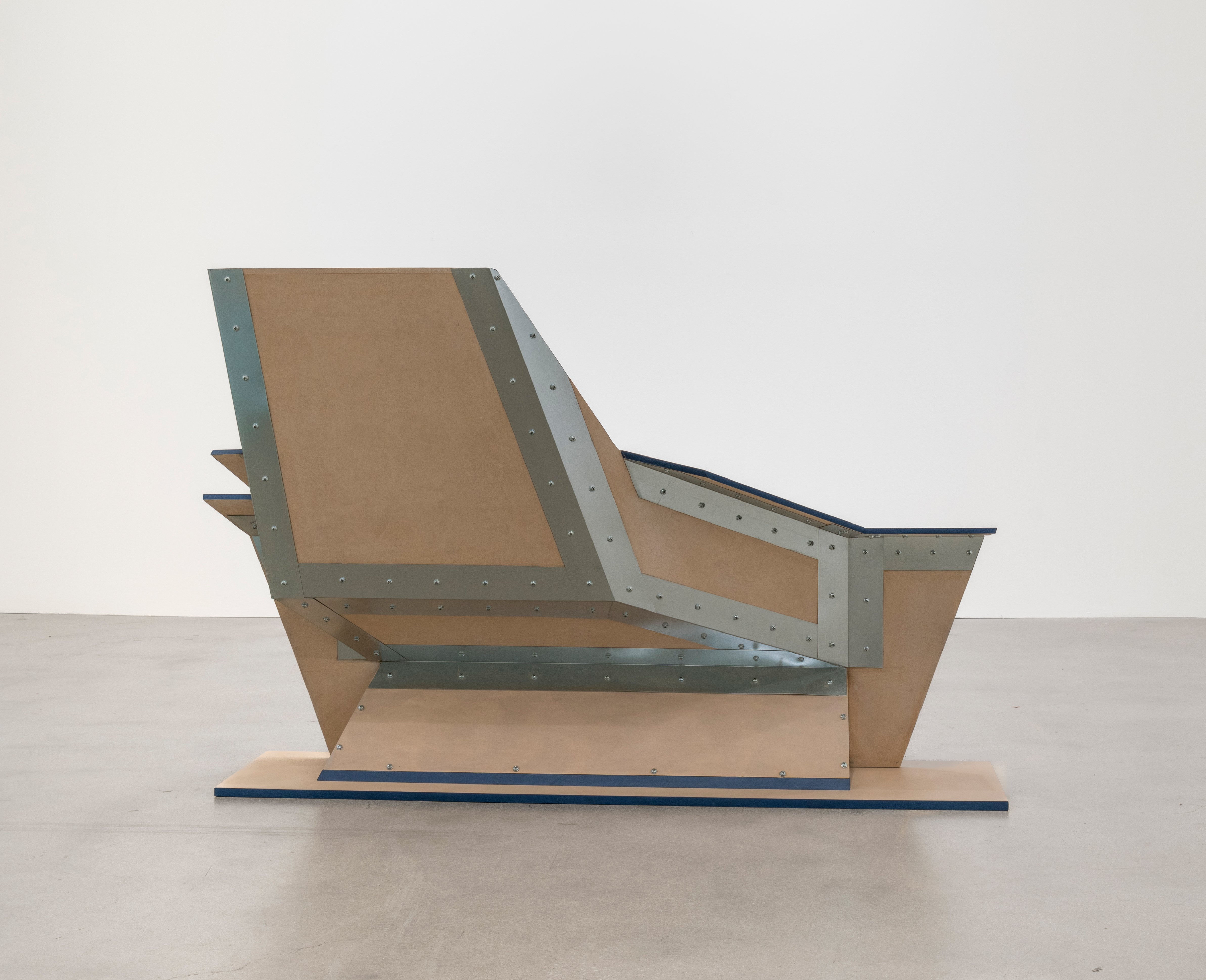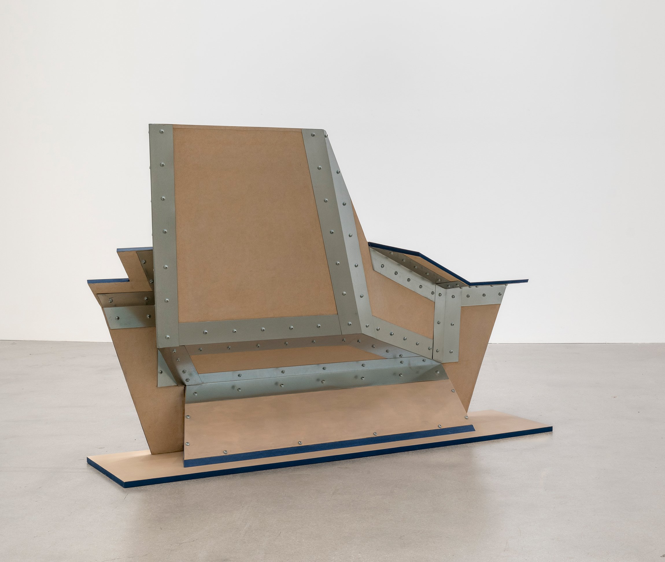 In her latest body of work, Diane Simpson has further expanded the range of worldly references informing her sculptures. Where her practice had, for decades, revolved around ingenious extrapolations on the shapes, surfaces, and volumes of various articles of clothing, she has in recent times turned attention to certain architectural forms: windows, bannisters, transoms, and chimneys. Over the last two years, Simpson has narrowed her scope to focus on an aspect of interior design in the form of seating furniture – chairs, sofas, lounges, and other species of objects built for sitting. These are the fount of the current show. Deploying similar materials to the ones she’s used for the last four decades, namely metal and wood, often assembled from commonly available, industrially produced, hand-adjusted parts, Simpson has once again spun gold from straw, handling all aspects of the design (via beautiful preliminary schematic drawings) and construction of the works herself, without assistants or fabricators.