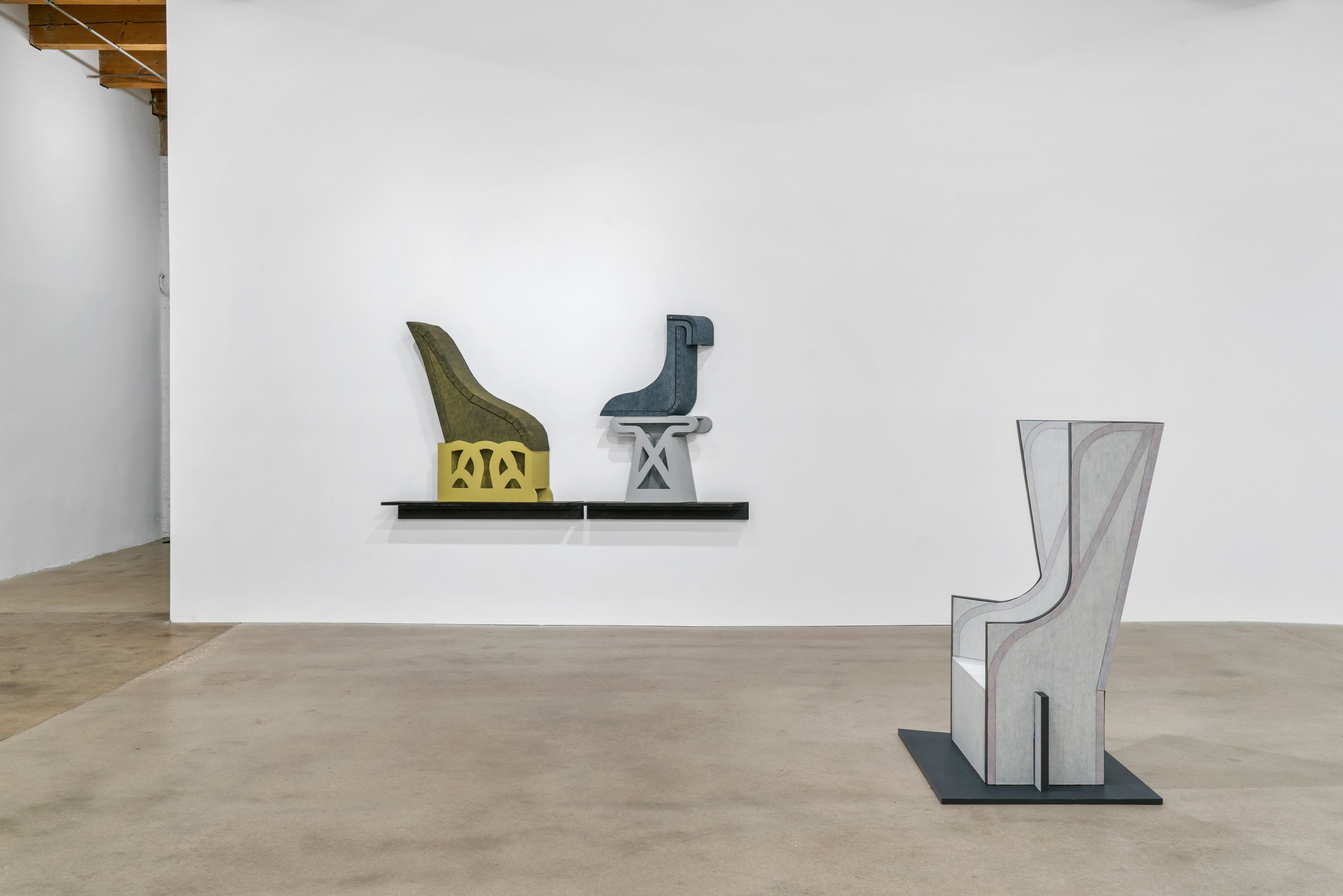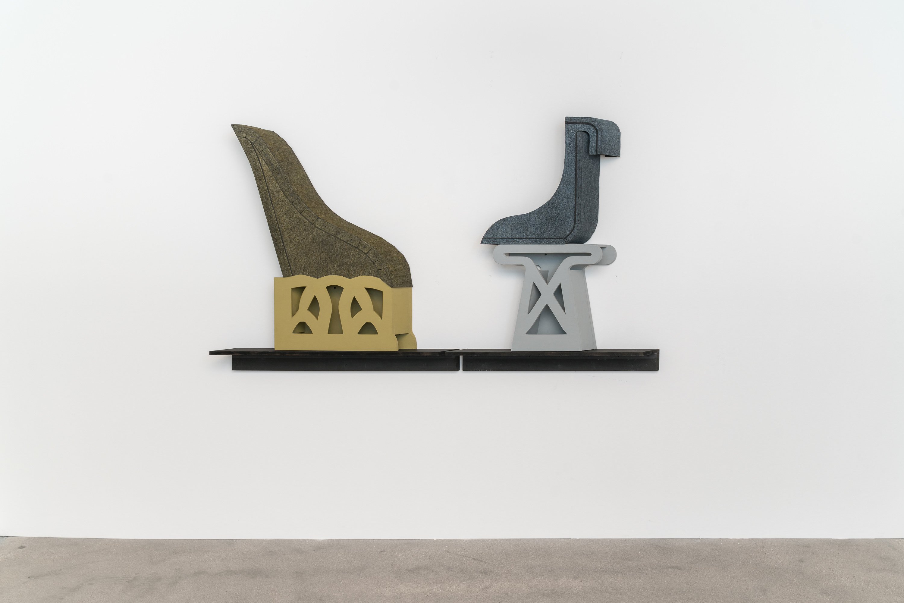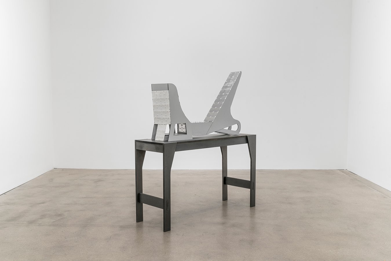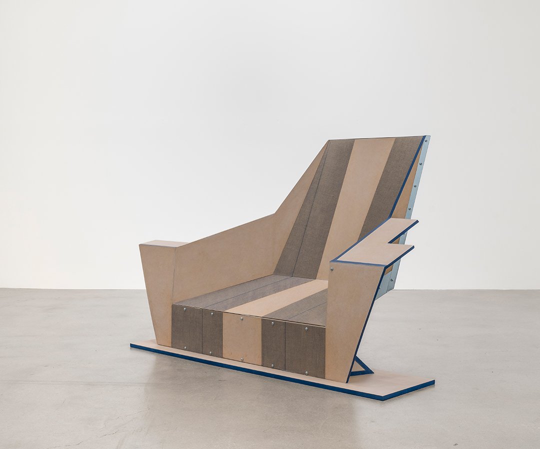 In her latest body of work, Diane Simpson has further expanded the range of worldly references informing her sculptures. Where her practice had, for decades, revolved around ingenious extrapolations on the shapes, surfaces, and volumes of various articles of clothing, she has in recent times turned attention to certain architectural forms: windows, bannisters, transoms, and chimneys. Over the last two years, Simpson has narrowed her scope to focus on an aspect of interior design in the form of seating furniture – chairs, sofas, lounges, and other species of objects built for sitting. These are the fount of the current show. Deploying similar materials to the ones she’s used for the last four decades, namely metal and wood, often assembled from commonly available, industrially produced, hand-adjusted parts, Simpson has once again spun gold from straw, handling all aspects of the design (via beautiful preliminary schematic drawings) and construction of the works herself, without assistants or fabricators.