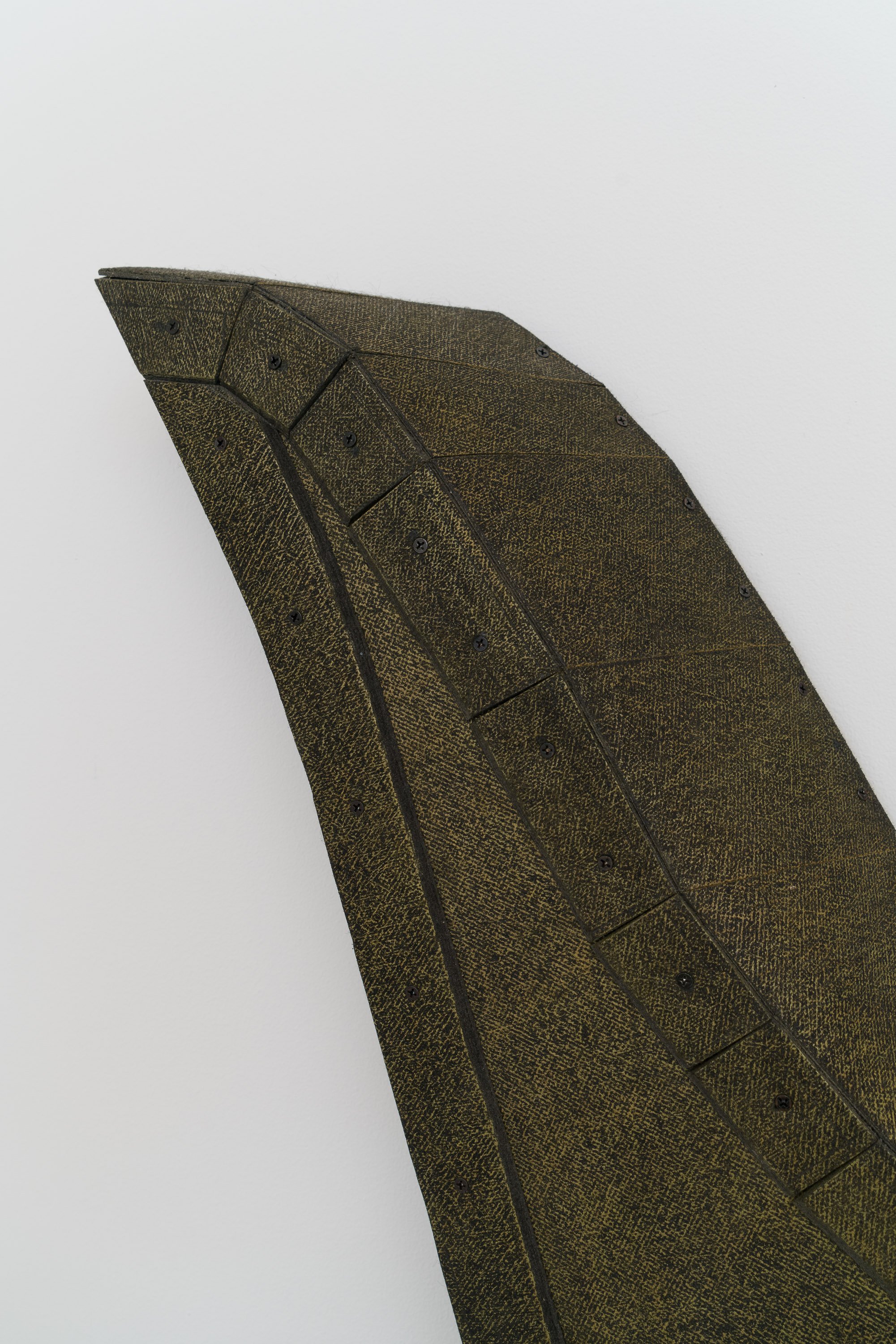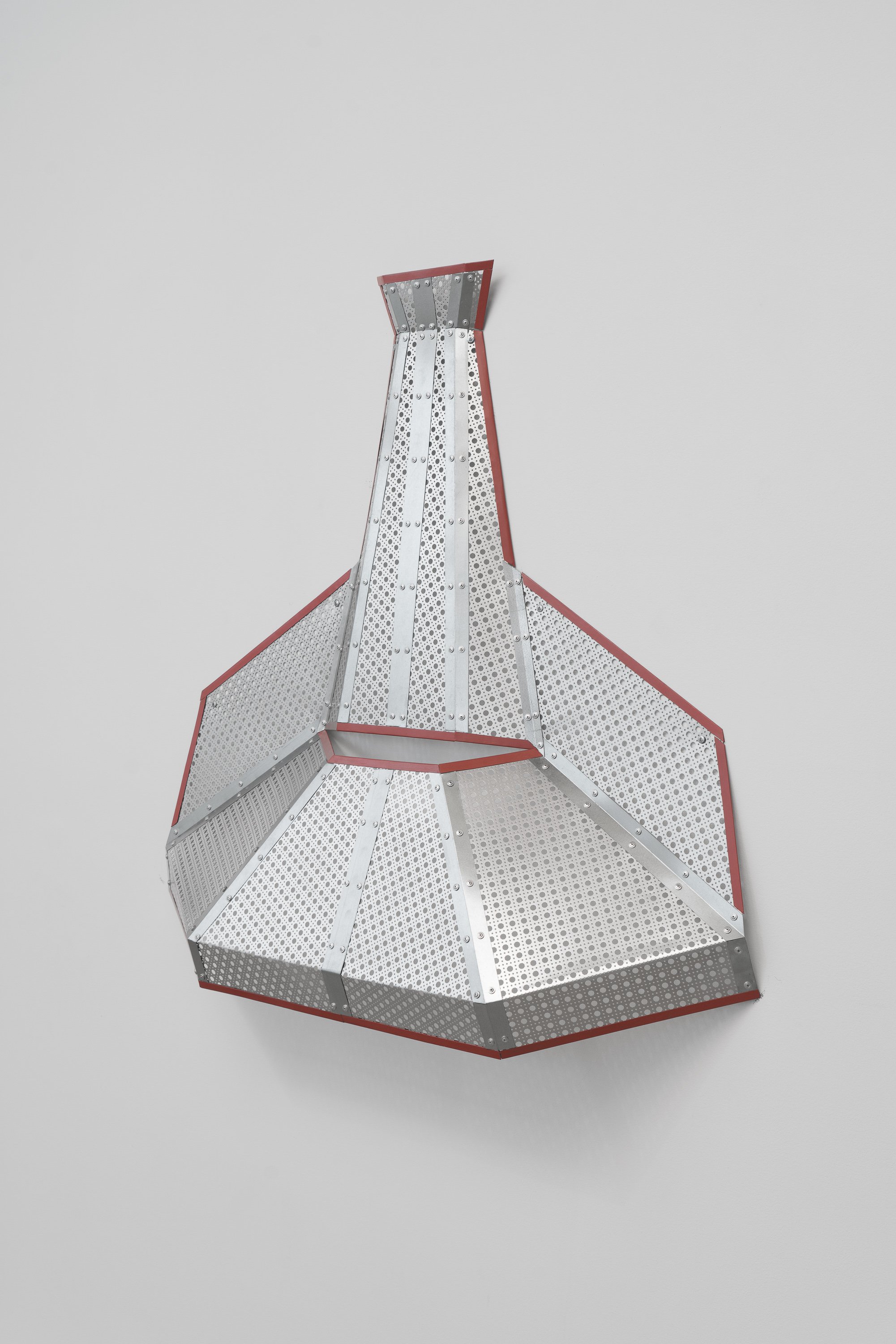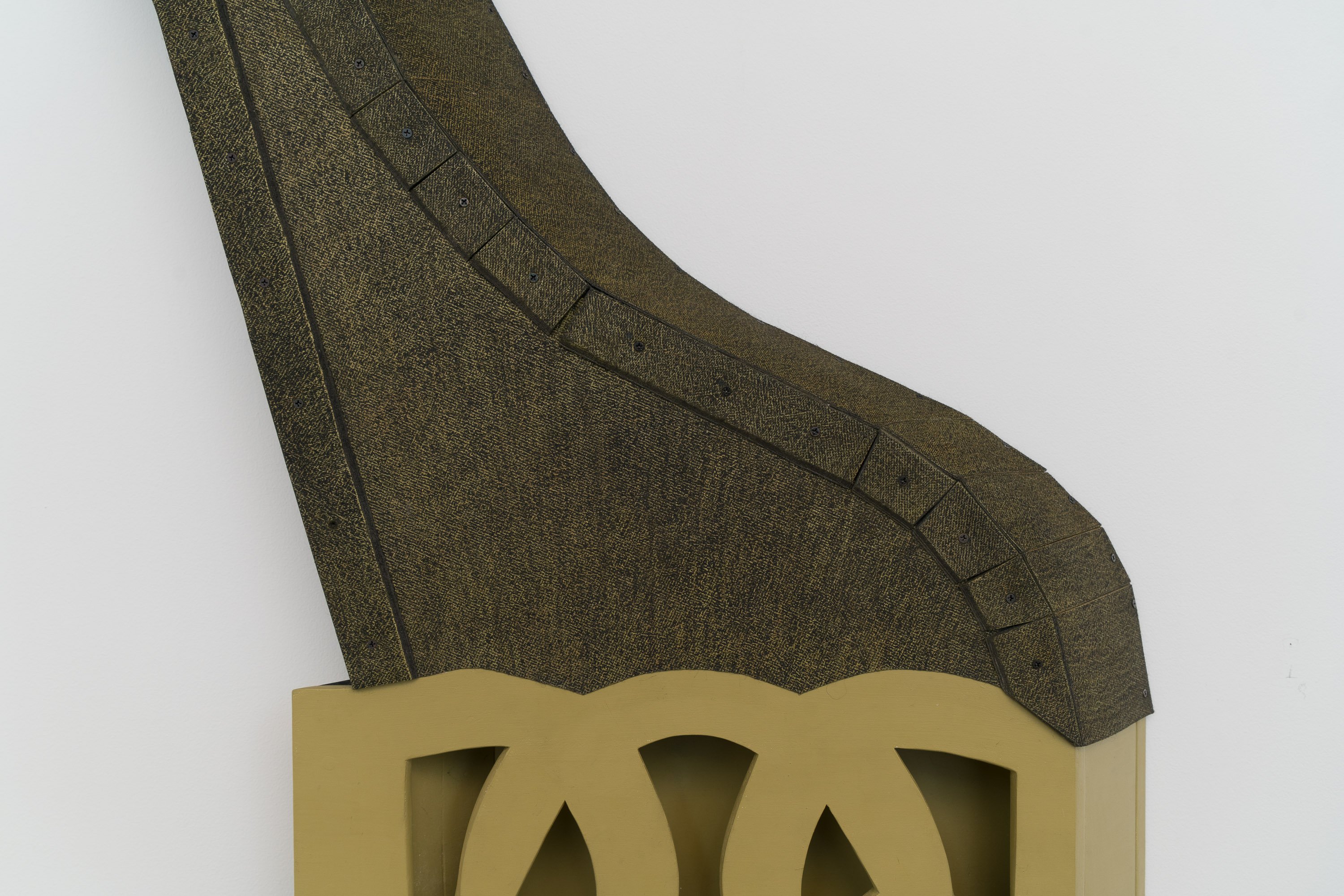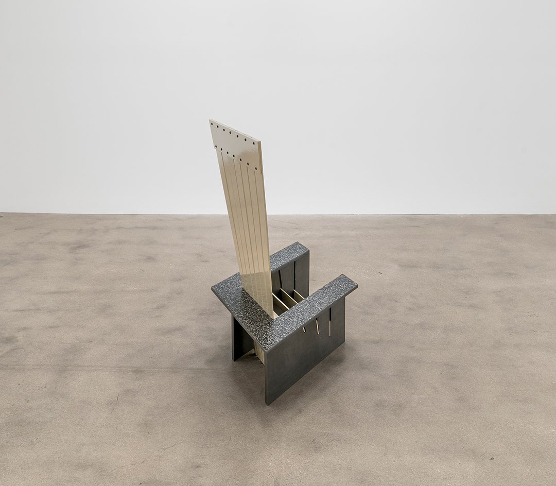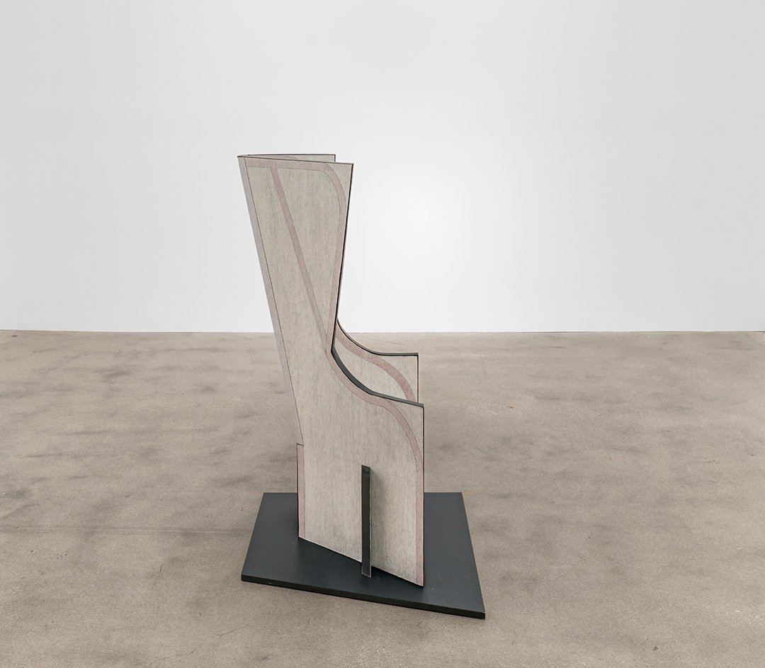 In her latest body of work, Diane Simpson has further expanded the range of worldly references informing her sculptures. Where her practice had, for decades, revolved around ingenious extrapolations on the shapes, surfaces, and volumes of various articles of clothing, she has in recent times turned attention to certain architectural forms: windows, bannisters, transoms, and chimneys. Over the last two years, Simpson has narrowed her scope to focus on an aspect of interior design in the form of seating furniture – chairs, sofas, lounges, and other species of objects built for sitting. These are the fount of the current show. Deploying similar materials to the ones she’s used for the last four decades, namely metal and wood, often assembled from commonly available, industrially produced, hand-adjusted parts, Simpson has once again spun gold from straw, handling all aspects of the design (via beautiful preliminary schematic drawings) and construction of the works herself, without assistants or fabricators.