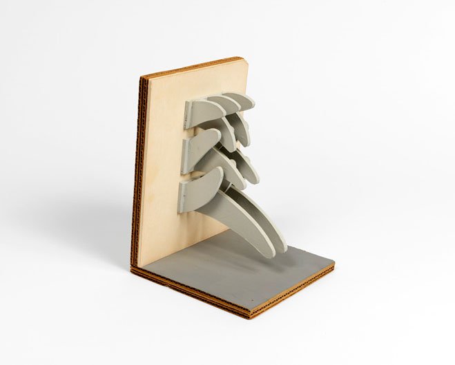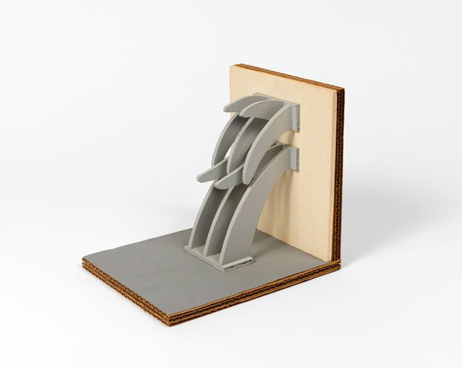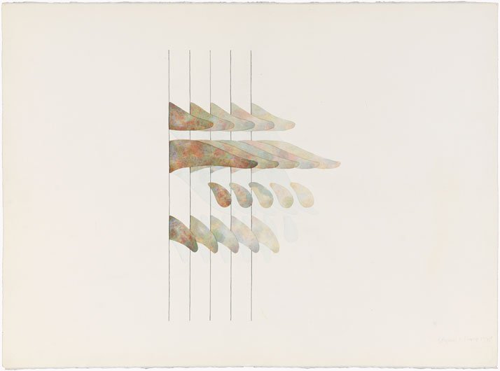 The exhibition will feature a group of small models from ’76, shelf scale, that show how he’s reconsidering the way these interlaced fin-like shapes negotiate the relationship between floor and wall. By decade’s end, Flood was constructing wall-hanging fins, arranged in clusters, thickly painted, sometimes in bright colors. In aggregate, like schools of fish, these works suggest tandem motion. In the same period, Flood painted a series of related watercolors on handmade paper. The show surveys this extraordinary and lesser-known period in Flood’s tragically short career, with superb examples of each genre, including the boxes, the models, the fins and the watercolors.