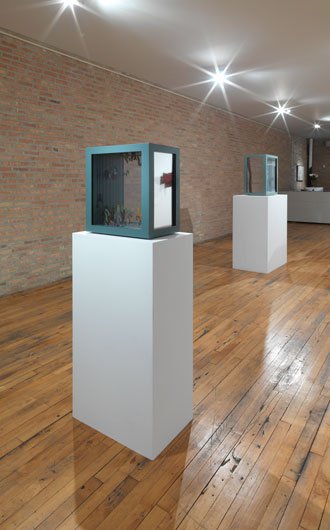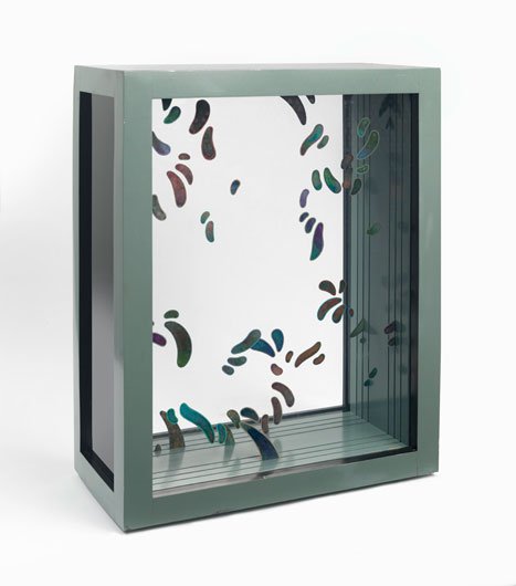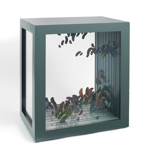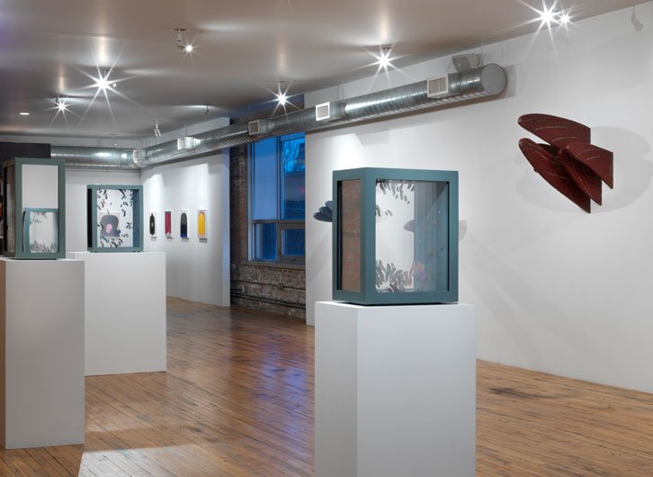 In the late 1960s, Flood (1944-1985) was associated with the Chicago Imagists. He showed at the Hyde Park Art Center with the Non-Plussed Some, the same exhibition group that debuted Ed Paschke and Sarah Canright. By the early 1970s, Flood and Canright (who were married) moved to New York, where Flood’s concept began to shift. This exhibition spotlights the new and very different work he made between 1973 and 1979, marking changes in aesthetic, materials and medium. The earliest of these works continue Flood’s Imagist mode, featuring box constructions with multiple layers of Plexiglas, on which squiggling aquatic forms are back-painted, dispersed in the space like floating paramecia. In 1975, Flood began to think of the room of exhibition as the box, and he moved the shapes gradually out into the space, in the process making them into sculptures.