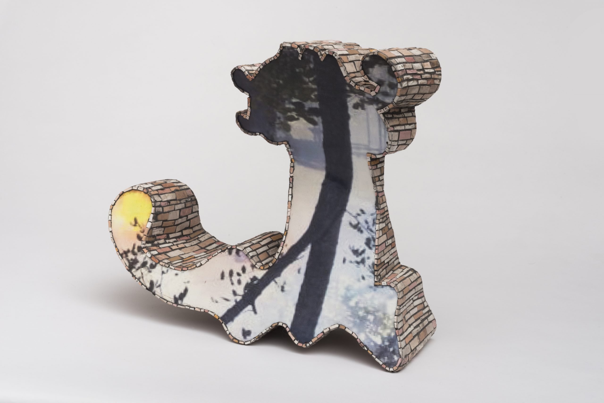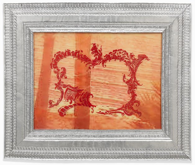 Carol Jackson, Lake of Fire, 2016, leather, enamel, inkjet print, acrylic 21 x 25 1/2 x 33 inches