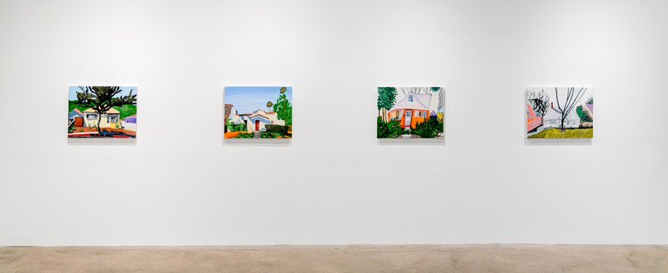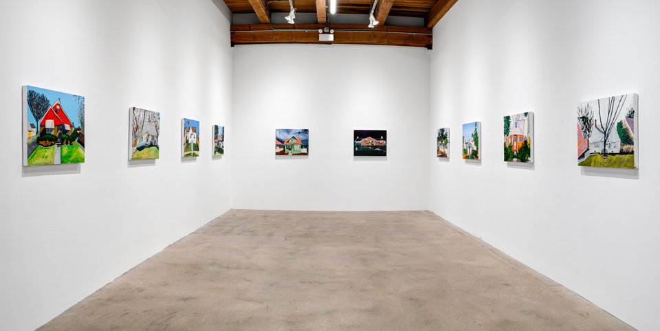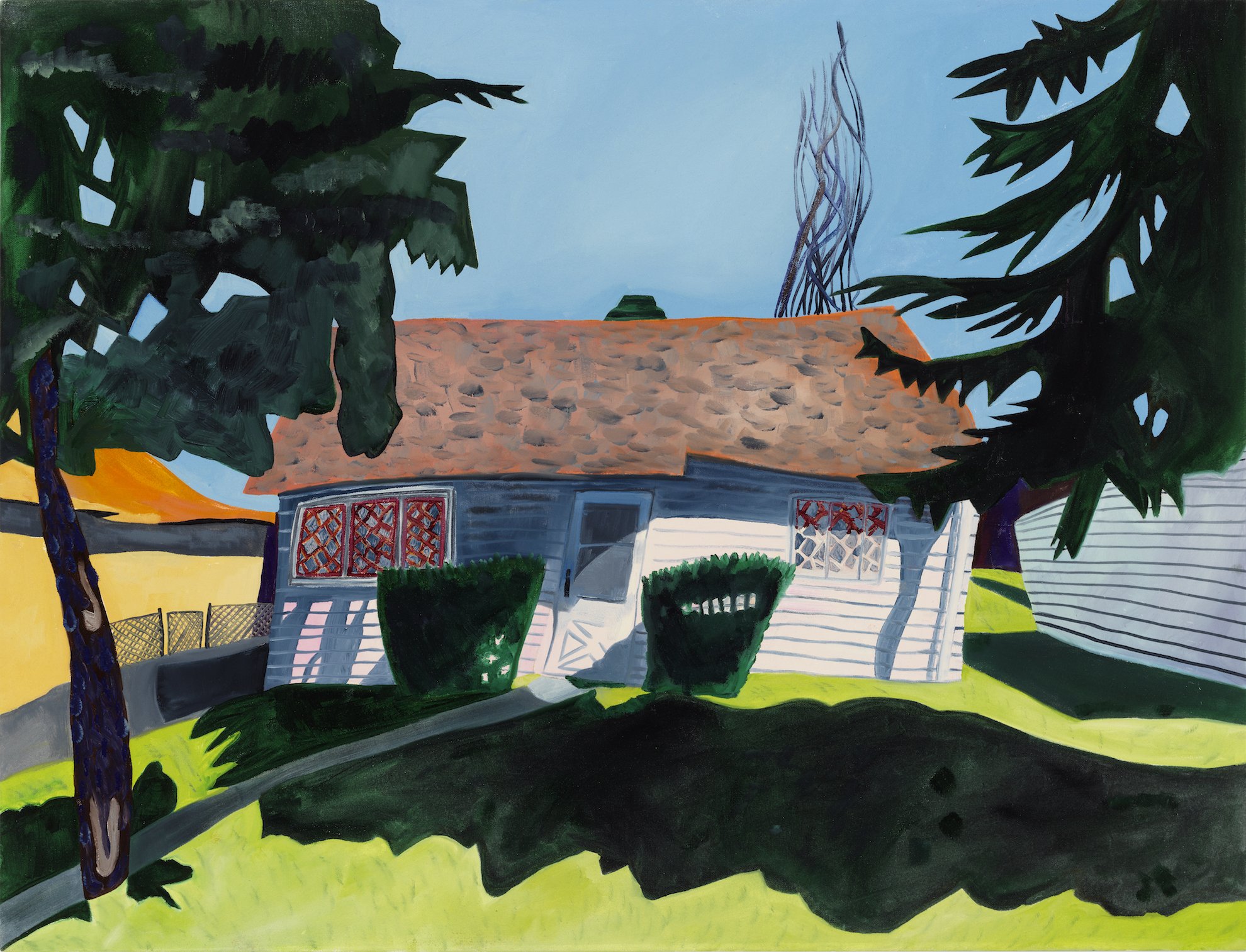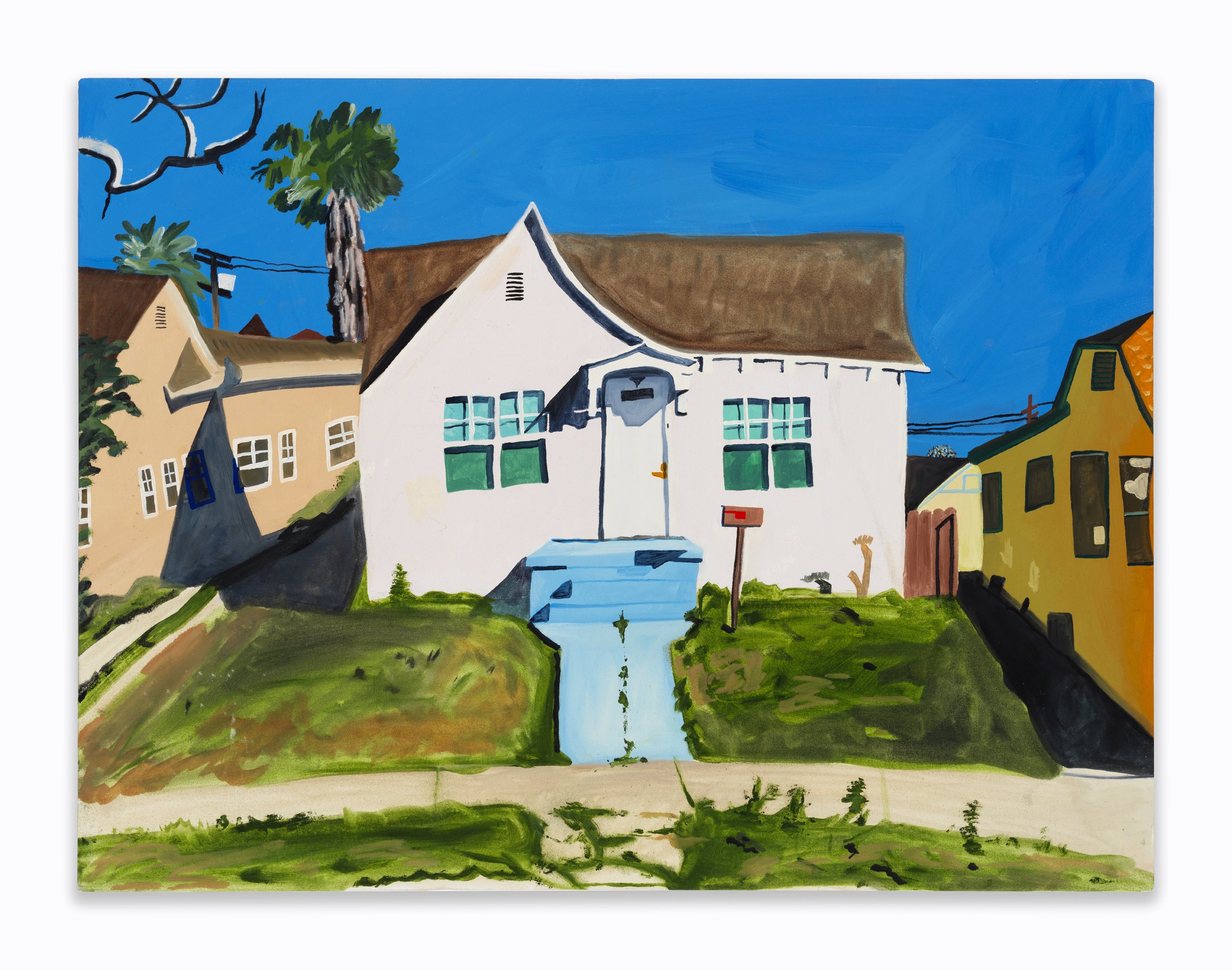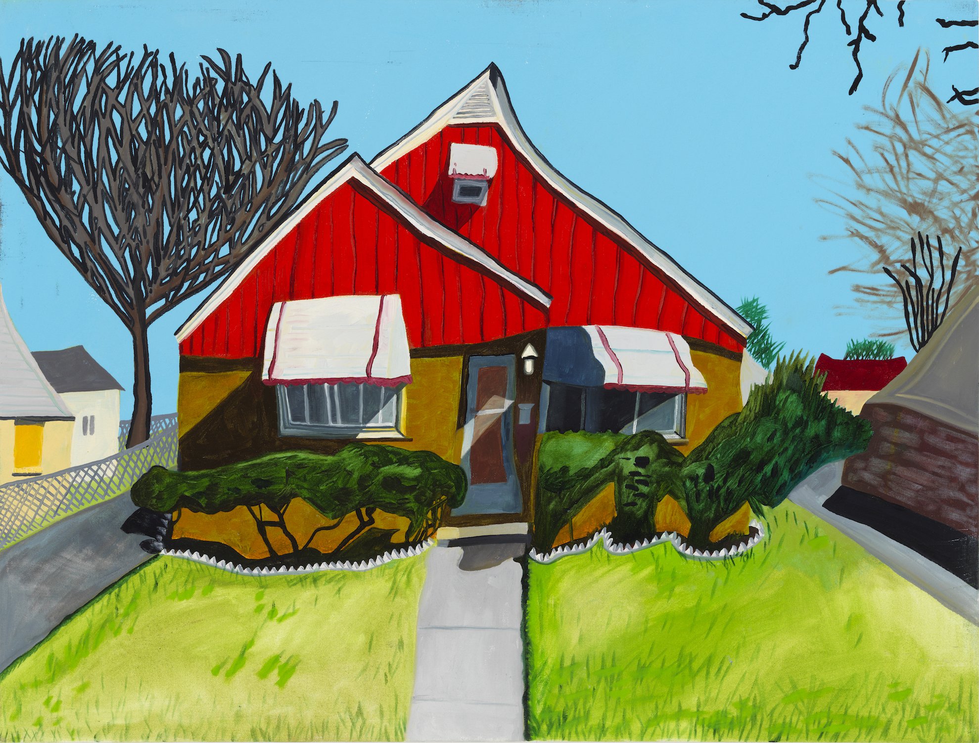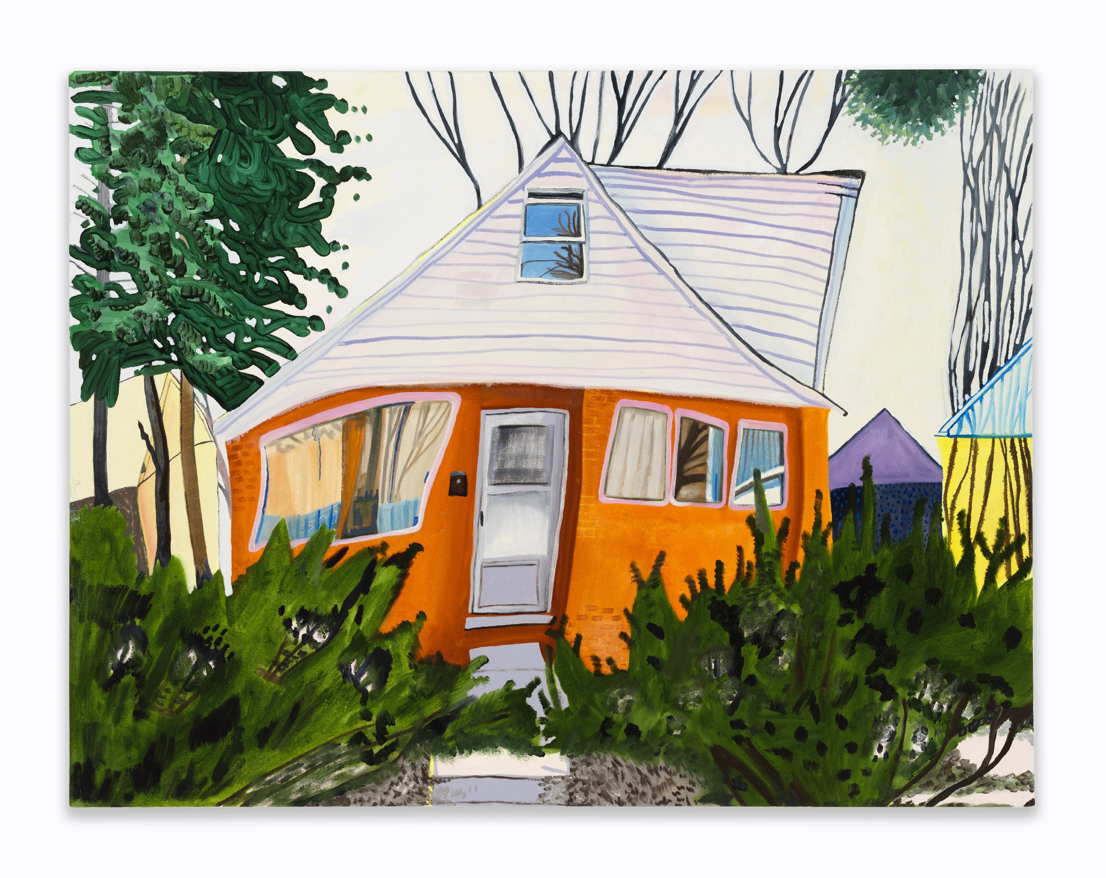 In the North Gallery, Corbett vs. Dempsey is excited to present an exhibition of new paintings by Gabrielle Garland. This is the gallery’s third show with the artist. Based in New York, Garland continues her long- standing series of paintings of houses, a natural complement to her intense paintings of home interiors. Usually depicted straight on as a view of the exterior of a stand-alone home, these brilliantly hued canvases function as portraits, making it difficult not to project a visage onto them: windows = eyes, door = nose or mouth, tree = hair. Taken in aggregate, this makes them feel something like a rogues gallery, each one a distinct personality – light, serious, sinister, melancholy, or some combination – drawn unflinchingly from the heart of American suburbia. But Garland further imbues them with character by dramatically altering the perspective and varying paint application, so that they have a hallucinatory wonkiness, with passages of magnificent precision zapped by bolts of slashing lines or bravura brushwork.