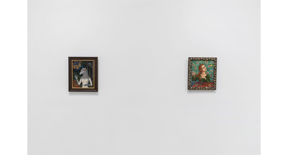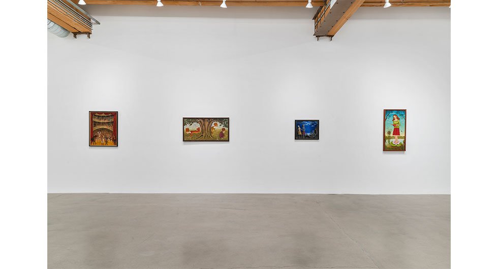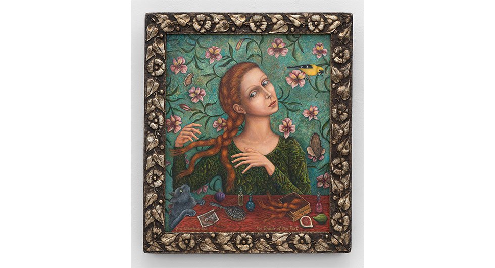 Gina Litherland has been exploring a personal approach to image-making for over four decades, interweaving strands drawn from mythology, literature, film, folklore, and natural history, in a visual style that connects her with Northern Renaissance portraiture and Magic Realists such as Remedios Varo and Leonora Carrington. However Litherland describes this most recent body of paintings as “the most personal work I’ve ever done, drawing on experience and inner wanderings, exploring a visual language more than literal language.” Some of the scenes in her narrative or allegorical paintings are drawn from a library of ideas and images she absorbed “by osmosis” while working at the Occult Bookstore in Chicago, before she settled outside Milwaukee, where she has lived and worked for the last thirty years. For instance, the painting “Pistis Sophia” takes its title from an obscure Gnostic text, the title meaning something like “faith and wisdom.” In Litherland’s case the allusion is to a kind of female emanation of wisdom, the picture’s story drawing on the artist’s remembrance of releasing pet tadpoles in a swamp when she was a little girl. All the works are executed in oil on panel, some adding India ink, and each one is meticulously painted, resplendent in its extraordinary attention to detail and representation of texture, intensities of radiance, chromaticism, shadow, and reflectivity. One of the works in the show that relates directly to an artistic precedent is “The Gods,” a vivid opera house interior image of a crowd as seen from just behind a stage full of actors, which refers to the WWII-era film Children of Paradise by Marcel Carné. “In the film, the Gods are the people in the cheap seats, the true audience, as well as the actors themselves,” says Litherland. “The film bounces back and forth, revealing the deep hidden relationship between the artist and the audience.” In the painting, just who are the Gods, the players or the viewers, remains ambiguous but brilliantly illuminated. Most of the paintings mix fragments of the animal and human worlds, often in harmony (“Tigers and Wolves are Kind,” “Full Moon on Dog Island”), sometimes, as in an image of a self-admiring mermaid (“The Siren”) and the self-described “Beautiful Wolf Woman,” in a state of full-blown hybridity. All the characters in Litherland’s luminous paintings inhabit liminal spaces, whether they’re lodged inside a tree trunk, on a penumbral coastline, or mysteriously hovering a few feet above the ground. Hers are ecologically-minded images, but they’re rooted in a unique vision of our shared planetary and symbolic atmospheres.