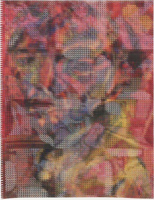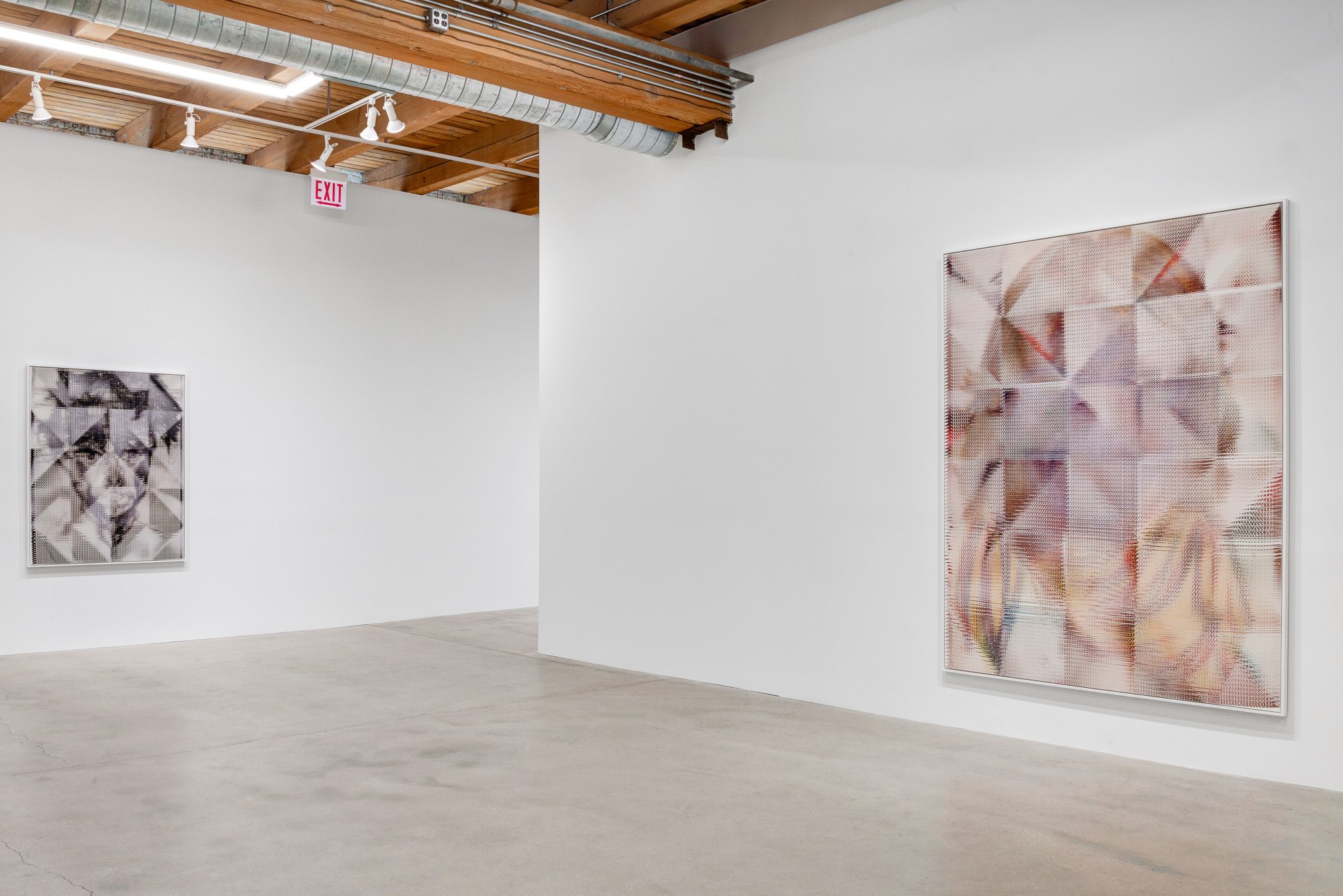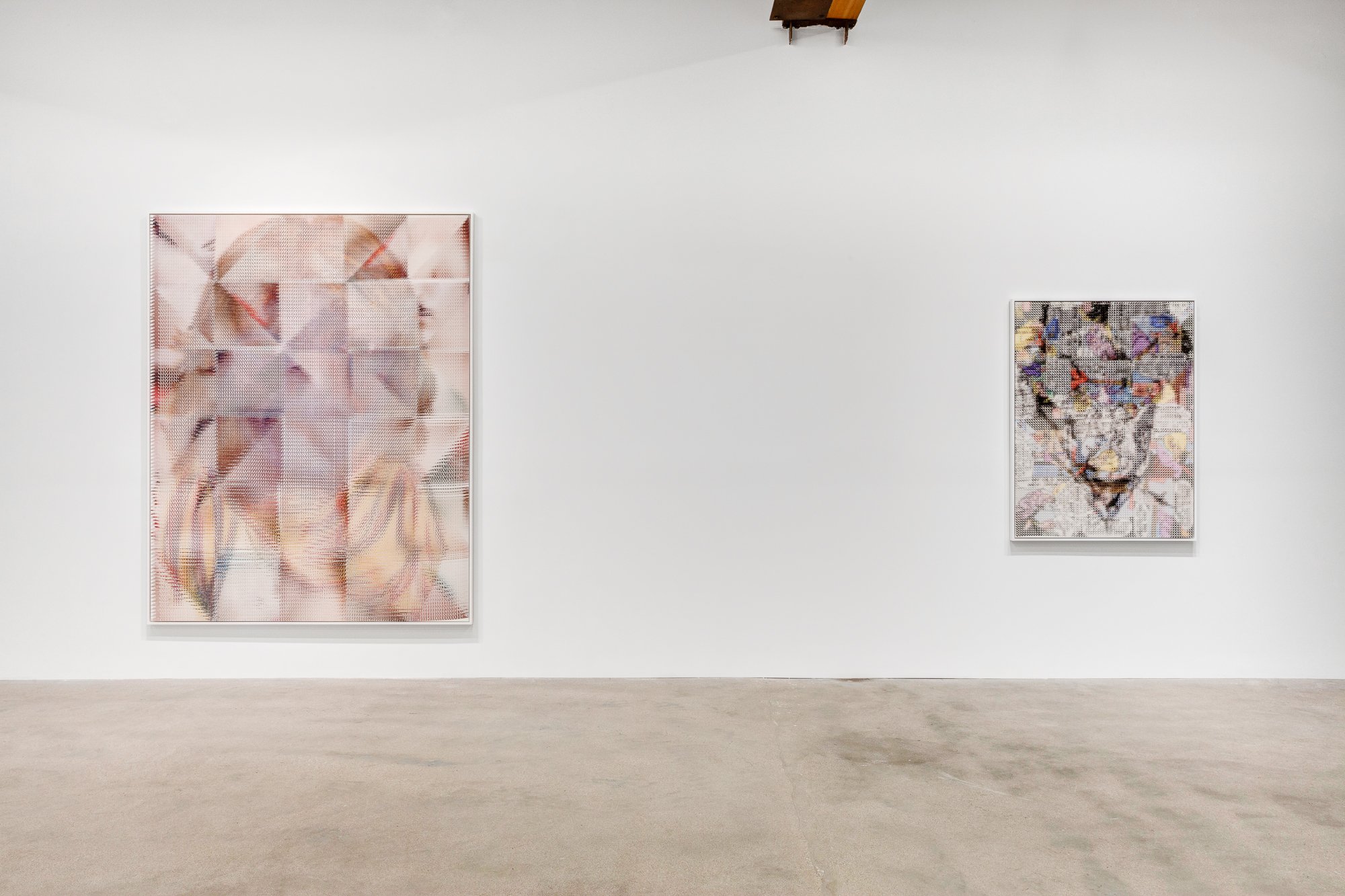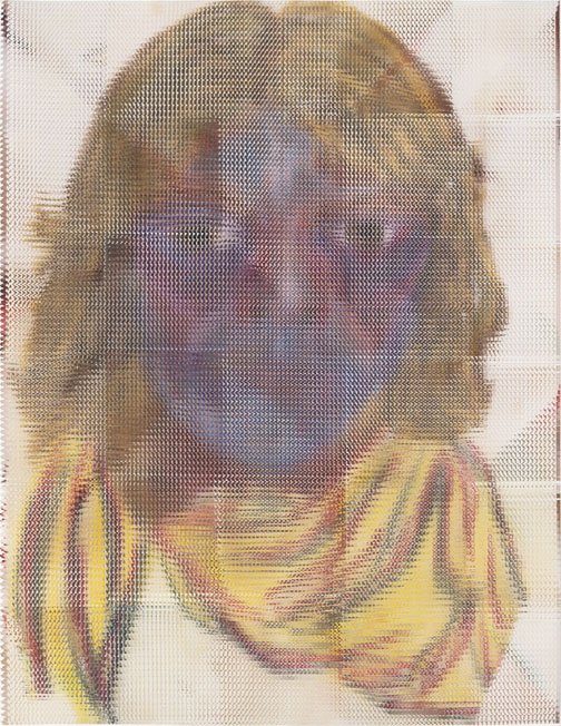 In the South Gallery, Corbett vs. Dempsey is proud to present Shatter, an exhibition of new work by John Sparagana. This is Sparagana’s fourth solo show with the gallery. Over the course of the last fifteen years, John Sparagana has developed a unique process for the investigation and transformation of images. Using a straight razor, he has cut and remixed iconic pages from news magazines, interpolating equally iconic modernist artworks into them or redacting parts of them so that they read more poetically, less didactically. He’s explored the nether regions of the American imaginary by means of deconstructed versions of comics – Dick Tracy and Nancy, to be specific – which he cut and mixed, then remixed again, until they were rendered as whorls of energy and color, stuttering text broken at its core, pixelated images that seem at once digital and handmade. Like a snake eating its tail, Sparagana’s focus has grown increasingly recursive, with one body of work revisiting some aspect – formal, tonal, conceptual, thematic – of its predecessors. Already complex and multidimensional, this web of references began to look deeply inward, turning in on itself, as a sort of material-psychological map, the pathways the work has taken, and other possible avenues of approach. In his latest works, collectively titled “Self Portrait in Dub,” Sparagana turned to a group of four images of himself, self-portraits he composed when he was in his late teens, just before he’d started his life as an artist. These drawings were made when Sparagana spent time with his older sister, and they were rediscovered upon her untimely death. Intense and rough-hewn, the images themselves have a raw power – direct address, affected scarf, seventies hair – that reflects the earnestness of youth. Sparagana unflinchingly dissects and reassembles these images, cutting and intermixing them with one another or with other recent images from his oeuvre. The effect is different in each piece, sometimes brutal and mocking, sometimes gentle and affectionate, sometimes abstracted into a kind of faceless oblivion – self-portraiture as self-destruction. Or self-construction. Colors carry over from the comics. Shapes carry over from a recent group of paintings. The persistent diagonal magnifies the intensity of young John’s visage, creating a sort of psychic vanishing point. In conjunction with Shatter, CvsD has published John Sparagana, a deluxe, 112-page hardbound catalog. Along with the complete “Self Portrait in Dub” series, it reproduces the four overlapping bodies of work that led up to it, from “Breather,” 2016’s paintings, through “Nancy Variations,” “Bodybuilder,” and “Industry White in Dub.” Writer, musician, and composer David Grubbs contributes an essay tying together all these strands, offering a meditation on the effect of Sparagana’s process, and concluding that the newest works constitute “self-portrait as crescendo.” In an interview with the artist, curators Fredi Fischli and Niels Olsen invite Sparagana to contextualize his work in relation to the readymade and modernist collage – both in terms of similarities and differences – suggesting that his works “cure” images, appropriating and ameliorating them.