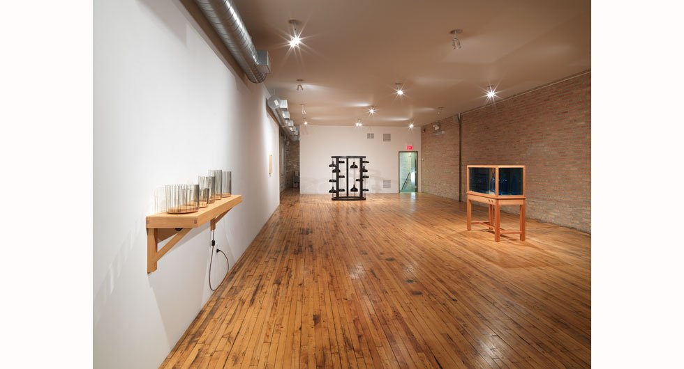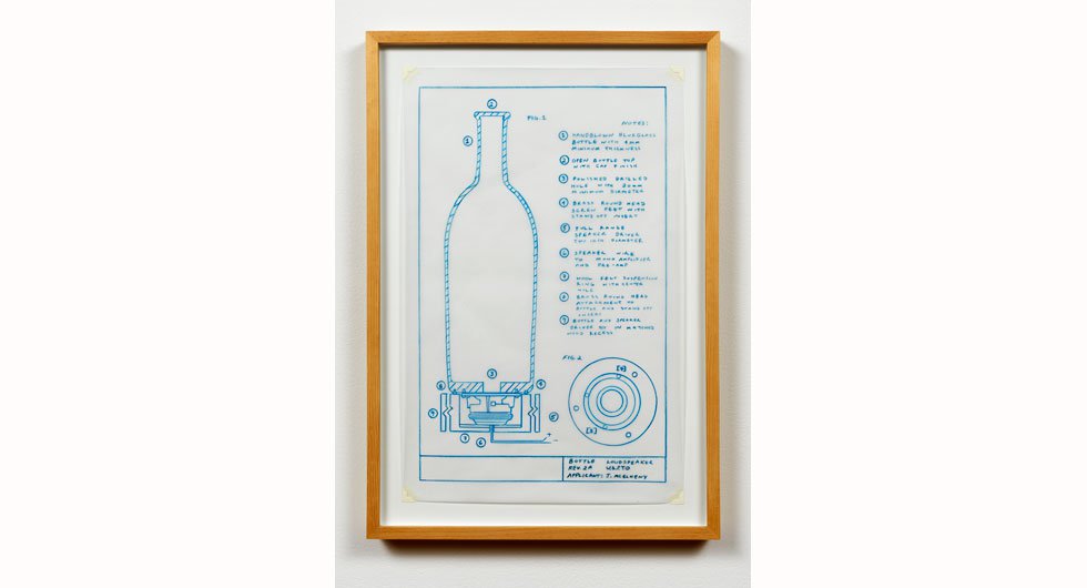 A Chicago-based point of reference for McElheny was the craftsmanship and artistry of H.C. Westermann, whose influence is felt in the unpainted wood of the sculptures’ construction. These sculptures continue the artist’s ongoing investigation of the secret history of modernism and his subtle subversion of conventional techniques of presentation – shelves, pedestals, vitrines – in artistic display. Two of the pieces feature rotating elements, one is a sound sculpture with a new kind of glass speaker assemblage that McElheny is in fact applying for a USPTO patent (also in the exhibition is a developmental sketch for his “jazz loudspeaker” patent application), and the final sculpture is still and silent but invites contemplation of the latent possibility of motion inherent in its construction.