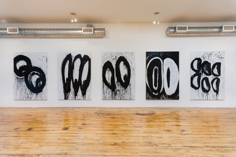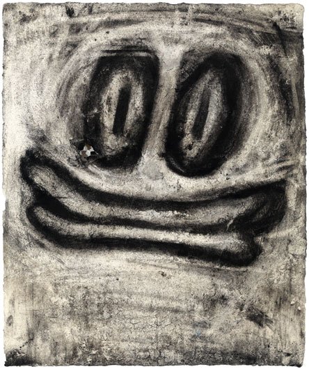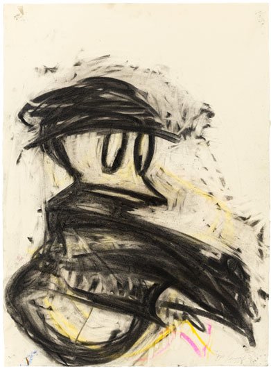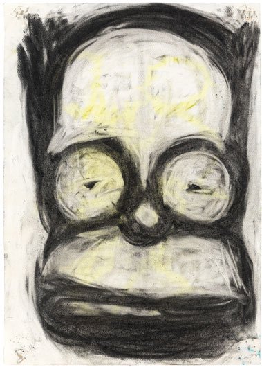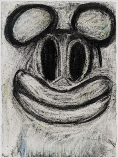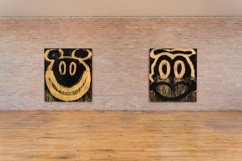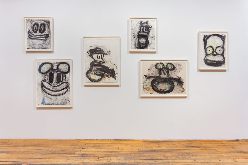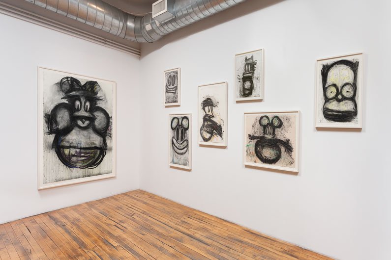 From her home base in Brooklyn, Joyce Pensato has spent the last four decades crafting an utterly unique approach to painting and drawing. With nods to the vigorous action of abstract expressionist painters, she has systematically attacked a specific set of pop culture icons, including Mickey and Minnie Mouse, Batman, various members of the Simpsons family, Donald Duck, Groucho Marx, and several species of clown. Working on increasingly large scale canvases, she initially worked in black lines on a white background, eventually flipping the scheme and working in white lines on black, and more recently introducing metallic (silver, gold) and spare flashes of color. The paintings are incredibly confident, with many layers accumulated over time, often featuring the drips and splatters of an explosive and joyful practice. Thoroughly uncompromising, the images sometimes carry dark connotations, a banal figure disabused of its superficial lightness, pummeled repeatedly until confessing sinister secrets, passages of red, yellow, and blue poking through the hardscrabble charcoal. Pensato’s drawings are equally brutal, erasure every bit as much an integral part of her technique as actual mark-making. On view at CvsD will be seven brand new drawings, including a large Donald Duck, and eight new canvases, including a series of five eye paintings which feature disembodied eyeballs in a field of paint. Pensato’s work has been shown internationally, including I Killed Kenny , a 2014 exhibition at the Santa Monica Museum of Art, which traveled to the Contemporary Art Museum, St. Louis. In conjunction with The Godmother , Corbett vs. Dempsey has produced a full-color catalog, available at the opening.