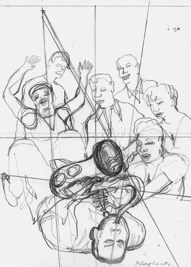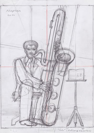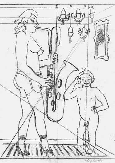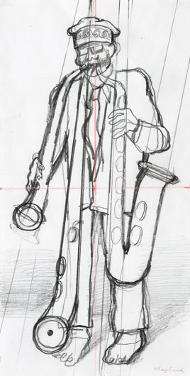 Since he emerged in the mid 1950s, Konrad Klapheck has been one of the legendary figures of European painting. His early signature works were canvases of machines – sewing machines, watches, adding machines, motorcycyles, and most importantly typewriters. Under Klapheck’s brush, a typewriter carried a great variety of connotations and associations. Using his own patented perspectival system, he endowed them with personality, gender, a sense of menace or seductiveness. In the ’60s and ’70s, these machines grew more complex and fantastic, but they retained their inherent objectness, their fetishistic quality as still images of metallic beasts. Klapheck began to introduce figures into his work in the 1990s, and these, too, were unlike anything else in contemporary painting. Narrative tableaux, often explicitly erotic and even disturbing, they made clear a side of the work that had always been latent in the anthropomorphic machines. At the same time, the figurative works allowed Klapheck to return to two earlier loves: boxing and jazz. In the early ’50s, he had worked as a jazz journalist in Düsseldorf, and the new works included portraits of Charlie Parker, Billie Holiday, and Coleman Hawkins, as well as avant garde jazz figures including Archie Shepp, Anthony Braxton, and Ornette Coleman.