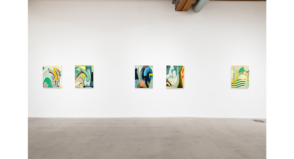 Born in Montréal, Canada, now based in Marfa, Texas, Guérin has continued to prod and push her highly personal approach to abstract painting. The latest body of work offers a remarkable new vision of the torqued forms and multiplicitous surfaces of her recent paintings, executed at a larger scale ranging up to 3 x 4 feet. At this size, additional area functions as a vehicle for opening up and exploring space, for spatial play – her adventures in foreground/background relationships, figure-ground issues, and closed/open composition are as ever daring, but here are even more so, complexity and stillness vs. implied motion being consistent features. Guérin is a master of recurrent shapes, rotating or flipping forms to render them afresh and unrecognizable, the same way a serial composer might use retrograde inversion to revitalize a tone row. She repeats and deconstructs with glee, turning self-restriction into a cornucopia of new discoveries. The most obvious development in hard green has to do with Guérin's paint application, which is looser and more painterly than in the past. This gives the canvases a different resolution in terms specifically of their overall vibration. Their architecture jostles up against the manner of their execution, creating a halo of static electricity. "It feels like a structure that just got shaken up," says Guérin. Indeed, this group of new paintings, as well as a small selection of related drawings in the front office, has a palpable frisson, a restless inventiveness that seems to undo its laces even as it ties them up.