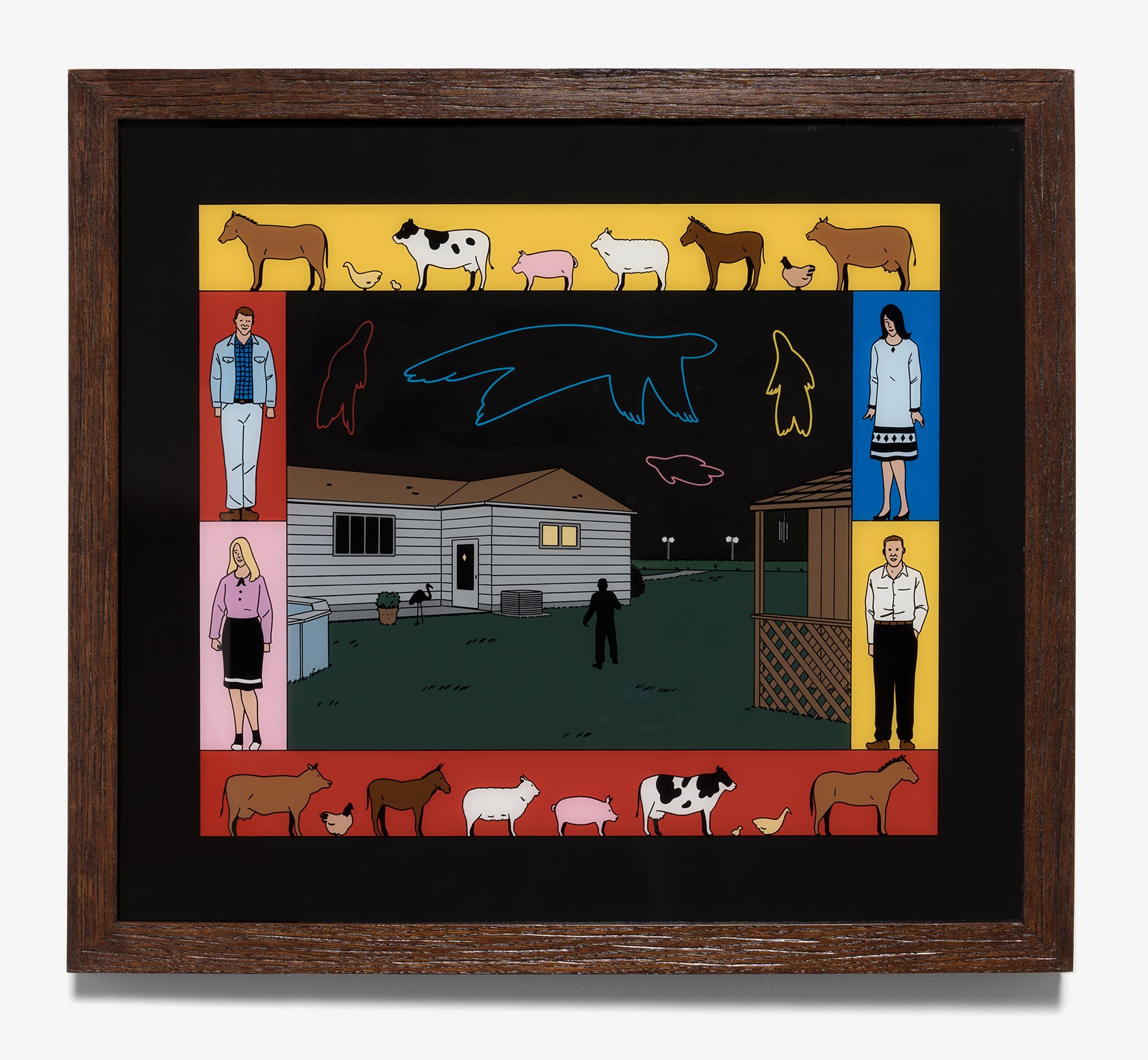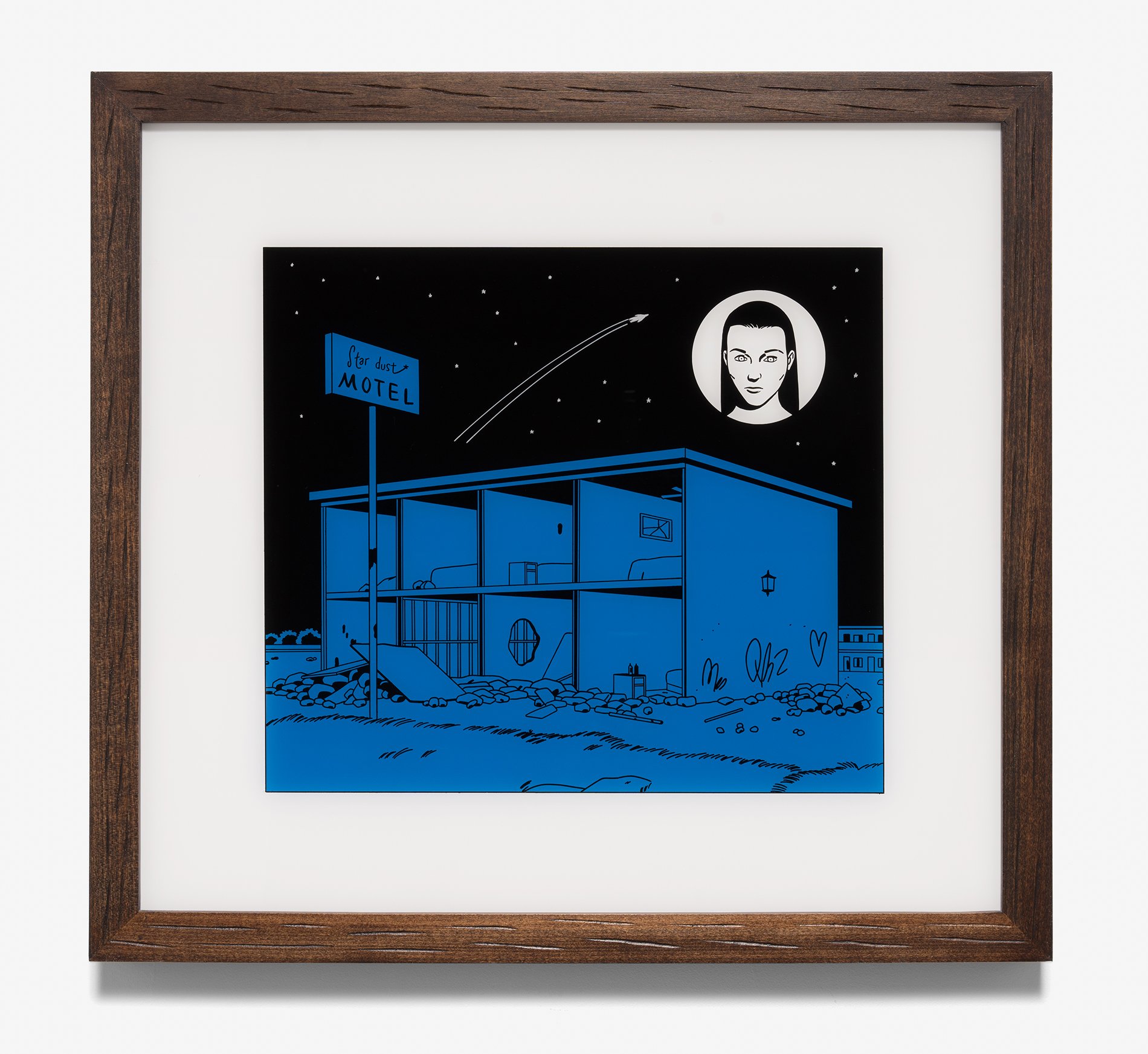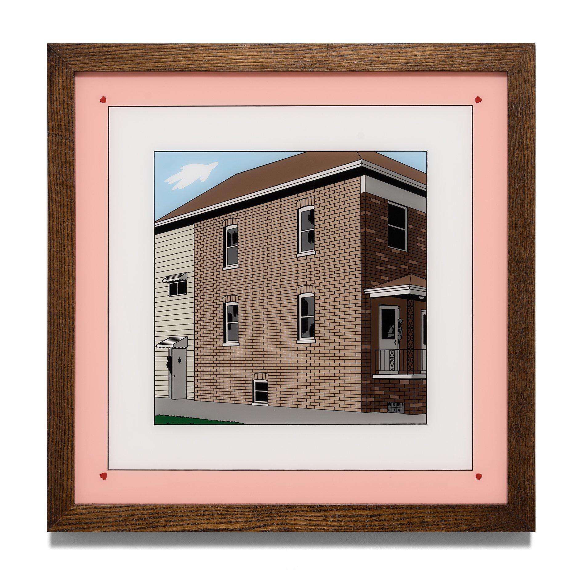 Based in Chicago, Nick Drnaso is best known as a graphic novelist. He has just finished work on his fourth book, which, like the other three, will be published on the illustrious Drawn and Quarterly press. Drnaso’s second book, Sabrina (2018), is the only graphic novel to have been nominated for a Man Booker Prize; his first offering was awarded the Los Angeles Times prize for Best Graphic Novel. Parallel to and intersecting with his graphic novel work, Drnaso maintains an active painting practice. Using back-painting on glass and plexiglass, a technique he has in common with several Chicago Imagist artists, Drnaso has created a series of portraits, highly graphic and also deeply enigmatic, often in a shadow-box format. His most recent series, which will be shown complete in this exhibition, features figureless environments, haunted suburban and urban landscapes with ghostly skies, sometimes surrounded by glyph-like borders. Like his novels, Drnaso’s paintings beg more questions than they answer, their characters and situations as mysterious as they are beautifully and meticulously rendered.
