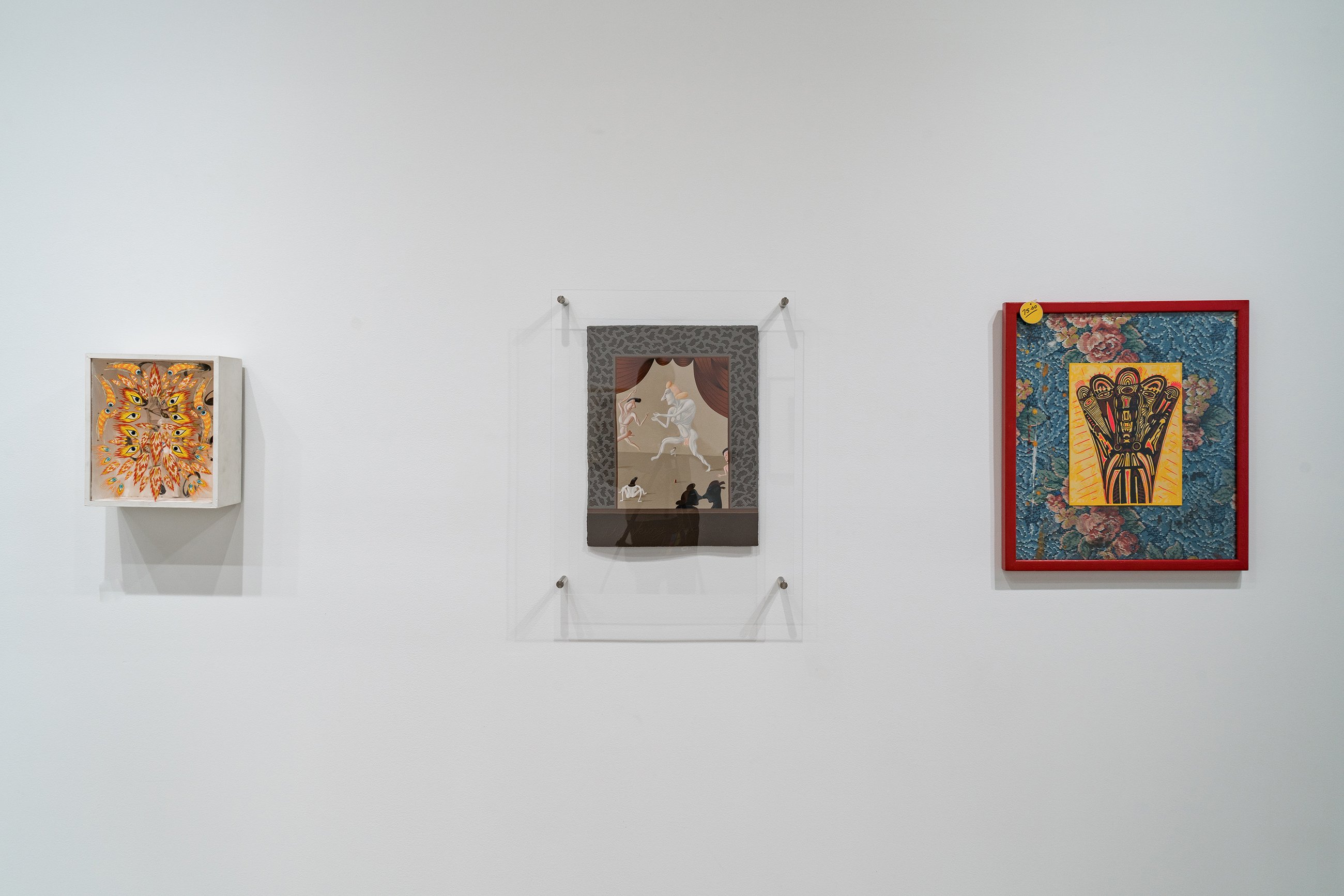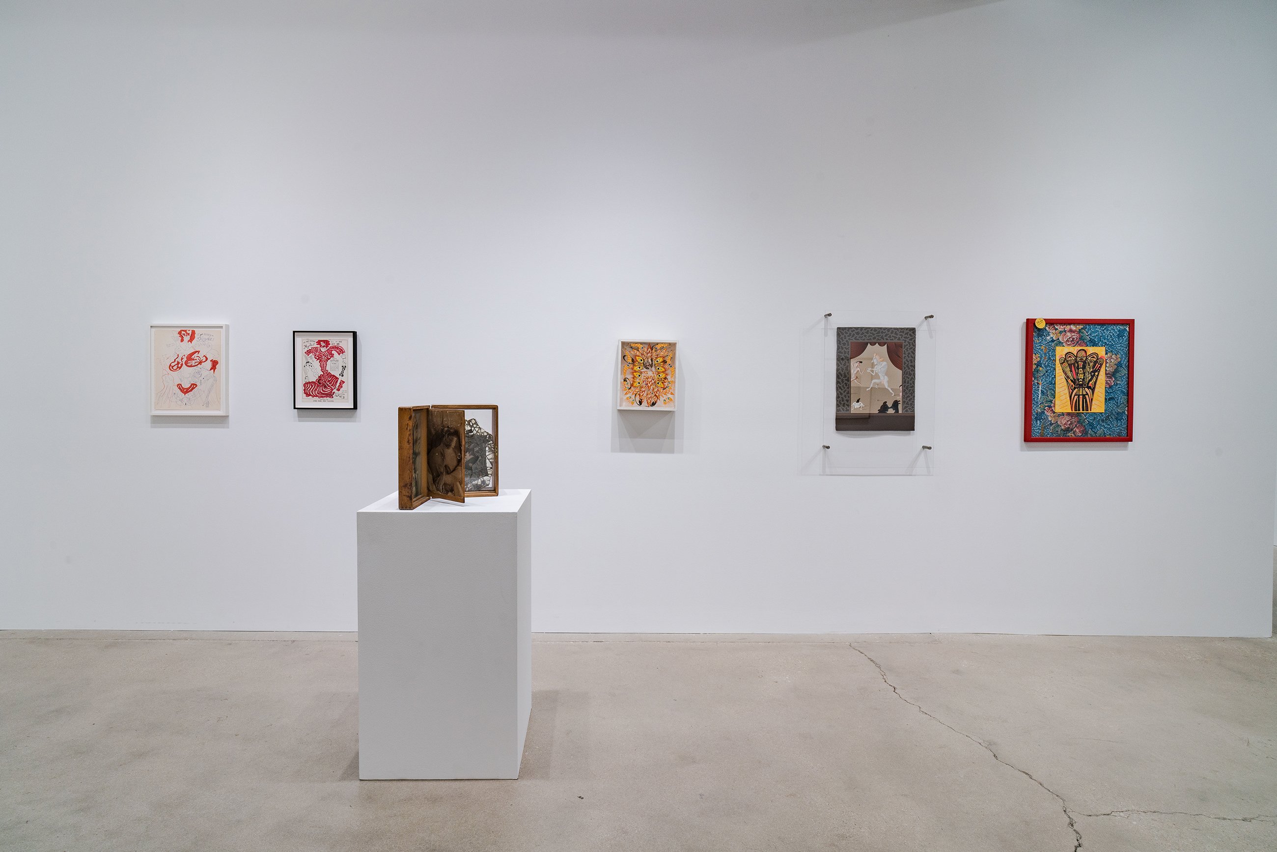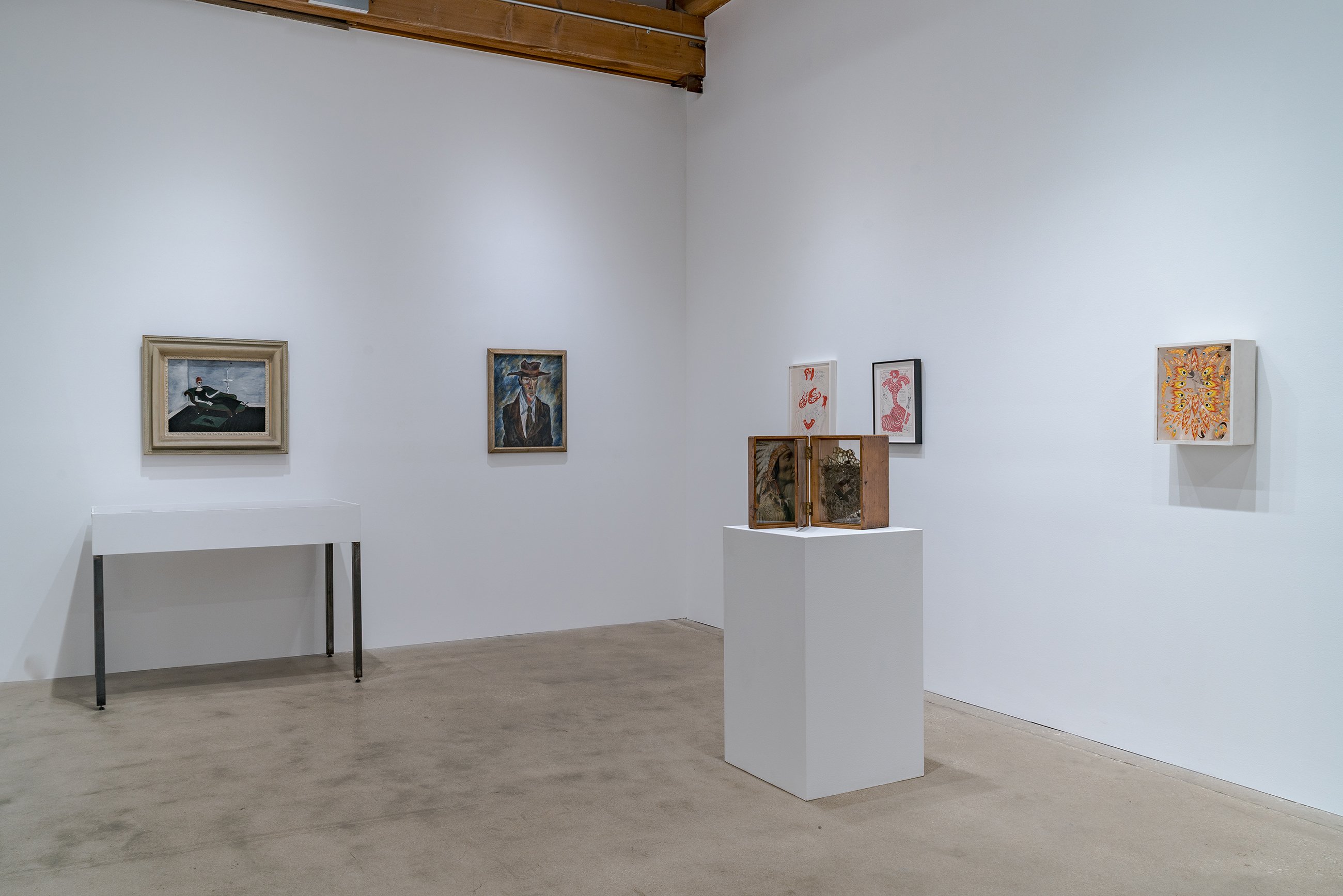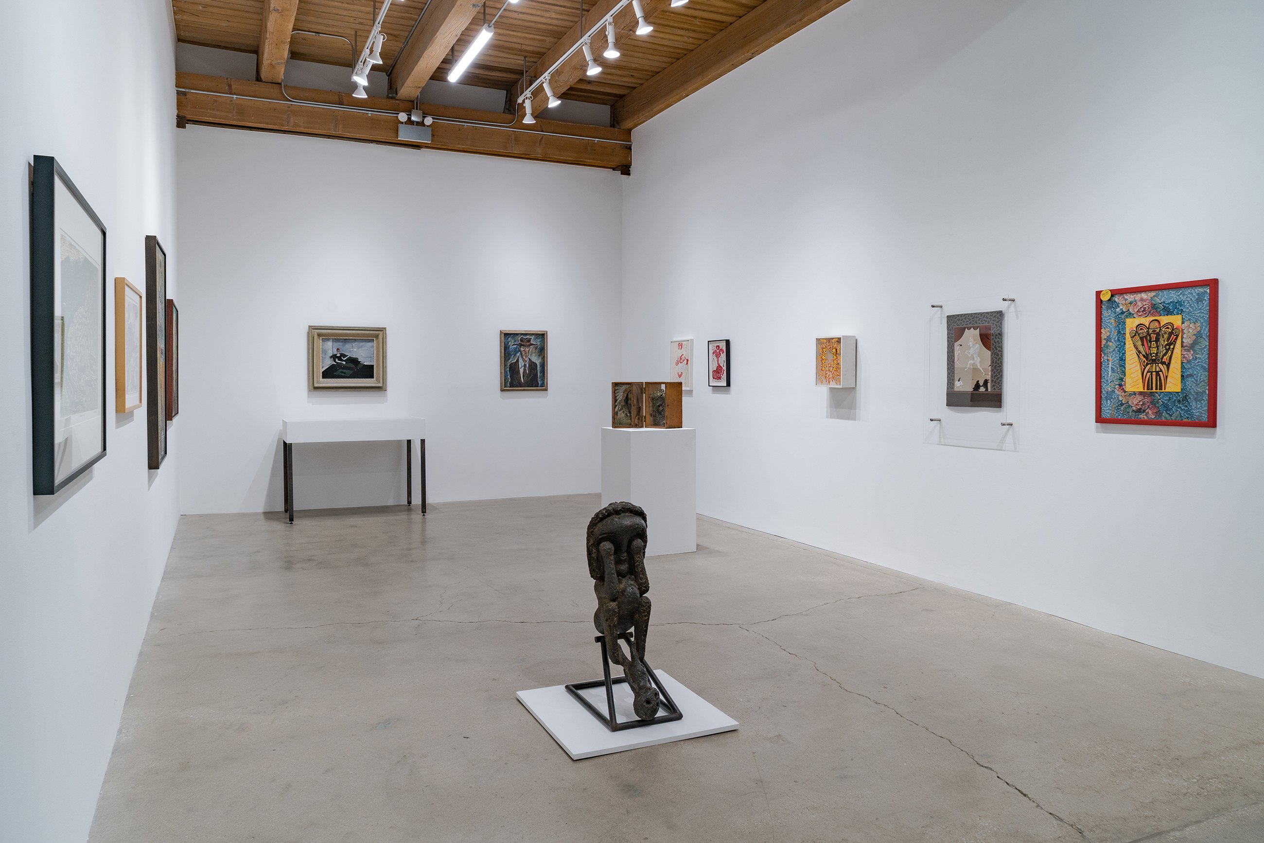Although its placement in the annals of art history has been linked to exhibitions there in the latter half of the 1960s, the Chicago neighborhood of Hyde Park had been an enclave for artistic activity starting decades earlier. This focused group show gently decenters the Hyde Park mythology, configuring the Imagist shows at the Hyde Park Art Center as a continuation of the neighborhood’s longstanding bohemianism and experimentation. At the center of the exhibition sits painter Gertrude Abercrombie, whose recent “discovery” and meteoric ascent in the contemporary art world, fifty years after her death, has come as a surprise to her many admirers in Chicago. Spotlighting an important canvas first unveiled in 1945 at the Renaissance Society (also located in Hyde Park) and a tiny self-portrait in a thrift store frame, the show presents never-seen portraits of Abercrombie by Karl Priebe and Ceil Rosenberg. The exhibition features work by Eleanor Coen and Max Kahn, whose printmaking activities were based in the south side neighborhood in the 1930s and ’40s, as well as fellow Hyde Parker Miyoko Ito, represented by an early canvas, and a “binocular” painting by Harold Haydon, an artist and critic closely associated with the University of Chicago. One of the most beloved and colorful artists of Hyde Park, Cosmo Campoli is present with his signal 1950s bronze “Birth of Death.” Don Baum, like Campoli, was associated early on with the Monster Roster; as director of the Hyde Park Art Center, Baum went on to help facilitate the Hairy Who, False Image, and Non-Plussed Some Imagist shows, and is included in “Nuth’n to Hyde” with two pieces from the 1960s, one of which is an assemblage portrait of collector and Hyde Park social maven Ruth Horwich. From the Imagist camp, the show presents works by Karl Wirsum (the elaborate flyer from which comes the show’s title, together with its original sketch), a piece by Jim Falconer shown in the third Hairy Who exhibition, replete with its original price tag, and a sensational Jim Nutt painting from the mid 1970s.