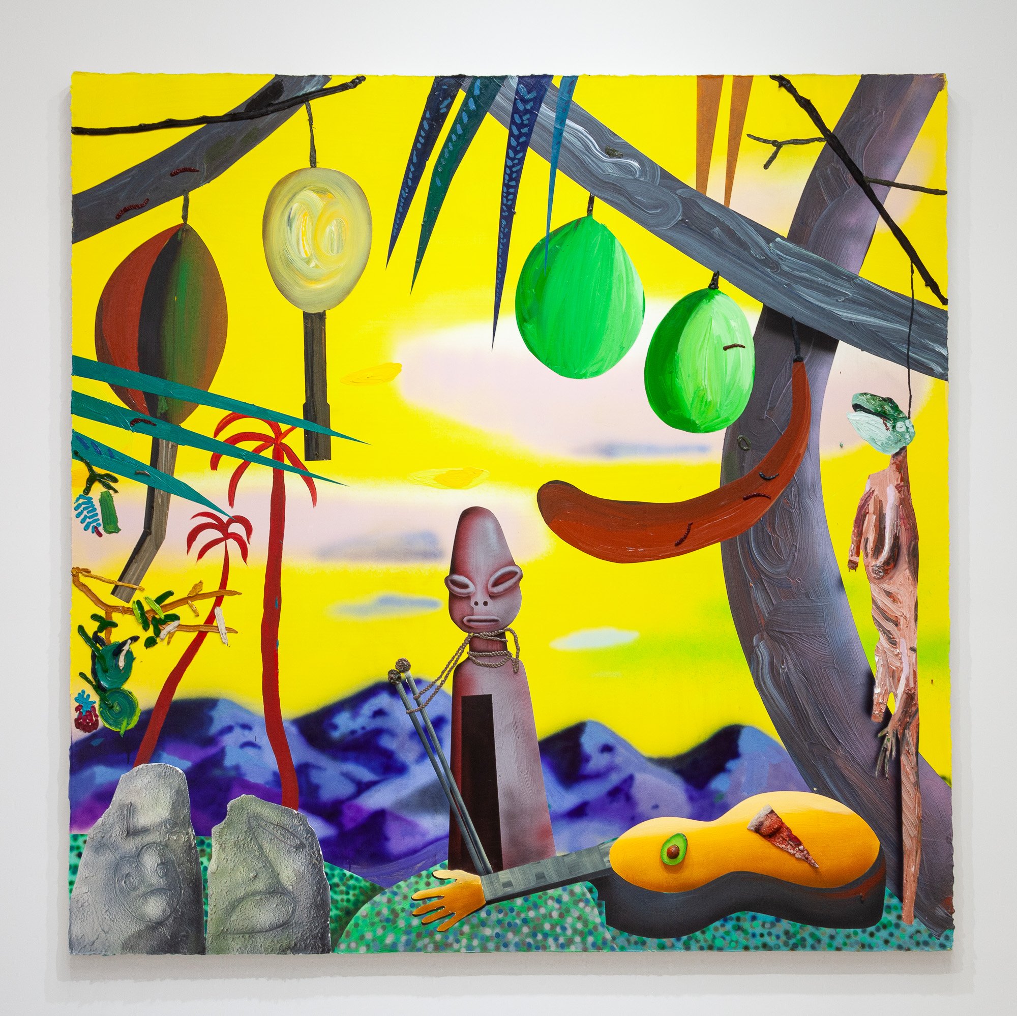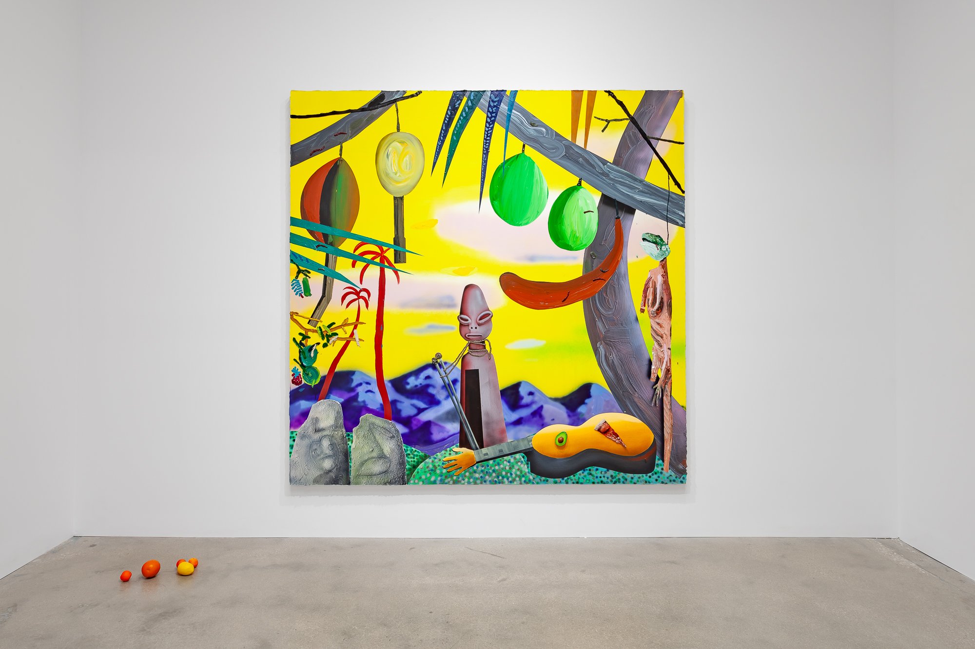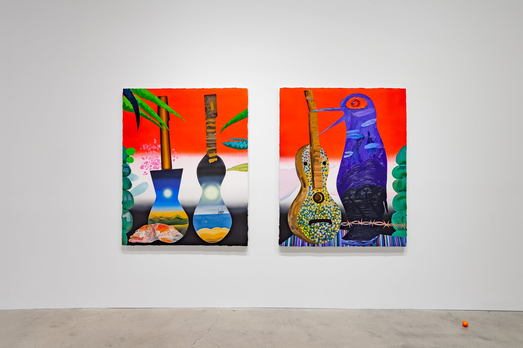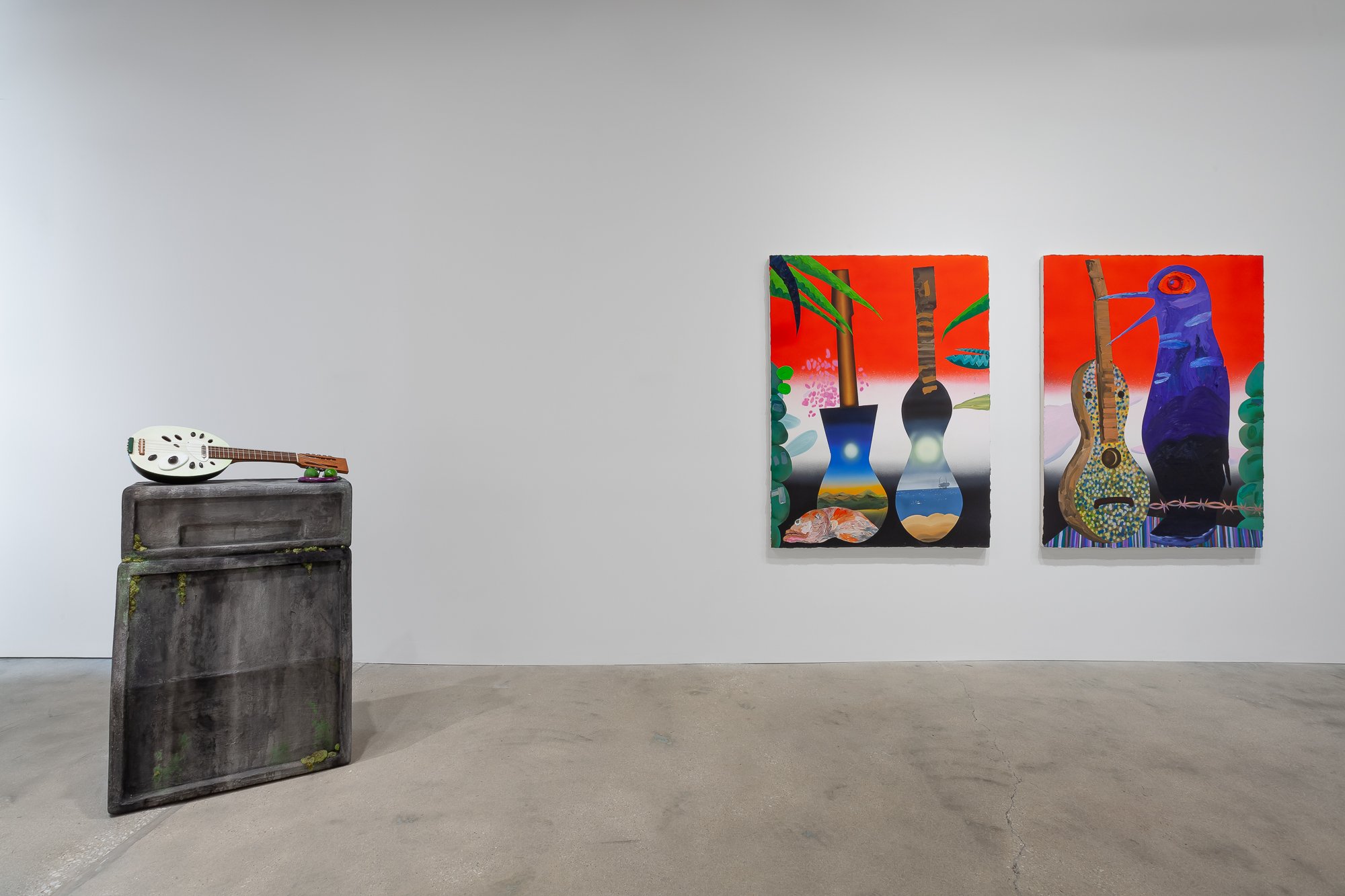 In the North Gallery, CvsD presents Miracle Fruit, an exhibition of new work by Omar Velázquez. A series of luscious paintings explore the deceptively bright place where tropical surrealism intersects with personal and colonial history, taking as one of its guiding icons the cuatro, a native Puerto Rican stringed instrument – not unlike a mandolin – whose manifold iterations, in form and sound, recall the island's complex legacies. Shards of tourism, militarism, and industrialism, Spanish and African cultural influences, and pan-Caribbean aesthetics engage the history of the lute as cumulative chronicle of Puerto Rico. As a dimensional ground for his canvases, Velázquez fabricated a cuatro out of the shell of a higüera fruit, one of its seeds serving as the volume knob. Indeed, the fruit itself turns out to be the ur-theme of the show, from its life in the soil, with sensuous manifestations in hue and curve, to its status in traditional, modern, and postmodern culture.