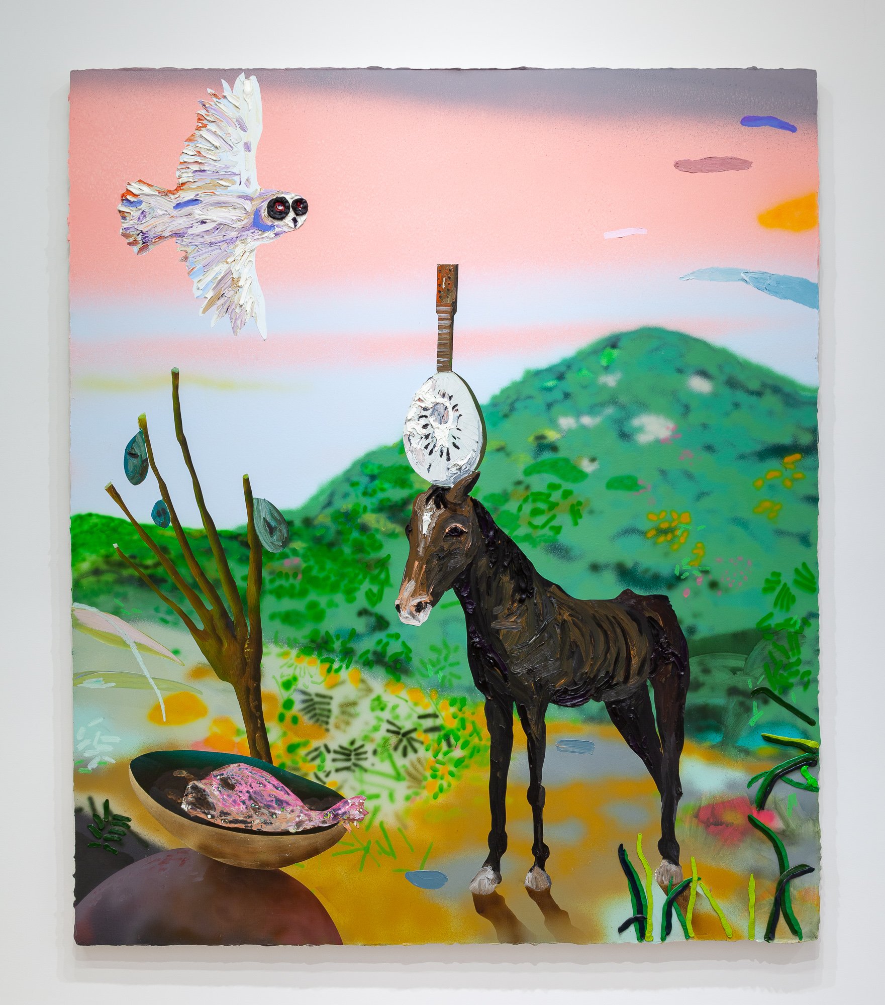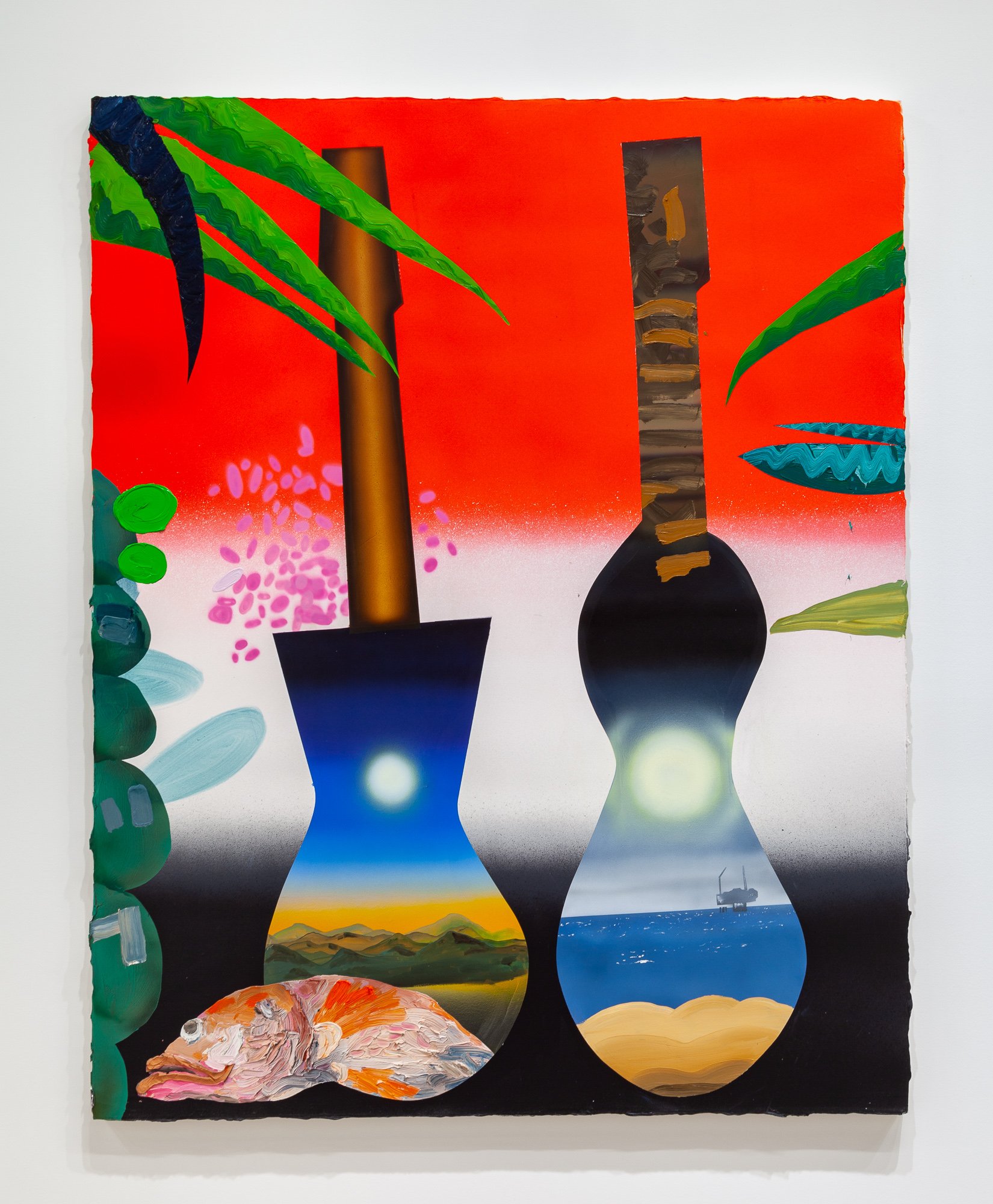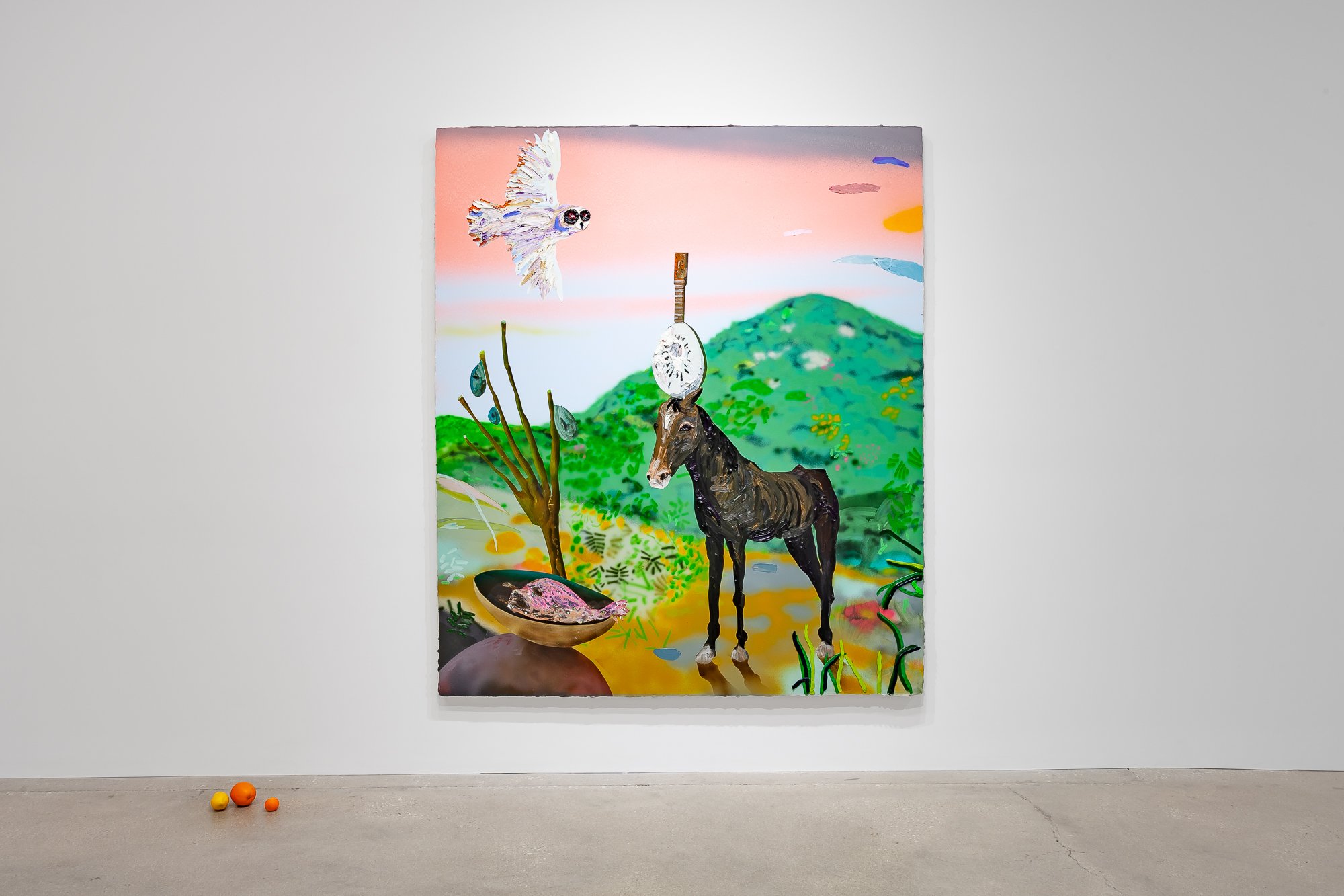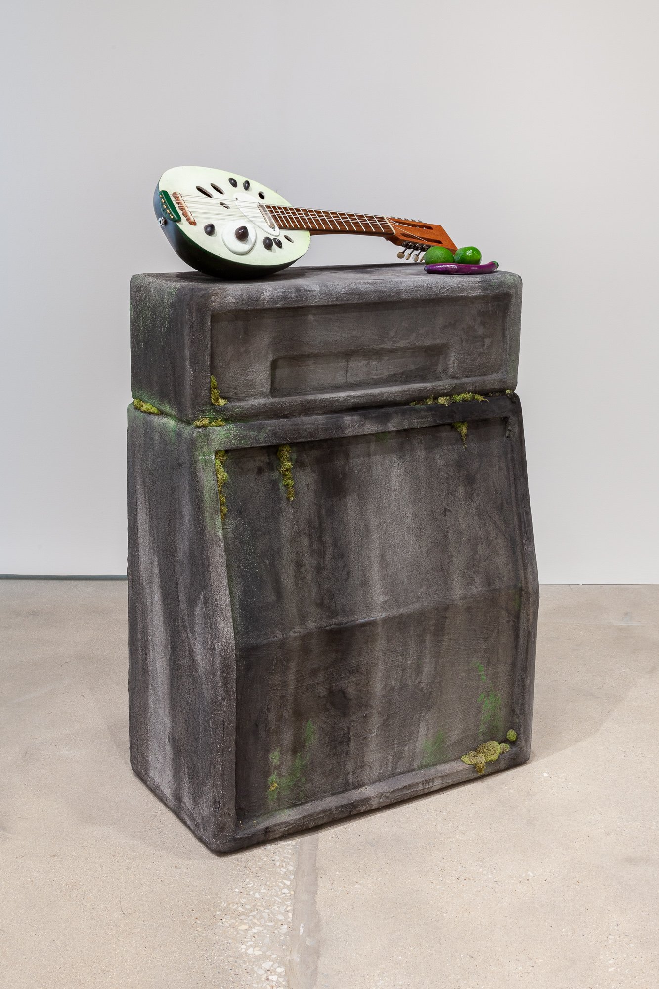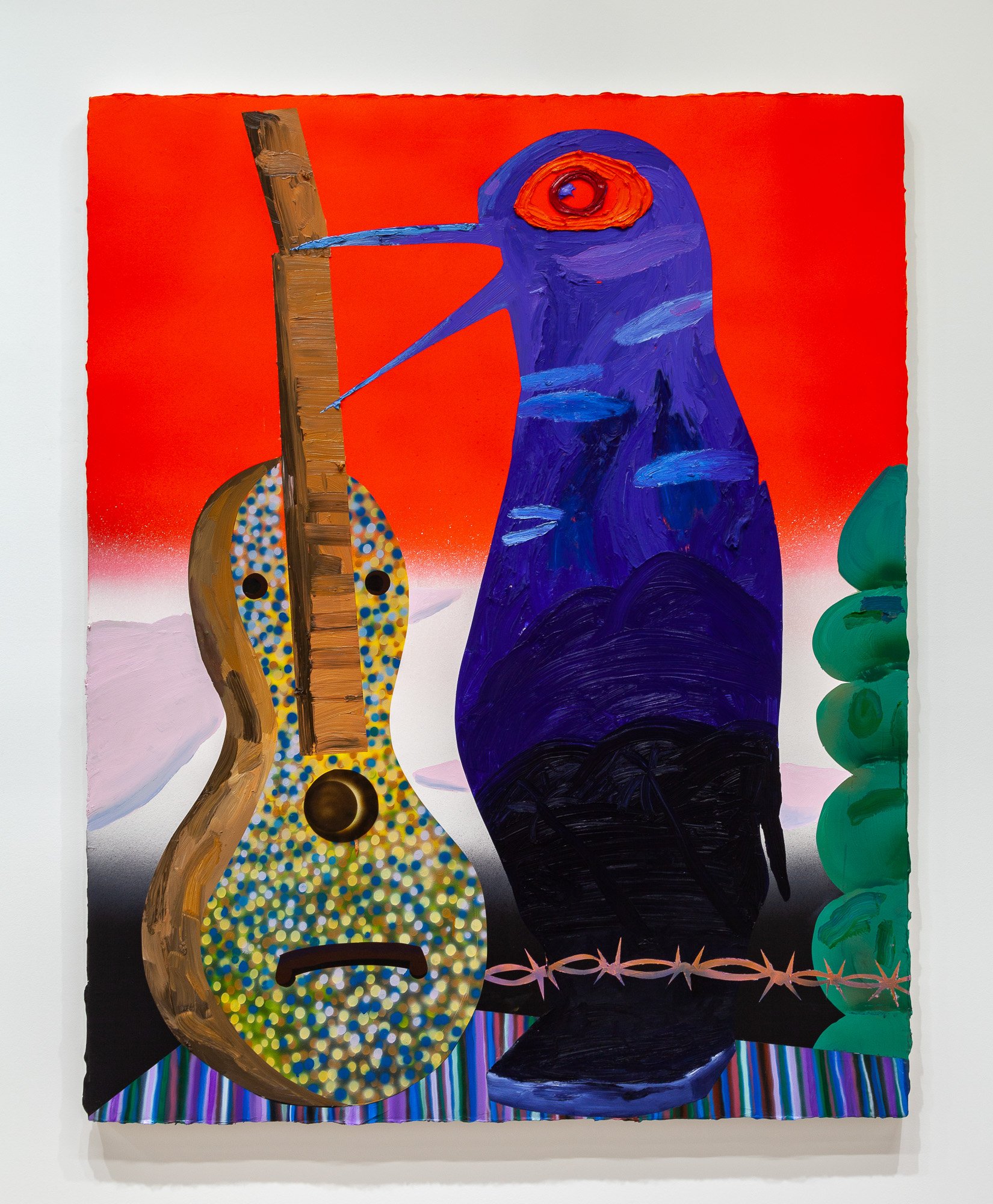 In the North Gallery, CvsD presents Miracle Fruit, an exhibition of new work by Omar Velázquez. A series of luscious paintings explore the deceptively bright place where tropical surrealism intersects with personal and colonial history, taking as one of its guiding icons the cuatro, a native Puerto Rican stringed instrument – not unlike a mandolin – whose manifold iterations, in form and sound, recall the island's complex legacies. Shards of tourism, militarism, and industrialism, Spanish and African cultural influences, and pan-Caribbean aesthetics engage the history of the lute as cumulative chronicle of Puerto Rico. As a dimensional ground for his canvases, Velázquez fabricated a cuatro out of the shell of a higüera fruit, one of its seeds serving as the volume knob. Indeed, the fruit itself turns out to be the ur-theme of the show, from its life in the soil, with sensuous manifestations in hue and curve, to its status in traditional, modern, and postmodern culture.