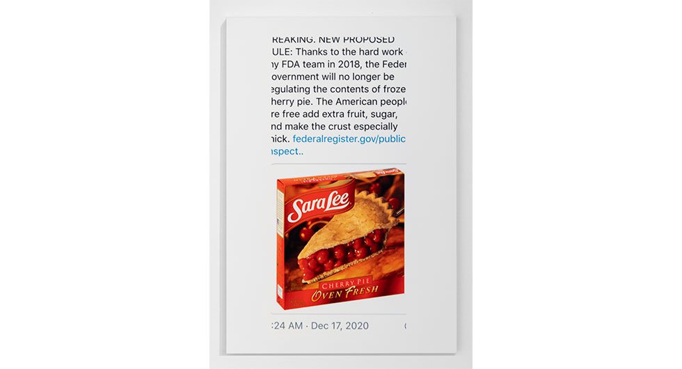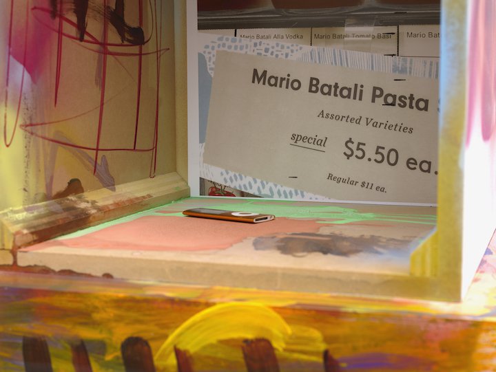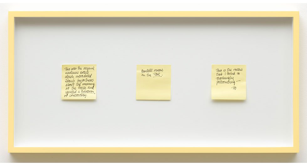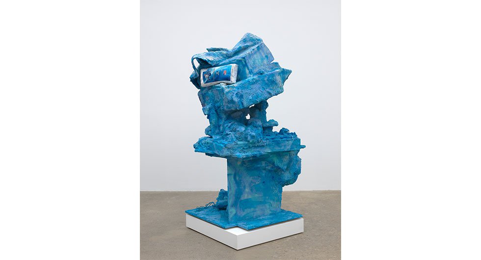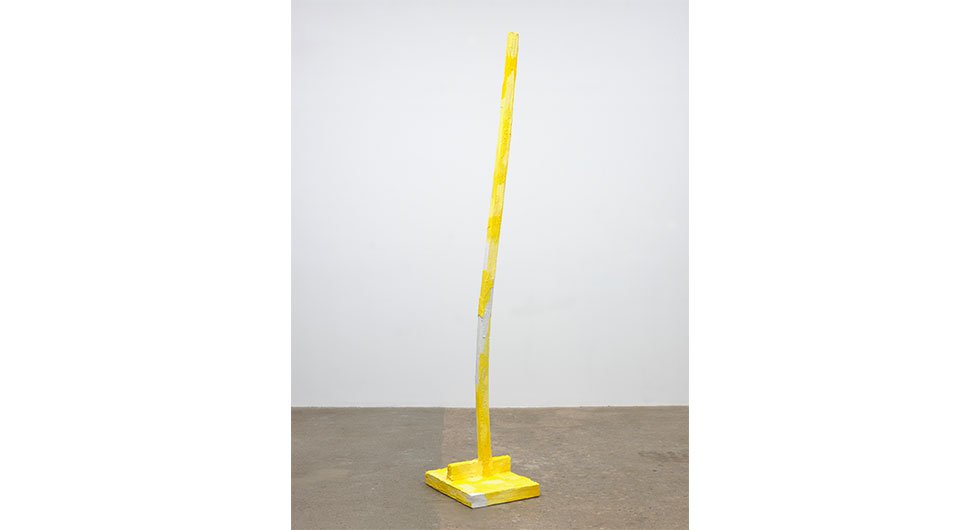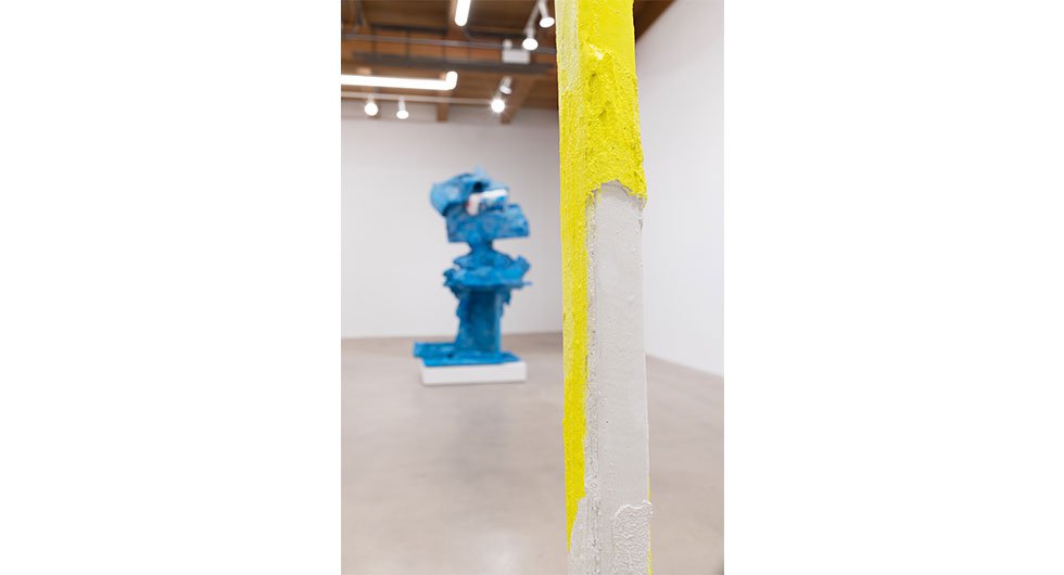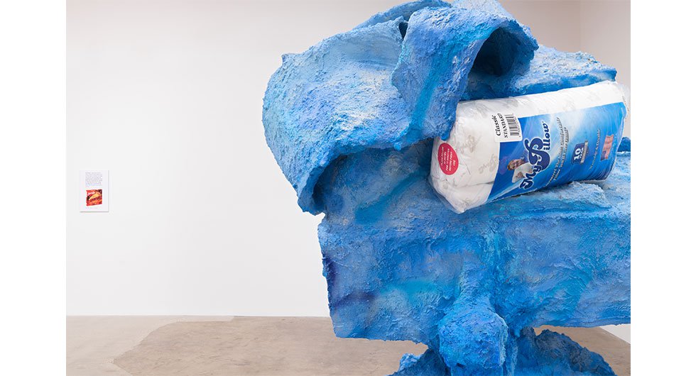 In Assorted Varieties, Harrison unveils four major sculptures and three wall works. Of these large-scale pieces, three are in theory monochromatic – red, blue, and yellow. However, their variegated hues almost chide the idea of the monochrome, revealing a subtle pandemonium of shades and temperatures residing in craggy surfaces, torqued volumes, and inset objects. The wall works roughly map onto the color scheme of the sculptures, recast in different media – a framed set of post-it notes, an enigmatic abstract photograph (titled Photograph), and a blown-up screen grab of a frozen cherry pie with associated Tweet. Everything in Harrison's artistic ecosystem is buzzing with latent meaning – nothing is arbitrary, and nothing is obvious.