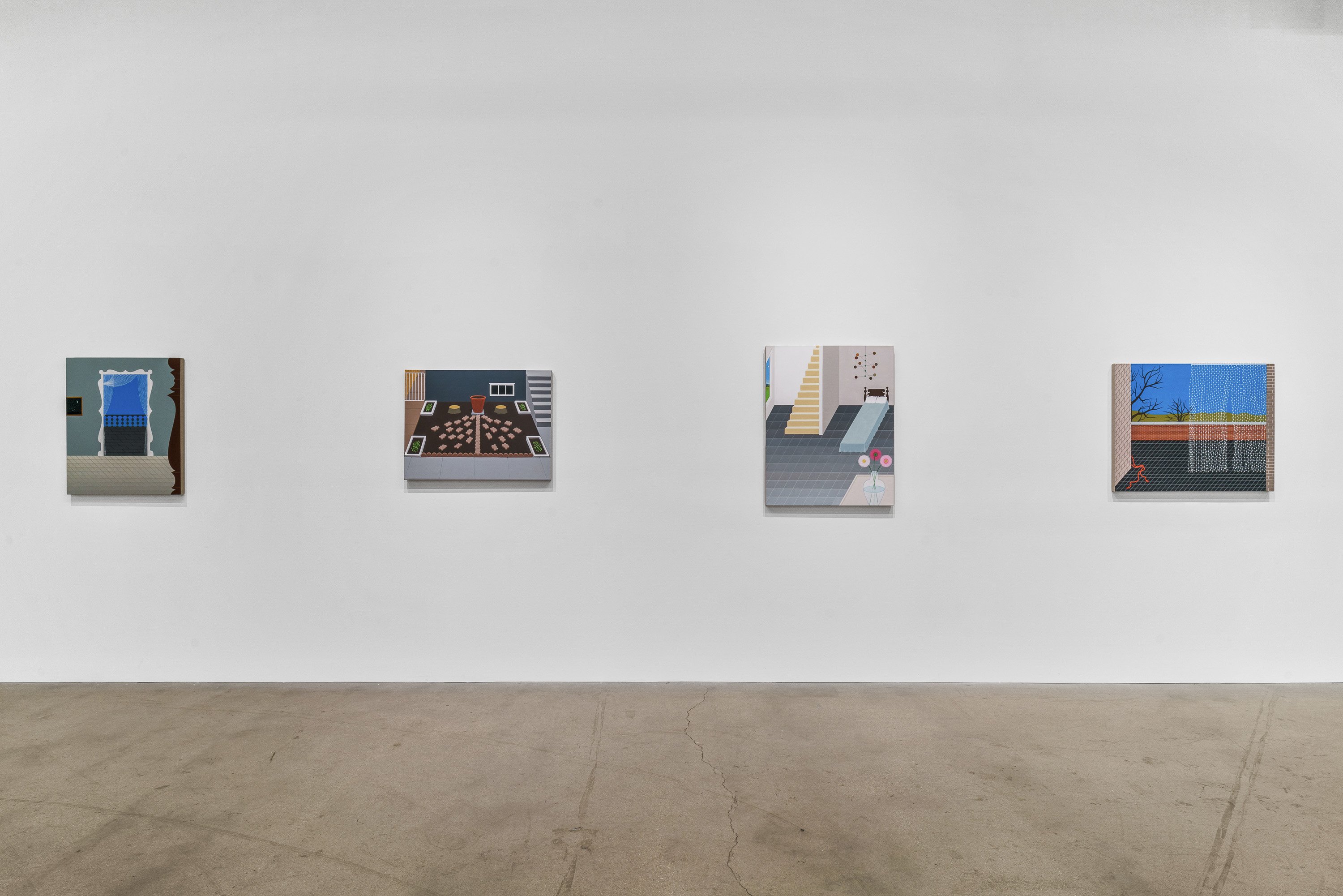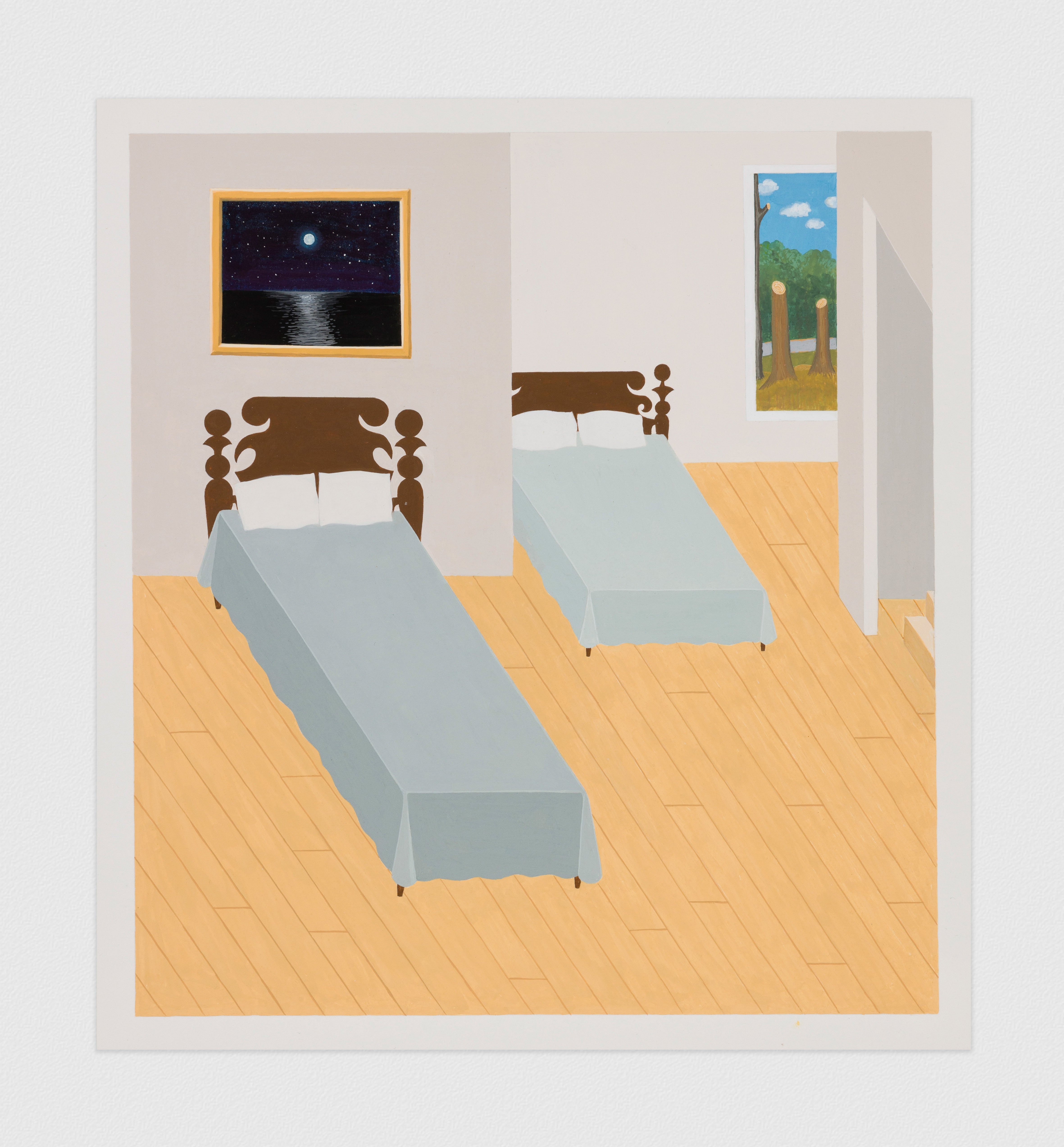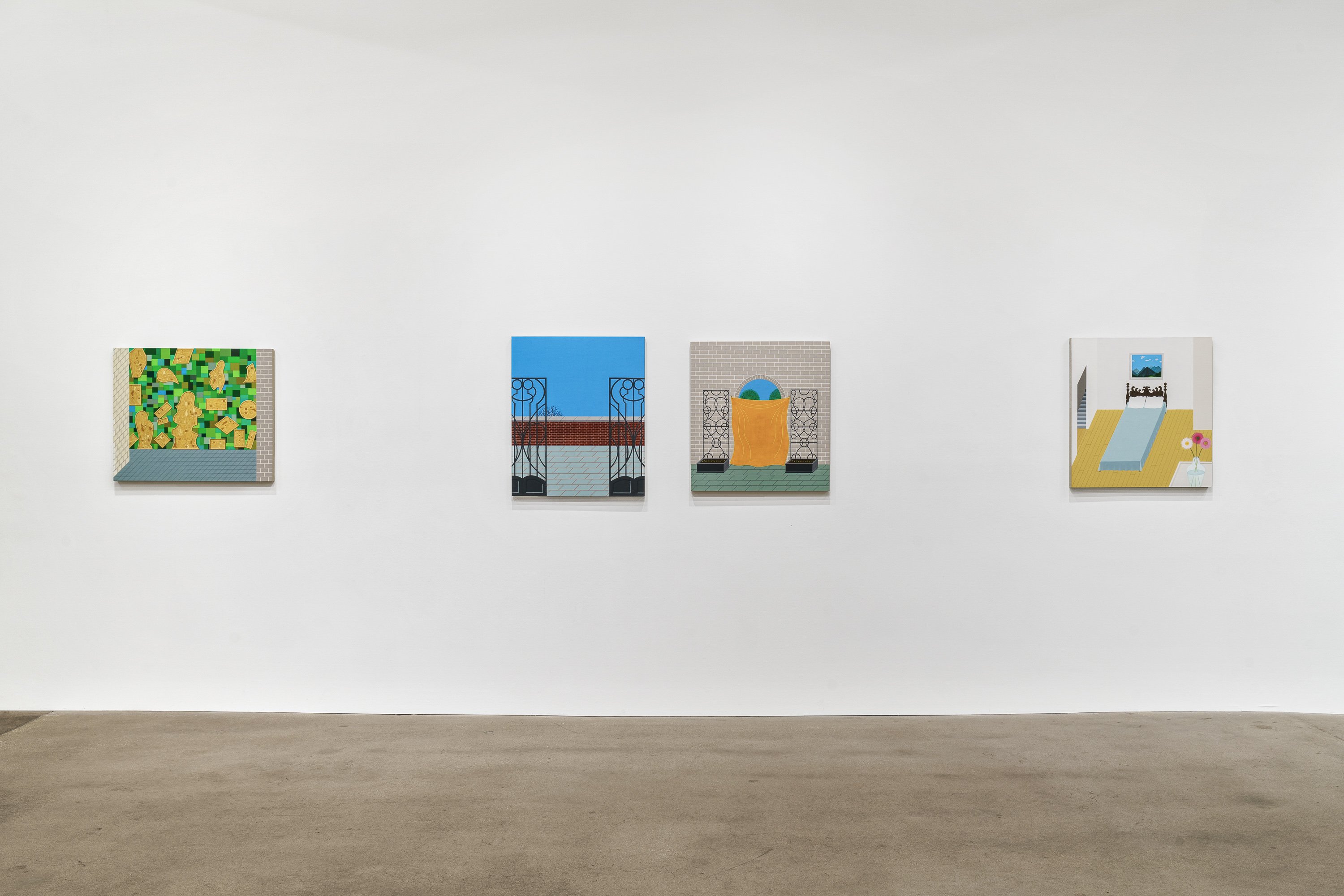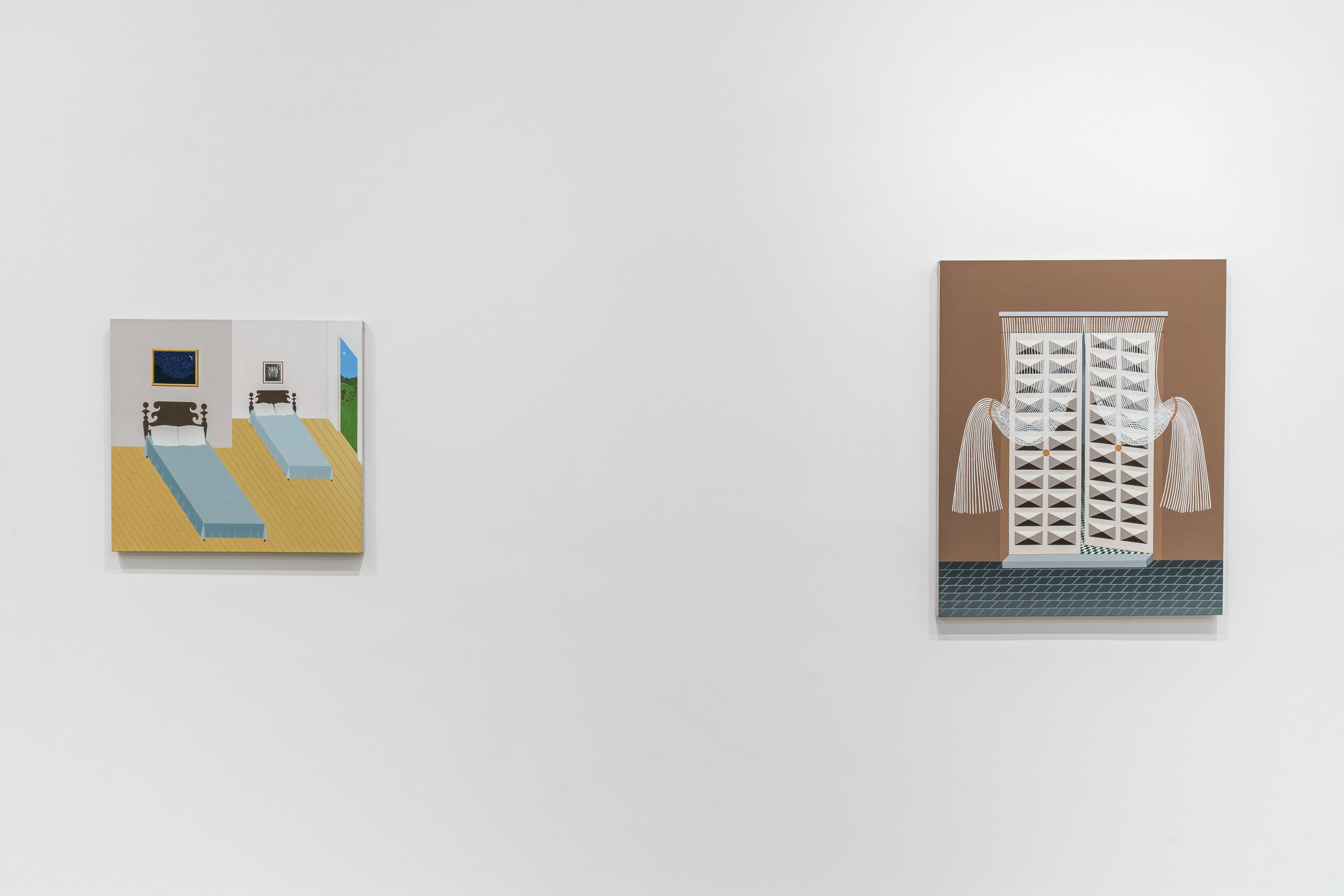 In her latest body of work, Rebecca Shore meditates on a shifting set of spaces – interiors and exteriors, mostly domestic sites including bedrooms, porches, gardens, verandas, mezzanines, dining rooms, courtyards, doorways, and windows. Indeed, the status of the portal in these paintings, executed in acrylic on linen or in gouache on paper, is a central point. The viewer is consistently looking at something through something else, their vision moving between different atmospheres, varieties of light, qualities of enclosure or landscape. Building on her relatively recent pivot from abstraction to representation, Shore has retained her immaculate technical approach, a consistent feature of her work across her oeuvre, back to the paintings she was making in the early 1980s and the quilts she made alongside her friend Christina Ramberg later in the decade. There are no figures in these new works, only spaces. Often containing sly visual games or lurking spatial paradoxes, Shore's paintings create an imagined territory into which the viewer can project themself, a stage set carefully prepared for cognitive immersion. Two beds with paintings hung above them, one a daytime scene, one a night sky, the pairing creating a subtle tension in the room. Layers of oblique intertexts hovering in the paintings – Giovanni di Paolo's window-glimpsed landscapes and stylized rock formations, the vibrating curved lines of Karl Wirsum "awning" canvases. There are multiple patterns associated with different elements of these scenarios – a wall, a floor, stairs, a woven curtain, an iron gate, a hanging mobile – each combination culminating in a complex rhythmic assemblage, an extraordinary visual polyrhythm.