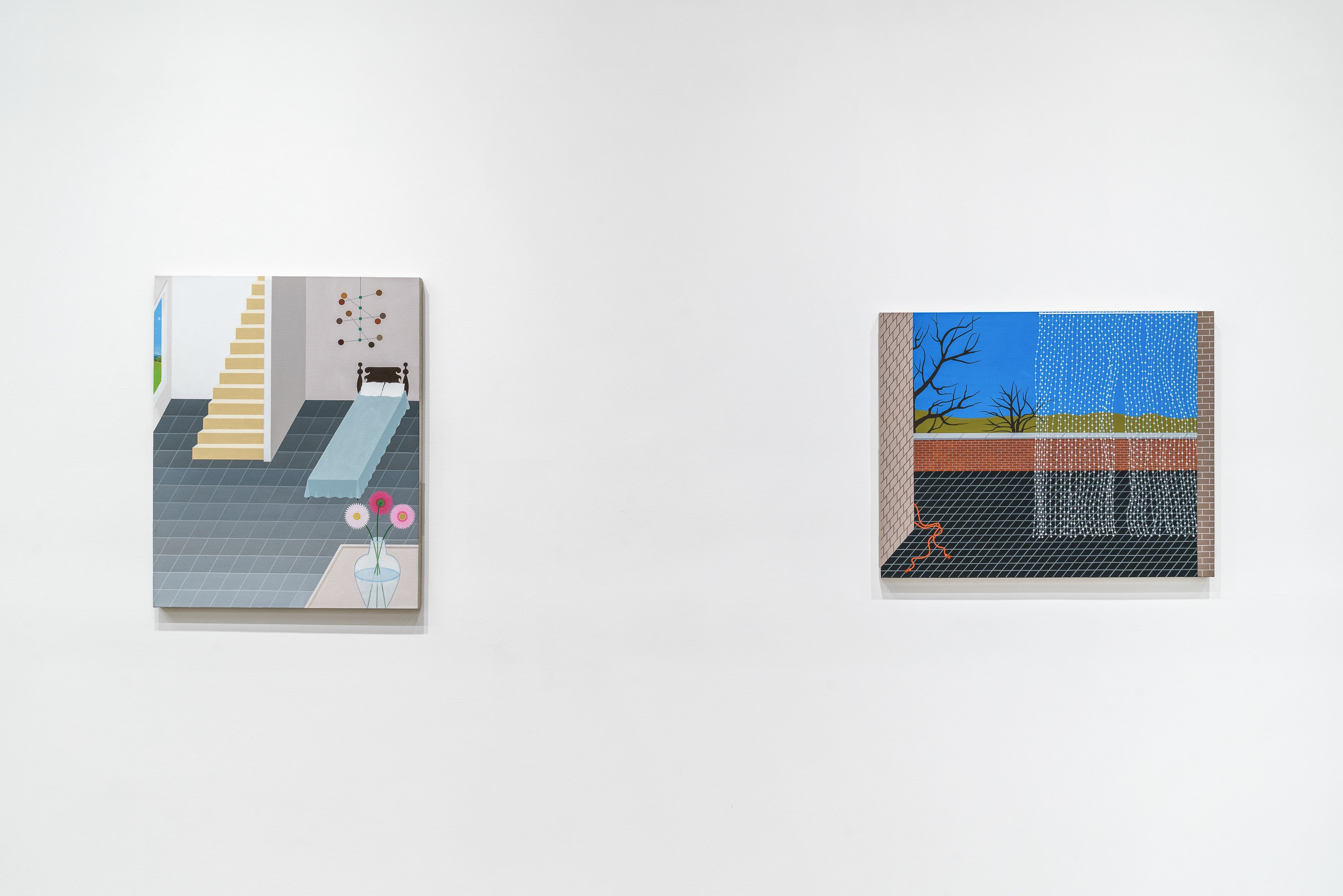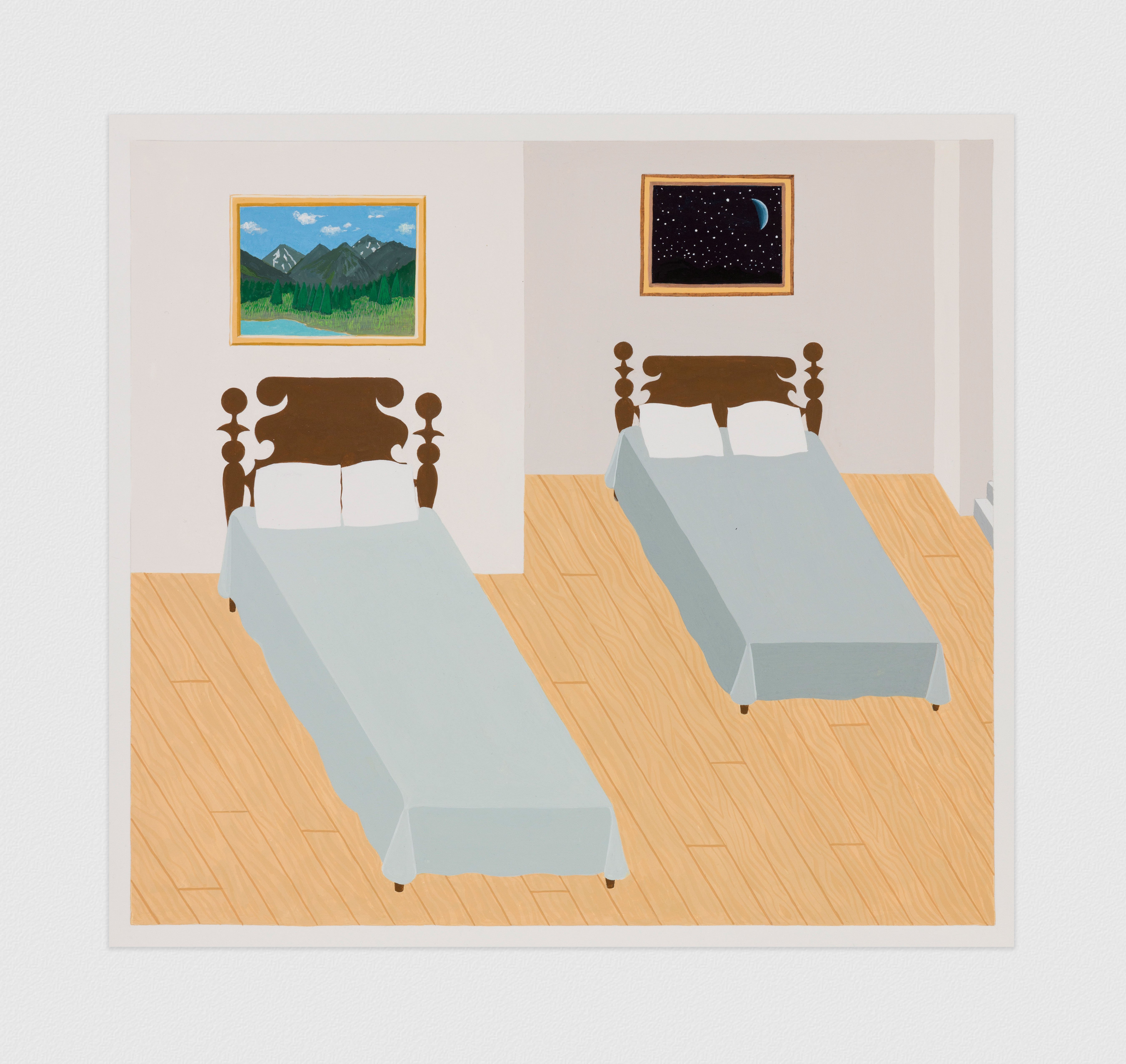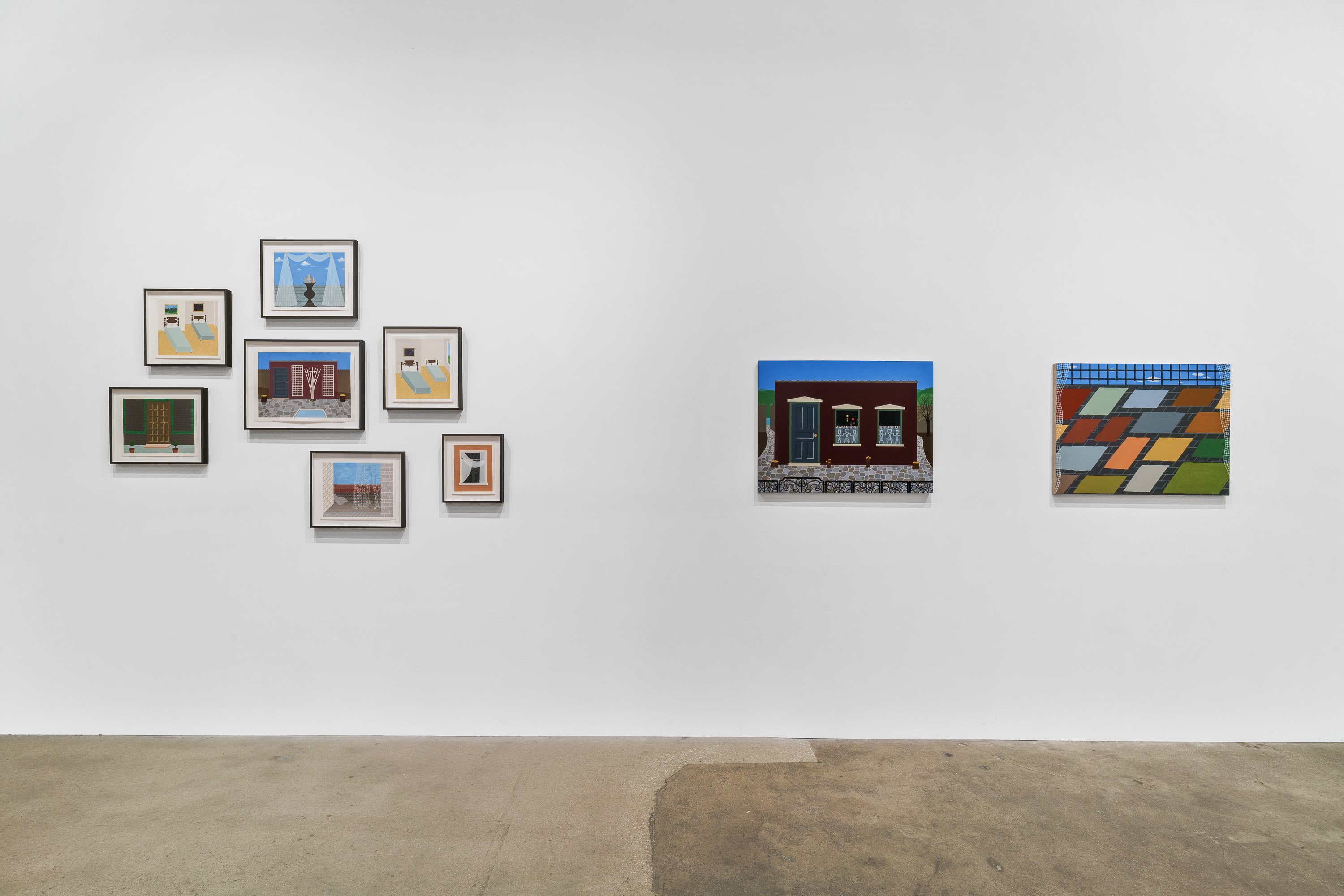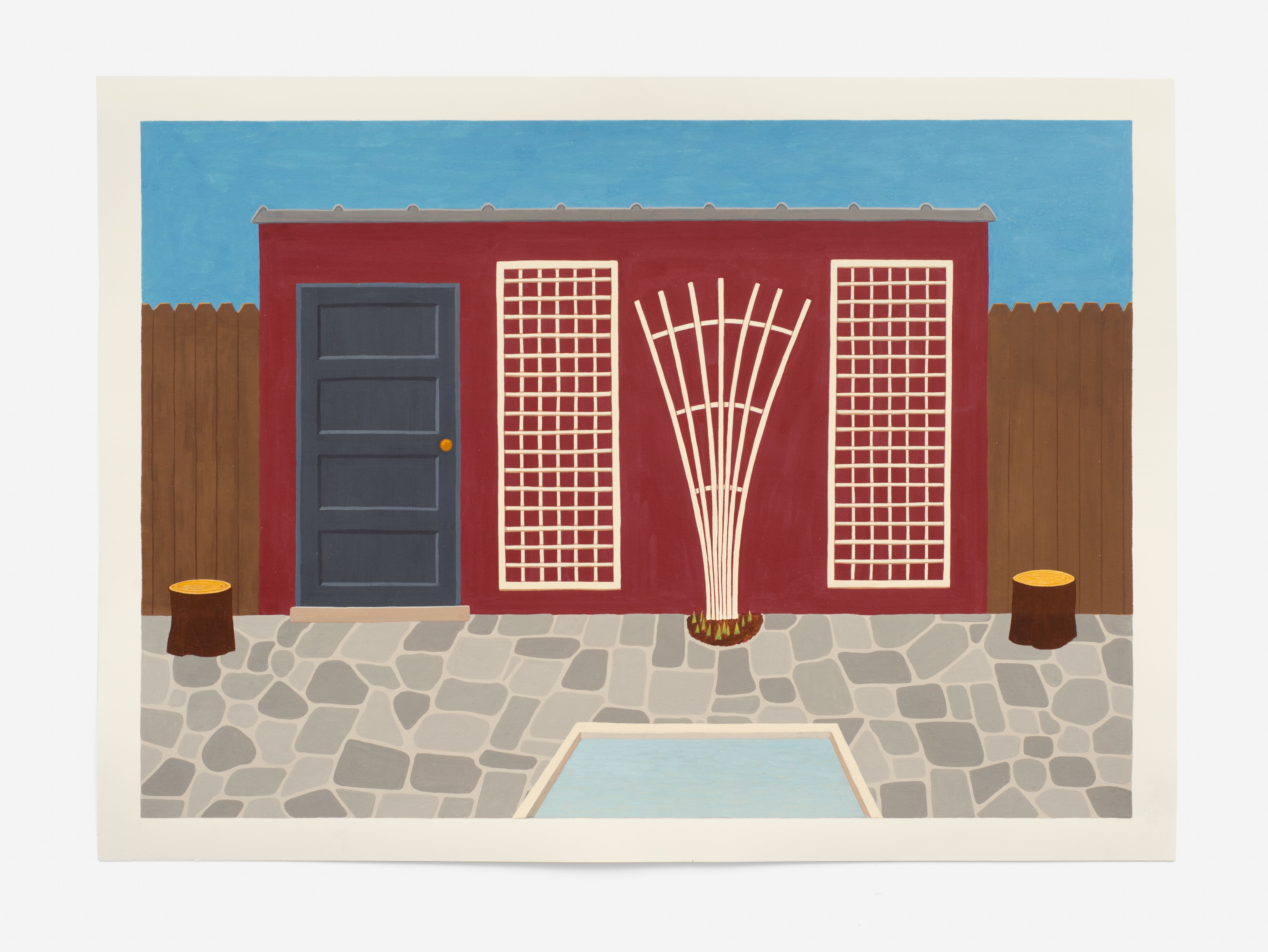 In her latest body of work, Rebecca Shore meditates on a shifting set of spaces – interiors and exteriors, mostly domestic sites including bedrooms, porches, gardens, verandas, mezzanines, dining rooms, courtyards, doorways, and windows. Indeed, the status of the portal in these paintings, executed in acrylic on linen or in gouache on paper, is a central point. The viewer is consistently looking at something through something else, their vision moving between different atmospheres, varieties of light, qualities of enclosure or landscape. Building on her relatively recent pivot from abstraction to representation, Shore has retained her immaculate technical approach, a consistent feature of her work across her oeuvre, back to the paintings she was making in the early 1980s and the quilts she made alongside her friend Christina Ramberg later in the decade. There are no figures in these new works, only spaces. Often containing sly visual games or lurking spatial paradoxes, Shore's paintings create an imagined territory into which the viewer can project themself, a stage set carefully prepared for cognitive immersion. Two beds with paintings hung above them, one a daytime scene, one a night sky, the pairing creating a subtle tension in the room. Layers of oblique intertexts hovering in the paintings – Giovanni di Paolo's window-glimpsed landscapes and stylized rock formations, the vibrating curved lines of Karl Wirsum "awning" canvases. There are multiple patterns associated with different elements of these scenarios – a wall, a floor, stairs, a woven curtain, an iron gate, a hanging mobile – each combination culminating in a complex rhythmic assemblage, an extraordinary visual polyrhythm.