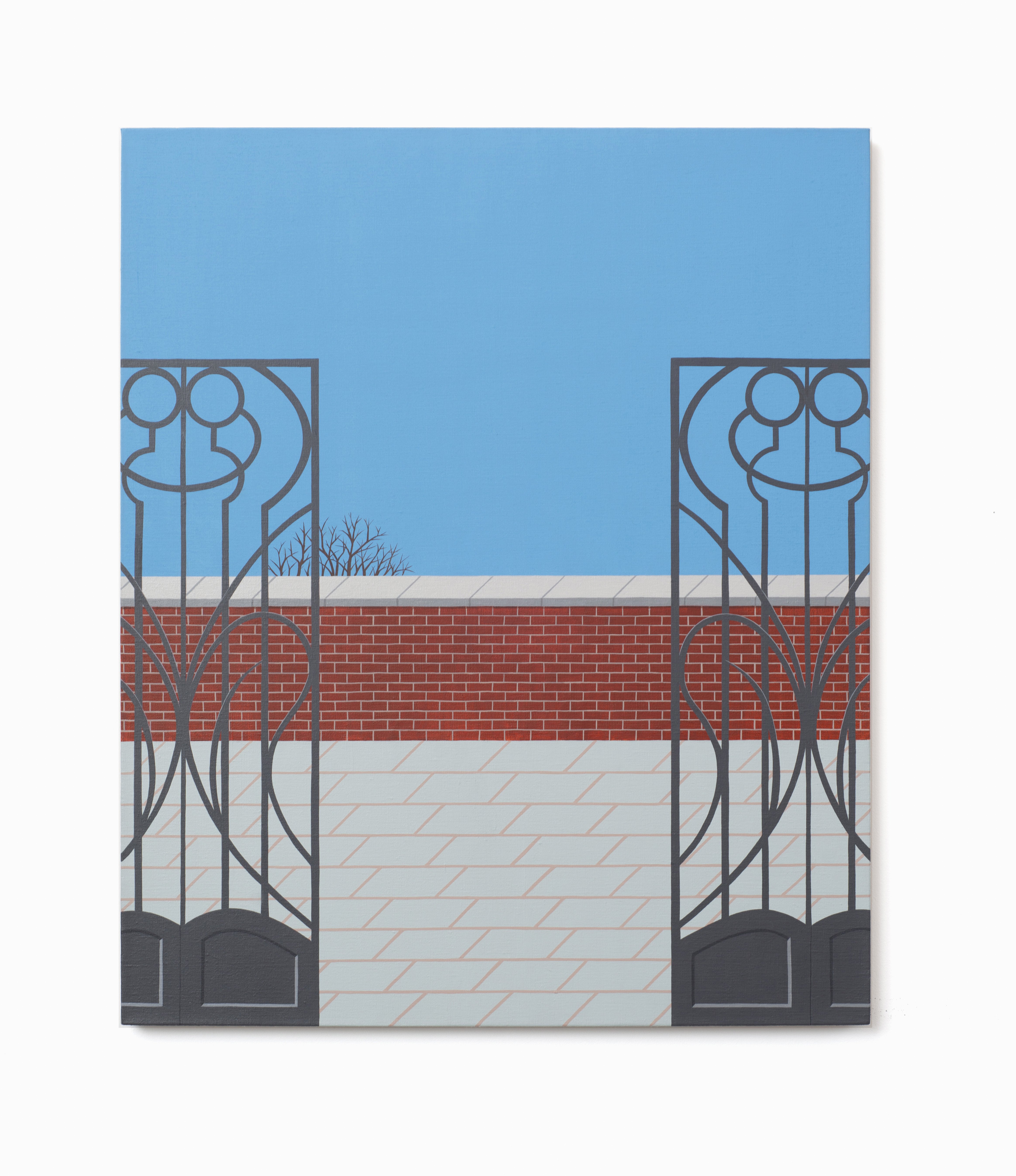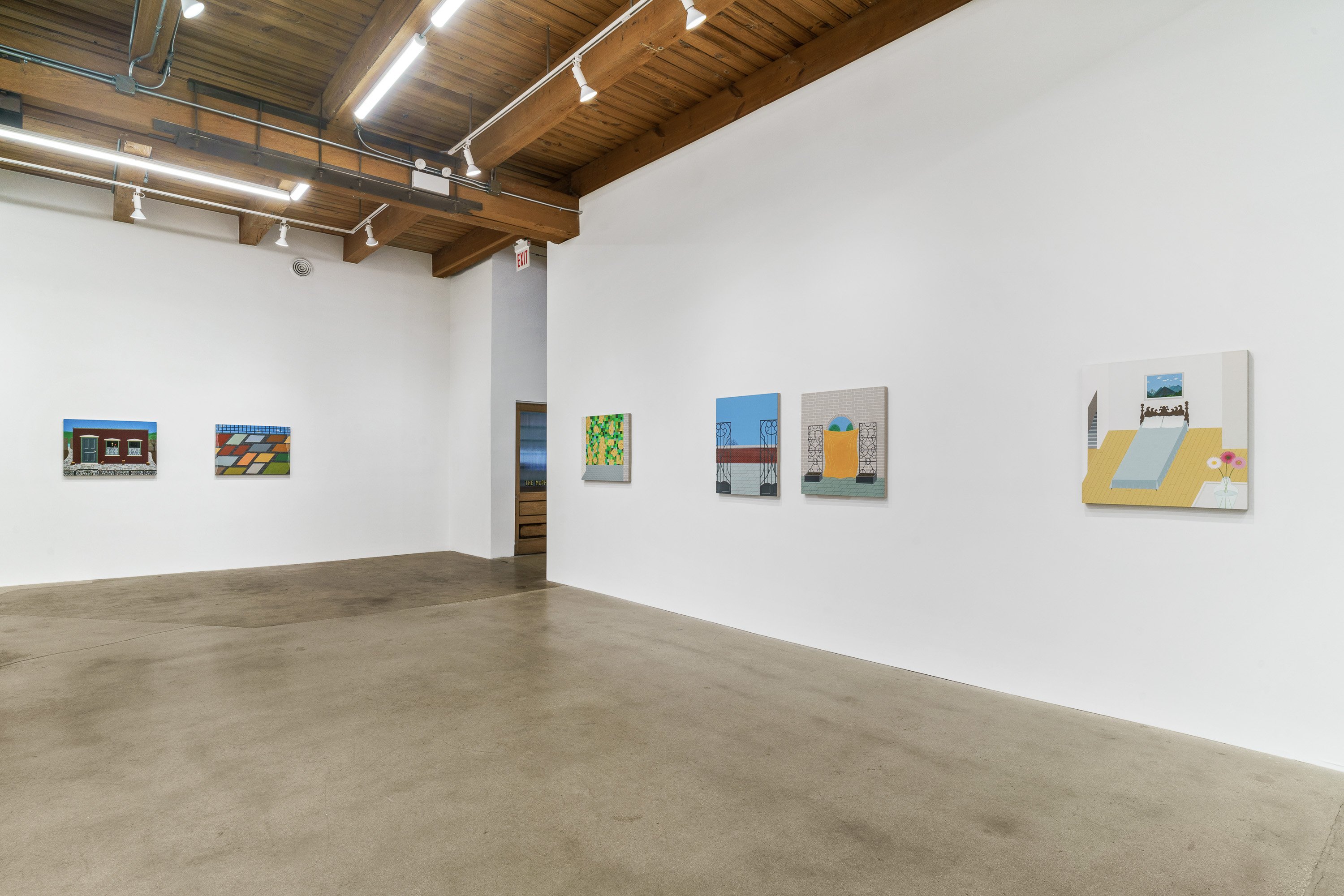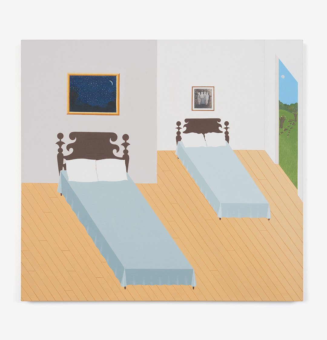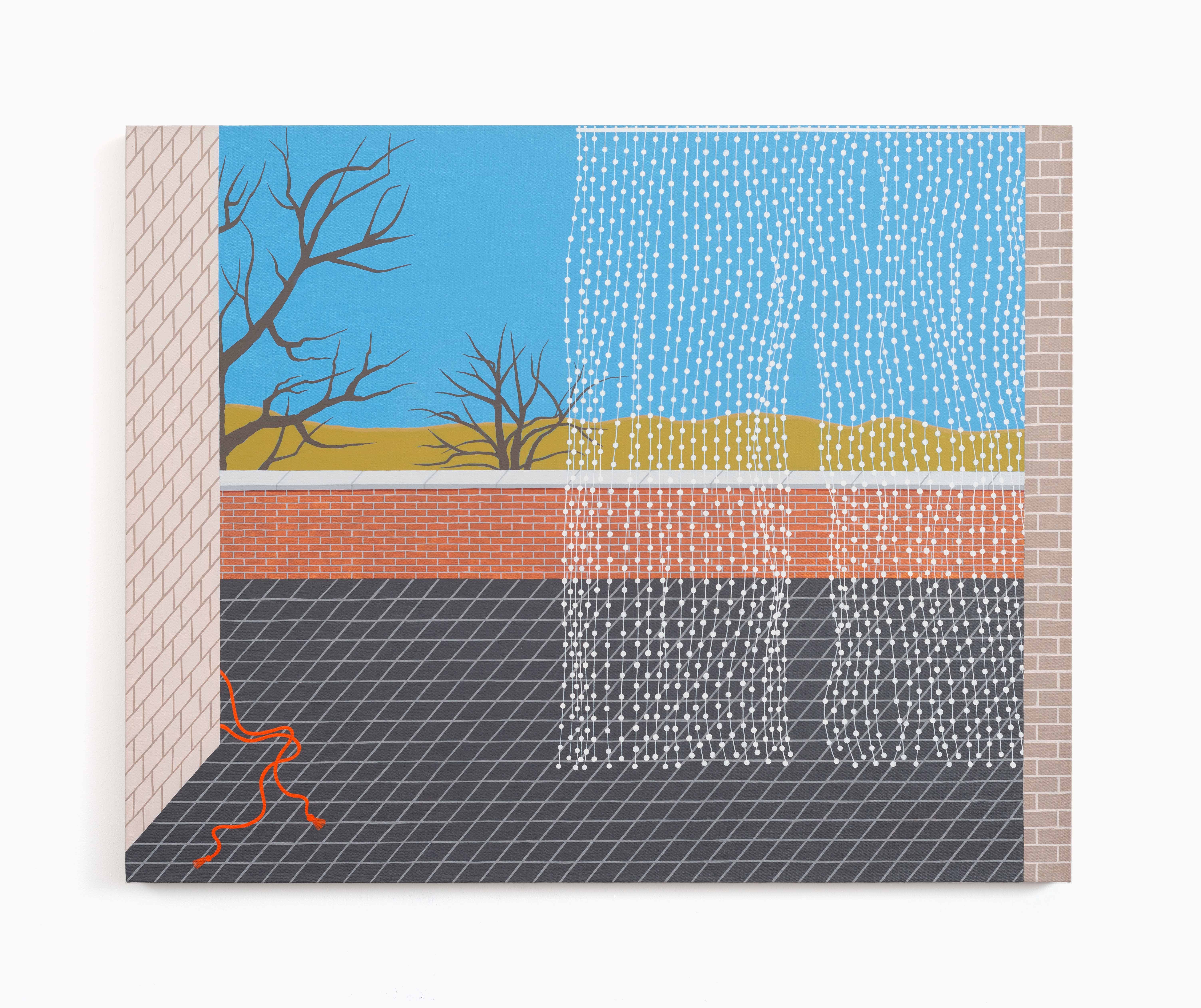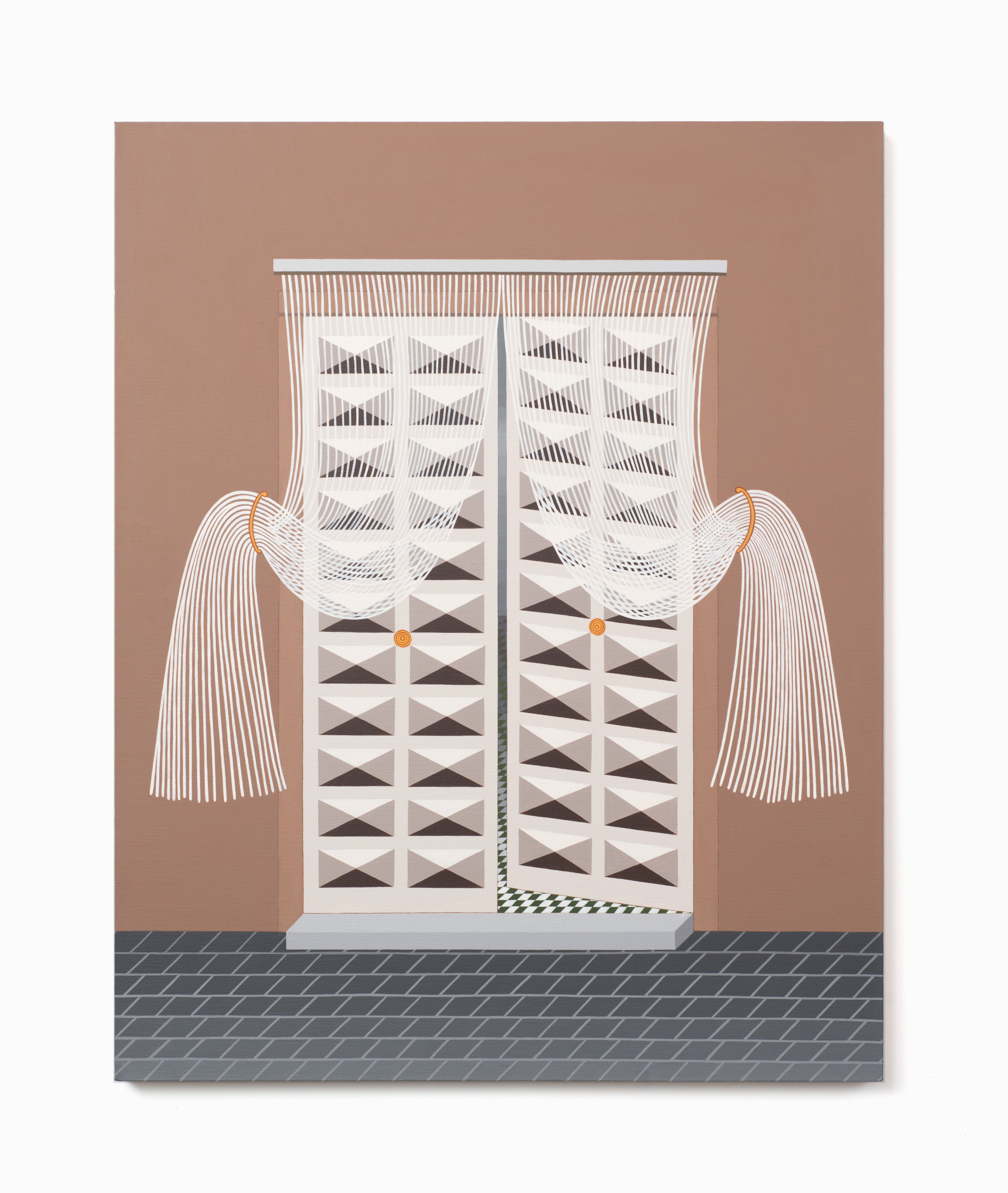 In her latest body of work, Rebecca Shore meditates on a shifting set of spaces – interiors and exteriors, mostly domestic sites including bedrooms, porches, gardens, verandas, mezzanines, dining rooms, courtyards, doorways, and windows. Indeed, the status of the portal in these paintings, executed in acrylic on linen or in gouache on paper, is a central point. The viewer is consistently looking at something through something else, their vision moving between different atmospheres, varieties of light, qualities of enclosure or landscape. Building on her relatively recent pivot from abstraction to representation, Shore has retained her immaculate technical approach, a consistent feature of her work across her oeuvre, back to the paintings she was making in the early 1980s and the quilts she made alongside her friend Christina Ramberg later in the decade. There are no figures in these new works, only spaces. Often containing sly visual games or lurking spatial paradoxes, Shore's paintings create an imagined territory into which the viewer can project themself, a stage set carefully prepared for cognitive immersion. Two beds with paintings hung above them, one a daytime scene, one a night sky, the pairing creating a subtle tension in the room. Layers of oblique intertexts hovering in the paintings – Giovanni di Paolo's window-glimpsed landscapes and stylized rock formations, the vibrating curved lines of Karl Wirsum "awning" canvases. There are multiple patterns associated with different elements of these scenarios – a wall, a floor, stairs, a woven curtain, an iron gate, a hanging mobile – each combination culminating in a complex rhythmic assemblage, an extraordinary visual polyrhythm.