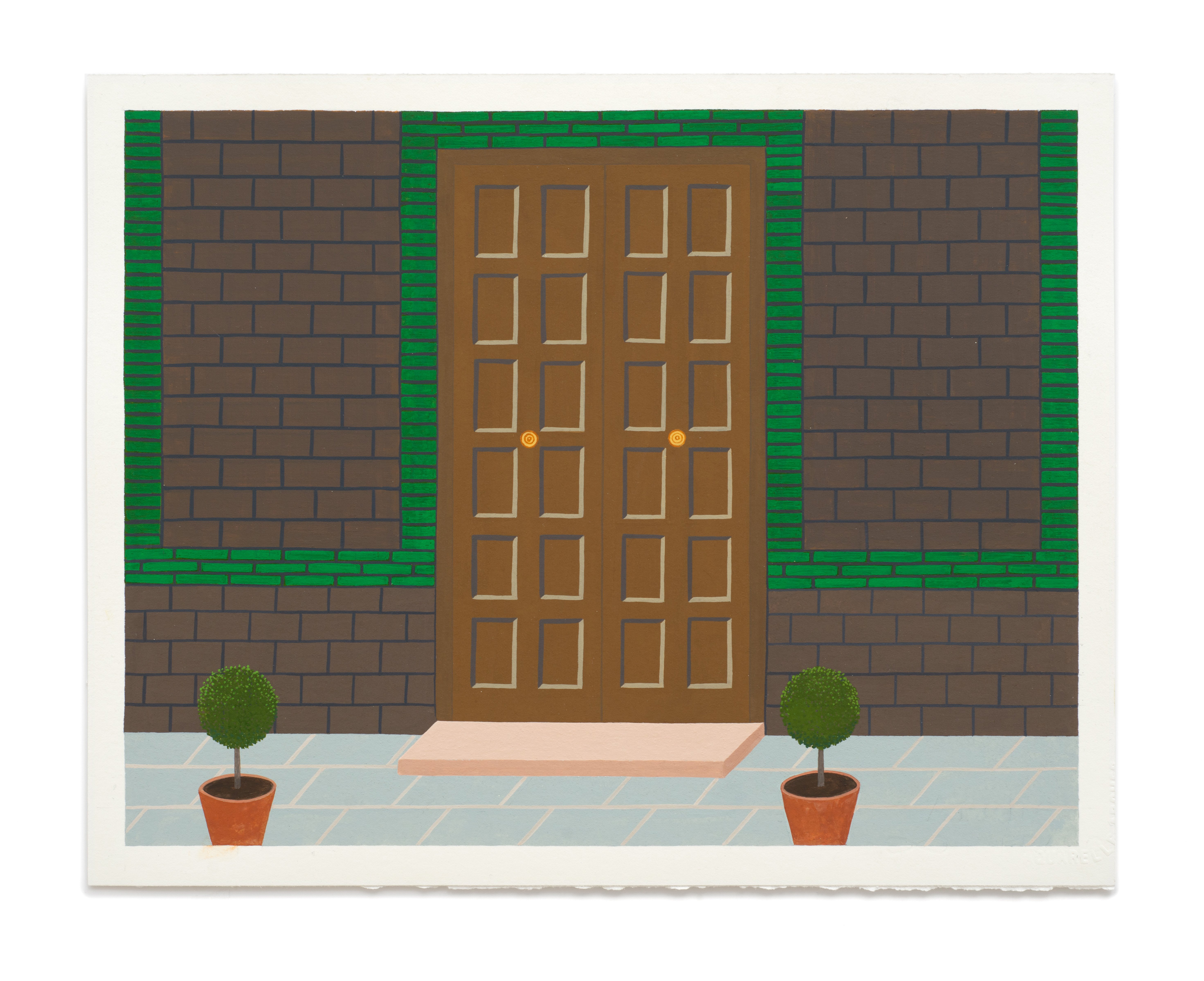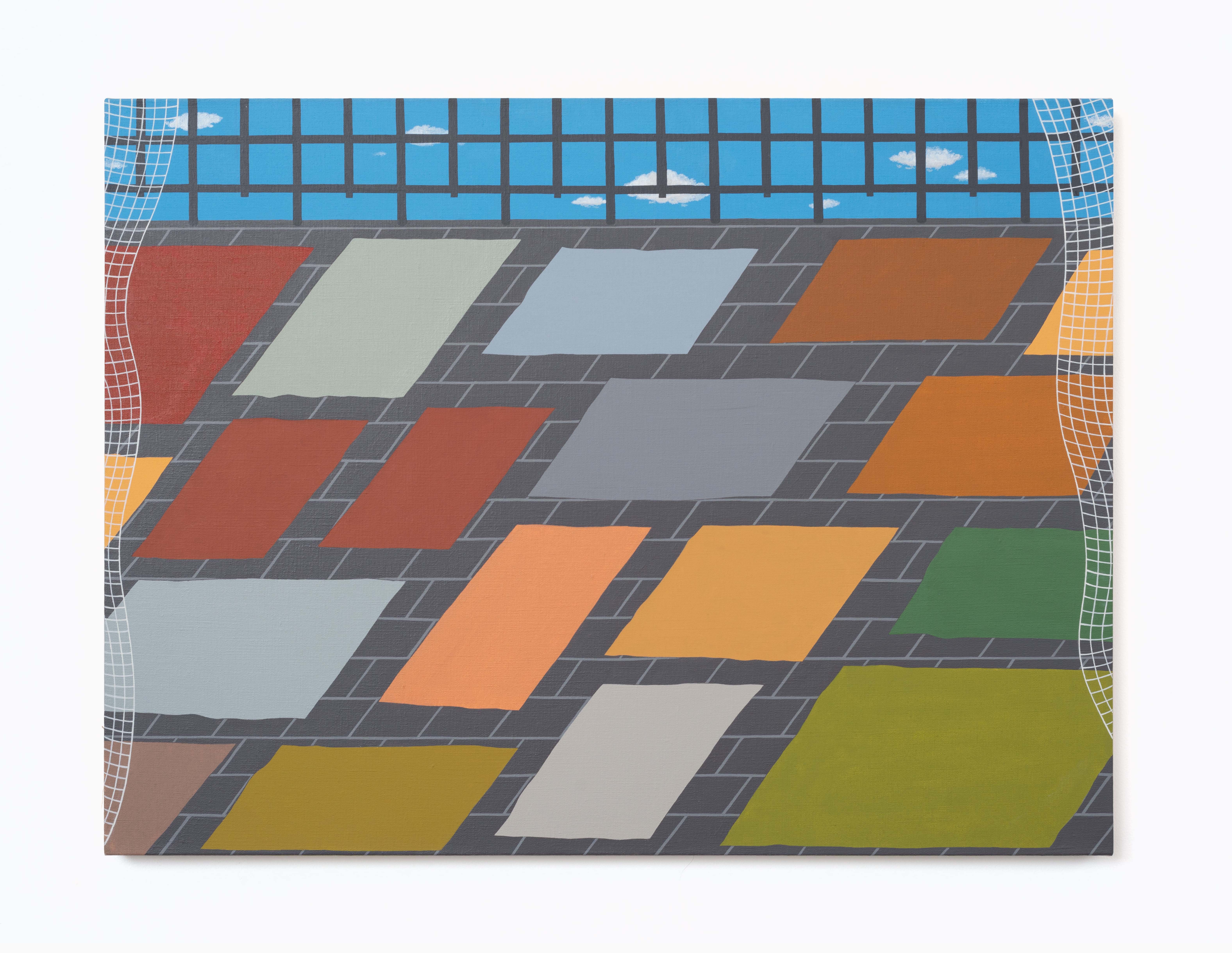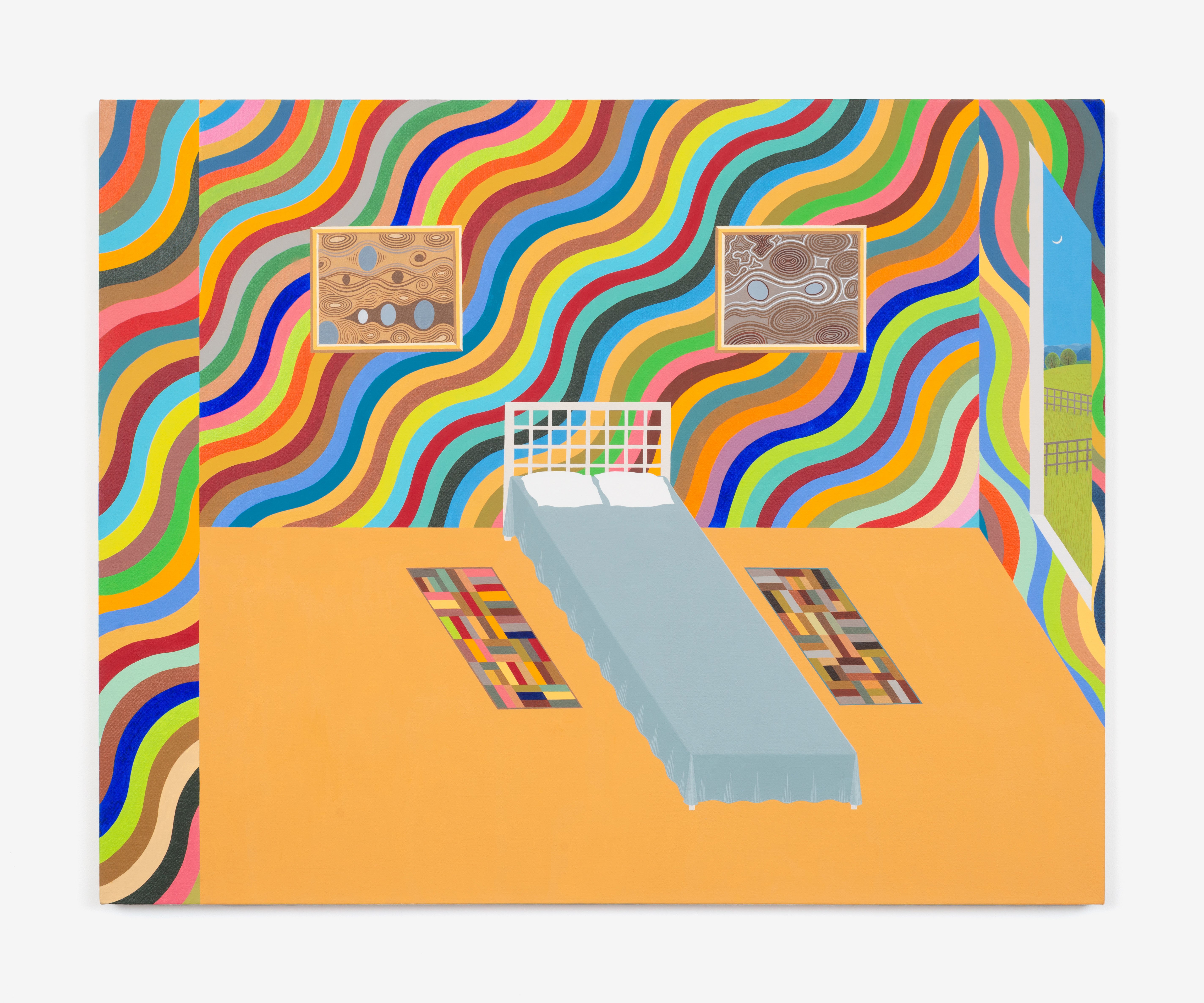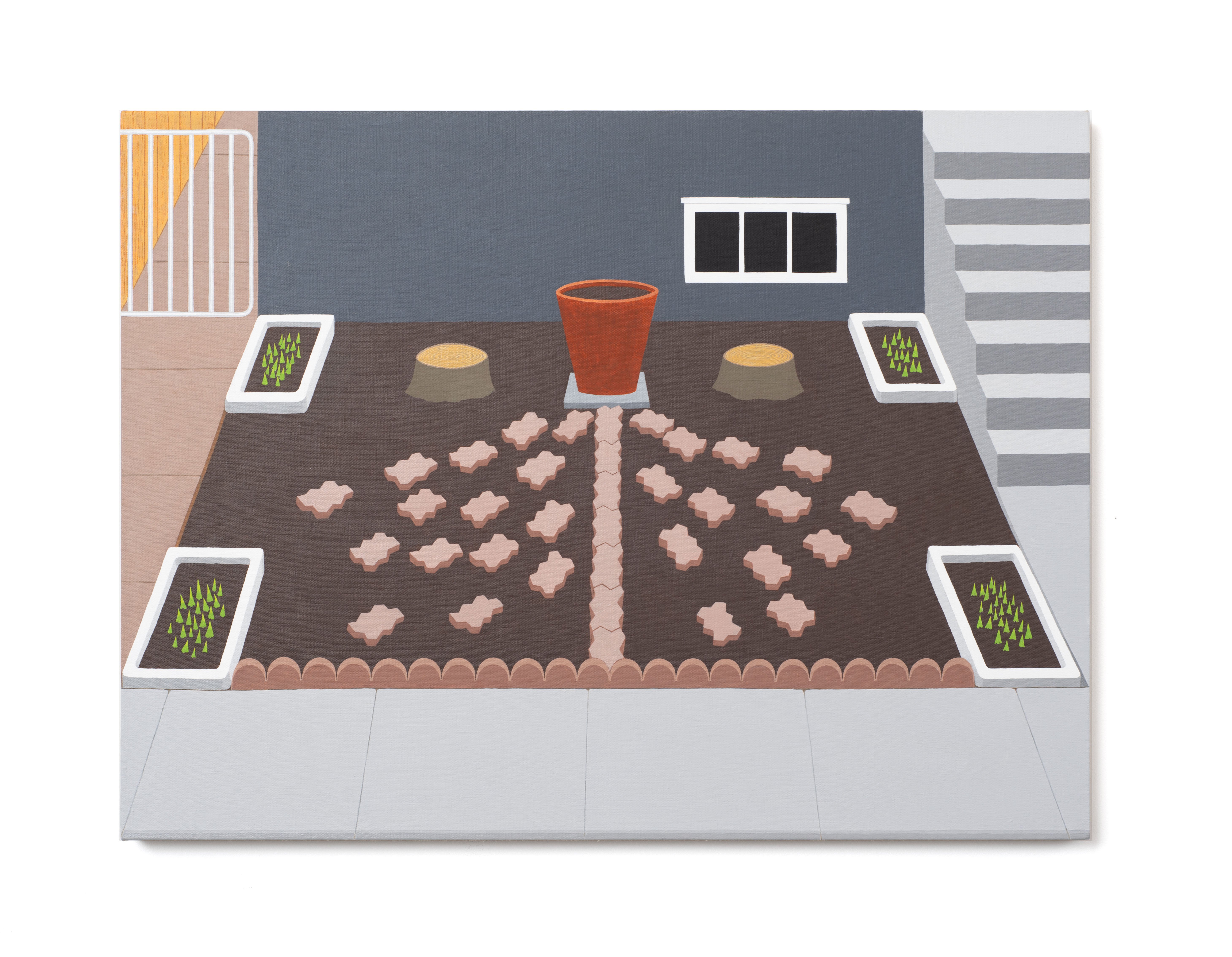 In her latest body of work, Rebecca Shore meditates on a shifting set of spaces – interiors and exteriors, mostly domestic sites including bedrooms, porches, gardens, verandas, mezzanines, dining rooms, courtyards, doorways, and windows. Indeed, the status of the portal in these paintings, executed in acrylic on linen or in gouache on paper, is a central point. The viewer is consistently looking at something through something else, their vision moving between different atmospheres, varieties of light, qualities of enclosure or landscape. Building on her relatively recent pivot from abstraction to representation, Shore has retained her immaculate technical approach, a consistent feature of her work across her oeuvre, back to the paintings she was making in the early 1980s and the quilts she made alongside her friend Christina Ramberg later in the decade. There are no figures in these new works, only spaces. Often containing sly visual games or lurking spatial paradoxes, Shore's paintings create an imagined territory into which the viewer can project themself, a stage set carefully prepared for cognitive immersion. Two beds with paintings hung above them, one a daytime scene, one a night sky, the pairing creating a subtle tension in the room. Layers of oblique intertexts hovering in the paintings – Giovanni di Paolo's window-glimpsed landscapes and stylized rock formations, the vibrating curved lines of Karl Wirsum "awning" canvases. There are multiple patterns associated with different elements of these scenarios – a wall, a floor, stairs, a woven curtain, an iron gate, a hanging mobile – each combination culminating in a complex rhythmic assemblage, an extraordinary visual polyrhythm.