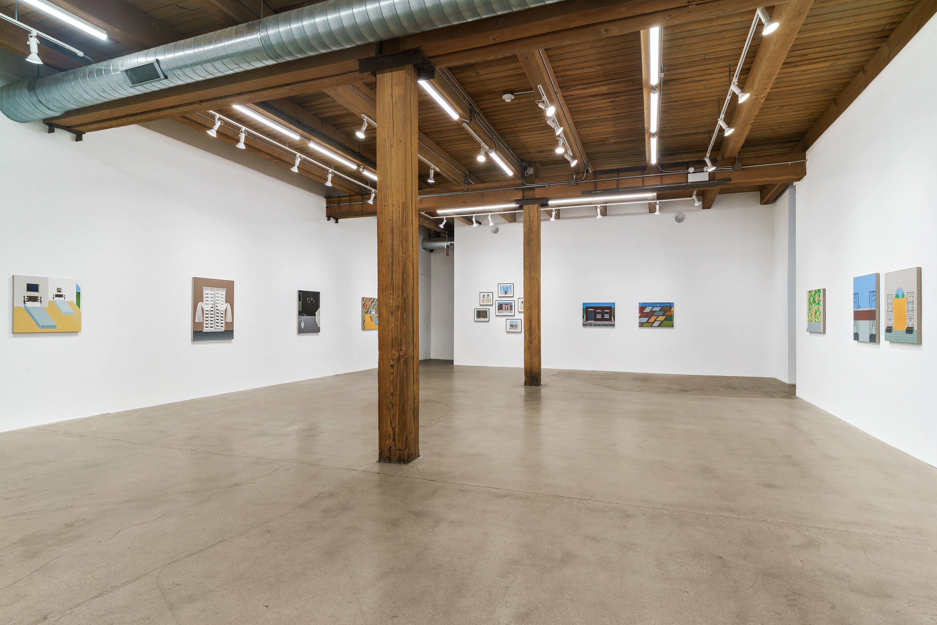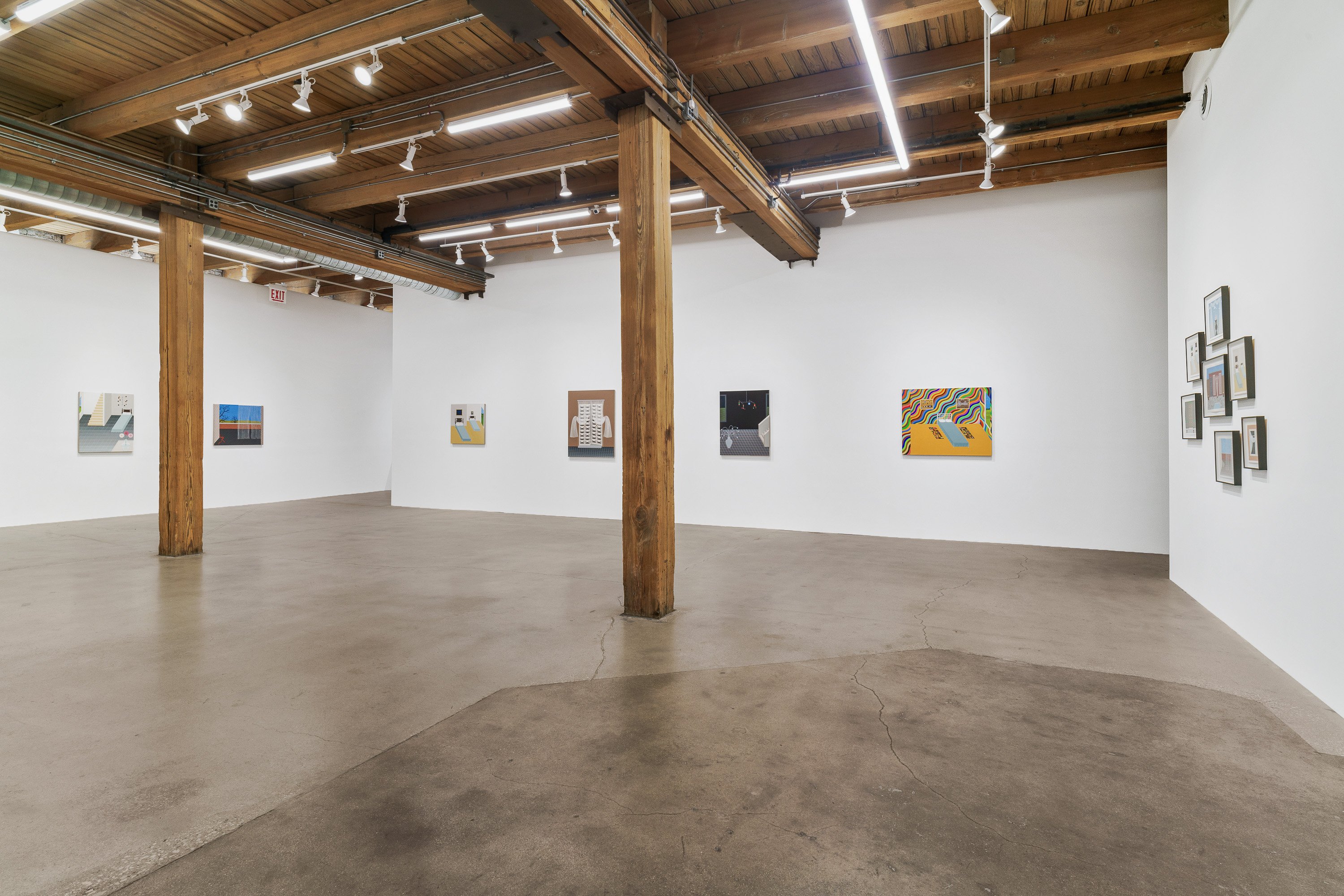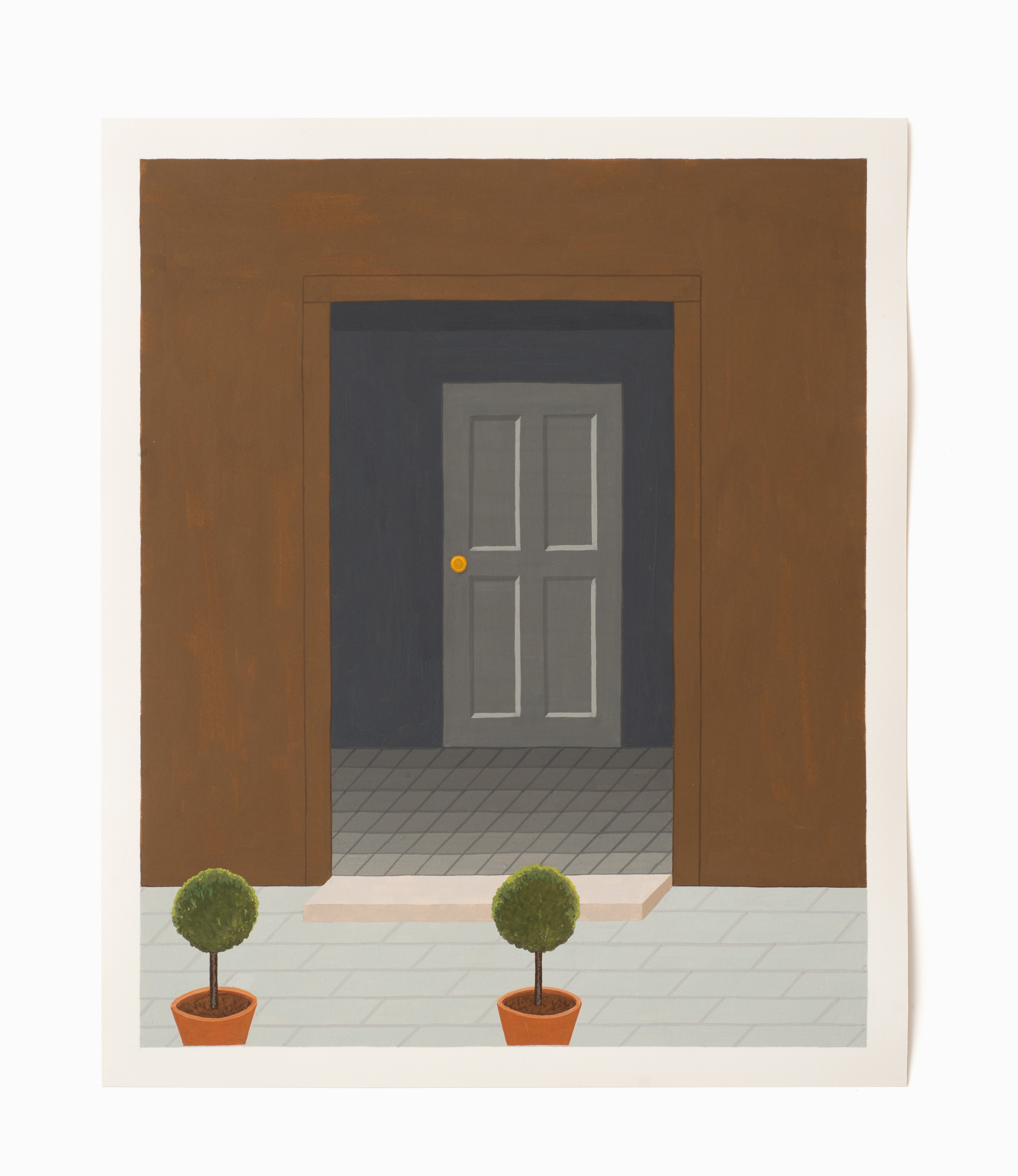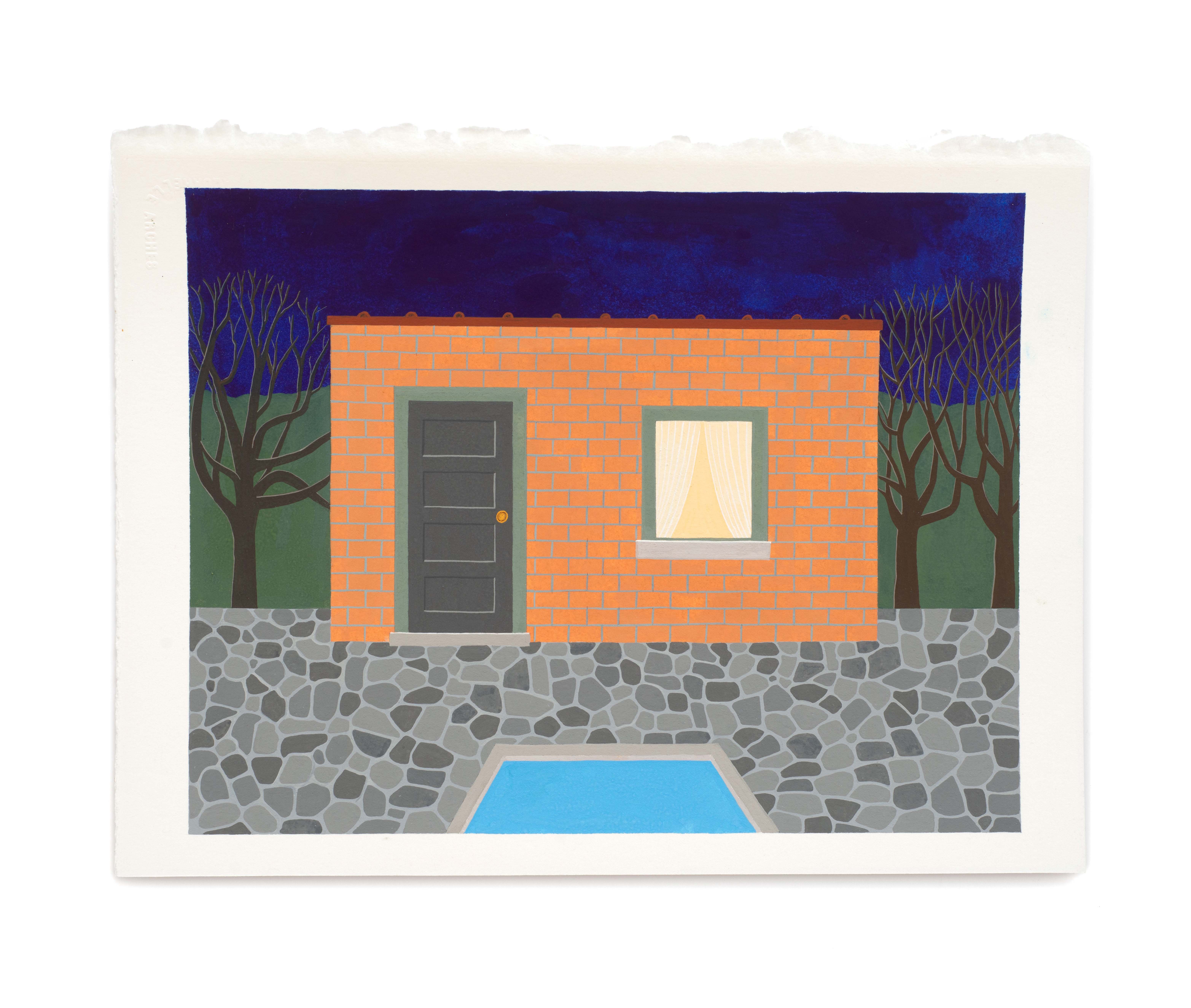 In her latest body of work, Rebecca Shore meditates on a shifting set of spaces – interiors and exteriors, mostly domestic sites including bedrooms, porches, gardens, verandas, mezzanines, dining rooms, courtyards, doorways, and windows. Indeed, the status of the portal in these paintings, executed in acrylic on linen or in gouache on paper, is a central point. The viewer is consistently looking at something through something else, their vision moving between different atmospheres, varieties of light, qualities of enclosure or landscape. Building on her relatively recent pivot from abstraction to representation, Shore has retained her immaculate technical approach, a consistent feature of her work across her oeuvre, back to the paintings she was making in the early 1980s and the quilts she made alongside her friend Christina Ramberg later in the decade. There are no figures in these new works, only spaces. Often containing sly visual games or lurking spatial paradoxes, Shore's paintings create an imagined territory into which the viewer can project themself, a stage set carefully prepared for cognitive immersion. Two beds with paintings hung above them, one a daytime scene, one a night sky, the pairing creating a subtle tension in the room. Layers of oblique intertexts hovering in the paintings – Giovanni di Paolo's window-glimpsed landscapes and stylized rock formations, the vibrating curved lines of Karl Wirsum "awning" canvases. There are multiple patterns associated with different elements of these scenarios – a wall, a floor, stairs, a woven curtain, an iron gate, a hanging mobile – each combination culminating in a complex rhythmic assemblage, an extraordinary visual polyrhythm.