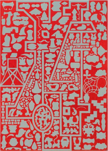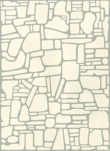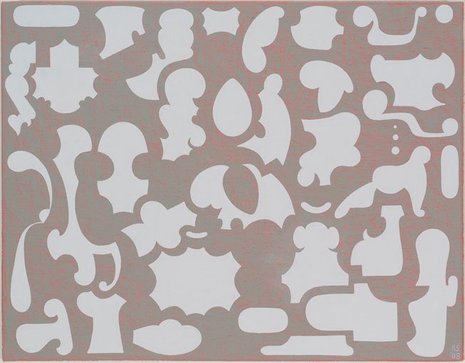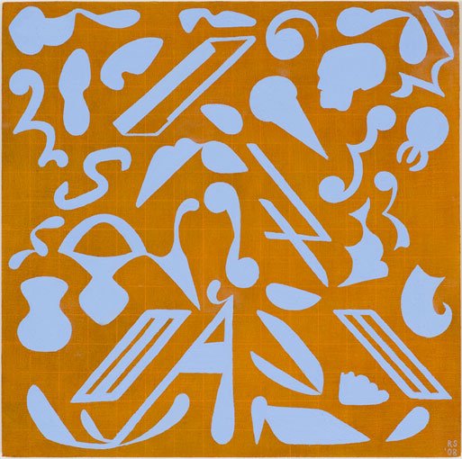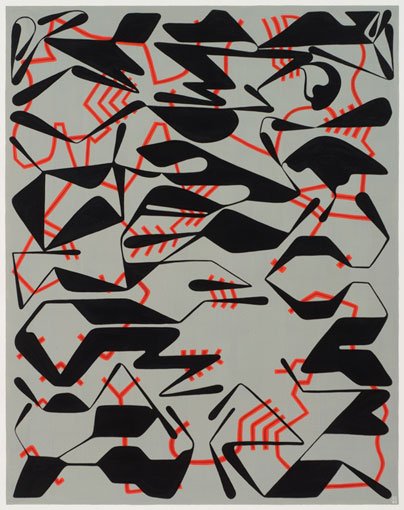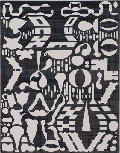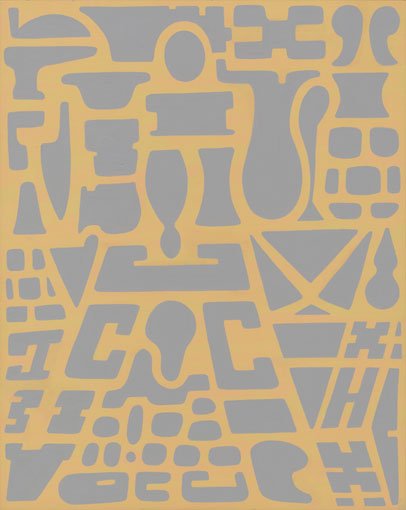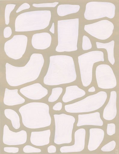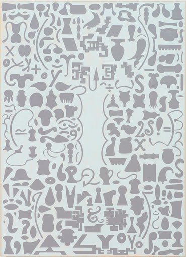 Shore nourishes her amalgamated aesthetic with an intensely concentrated studio practice and an obsessive collection of resource materials. The latter includes original photographs that she takes and studies, among them images that consider the broken pattern of a pleated skirt, the negative space created between the cartoon bodies of Homer and Marge Simpson, tangled ringlets of women’s hair, and architectural ornament. This exhibition includes a number of Shore’s recent paintings – executed in oil, casein, egg tempera, gouache and acrylic – derived from her photographs of faux rock walls. These sparklingly inventive pieces, which introduced a roughness and asymmetry into her work while retaining pattern, gradually evolved into another body of paintings in which the shapes began to congeal into a mysterious iconography, walking the edge between being completely legible and at times openly lettristic, and being wildly cryptic and subject to interpretation. Shore has created a world all her own from fragments of the world around her, microscopically examined, broken down and rebuilt.