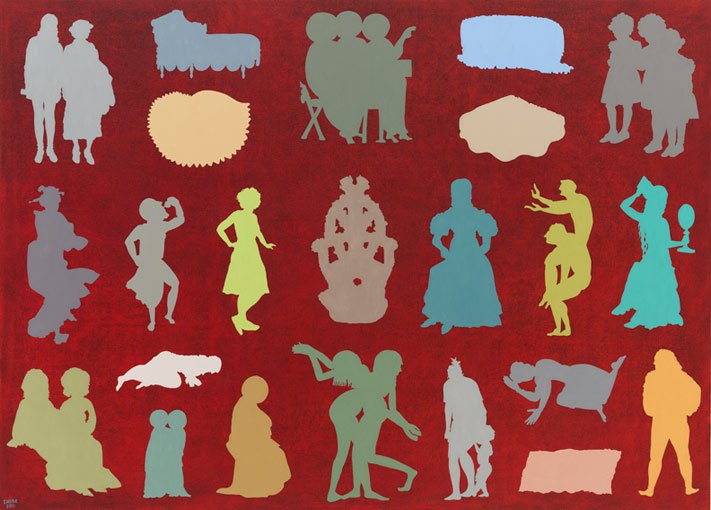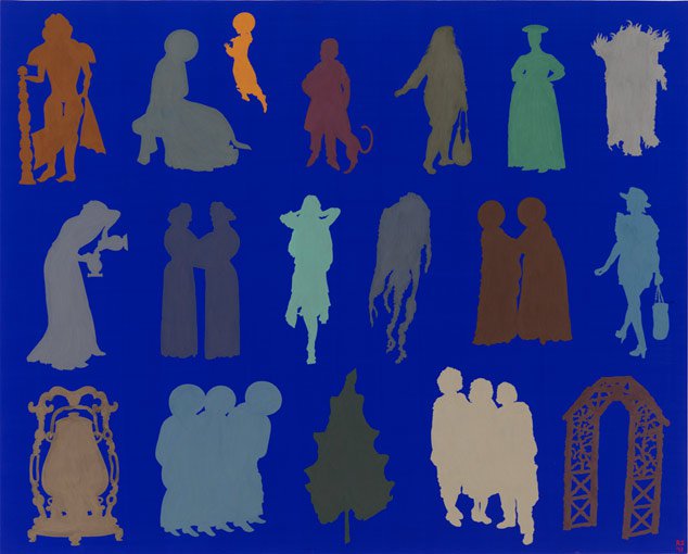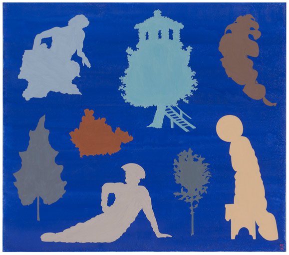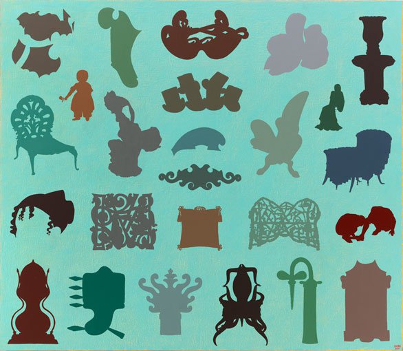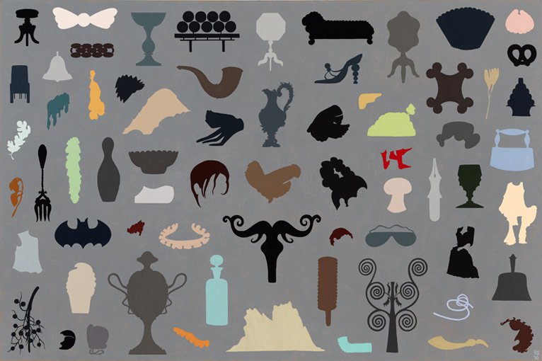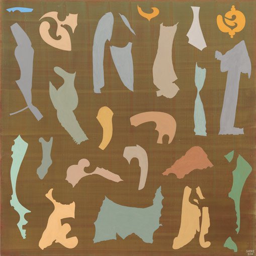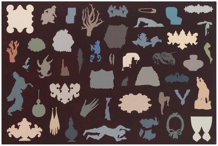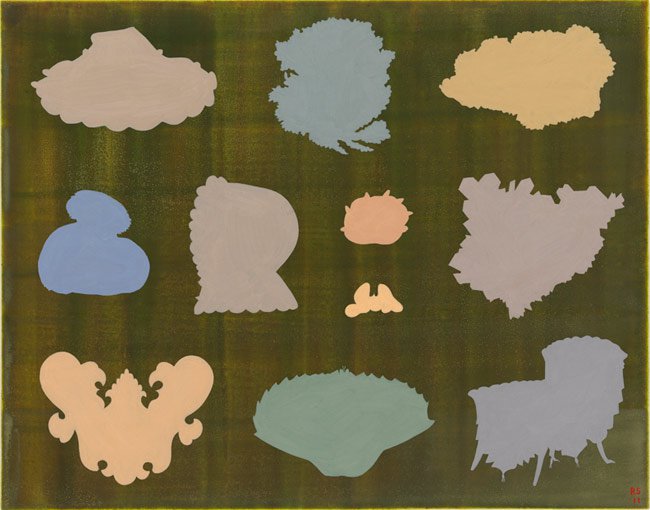 In paintings executed in oil and gouache, as well as distemper (a liquid paint using rabbit skin glue as a binding agent), she assembles and arranges specific images into small collections, each object an image drawn from Shore’s huge trove of working materials. Some of these silhouetted images are immediately recognizable – a bonnet, hair, a deer, a sofa – while others are opaque and abstract, their point of origin rendered mysterious and allusive. The play of connotations between these collected images, fastidiously painted on luminous, painterly backgrounds, invites the viewer to imagine relationships and parse identities. At once a master formalist and a semiotic wizard, Shore has pushed her practice to a brilliant and unfamiliar new place, a tremulous zone where objects and images are not always what they seem.