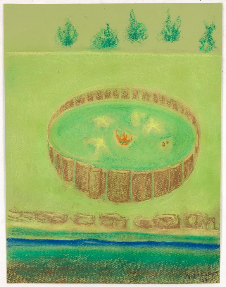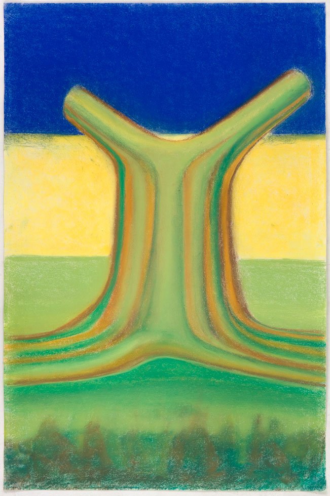 Corbett vs. Dempsey is honored to present an exhibition of drawings by Richard Artschwager. A living legend at 87, Artschwager is one of the most important and difficult-to-categorize contemporary artists. In the mid 1960s, showing at Leo Castelli in New York, he introduced brilliant, beguiling paintings and sculptures made of Formica and Celotex; one of the best known of these, Table with Pink Tablecloth (1964), is in the permanent collection of the Art Institute of Chicago and is often on view in the Modern Wing. But Artschwager refused to be be trapped by one idea or aesthetic, and over half a century he’s explored many different realms between pop, post-minimalism, and conceptual art. All along he has drawn, and indeed graphite, ink, charcoal, and pastel works have constituted a central part of his oeuvre. In this exhibition, CvsD will show a select group of new pastels, many of which feature landscapes and roadways based on the Southwest. As with all of his work, they often have an unexpected element or twist – a naked leg jutting out of a landscape or the Jolly Green Giant waving from the roadside. Some of the drawings are executed on unusual materials, including flocked and handmade paper. The entire exhibition is a wondrous and strange as could be, a haunting, visionary statement from one of American art’s great iconoclasts.