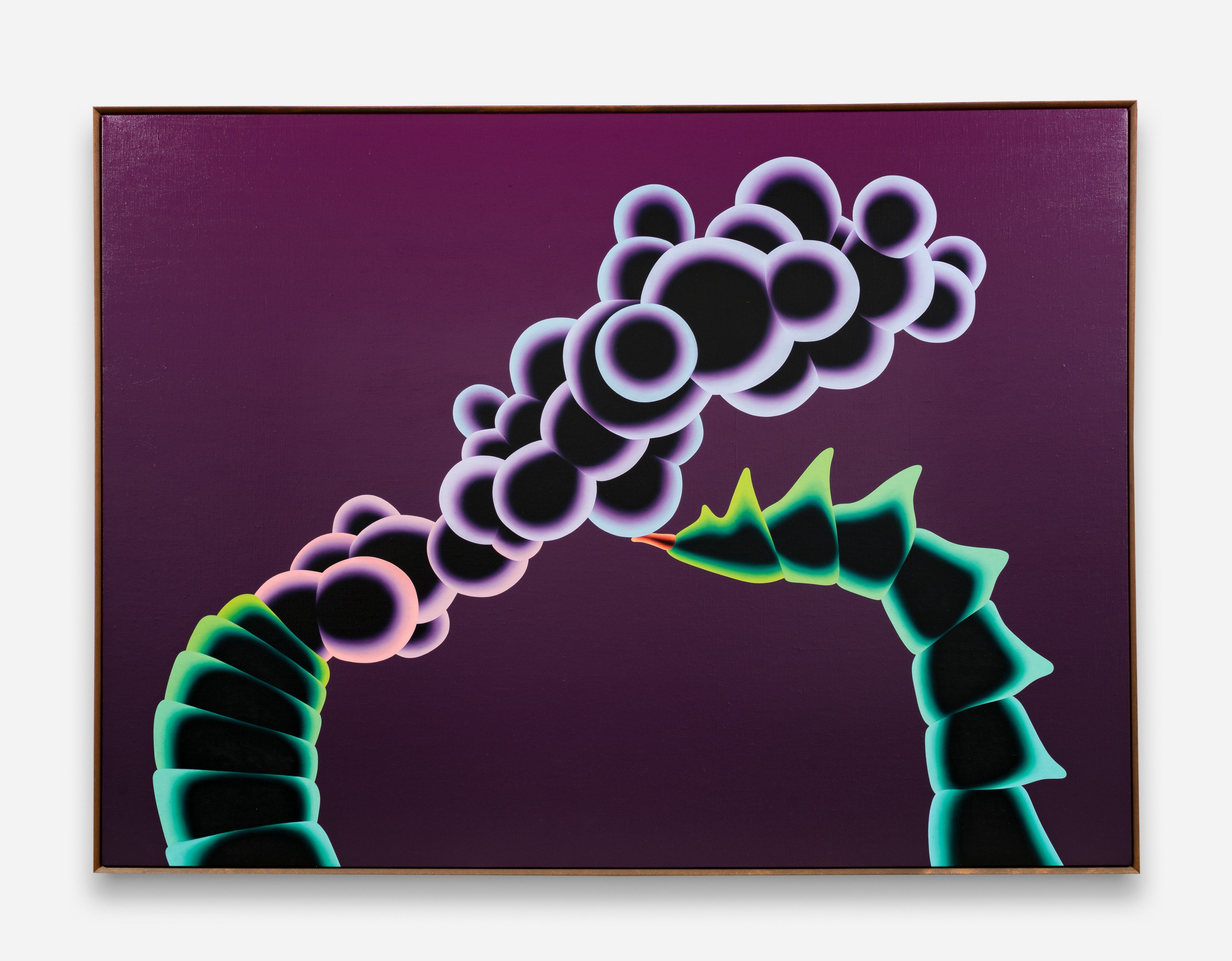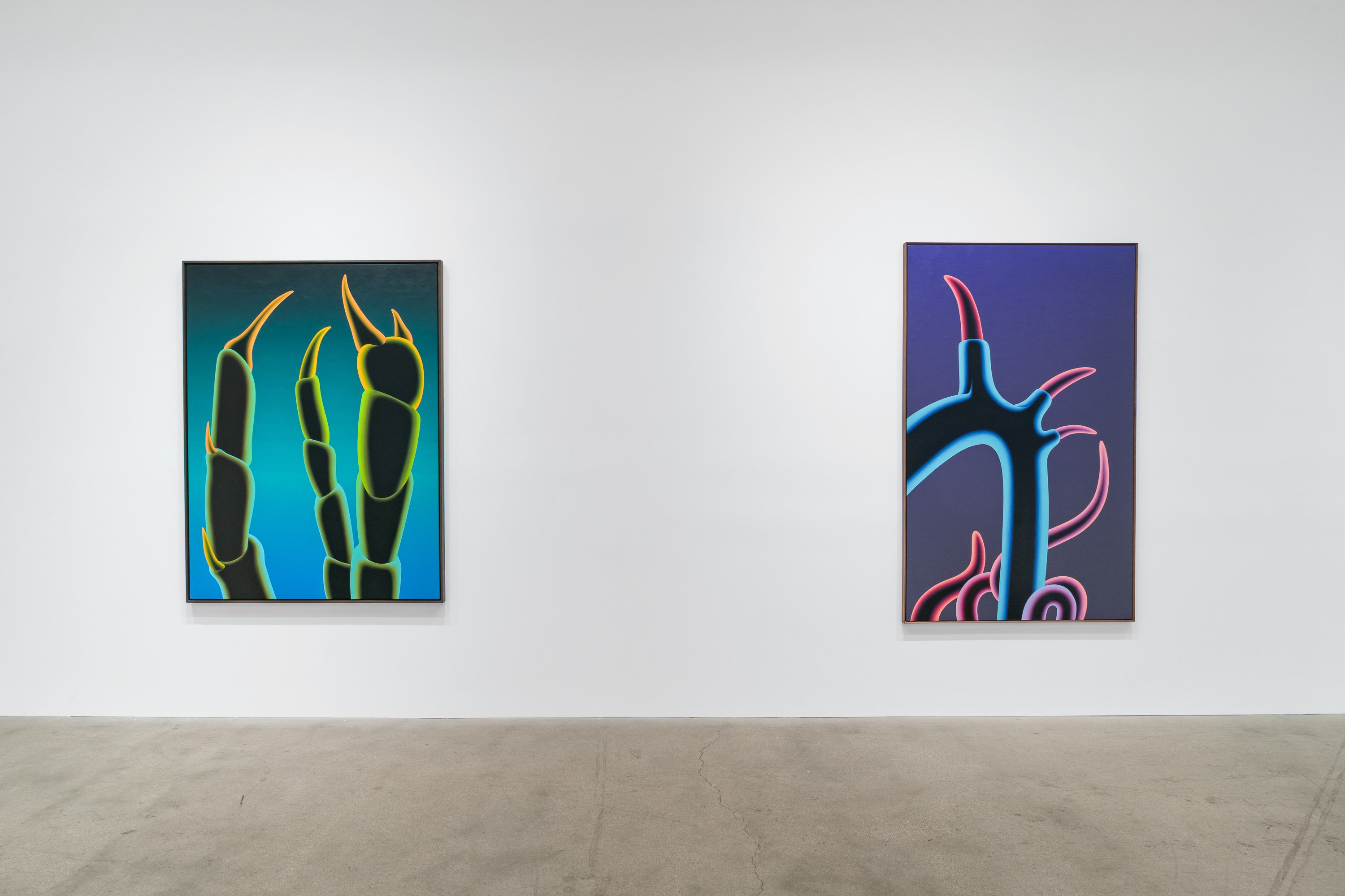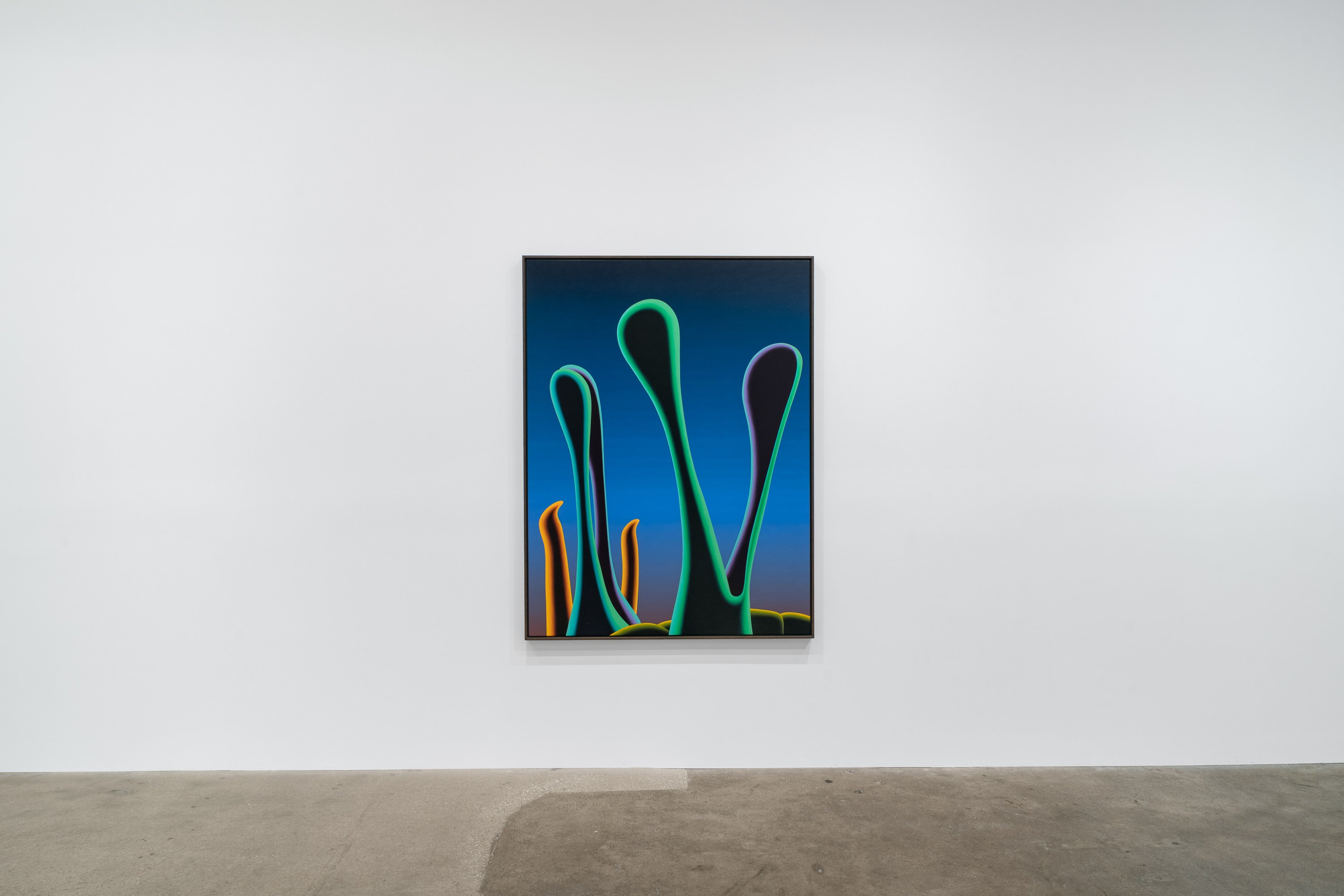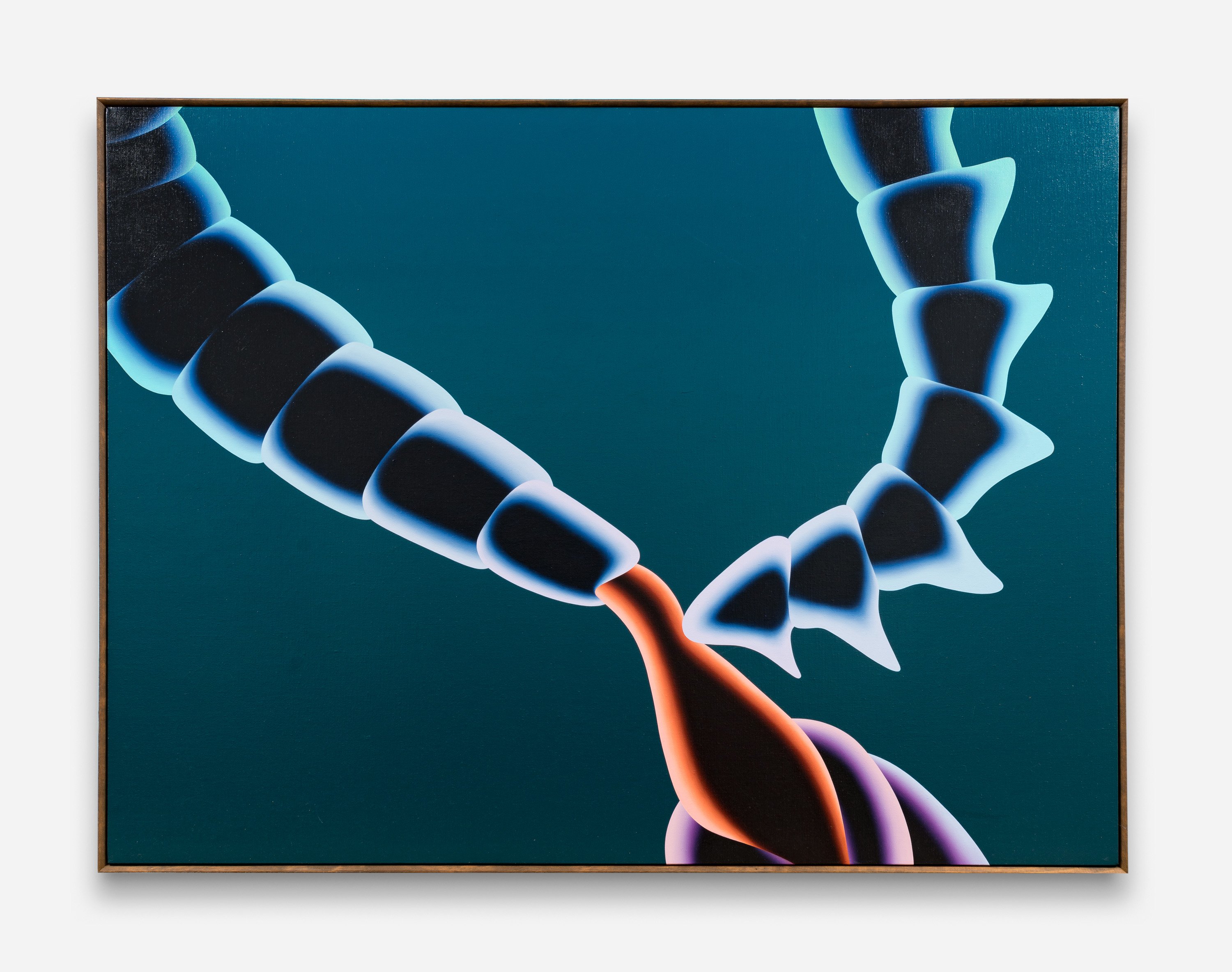 With great excitement, Corbett vs. Dempsey introduces Richard Wetzel, Some Must Watch: Paintings, 1983-85. This is the artist's third solo presentation with the gallery. Working from painstakingly organized schematic color charts, with associated works on paper executed in Prismacolor pencil, he gradually moved up in scale and shifted away from the specificity of images found in his collages toward invented imagery, eventually landing on a series of incredibly original biomorphic creations – monstrous forms in eerie, opalescent hues with monochromatic backgrounds. Richard Wetzel made the transition from collage and printmaking to painting over a period in the late 1970s. An intrepid draftsman in any medium, from the early works back-printed on Plexiglass to his current sculptural works mixing wood, bone, antler, and other materials, Wetzel's paintings are marvels of fetishistic surface and luminous gleam. The subject matter of these canvases has a science-fictional orientation – mutant hybrids of insect and vegetable are shown in close-up detail, depicting creatures that are beautiful, gruesome, and often ominously sexual. Not seen since they were made, the nine thermonuclear works in Some Must Watch constitute a sort of post-apocalyptic suite, perhaps more relevant today than when they were first executed.