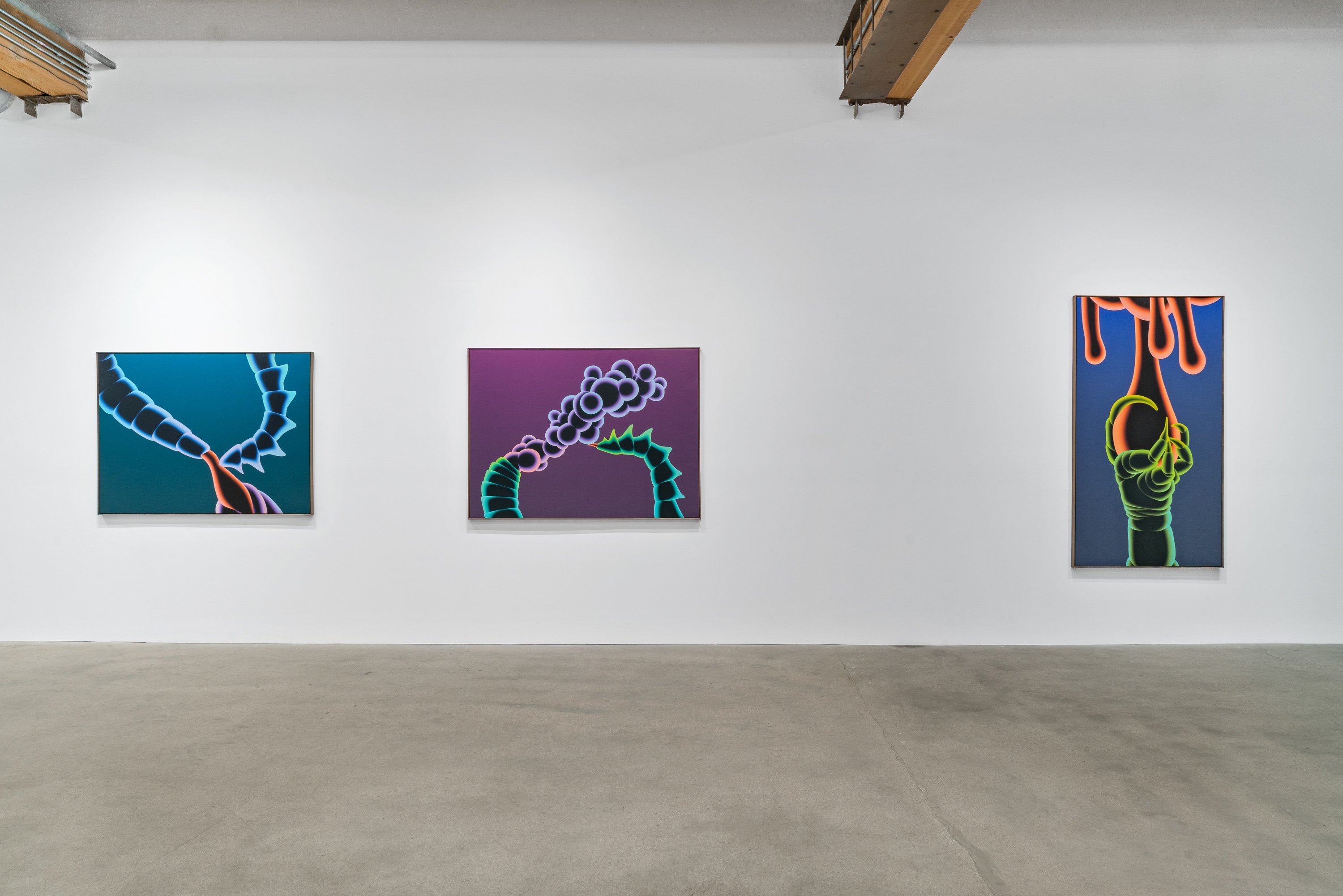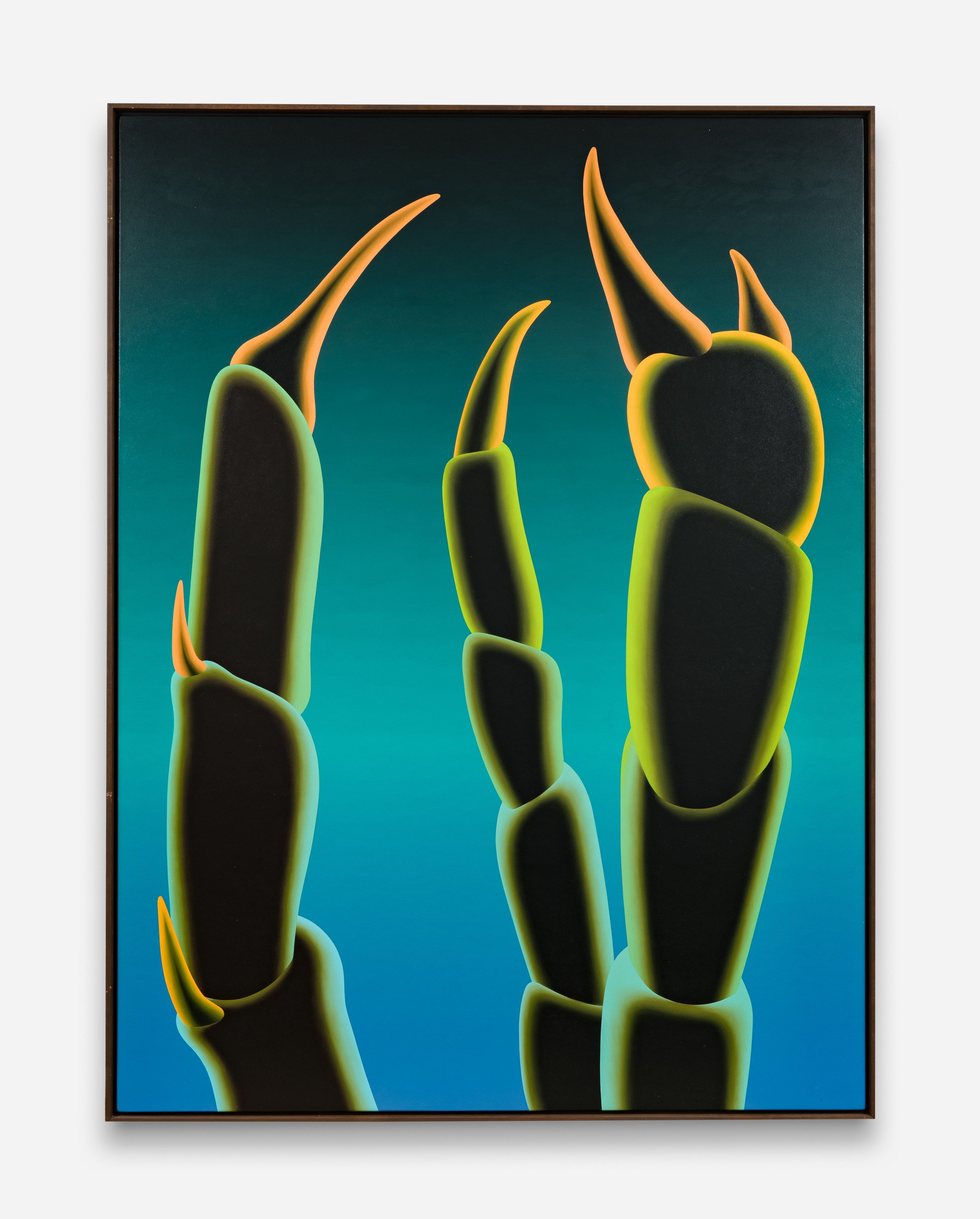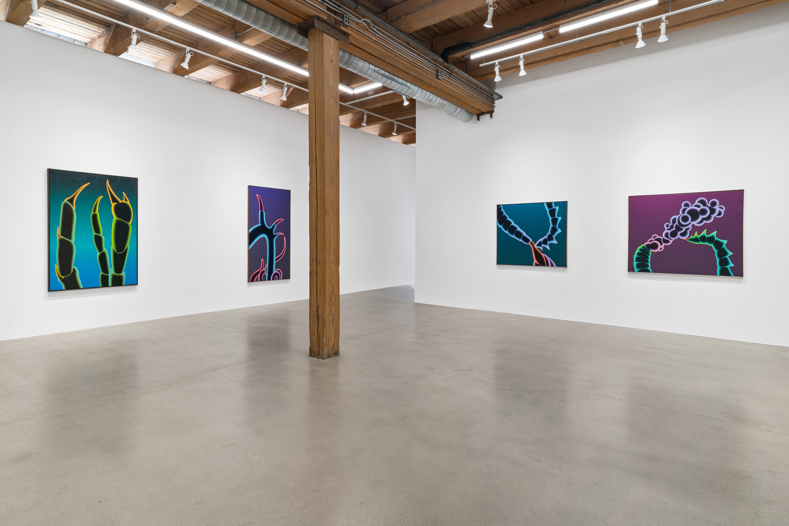 With great excitement, Corbett vs. Dempsey introduces Richard Wetzel, Some Must Watch: Paintings, 1983-85. This is the artist's third solo presentation with the gallery. Working from painstakingly organized schematic color charts, with associated works on paper executed in Prismacolor pencil, he gradually moved up in scale and shifted away from the specificity of images found in his collages toward invented imagery, eventually landing on a series of incredibly original biomorphic creations – monstrous forms in eerie, opalescent hues with monochromatic backgrounds. Richard Wetzel made the transition from collage and printmaking to painting over a period in the late 1970s. An intrepid draftsman in any medium, from the early works back-printed on Plexiglass to his current sculptural works mixing wood, bone, antler, and other materials, Wetzel's paintings are marvels of fetishistic surface and luminous gleam. The subject matter of these canvases has a science-fictional orientation – mutant hybrids of insect and vegetable are shown in close-up detail, depicting creatures that are beautiful, gruesome, and often ominously sexual. Not seen since they were made, the nine thermonuclear works in Some Must Watch constitute a sort of post-apocalyptic suite, perhaps more relevant today than when they were first executed.