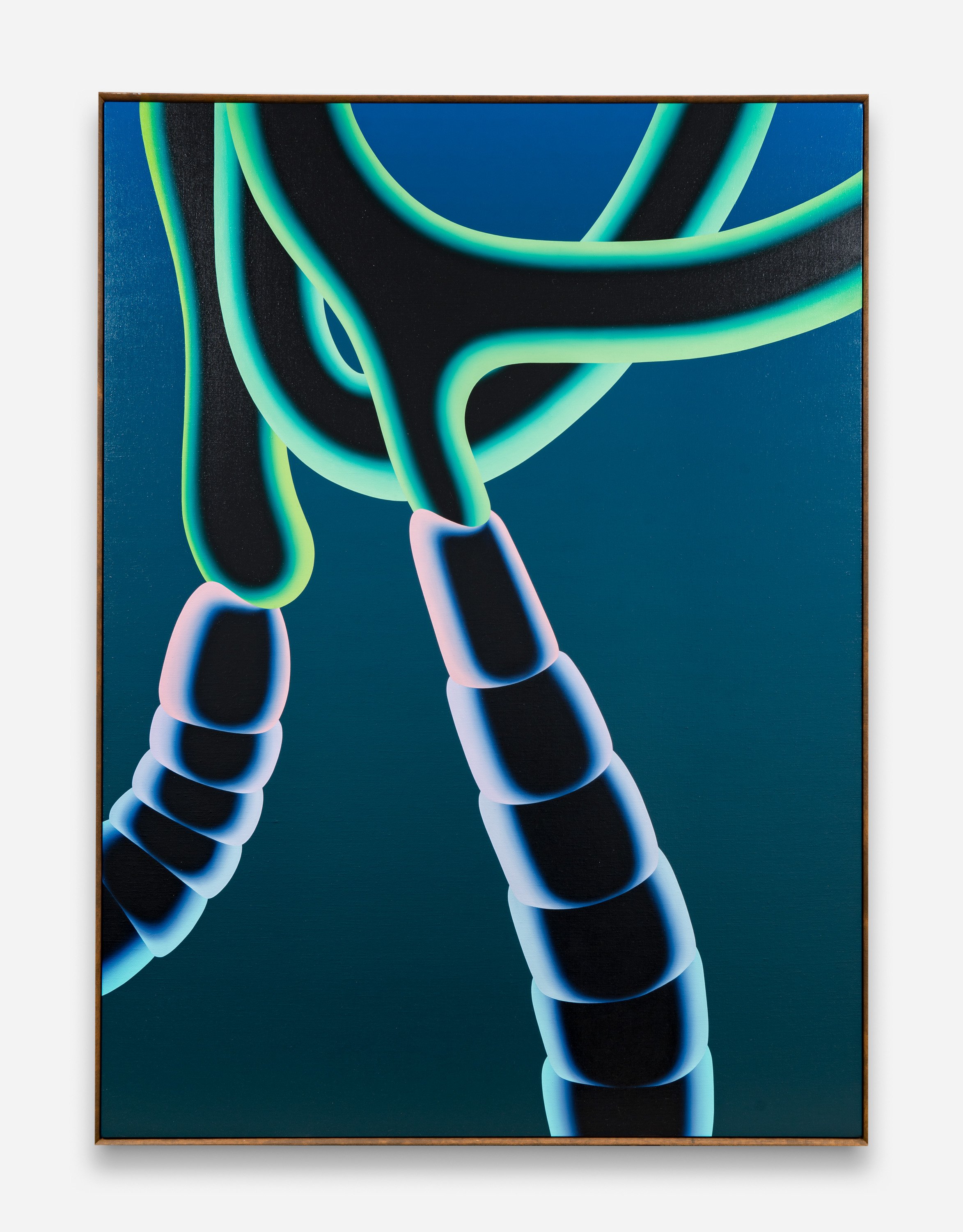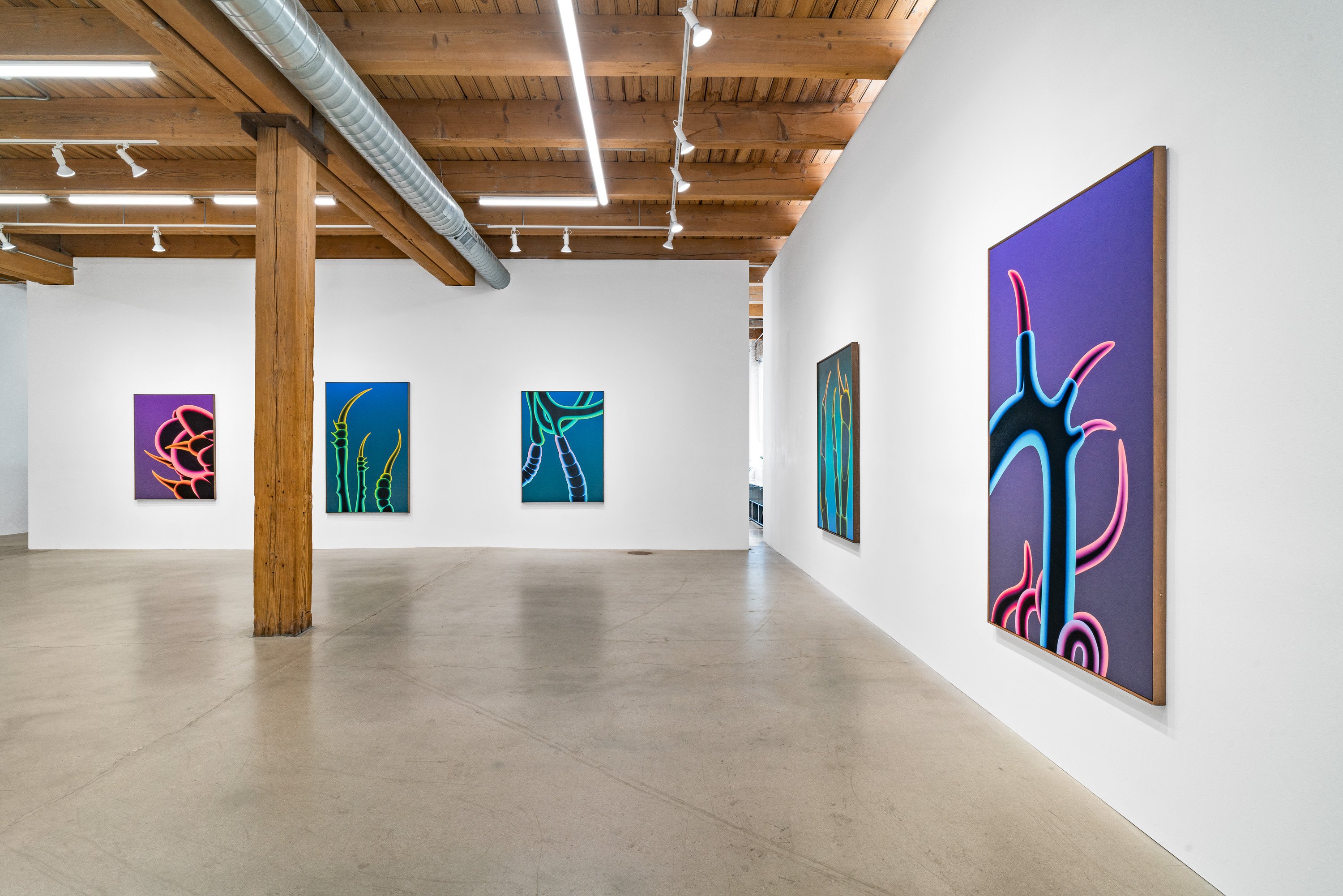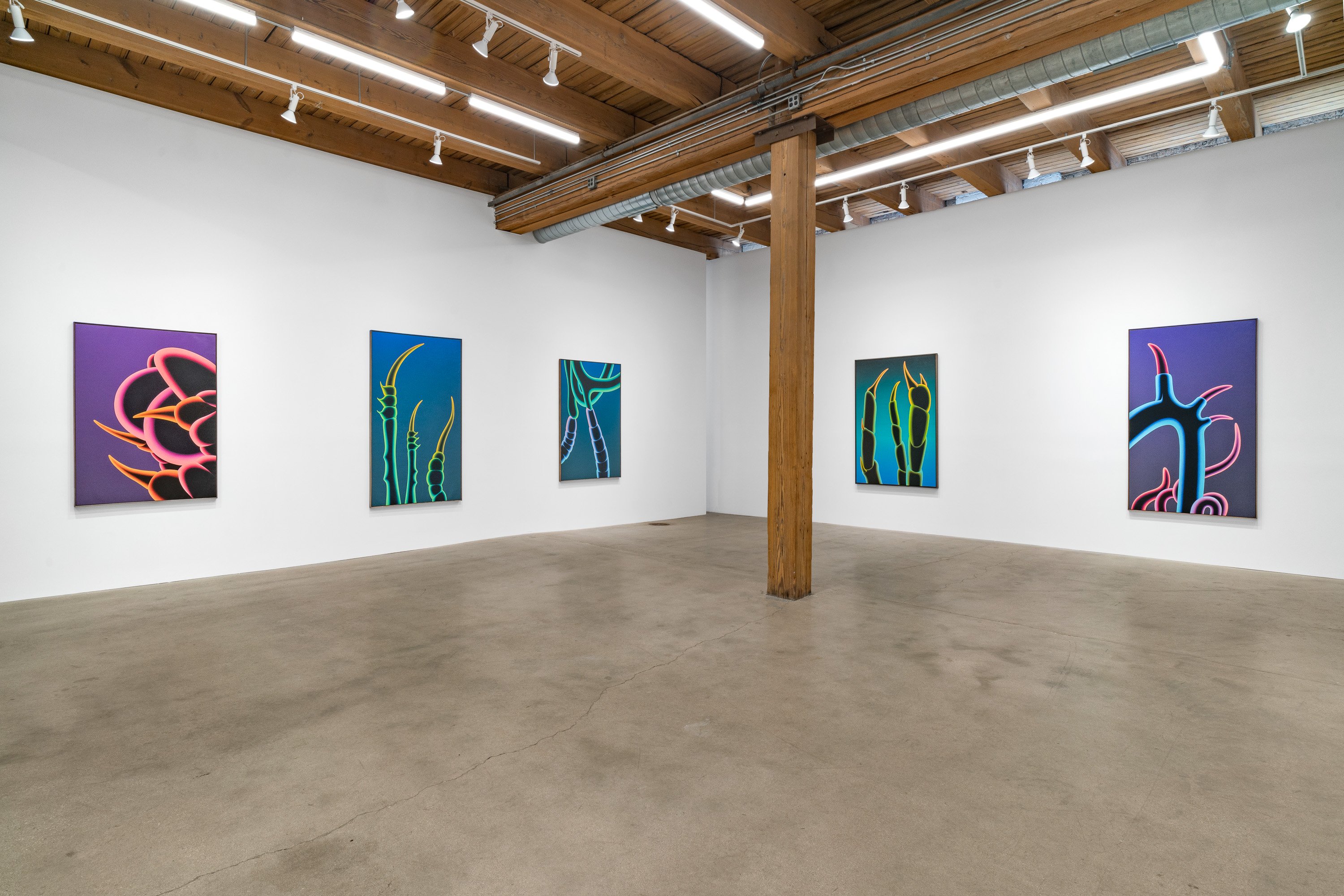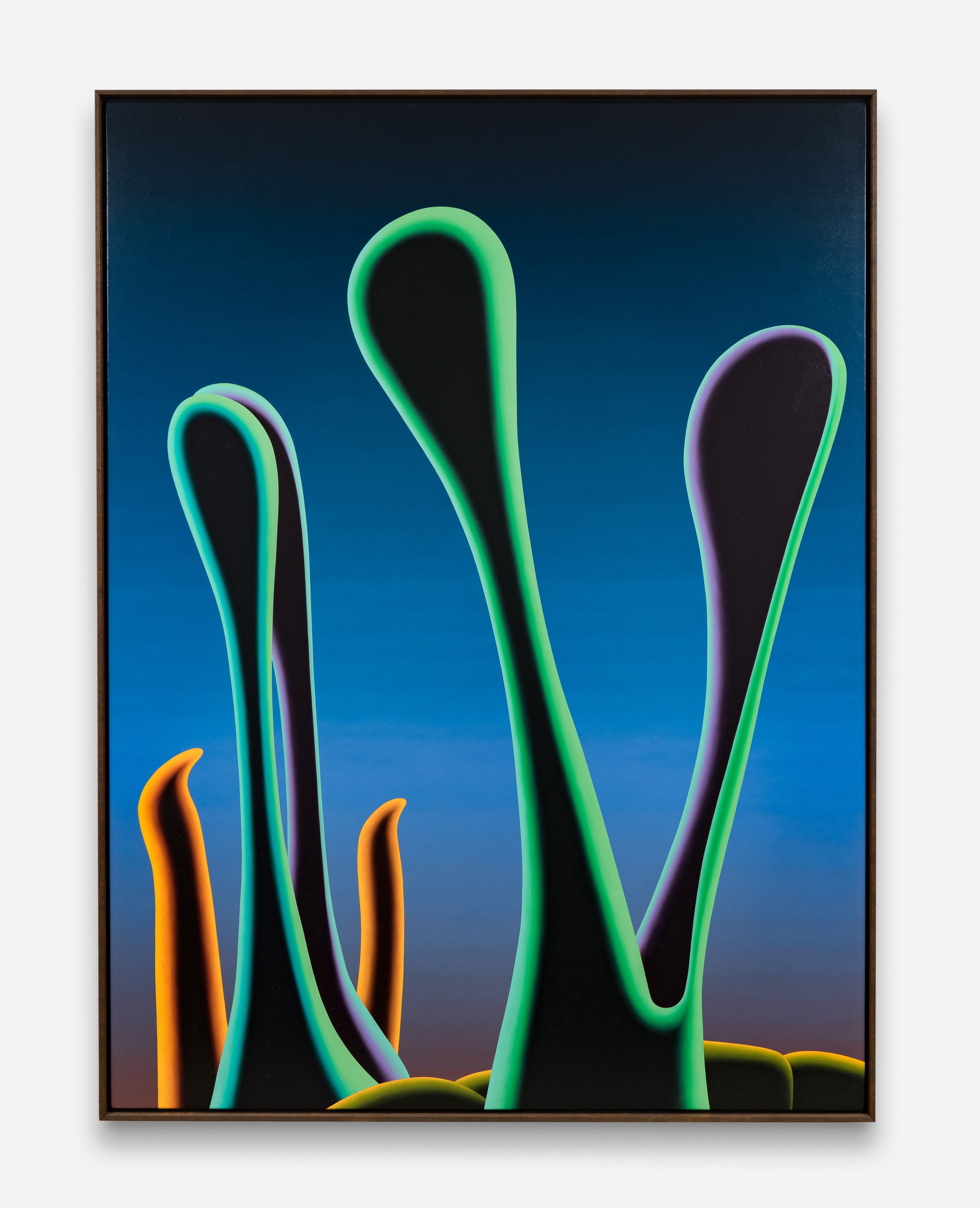 With great excitement, Corbett vs. Dempsey introduces Richard Wetzel, Some Must Watch: Paintings, 1983-85. This is the artist's third solo presentation with the gallery. Working from painstakingly organized schematic color charts, with associated works on paper executed in Prismacolor pencil, he gradually moved up in scale and shifted away from the specificity of images found in his collages toward invented imagery, eventually landing on a series of incredibly original biomorphic creations – monstrous forms in eerie, opalescent hues with monochromatic backgrounds. Richard Wetzel made the transition from collage and printmaking to painting over a period in the late 1970s. An intrepid draftsman in any medium, from the early works back-printed on Plexiglass to his current sculptural works mixing wood, bone, antler, and other materials, Wetzel's paintings are marvels of fetishistic surface and luminous gleam. The subject matter of these canvases has a science-fictional orientation – mutant hybrids of insect and vegetable are shown in close-up detail, depicting creatures that are beautiful, gruesome, and often ominously sexual. Not seen since they were made, the nine thermonuclear works in Some Must Watch constitute a sort of post-apocalyptic suite, perhaps more relevant today than when they were first executed.