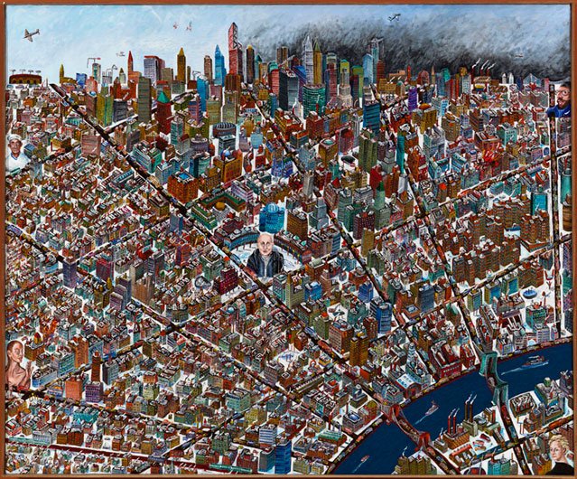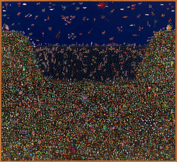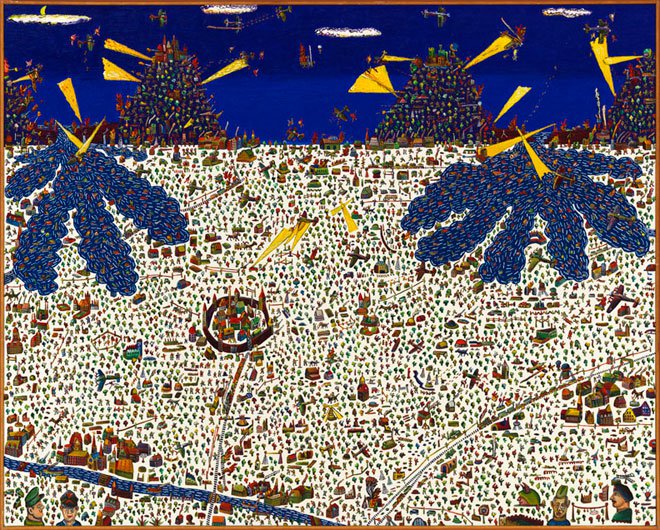 In the words of the Persuaders: it’s a thin line between love and hate. In Chicago in the early 1970s, Robert Donley created a group of drawings and paintings featuring orgiastic scenes. Highly detailed and expressionistically painted, these Bosch-like landscapes describe specific situations— Sodom and Gomorrah , Babel , Mystic Marriage of St. Catherine —that are densely populated with cavorting naked figures. Within a few years, these bacchanalian parties had morphed into equally detailed war scenes, often drawing on specific battles. Large-scale paintings such as On Target and Twin Blasted Dams are dizzying representations of WWII conflicts, with hundreds of tiny figures engaged in ground maneuvers and skies filled with fighter aircrafts and bombers.